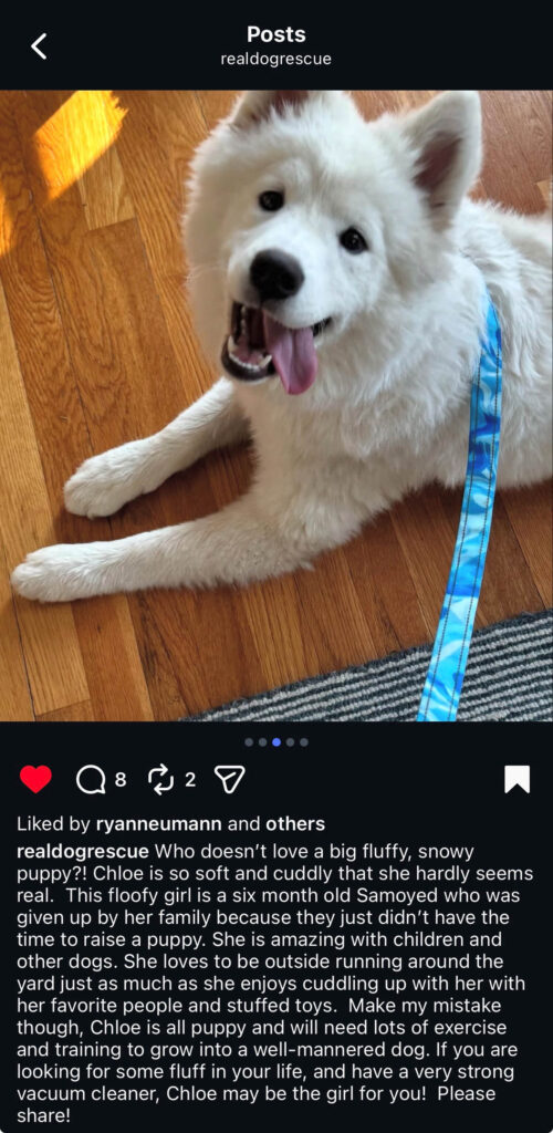 Our newest family member, Callie, is a 7-month-old Samoyed who came to us through Real Dog Rescue. If that rescue sounds familiar, it’s because we adopted our second dog, Maya, from them too. Because of that, I’ve continued following their Instagram for updates and adoption posts.