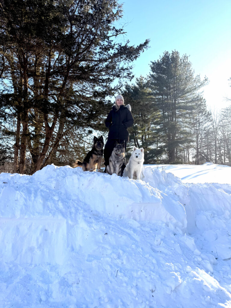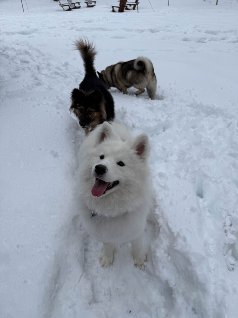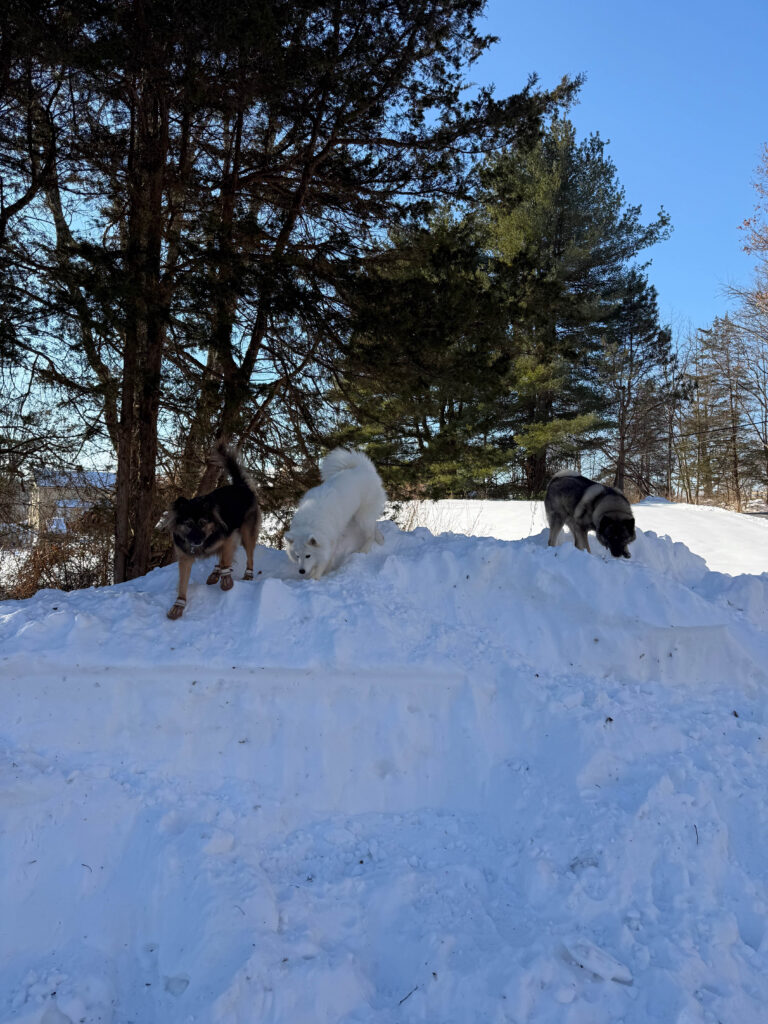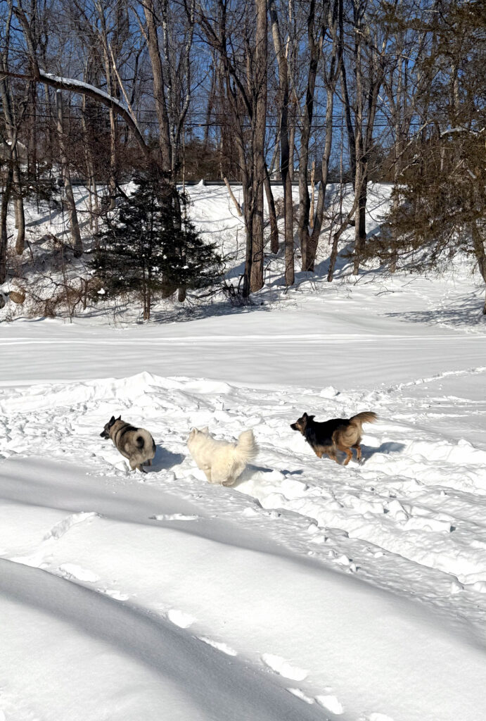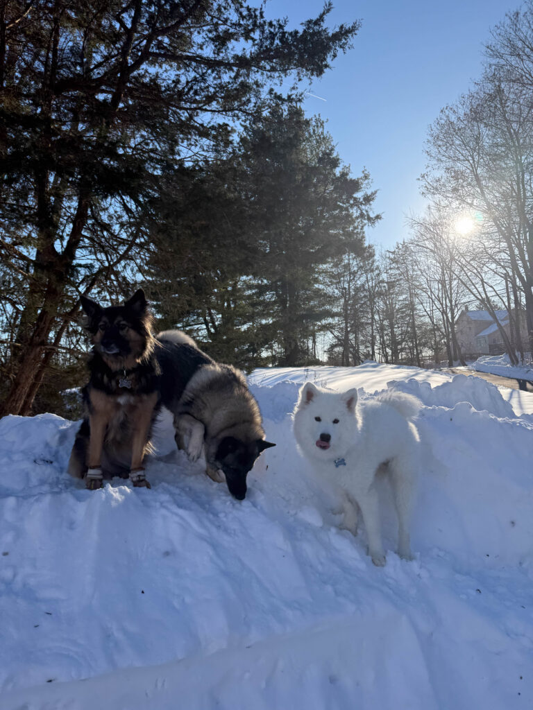 Two days after Christmas, we brought our two dogs, Rocky and Maya, to meet her at the foster home. The last step before adoption was making sure all the dogs got along. And the setting couldn’t have been more perfect. A big snowstorm had just passed through New Jersey and dropped about seven inches of snow. Our snow-loving dog Rocky was thrilled, and Callie clearly was too. After all, this breed was built for winter.