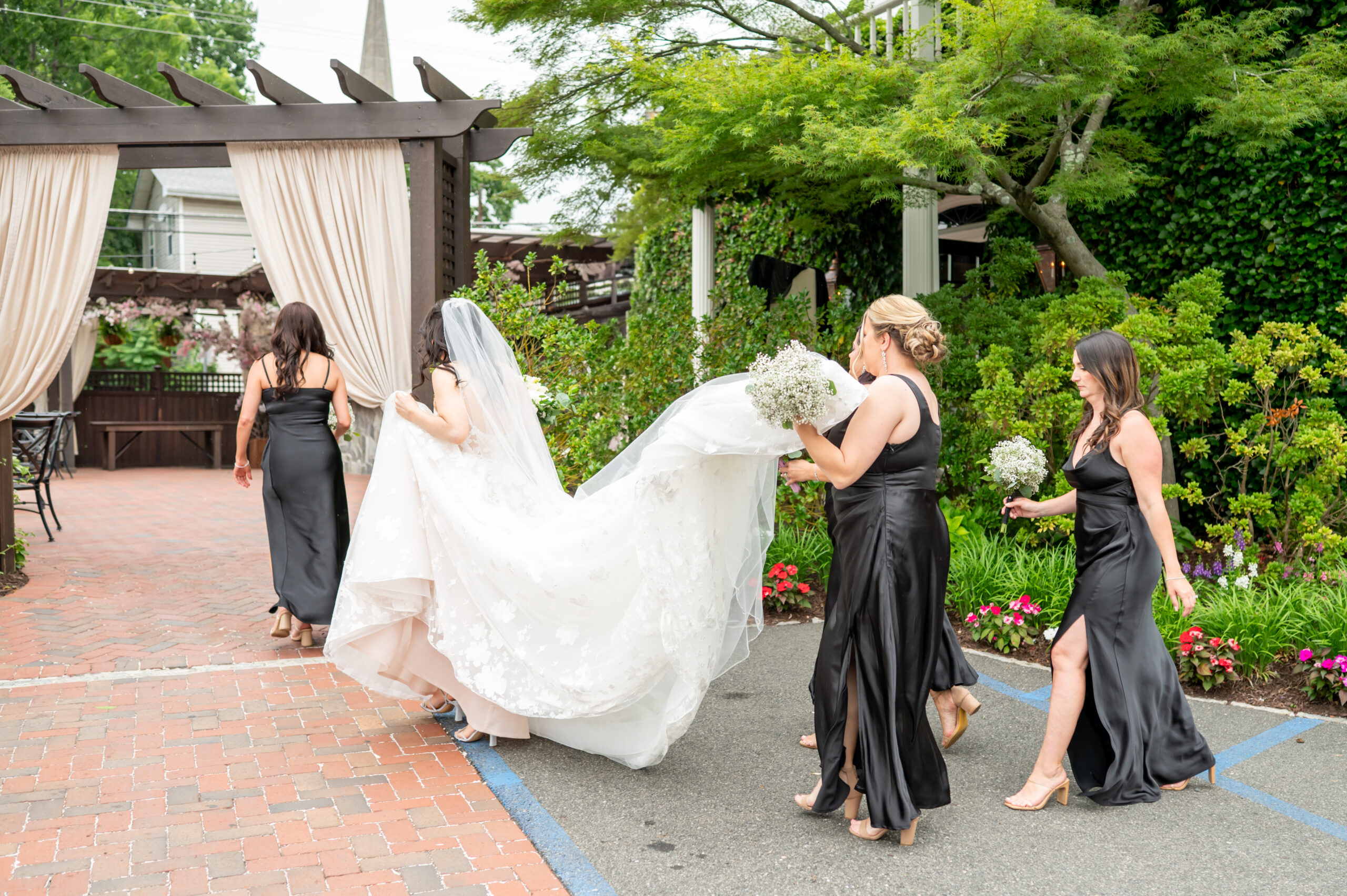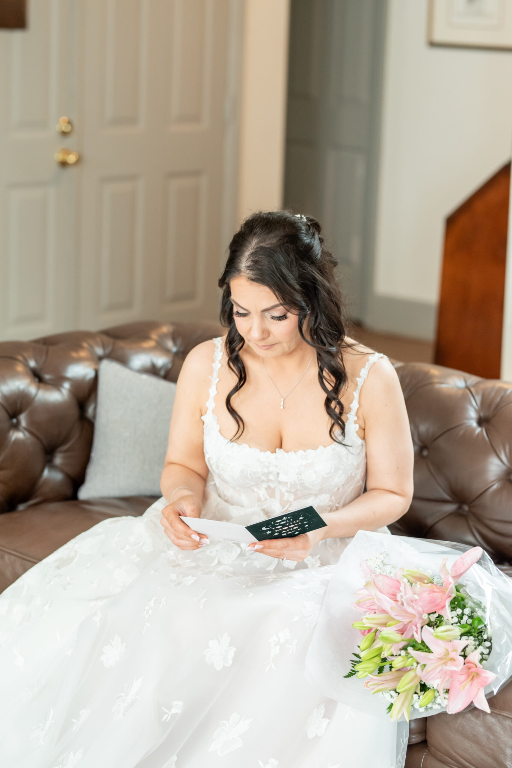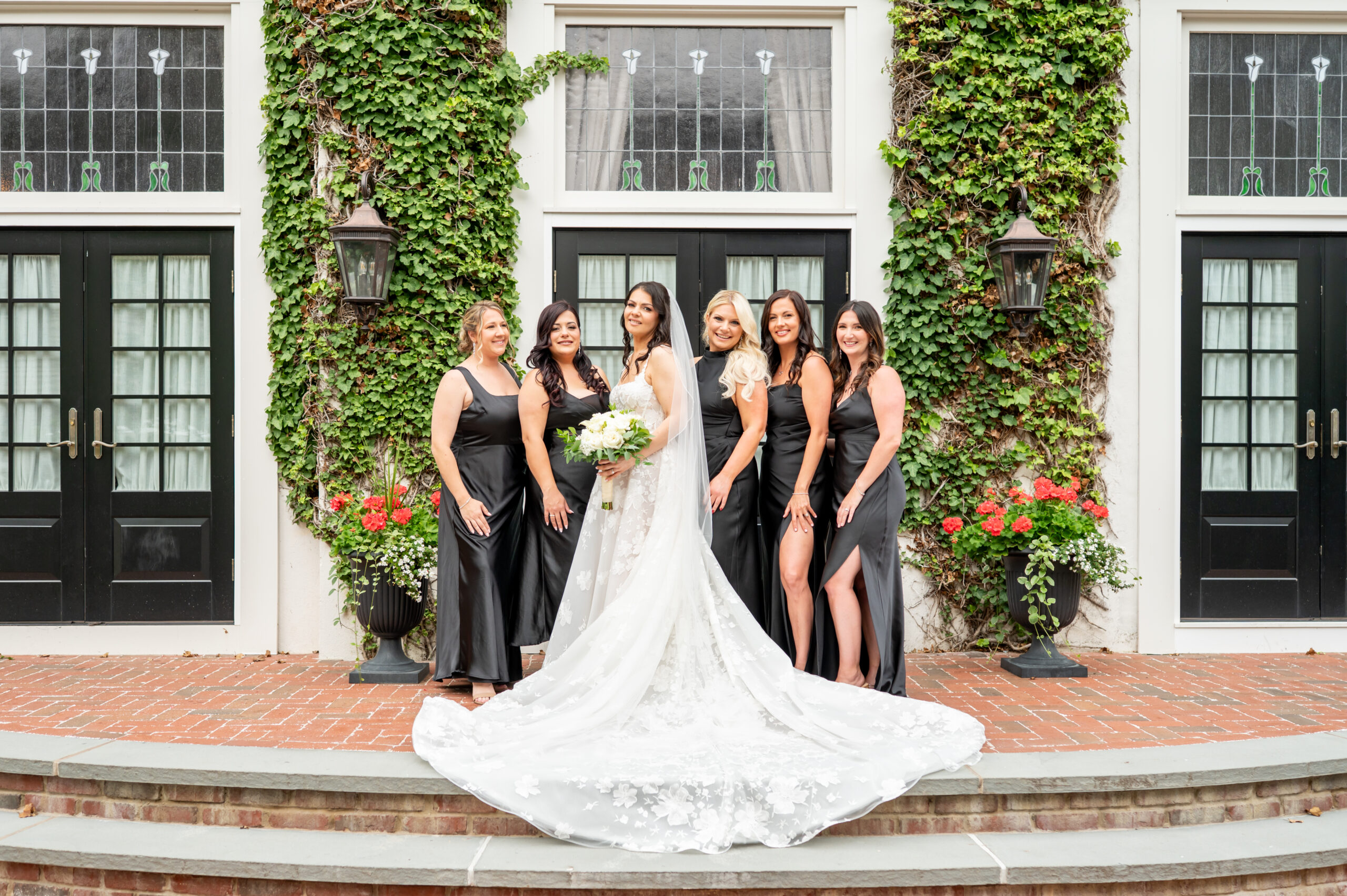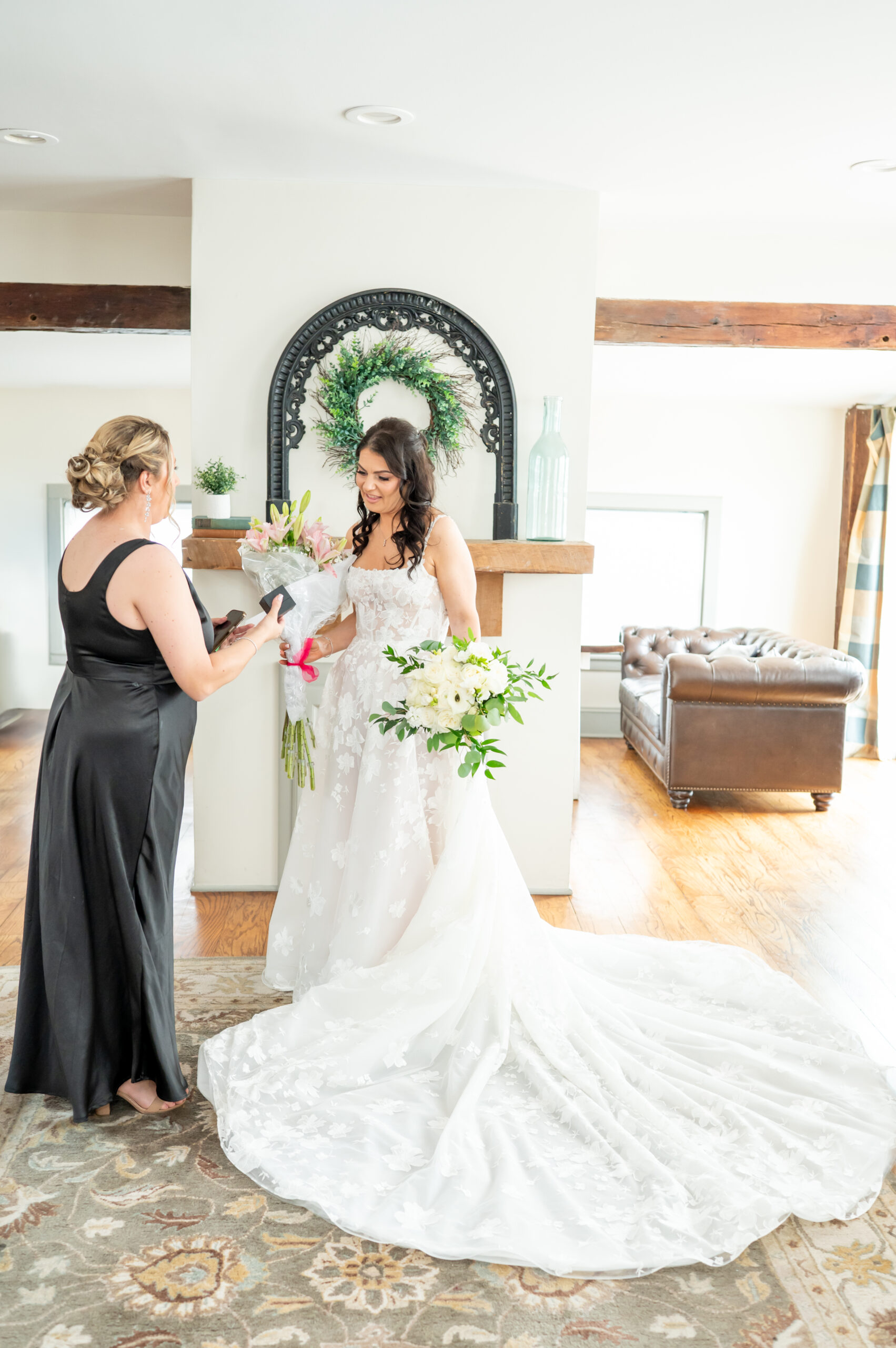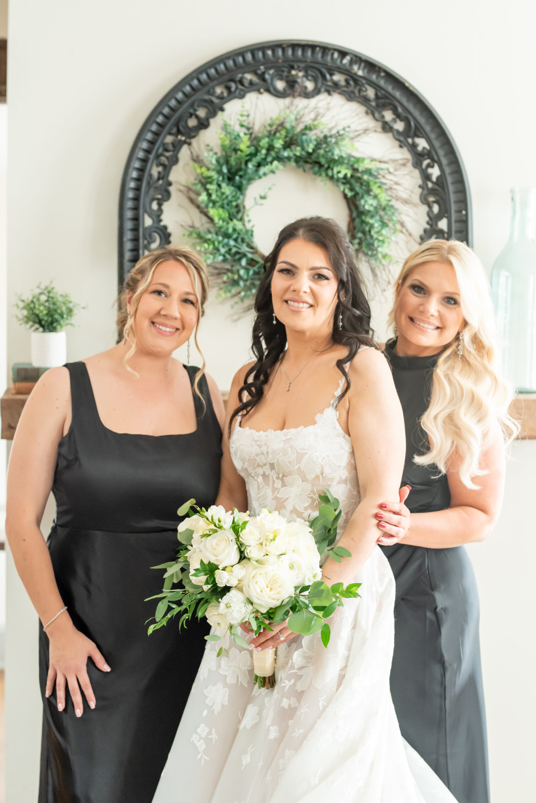 One of the most touching moments that morning was when Jess received a bouquet of lilies, her favorite flower, from Brian. It was a simple yet deeply romantic gesture that spoke volumes. Jess slipped into her breathtaking gown, an A-line lace dress with a soft nude underlay and delicate floral embroidery. Its light, sheer quality was perfect for the warm summer air, while her bridesmaids complemented the aesthetic in sleek black satin dresses. White florals, roses, baby’s breath, and calla lilies, created a striking and elegant contrast.
