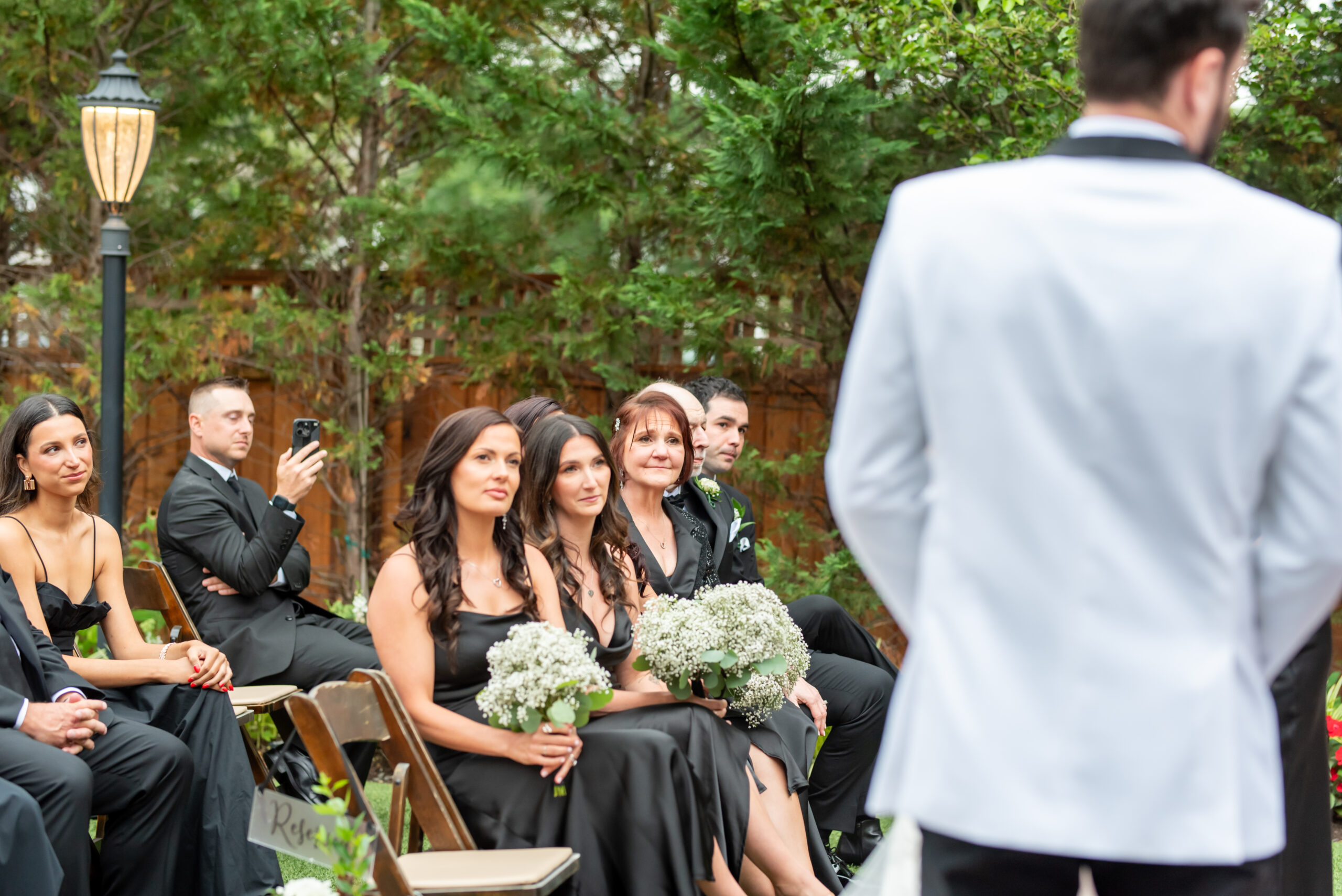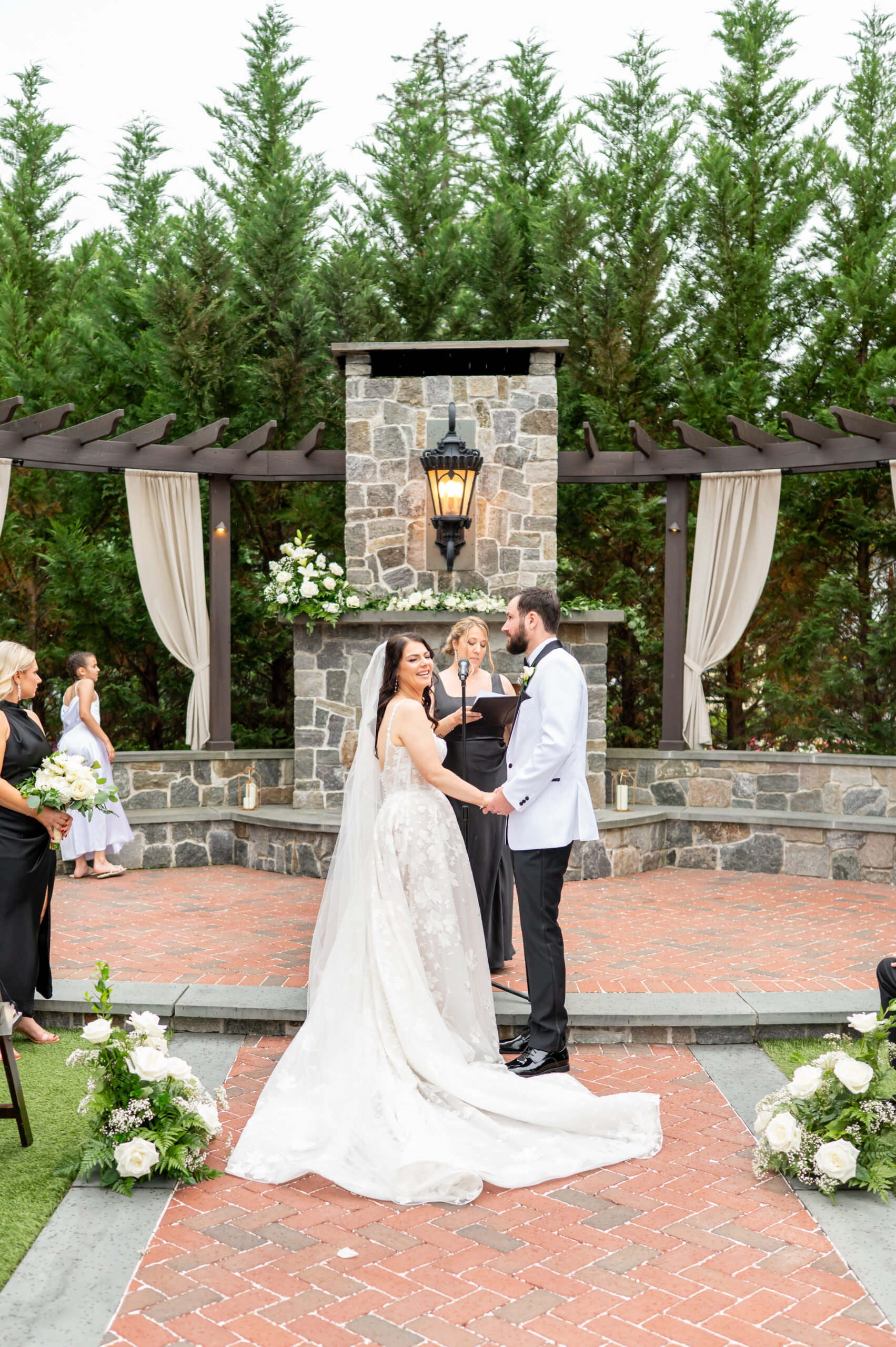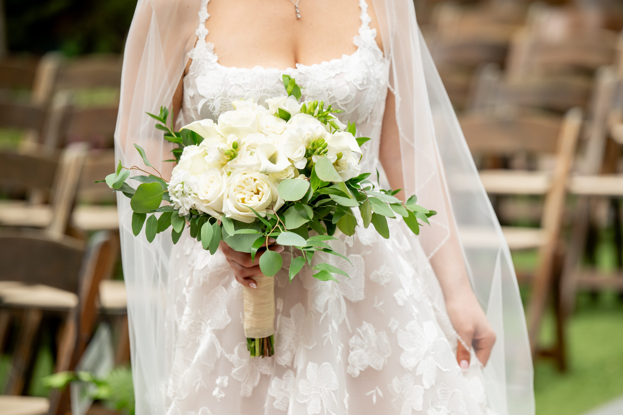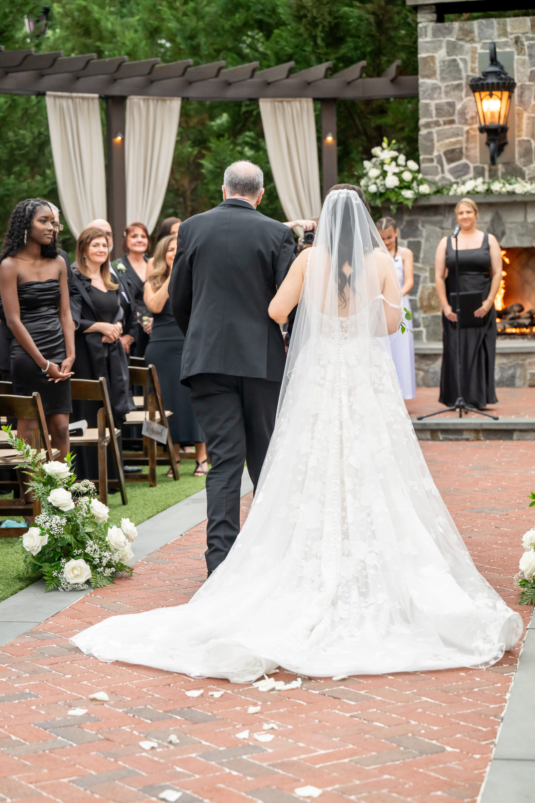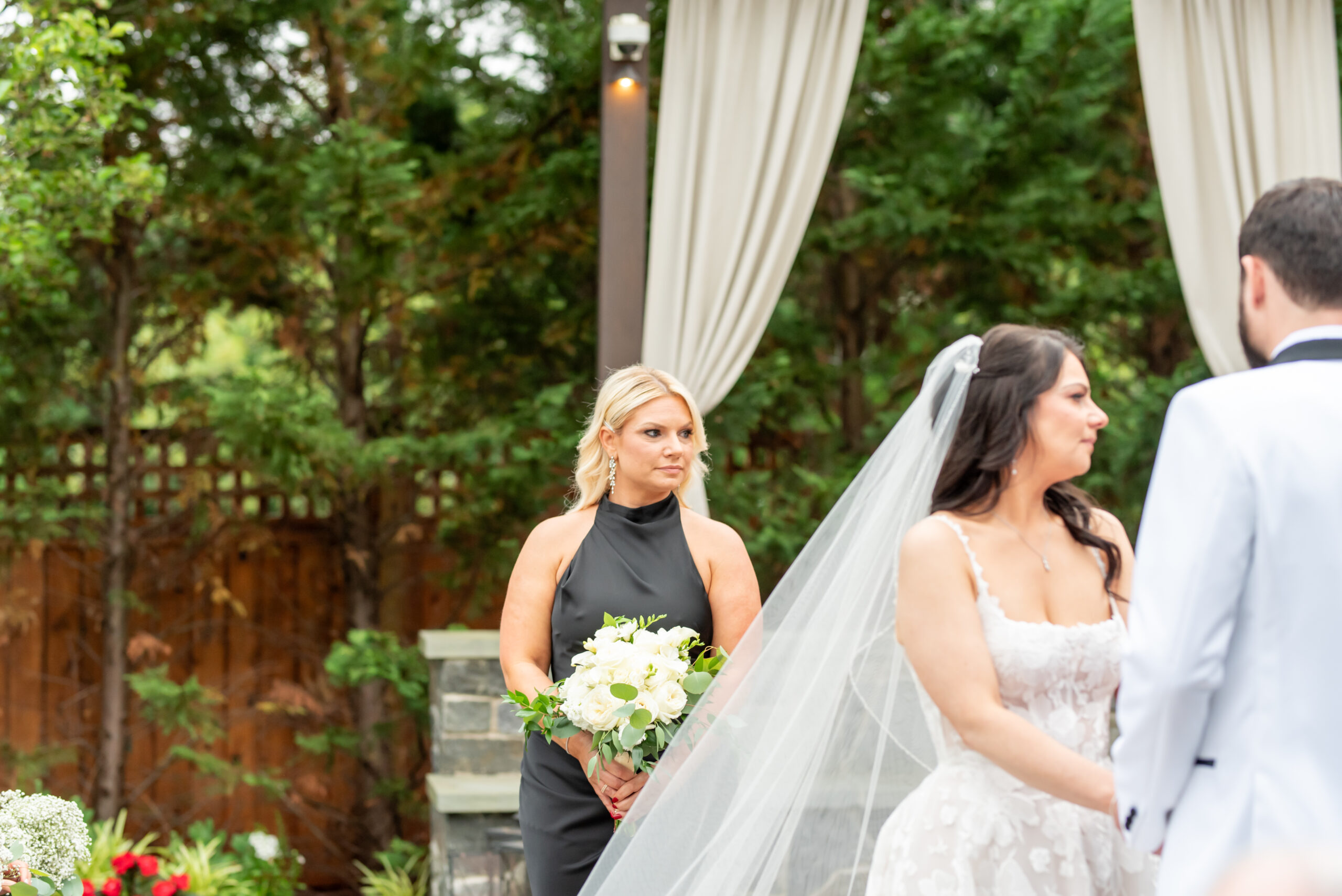 One of the most touching moments that morning was when Jess received a bouquet of lilies, her favorite flower, from Brian. It was a simple yet deeply romantic gesture that spoke volumes. Jess slipped into her breathtaking gown, an A-line lace dress with a soft nude underlay and delicate floral embroidery. Its light, sheer quality was perfect for the warm summer air, while her bridesmaids complemented the aesthetic in sleek black satin dresses. White florals, roses, baby’s breath, and calla lilies, created a striking and elegant contrast.