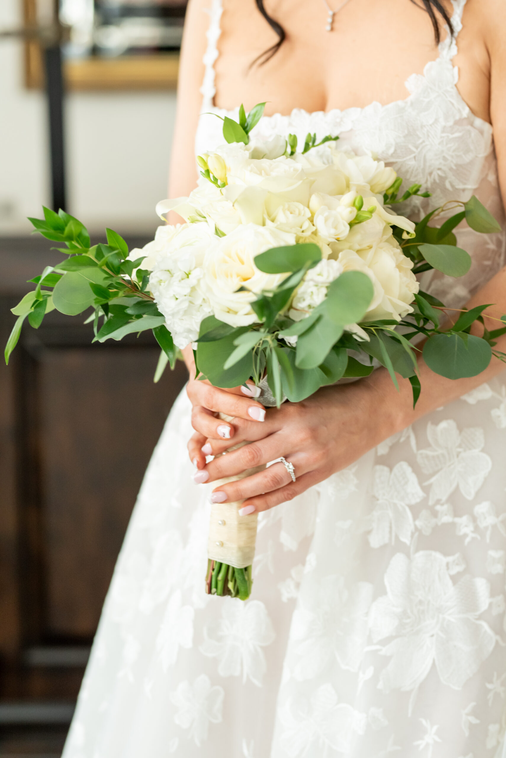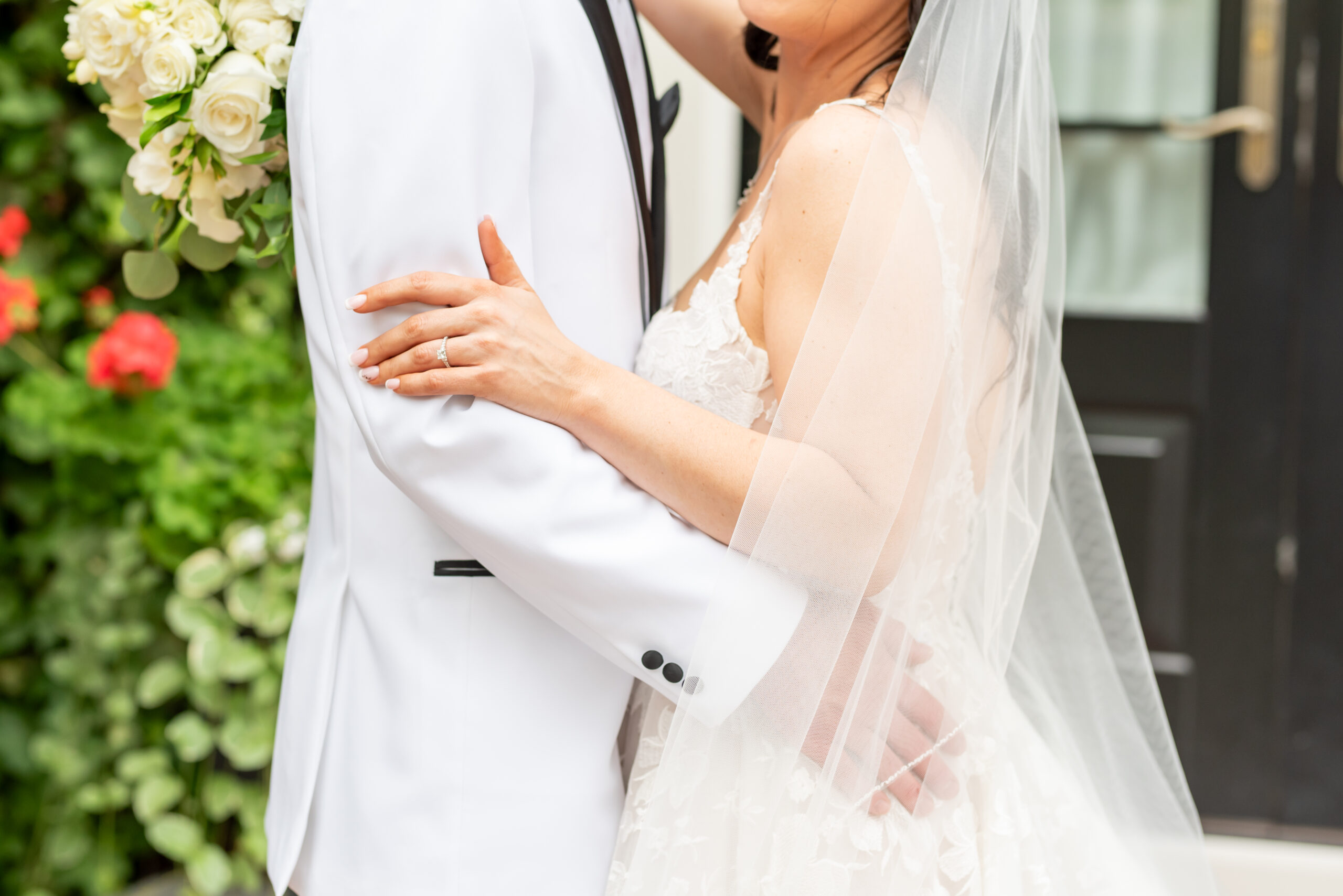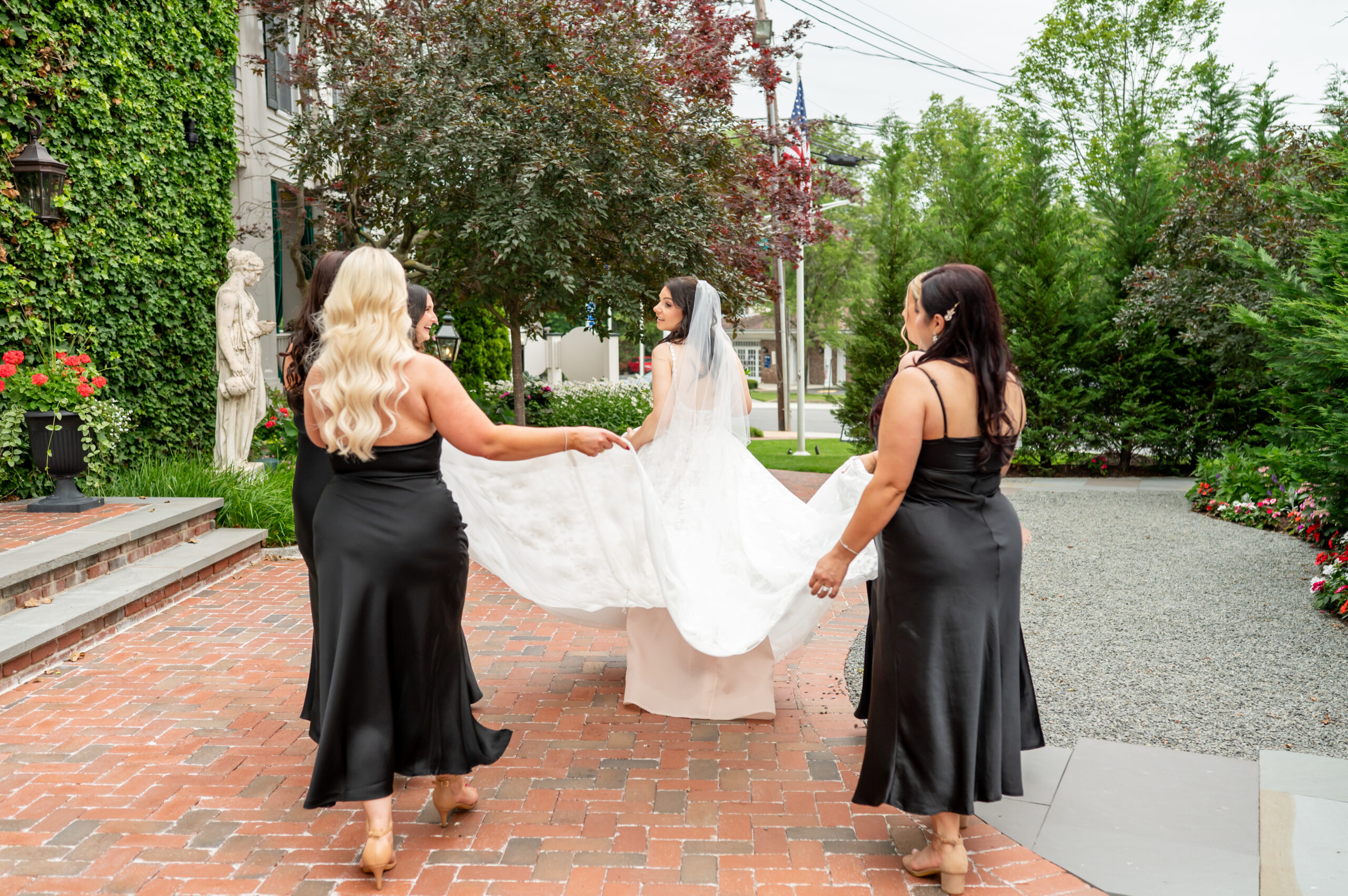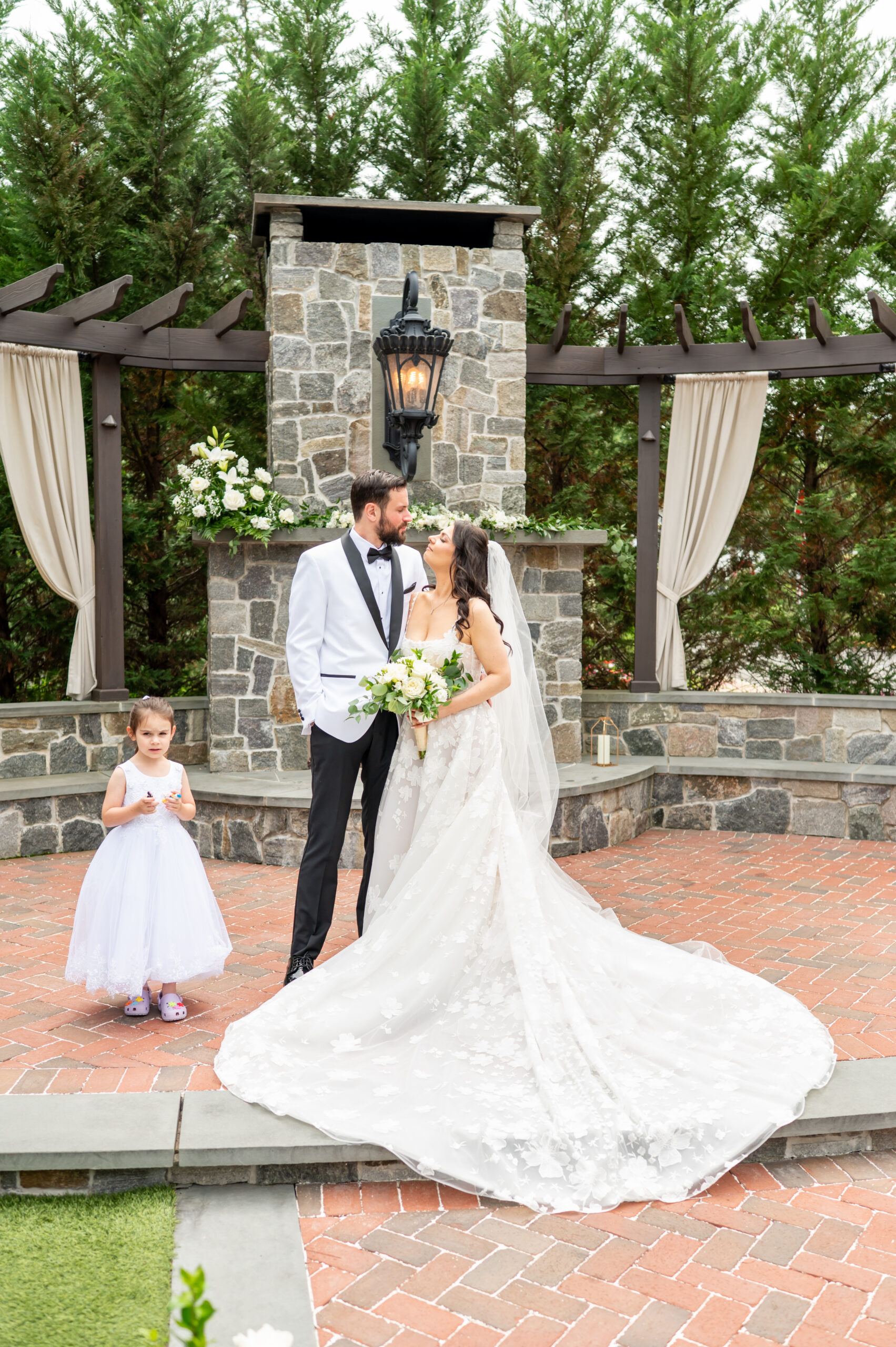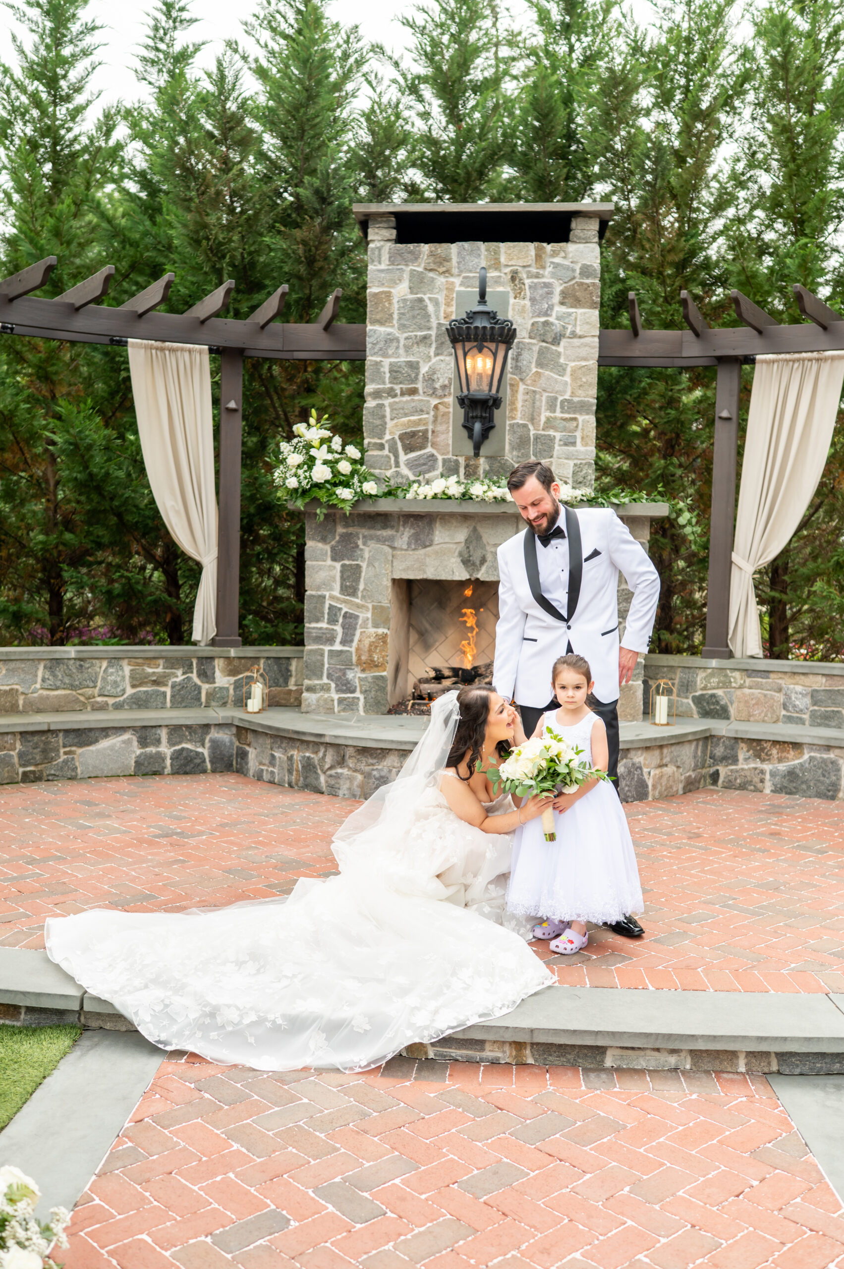 One of the most touching moments that morning was when Jess received a bouquet of lilies, her favorite flower, from Brian. It was a simple yet deeply romantic gesture that spoke volumes. Jess slipped into her breathtaking gown, an A-line lace dress with a soft nude underlay and delicate floral embroidery. Its light, sheer quality was perfect for the warm summer air, while her bridesmaids complemented the aesthetic in sleek black satin dresses. White florals, roses, baby’s breath, and calla lilies, created a striking and elegant contrast.