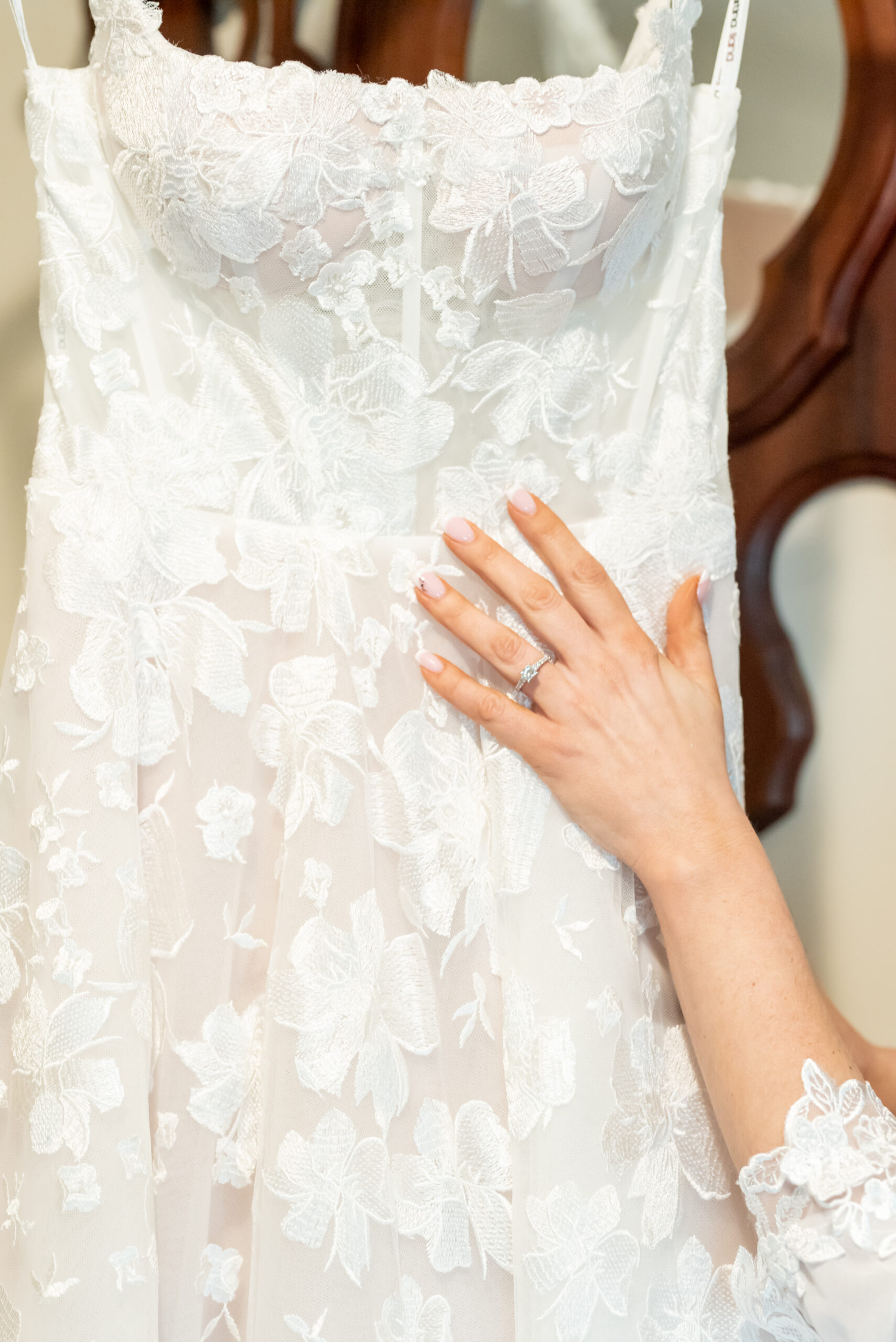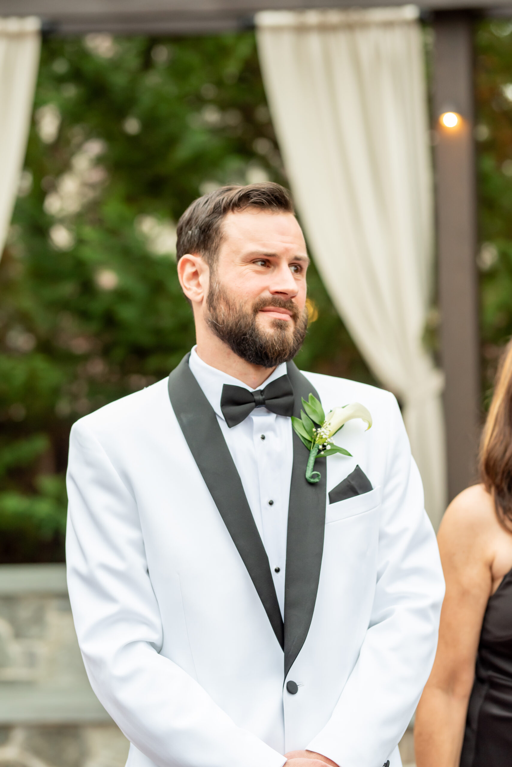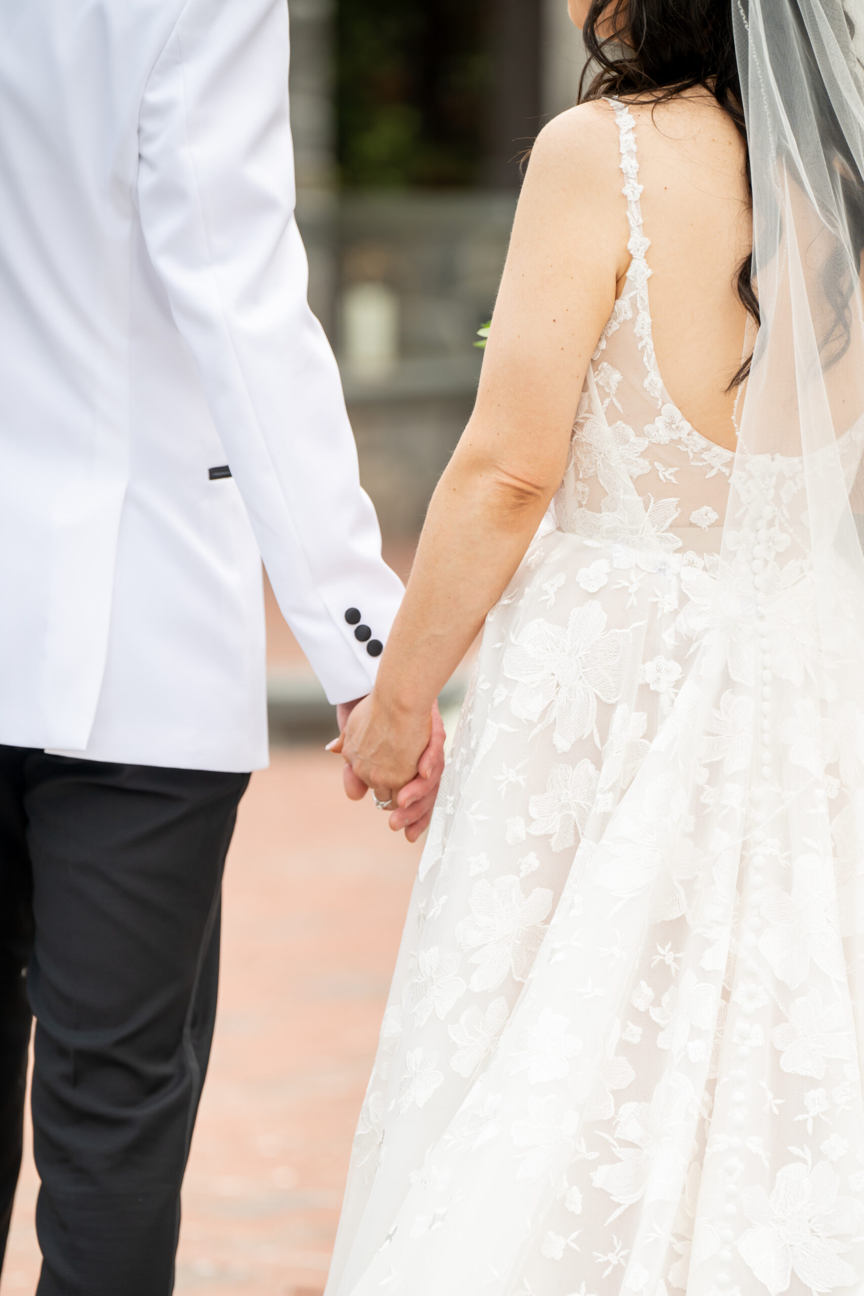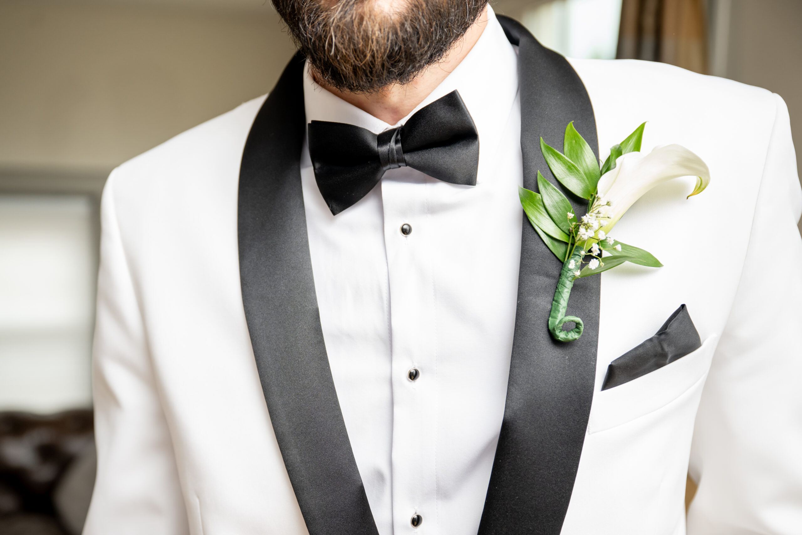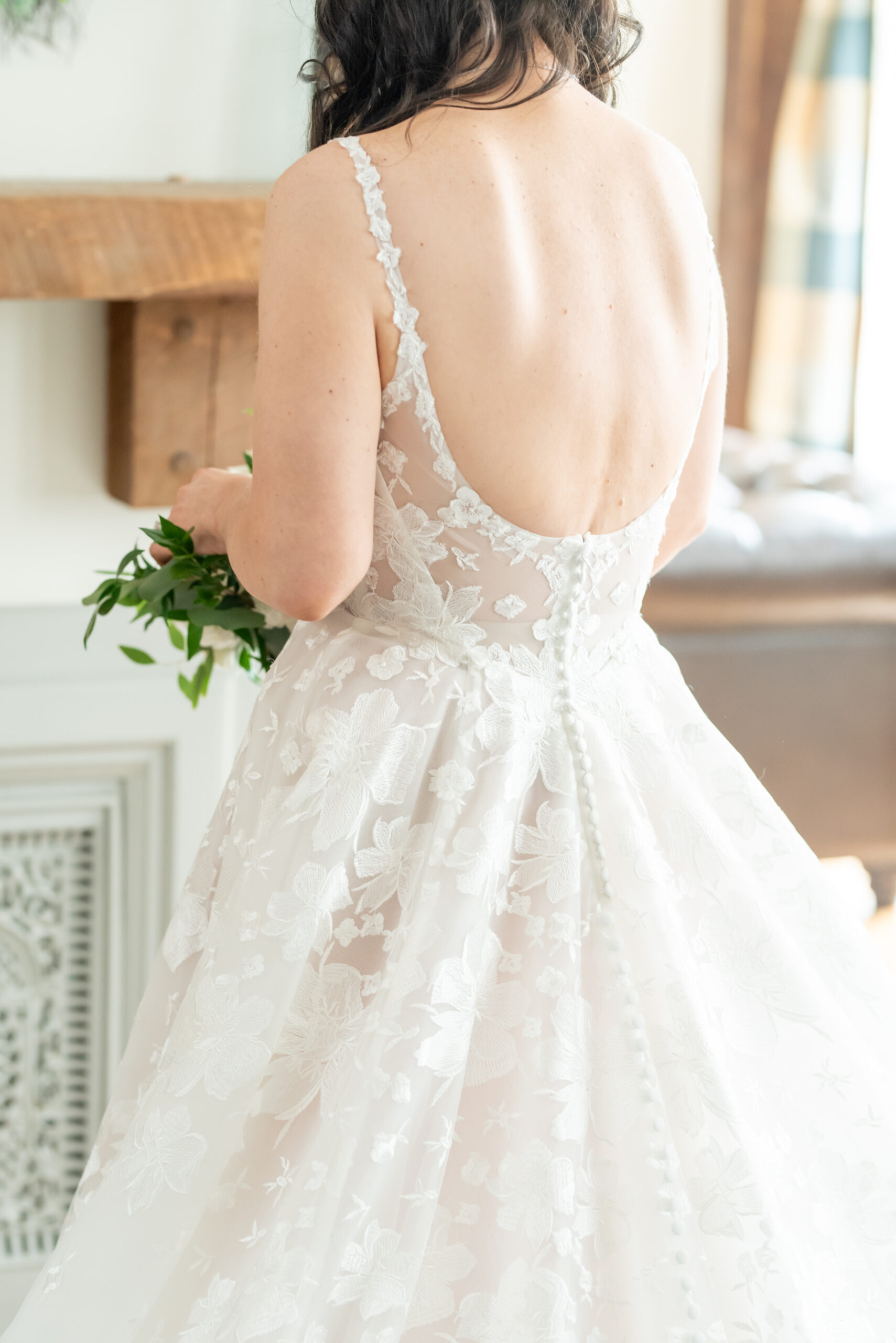 One of the most touching moments that morning was when Jess received a bouquet of lilies, her favorite flower, from Brian. It was a simple yet deeply romantic gesture that spoke volumes. Jess slipped into her breathtaking gown, an A-line lace dress with a soft nude underlay and delicate floral embroidery. Its light, sheer quality was perfect for the warm summer air, while her bridesmaids complemented the aesthetic in sleek black satin dresses. White florals, roses, baby’s breath, and calla lilies, created a striking and elegant contrast.