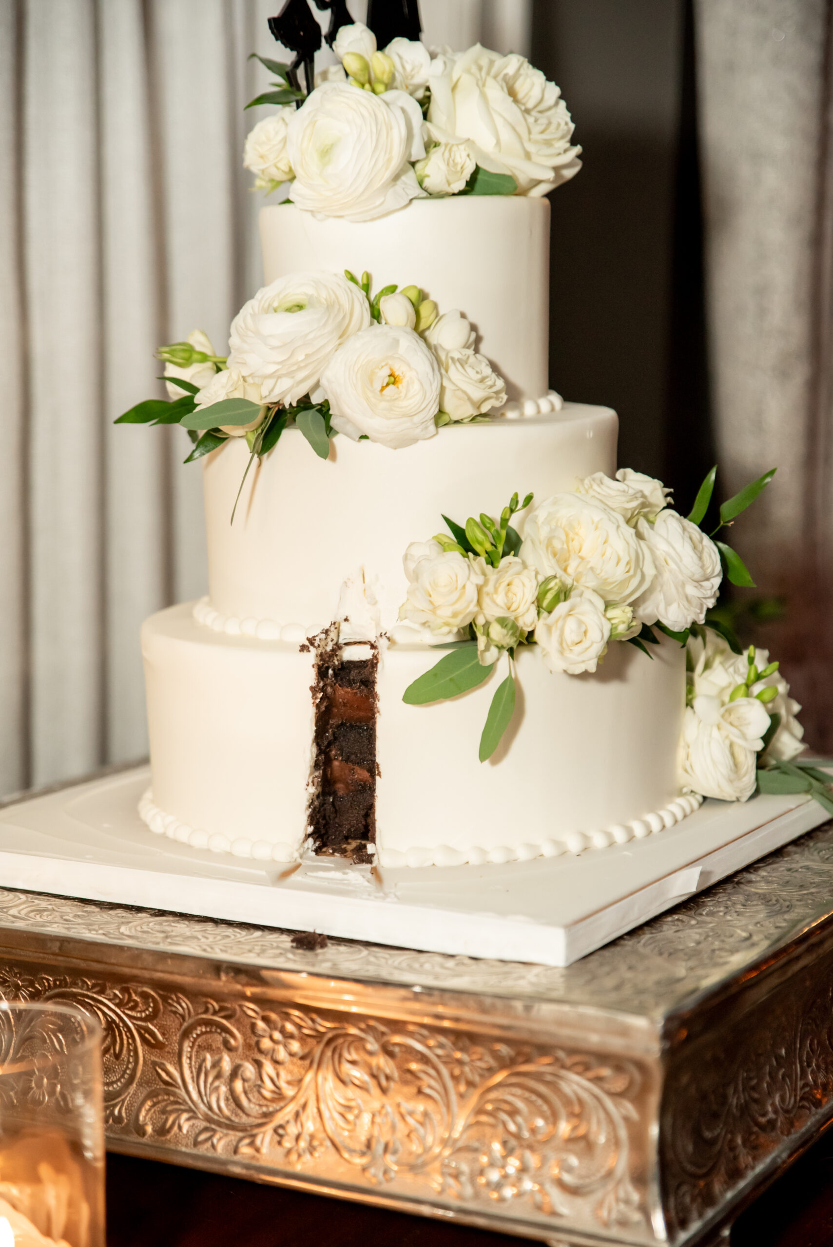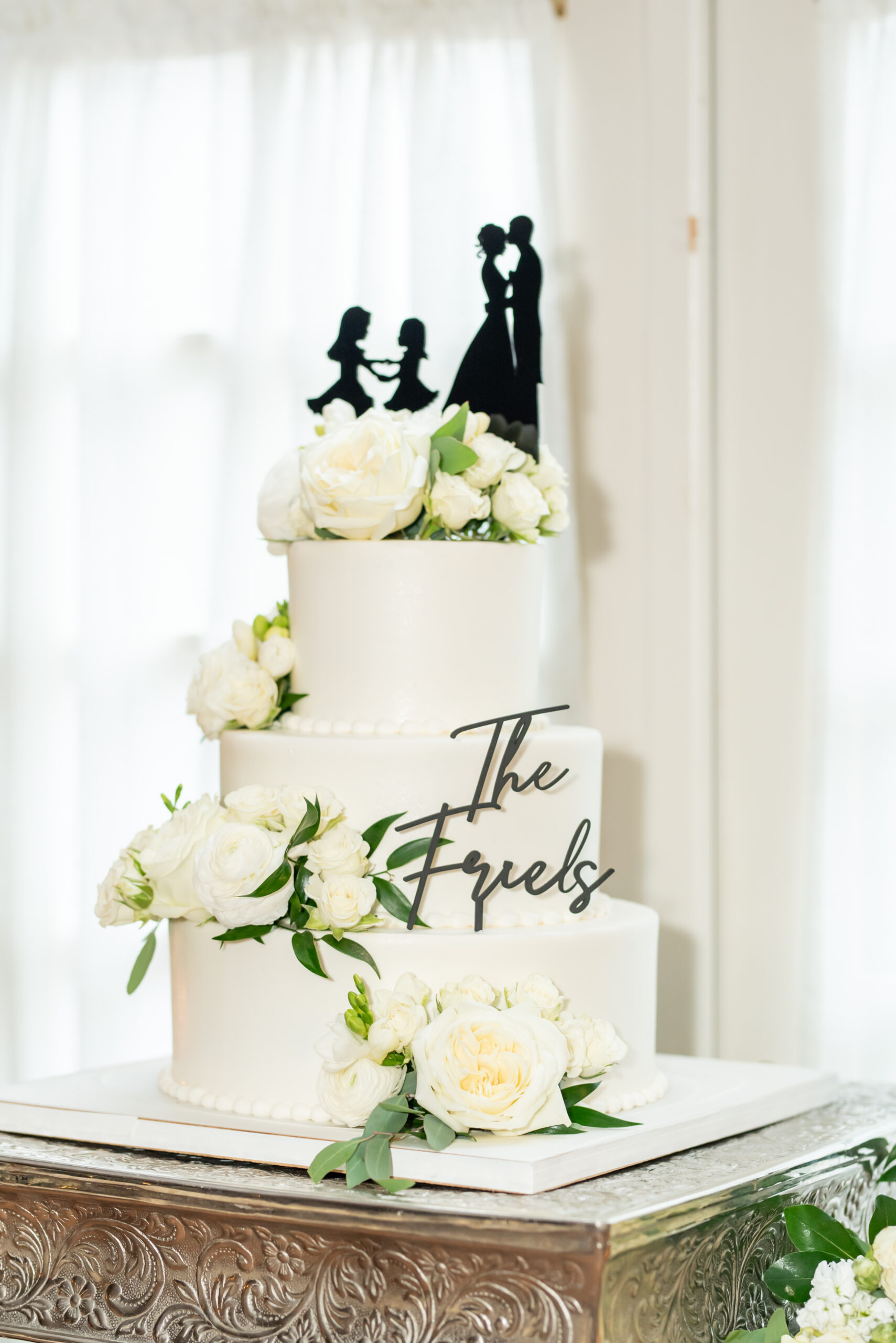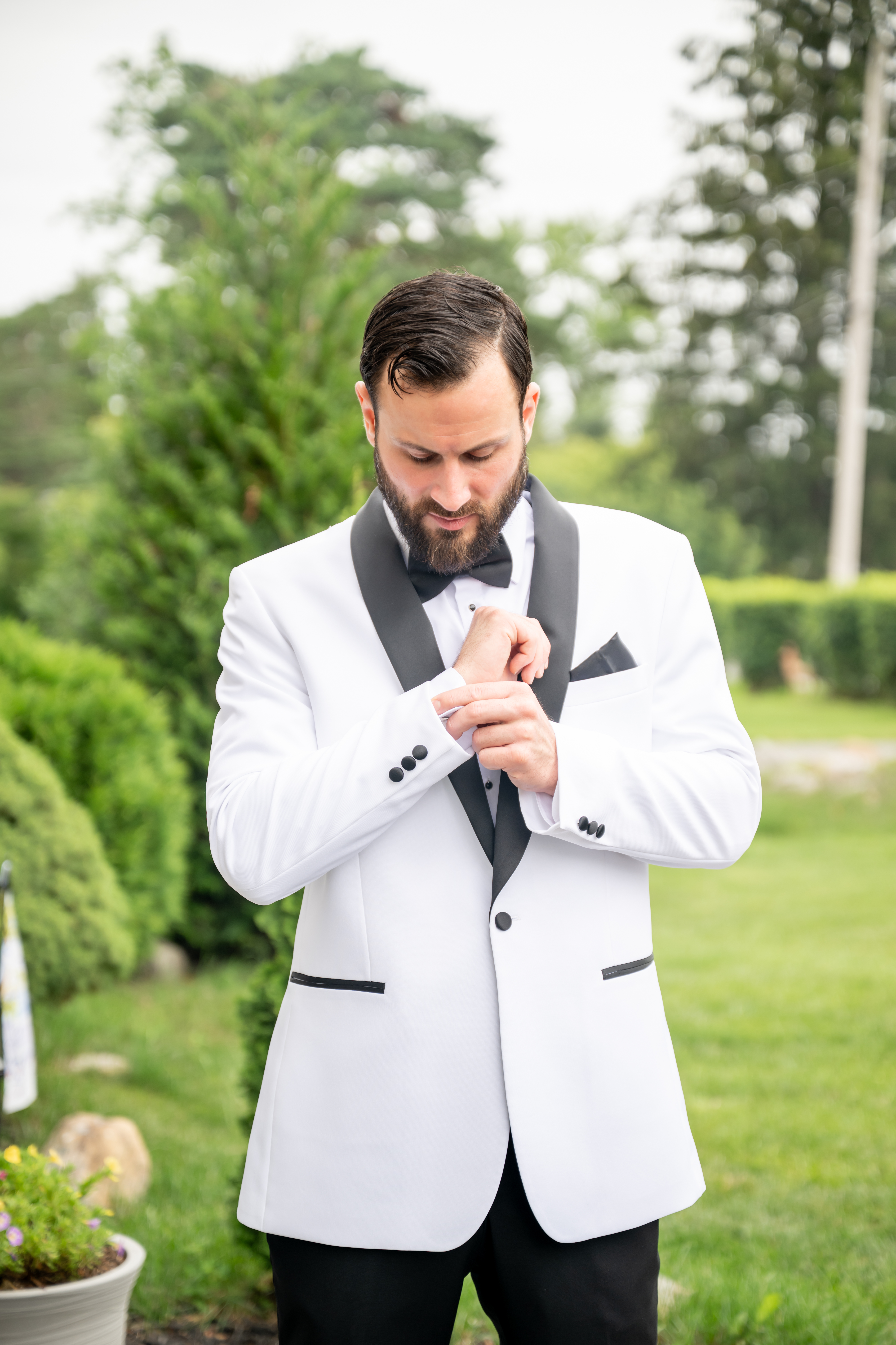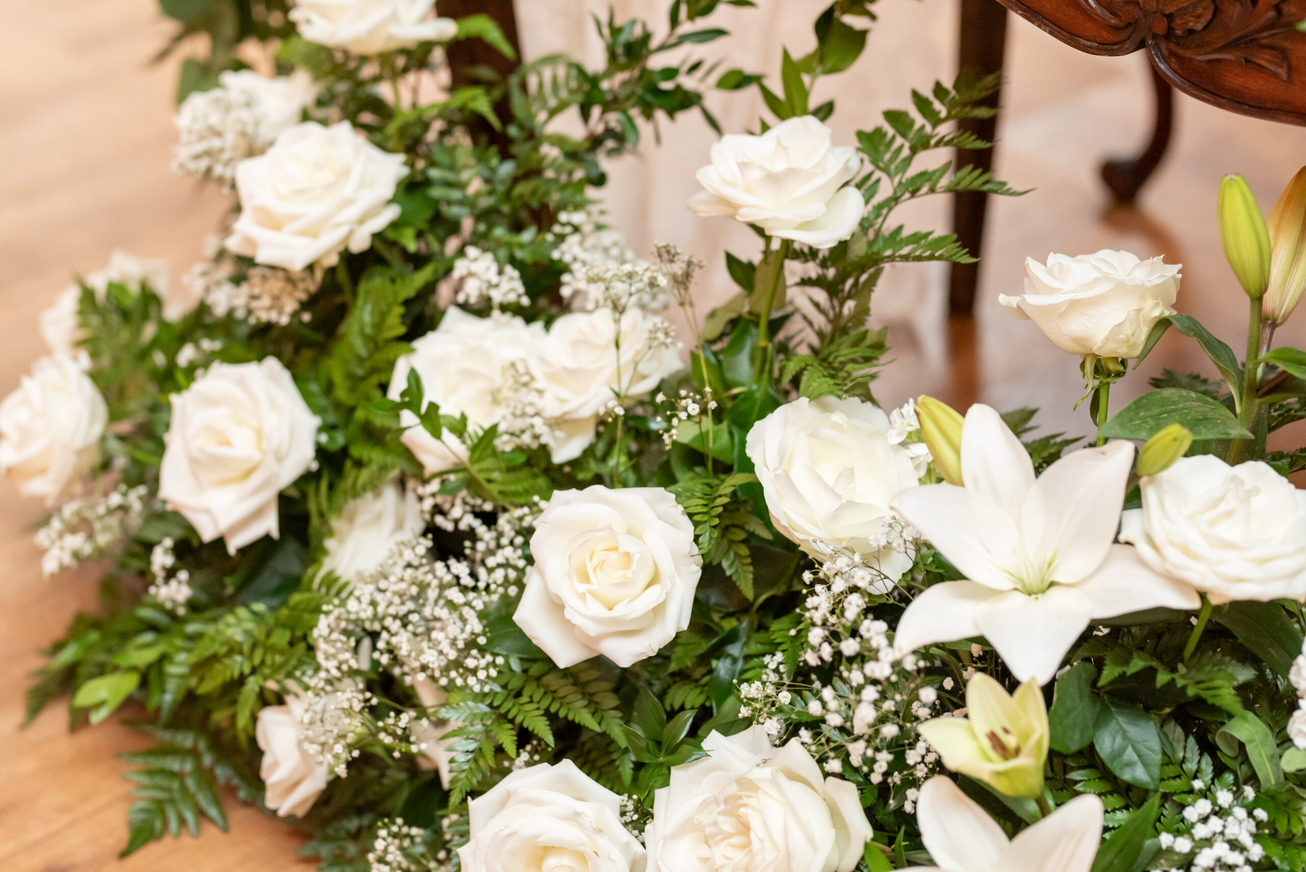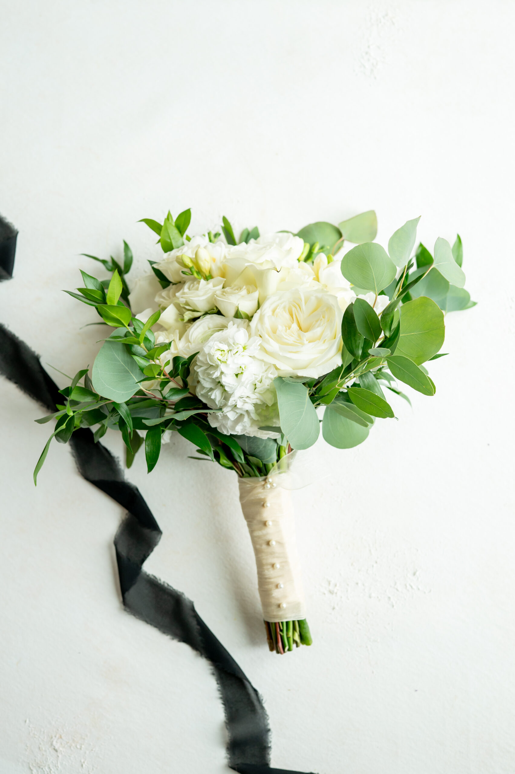 One of the most touching moments that morning was when Jess received a bouquet of lilies, her favorite flower, from Brian. It was a simple yet deeply romantic gesture that spoke volumes. Jess slipped into her breathtaking gown, an A-line lace dress with a soft nude underlay and delicate floral embroidery. Its light, sheer quality was perfect for the warm summer air, while her bridesmaids complemented the aesthetic in sleek black satin dresses. White florals, roses, baby’s breath, and calla lilies, created a striking and elegant contrast.