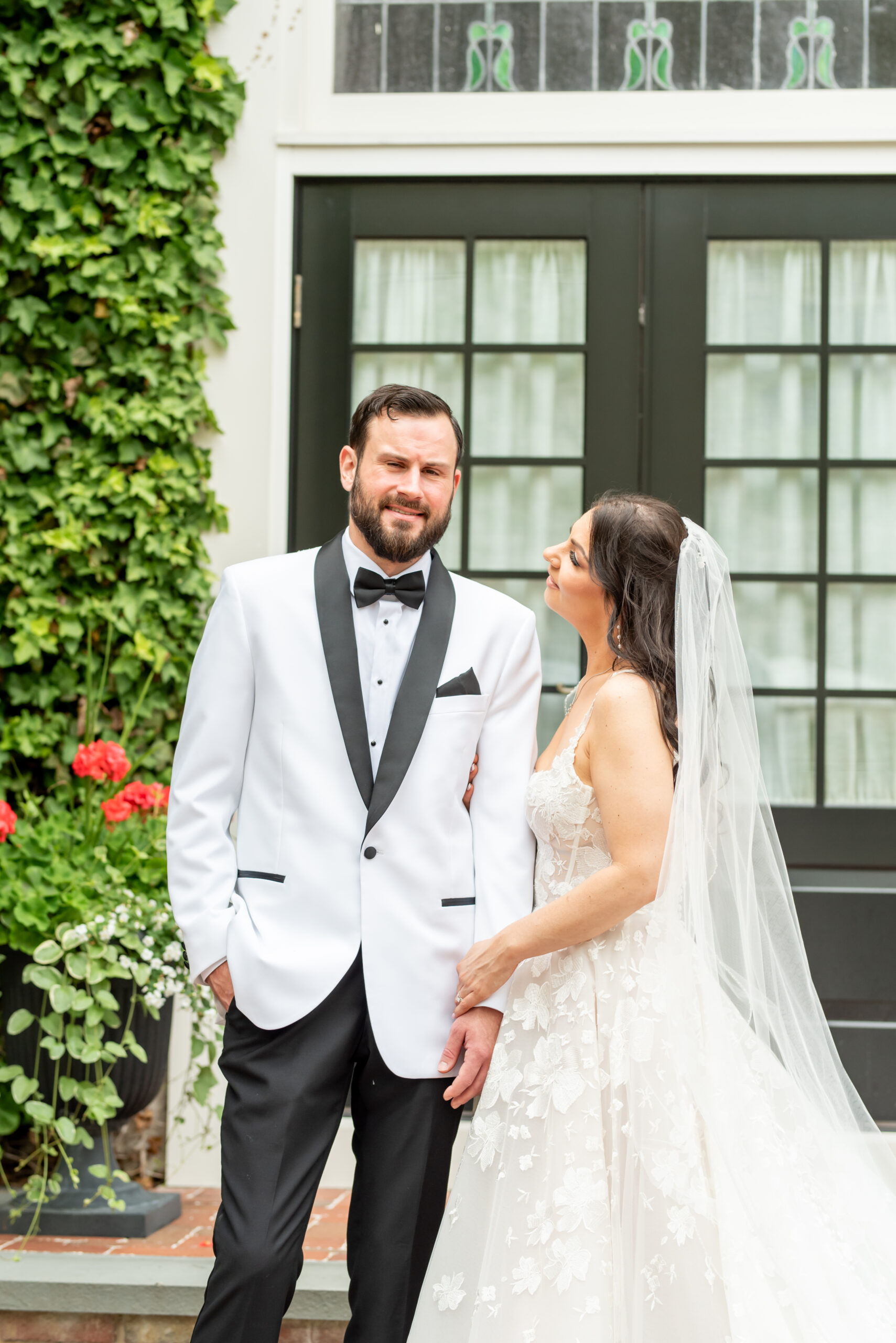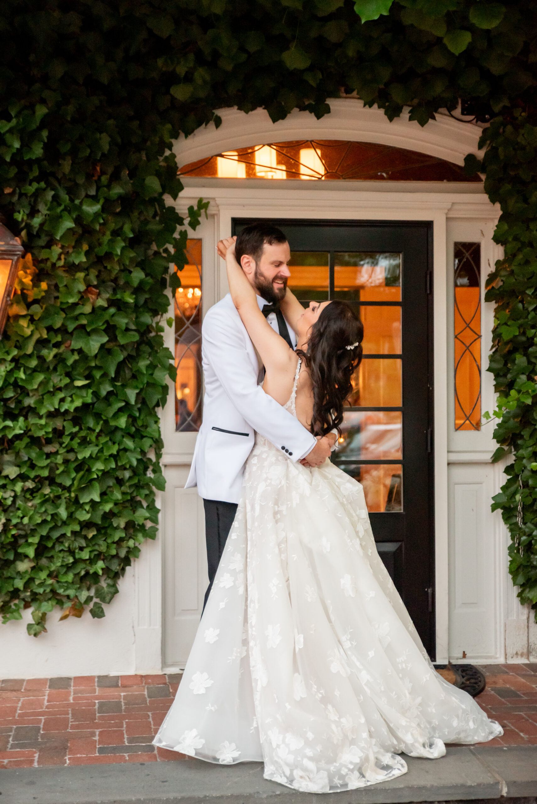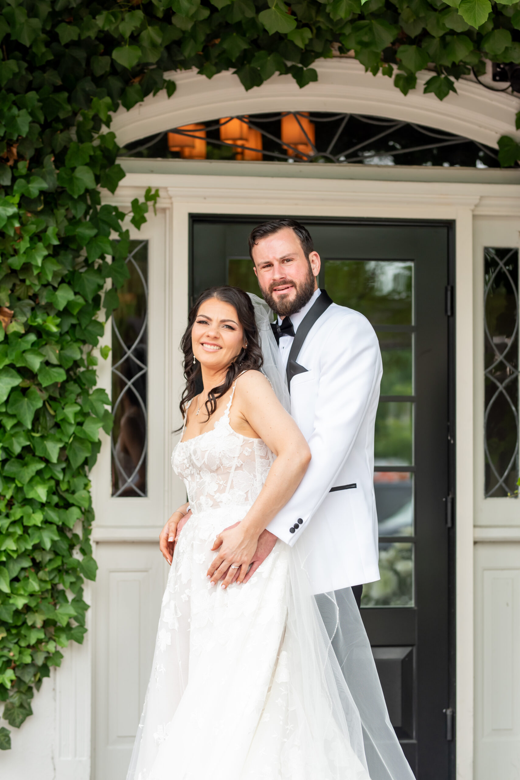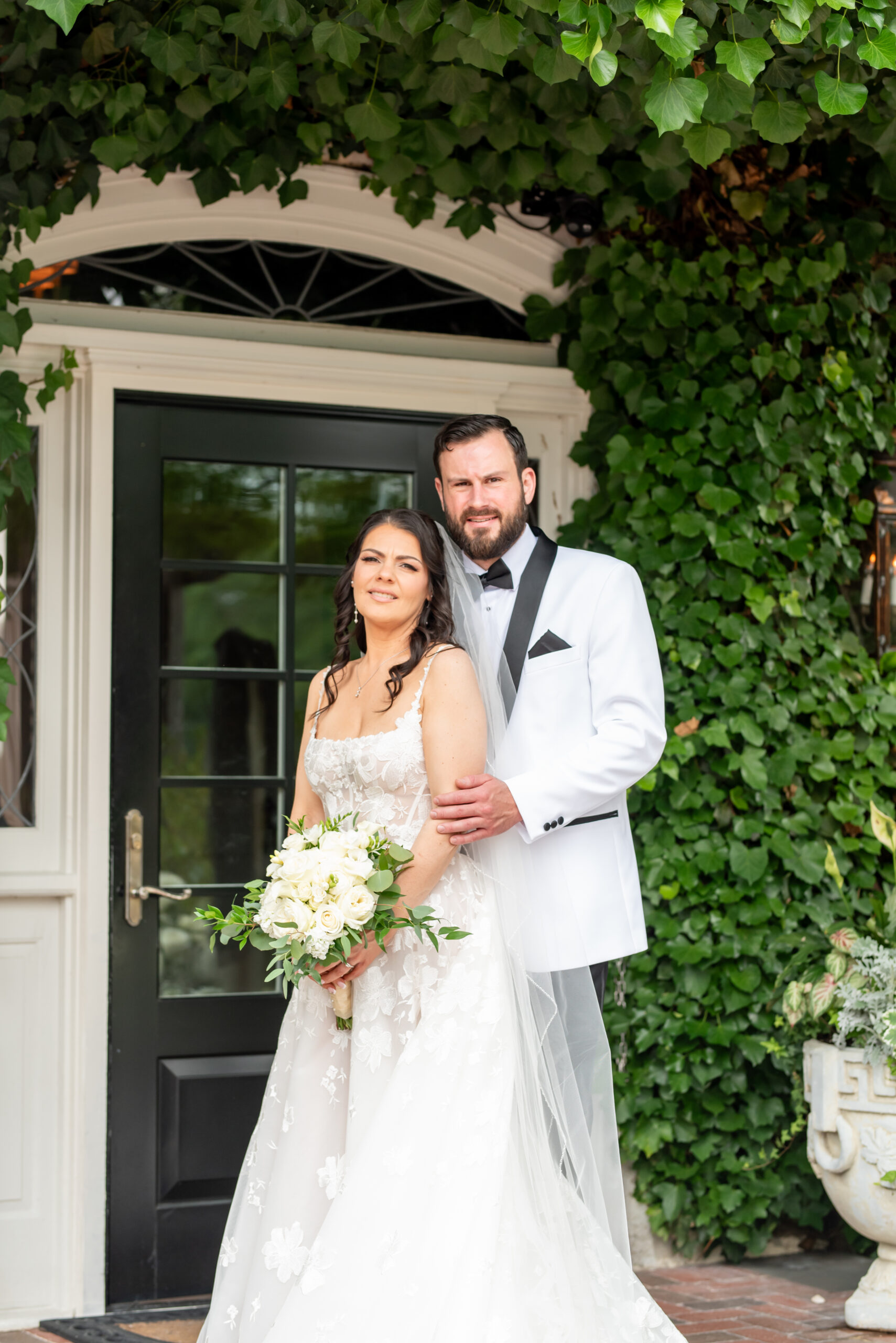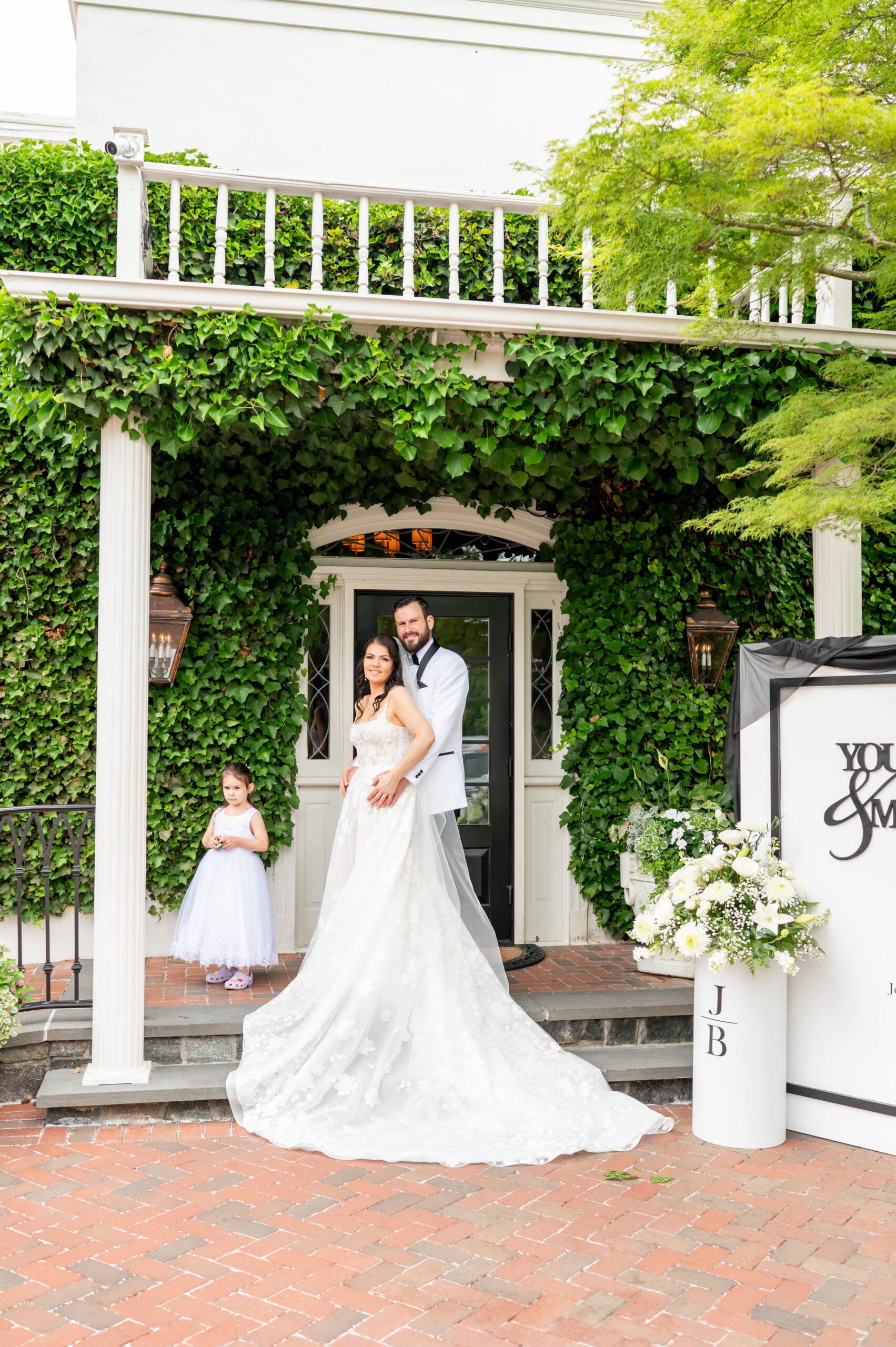 Their first look took place in the ceremony space, and it was as emotional as it was beautiful. Brian’s face said it all. Tears welled up as he saw Jess, and in that quiet moment, the world melted away. Not long after, their daughter Khloe joined us, running and playing nearby as we explored the grounds for portraits. The ivy-covered walls, black doors, and Tiffany glass details added to the charm of this incredible venue, while the surrounding gardens brought softness and light.