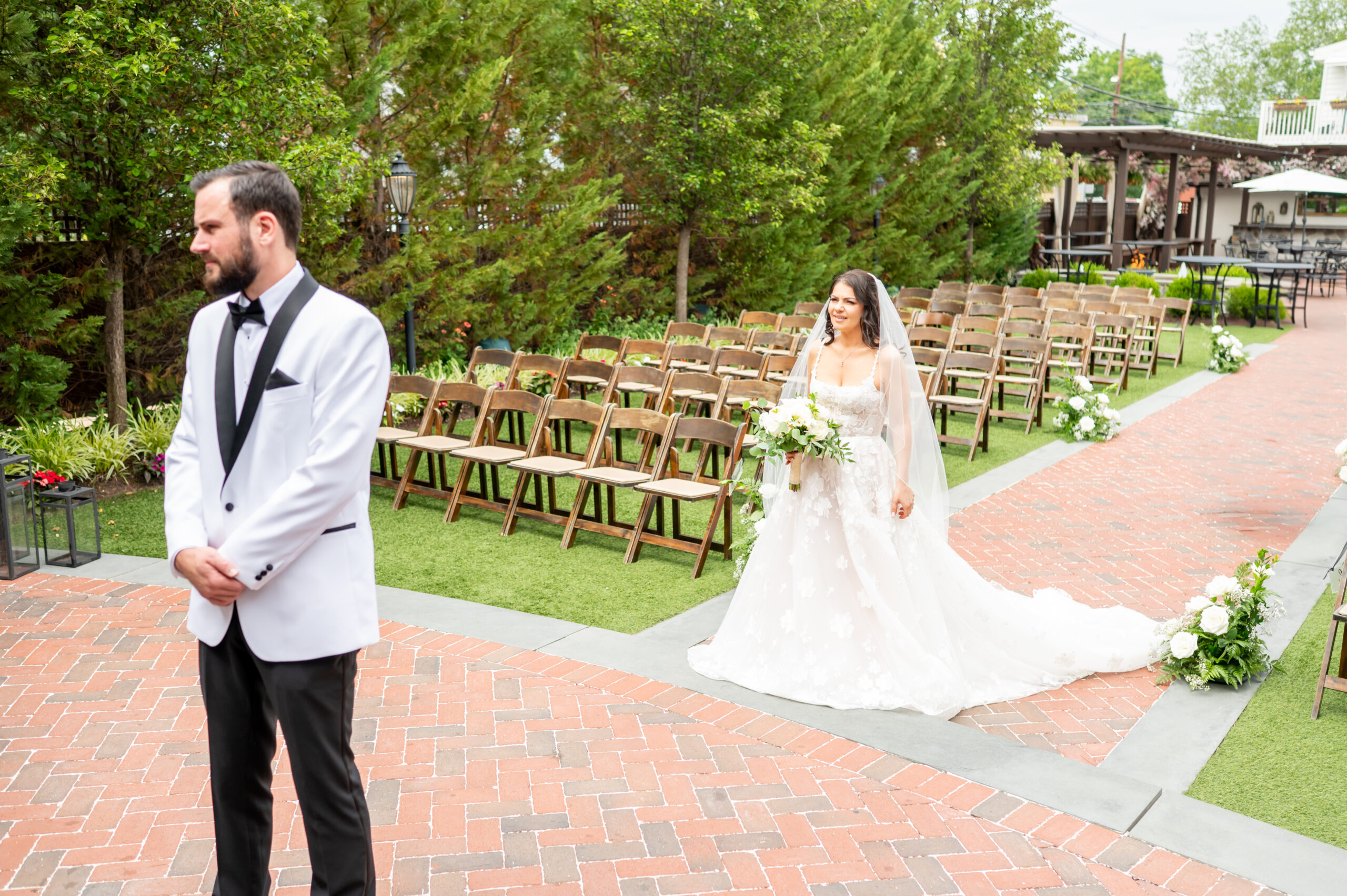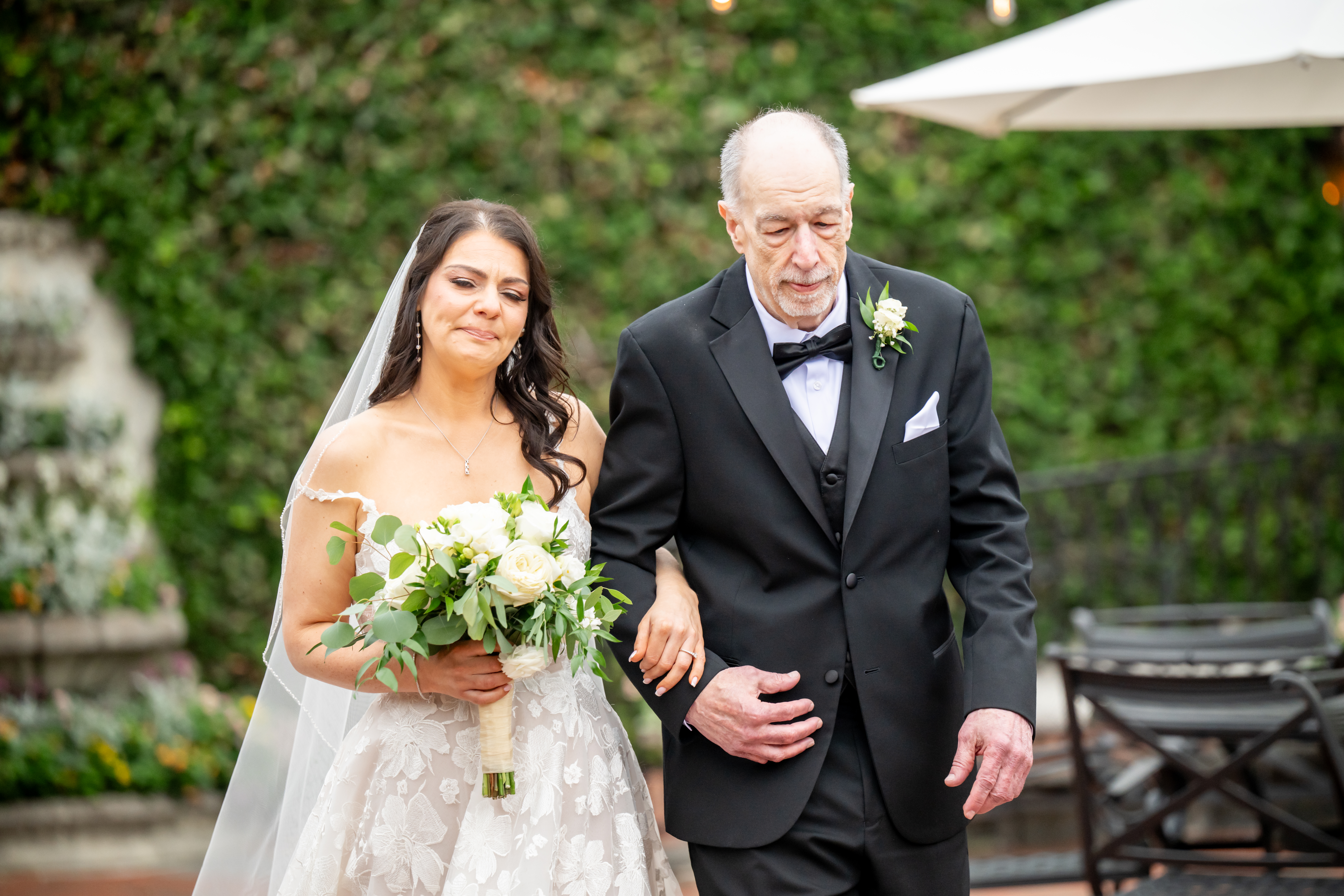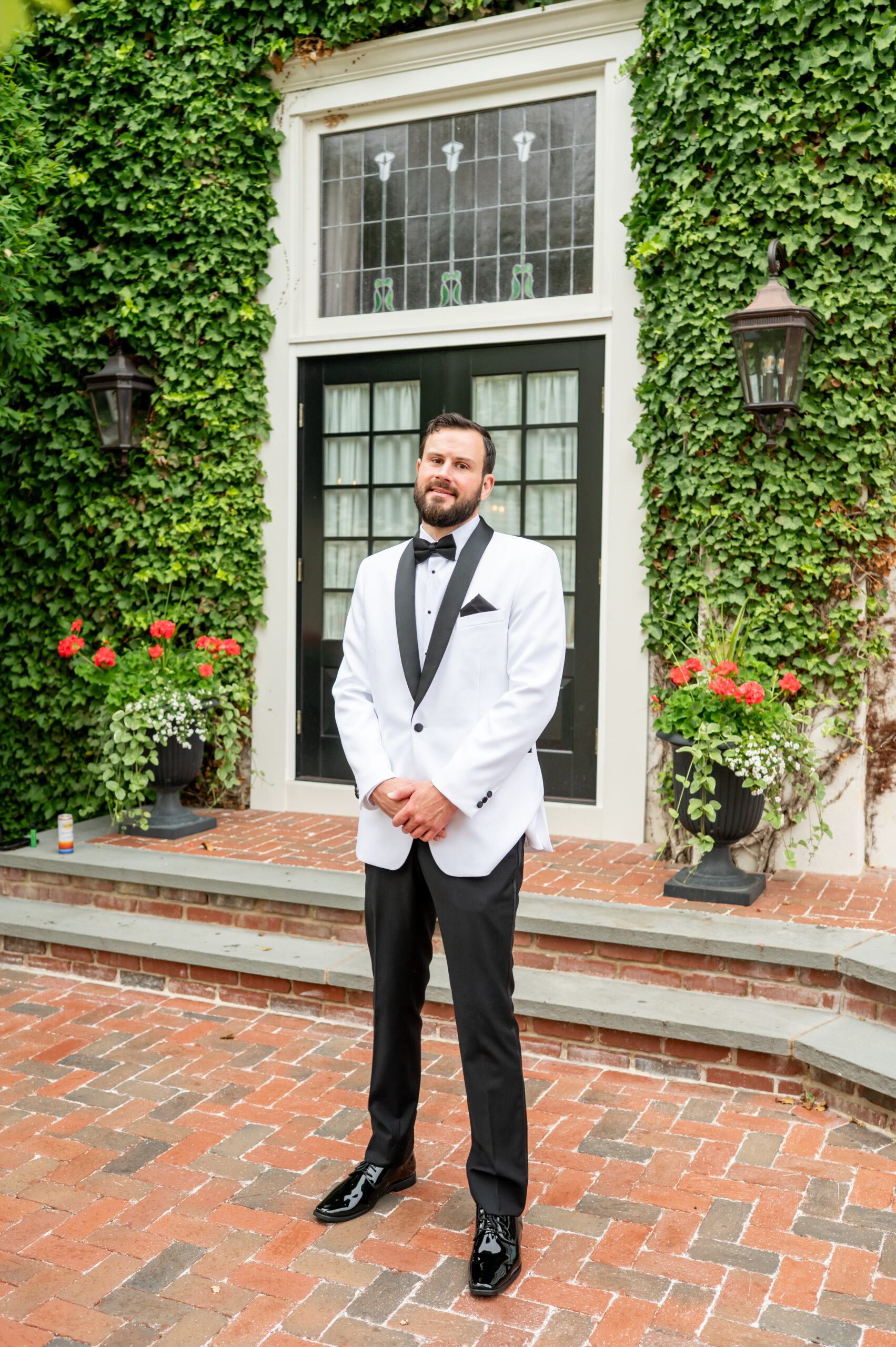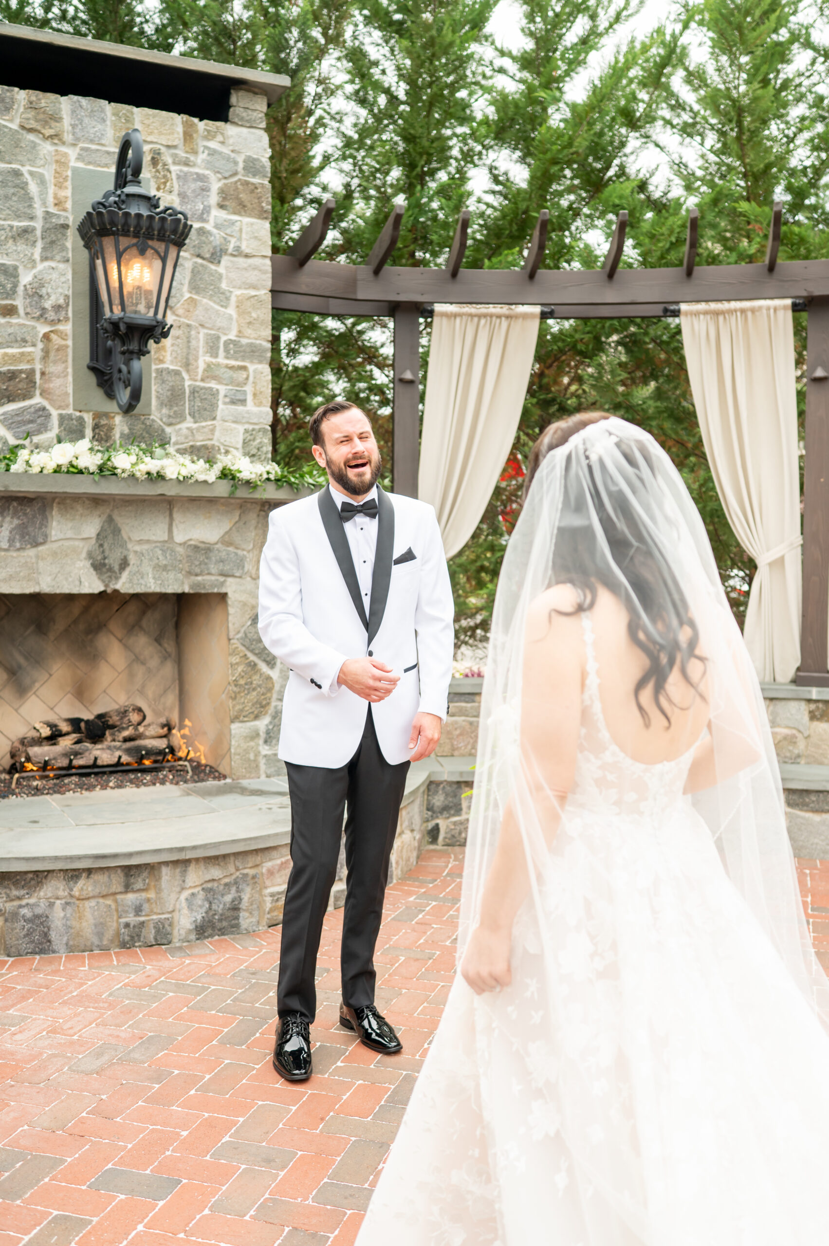 Their first look took place in the ceremony space, and it was as emotional as it was beautiful. Brian’s face said it all. Tears welled up as he saw Jess, and in that quiet moment, the world melted away. Not long after, their daughter Khloe joined us, running and playing nearby as we explored the grounds for portraits. The ivy-covered walls, black doors, and Tiffany glass details added to the charm of this incredible venue, while the surrounding gardens brought softness and light.