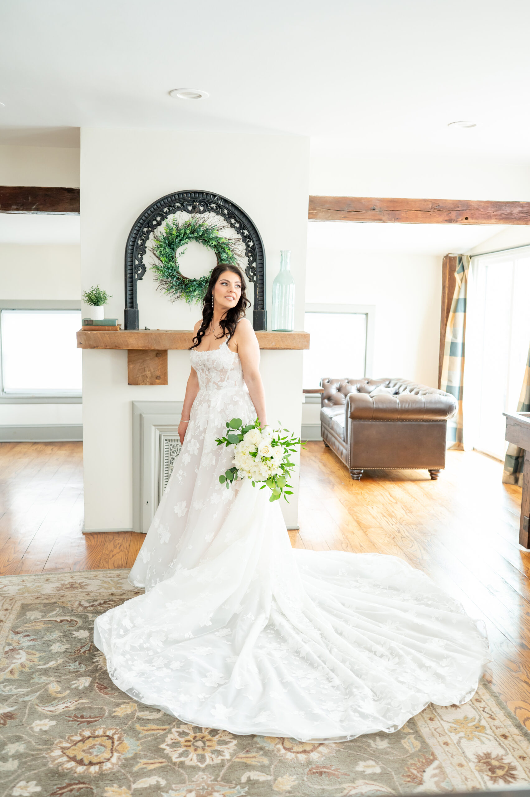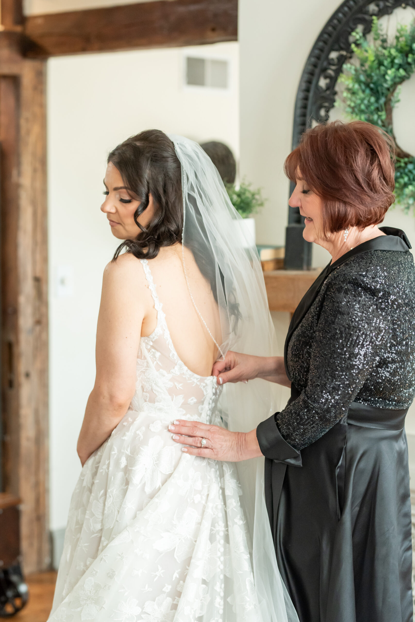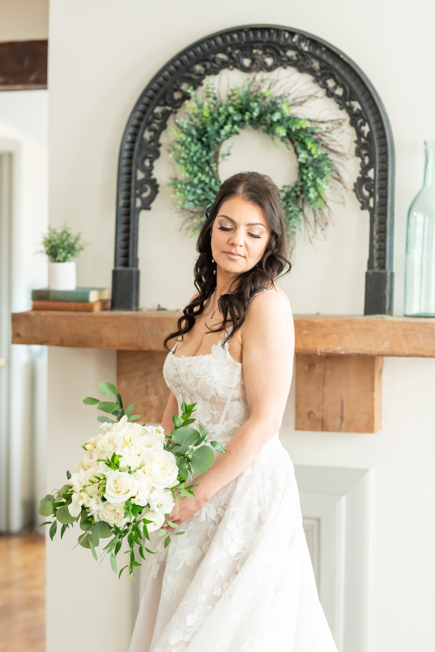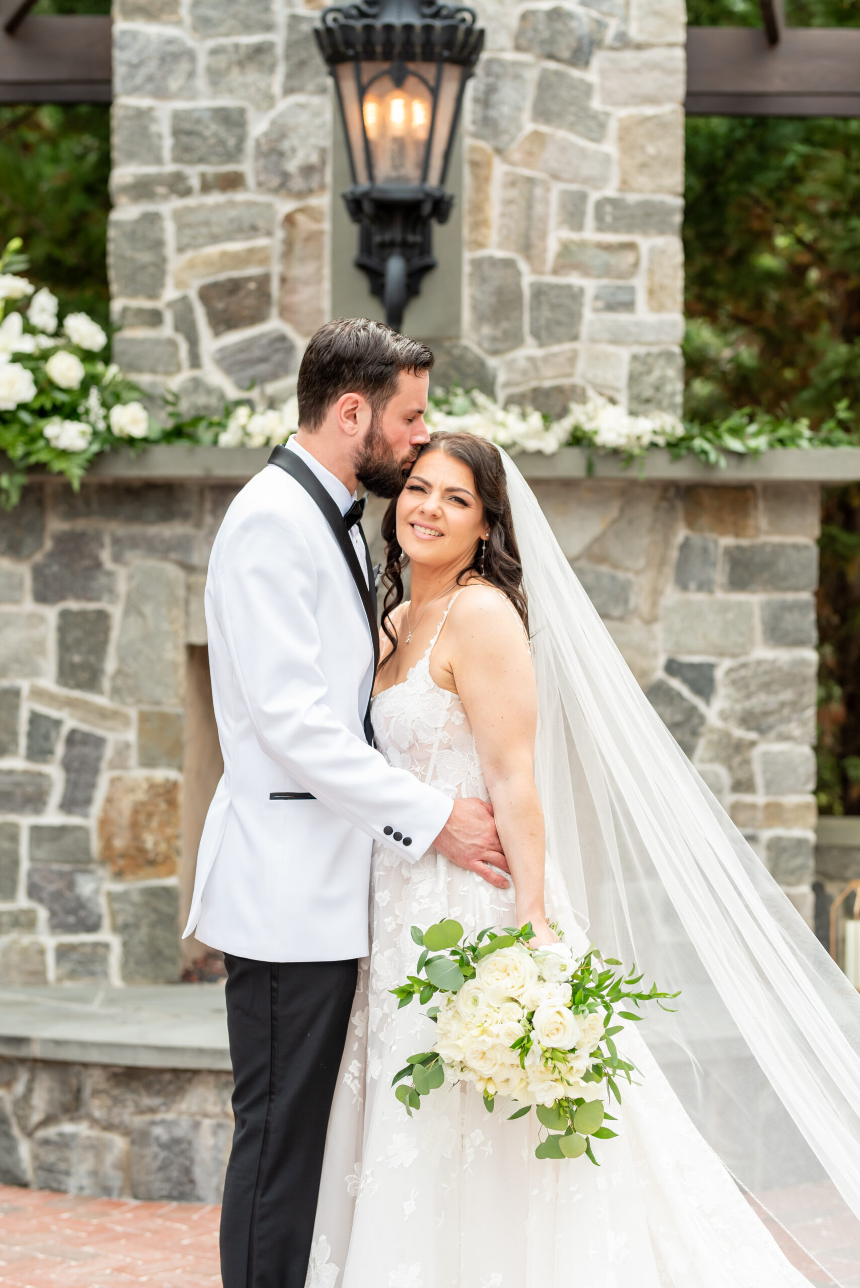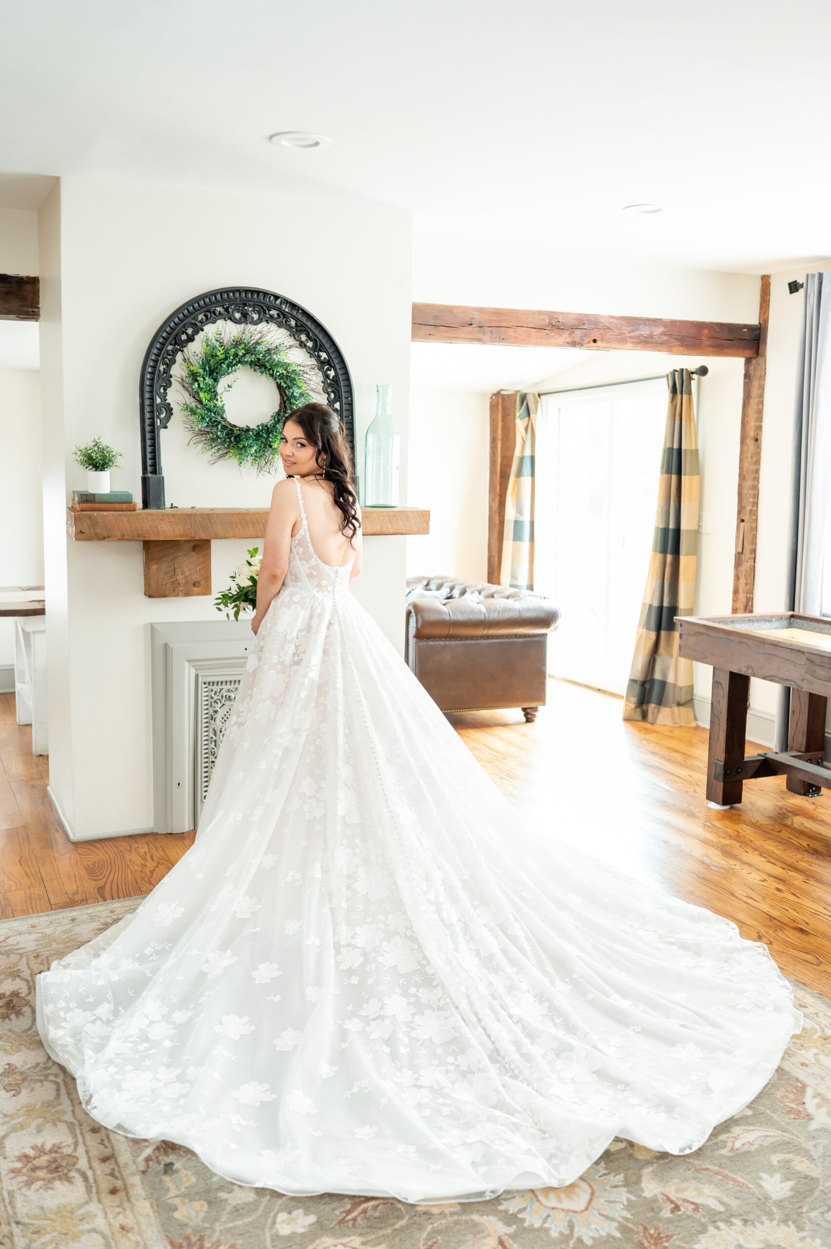 Their first look took place in the ceremony space, and it was as emotional as it was beautiful. Brian’s face said it all. Tears welled up as he saw Jess, and in that quiet moment, the world melted away. Not long after, their daughter Khloe joined us, running and playing nearby as we explored the grounds for portraits. The ivy-covered walls, black doors, and Tiffany glass details added to the charm of this incredible venue, while the surrounding gardens brought softness and light.