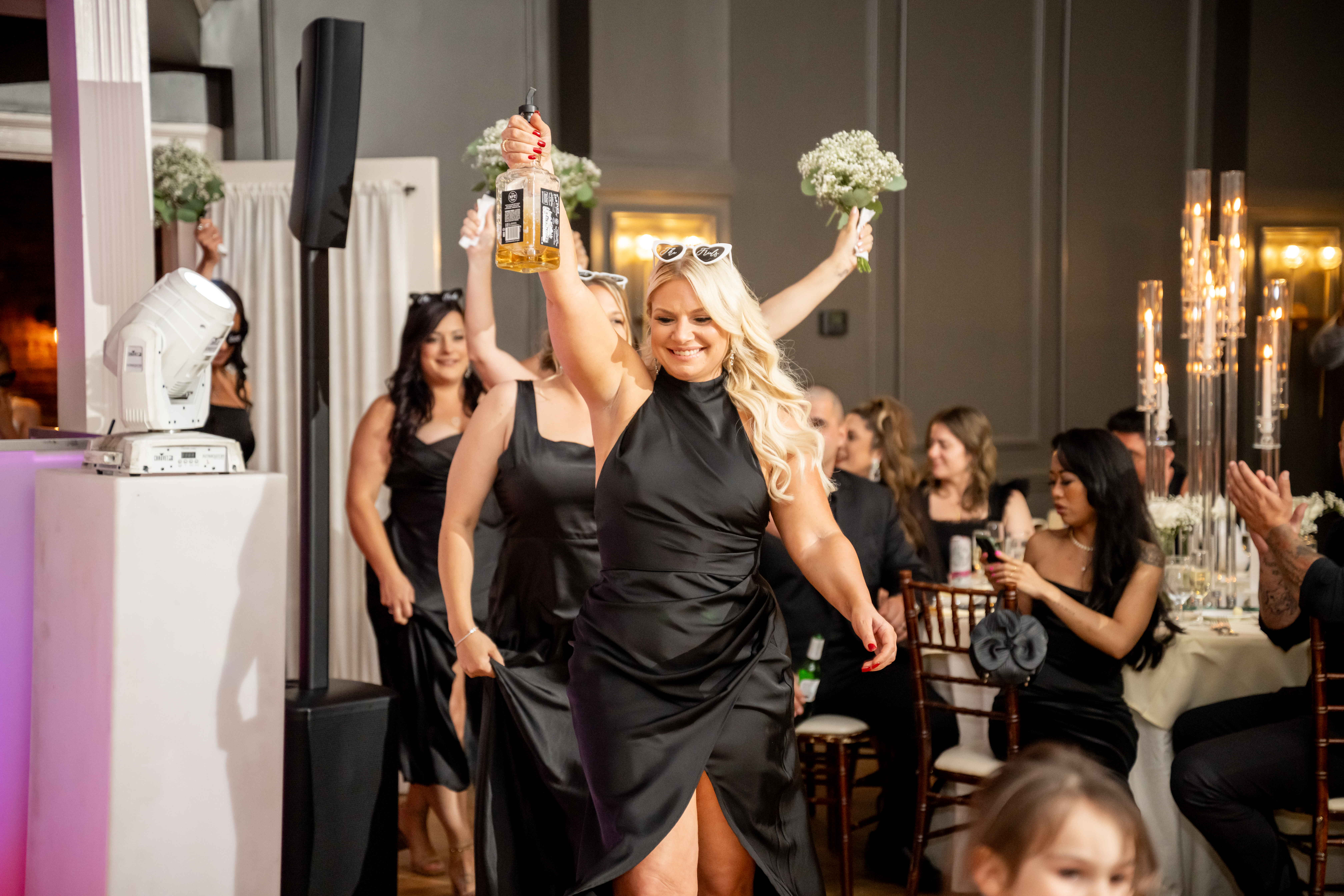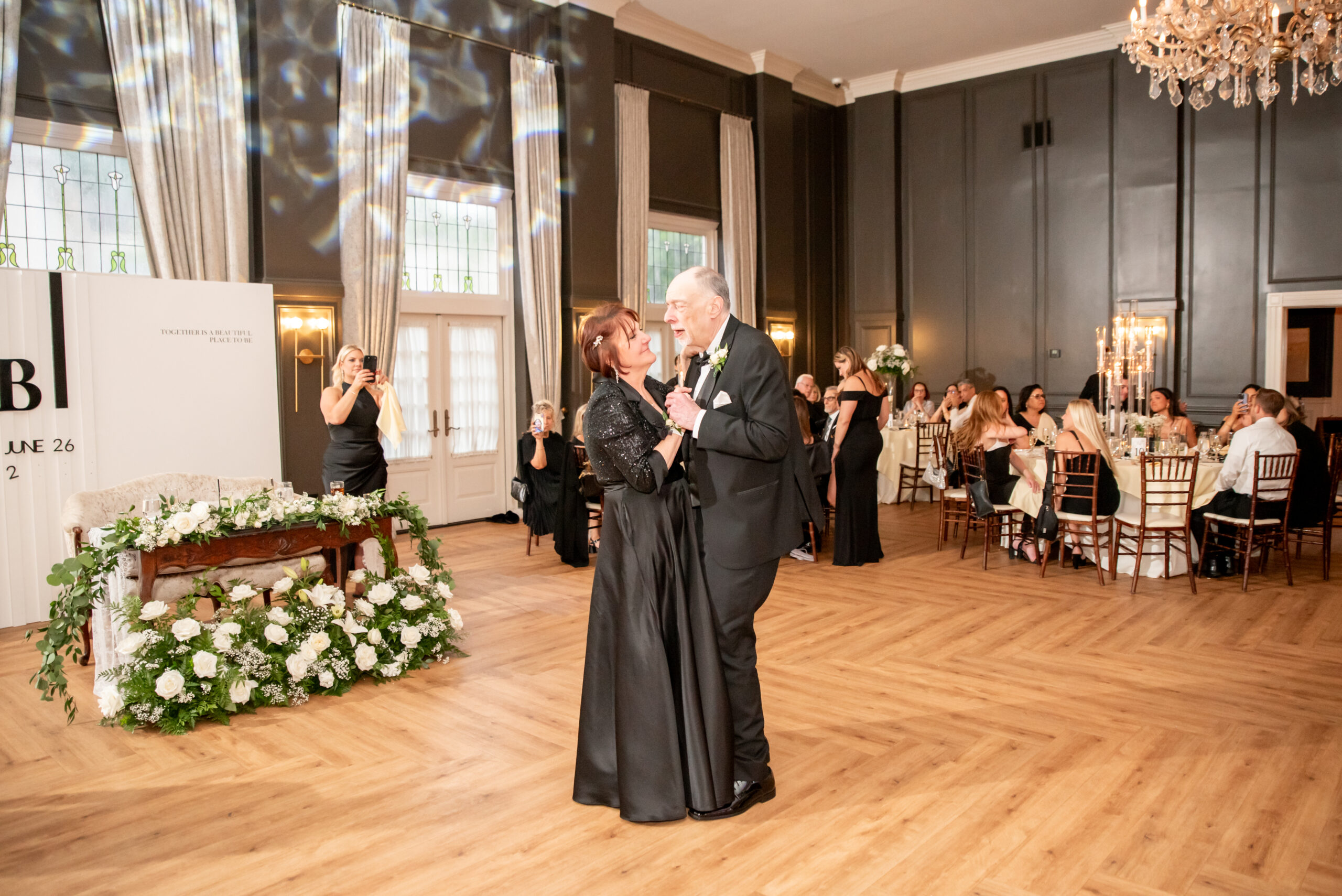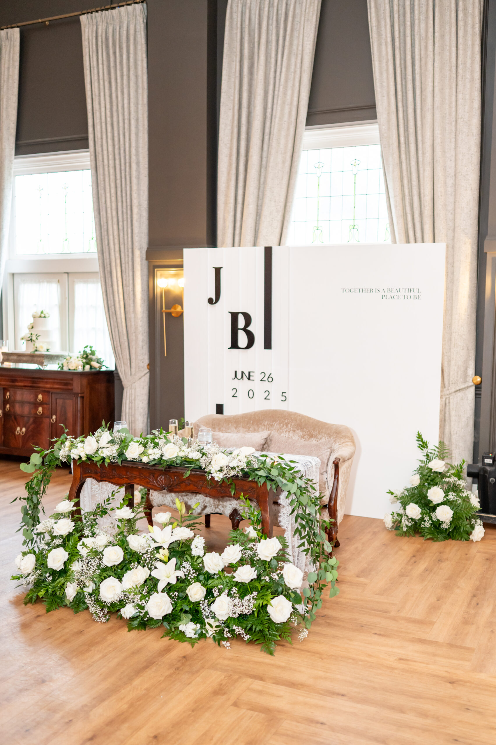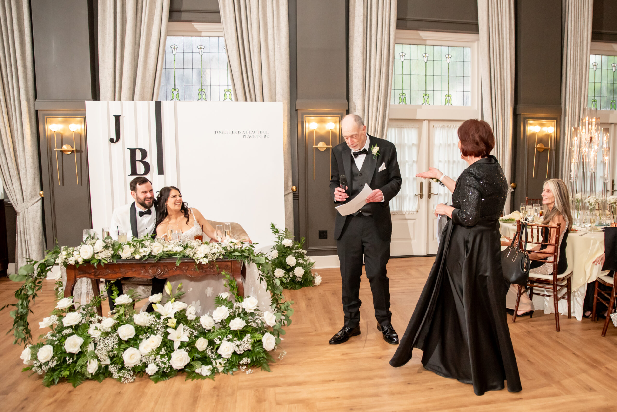 Jess and Brian’s entire wedding design echoed timeless sophistication with a modern twist. With a palette of black and white, the couple asked their guests to dress in all black. A unique touch that elevated the entire aesthetic. Jess, a talented designer herself, crafted the wedding signage, including the bold welcome sign, a chic seating chart, and the beautiful custom backdrop behind their sweetheart table. The look was cohesive, minimal, and incredibly stylish. A perfect fusion of vintage elegance and modern romance.