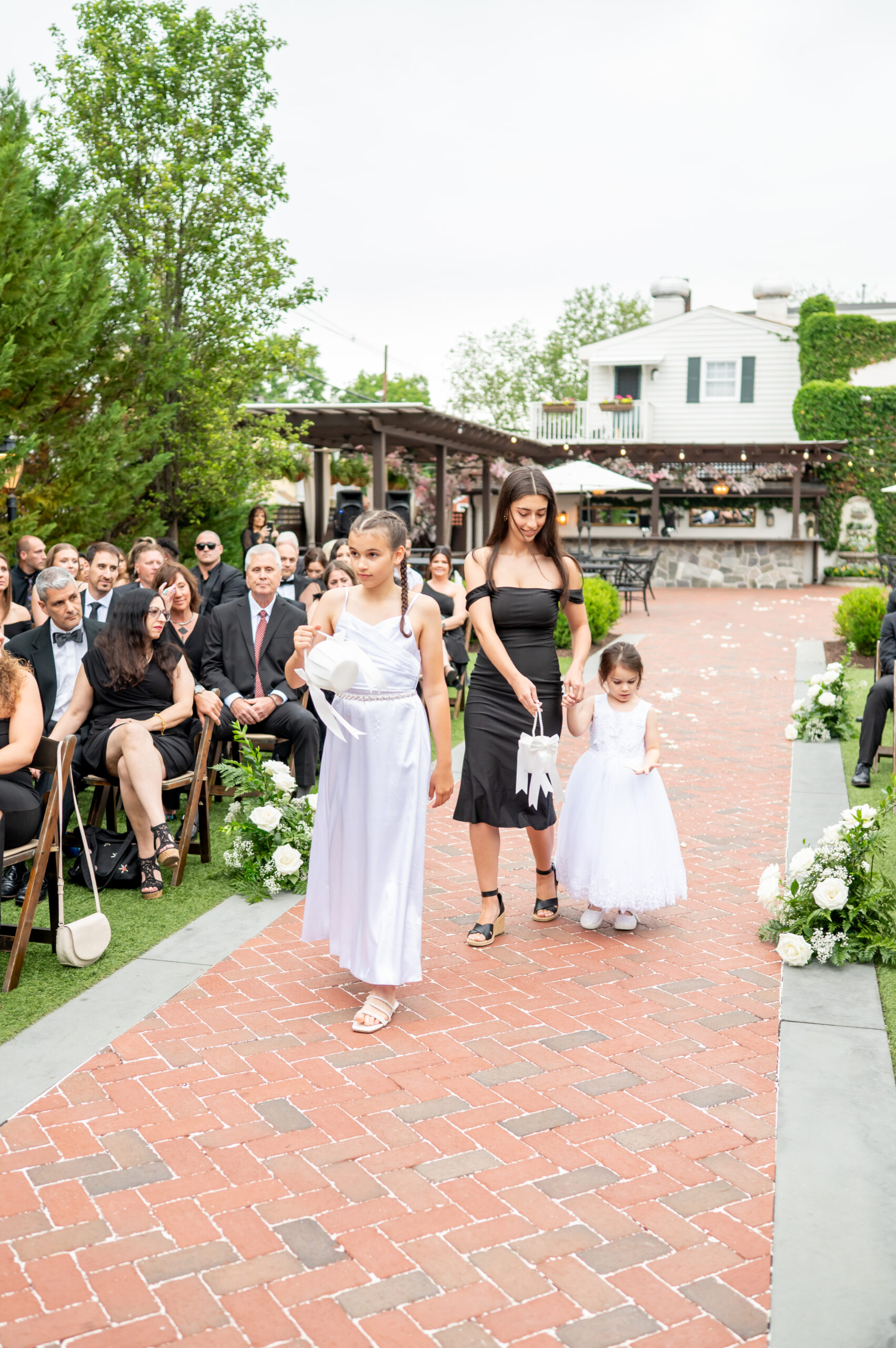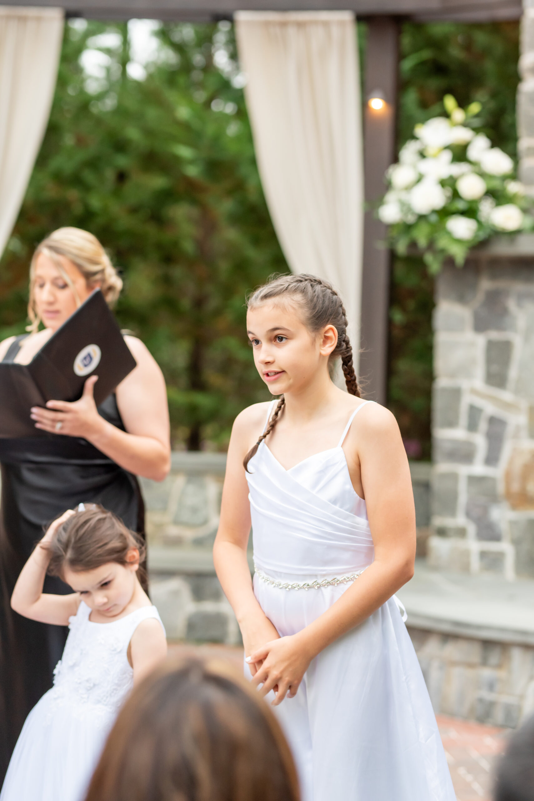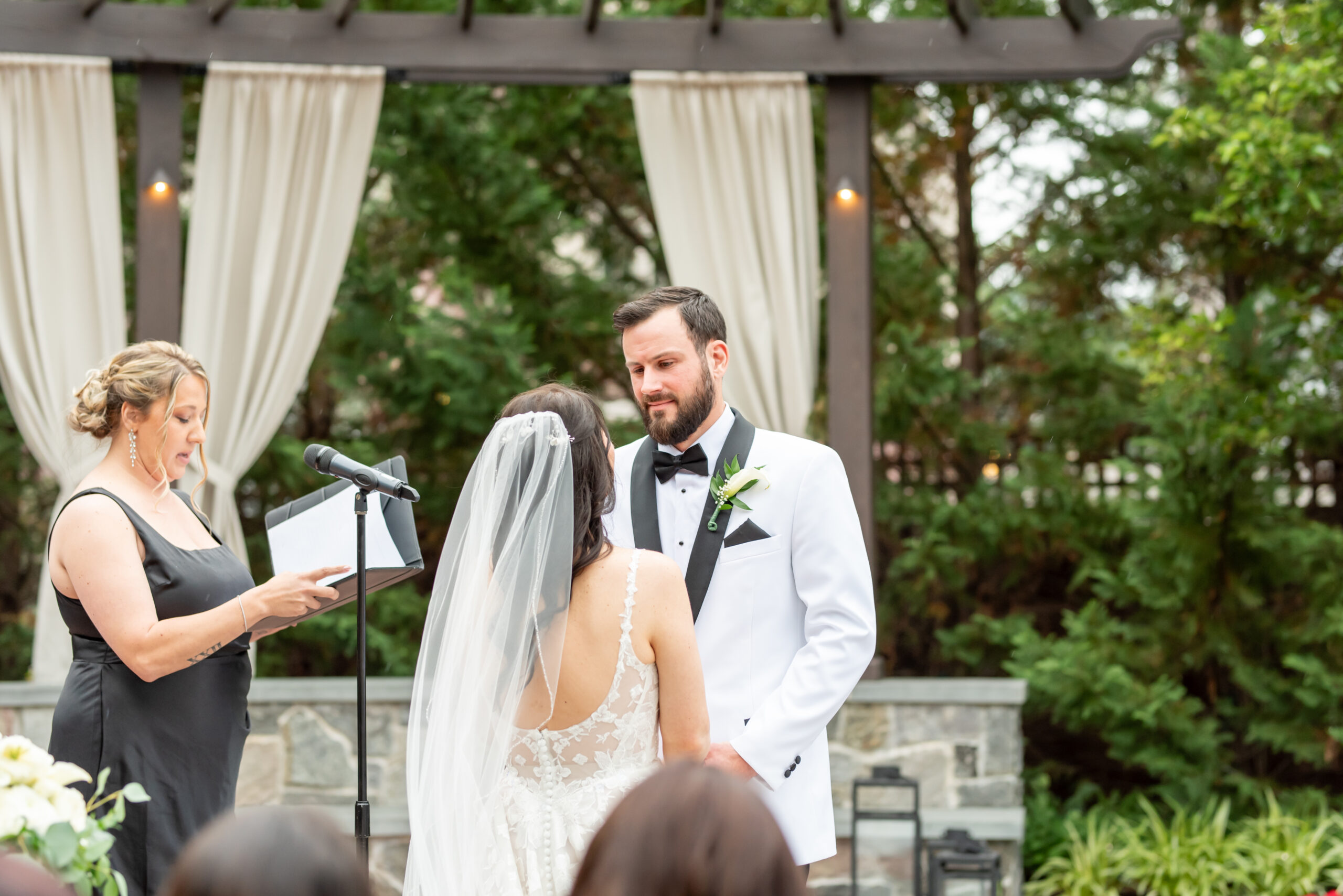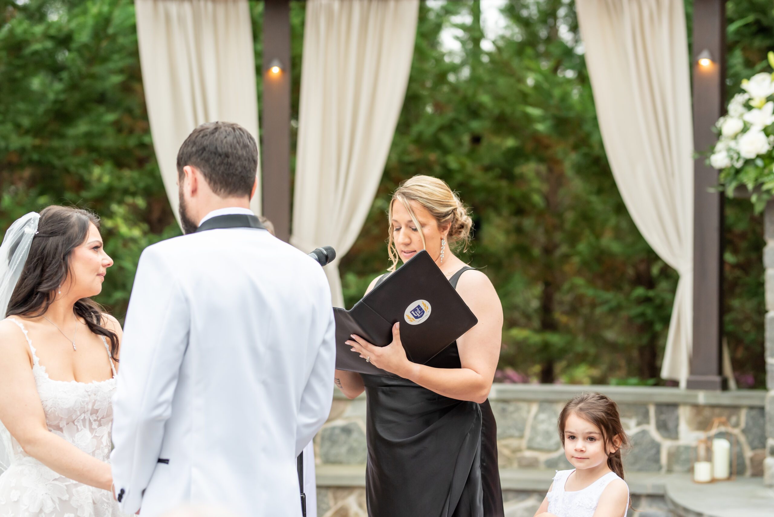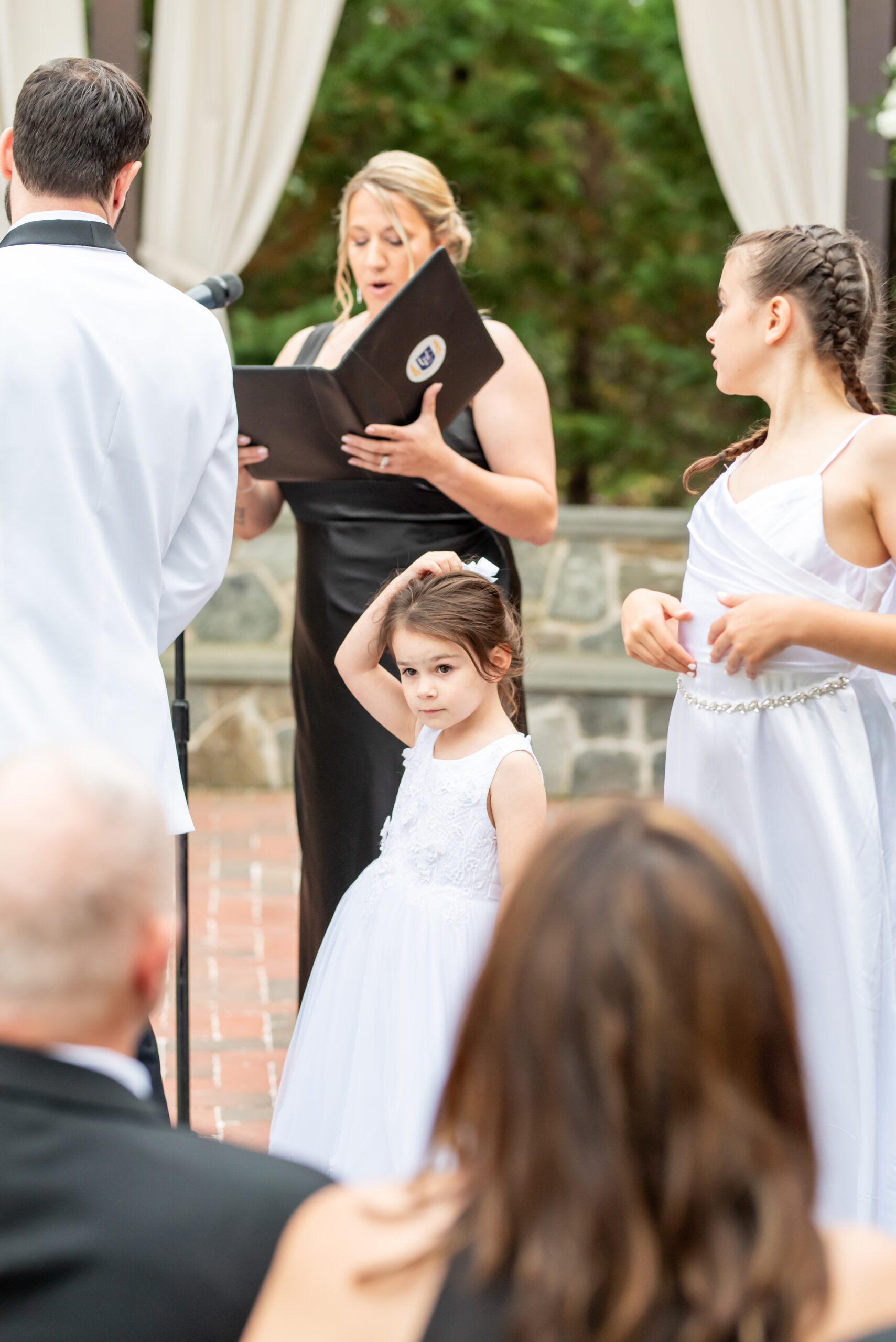 Though the forecast had whispered of rain, Jess and I both knew the outdoor ceremony space was too beautiful to pass up. Set for 5:30pm, the air was full of hope and light breeze. Amanda, Jess’s childhood best friend, who had the honor of officiating the ceremony walked down the aisle. she was followed by Jess and Brian’s daughters walked down the aisle as flower girls.