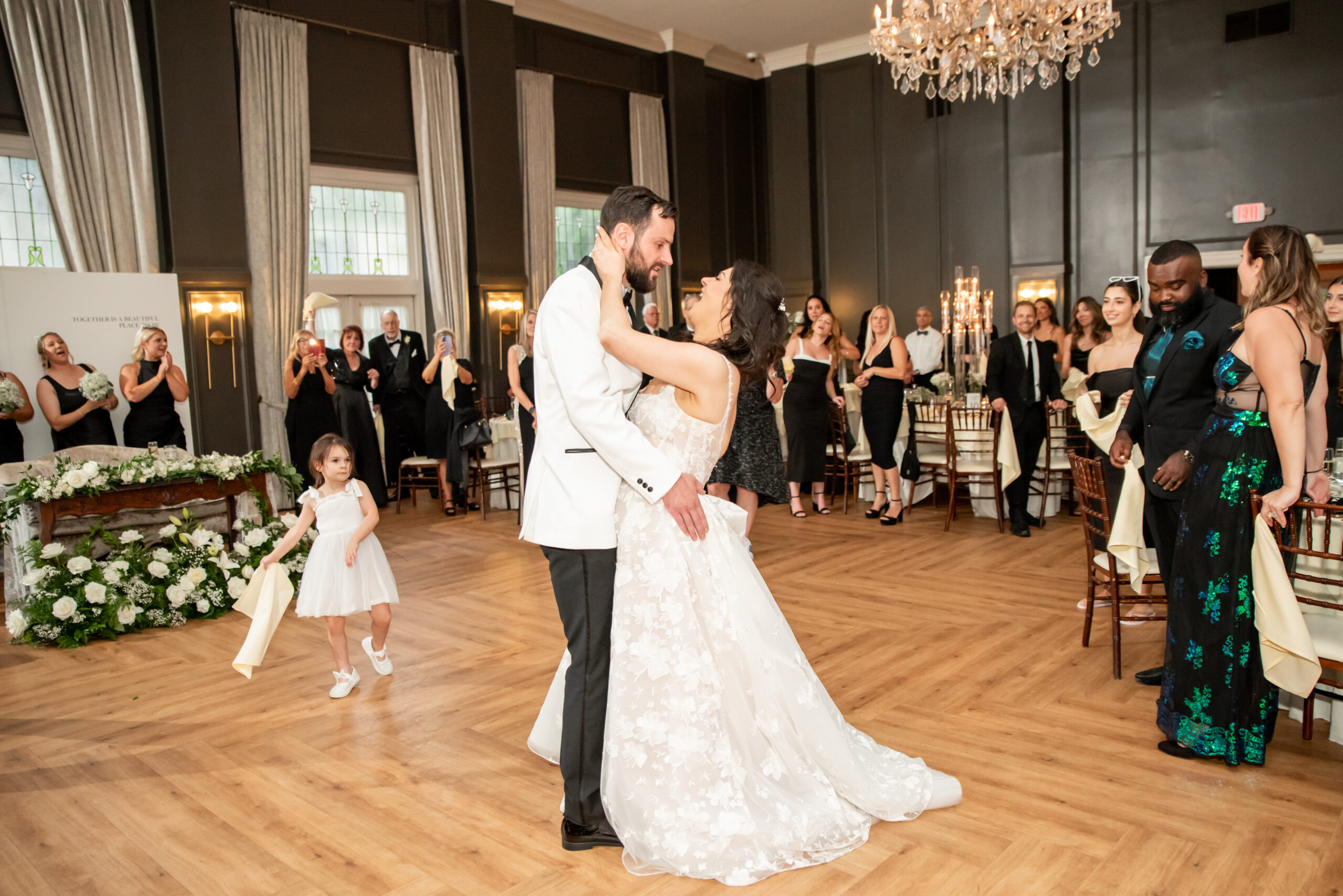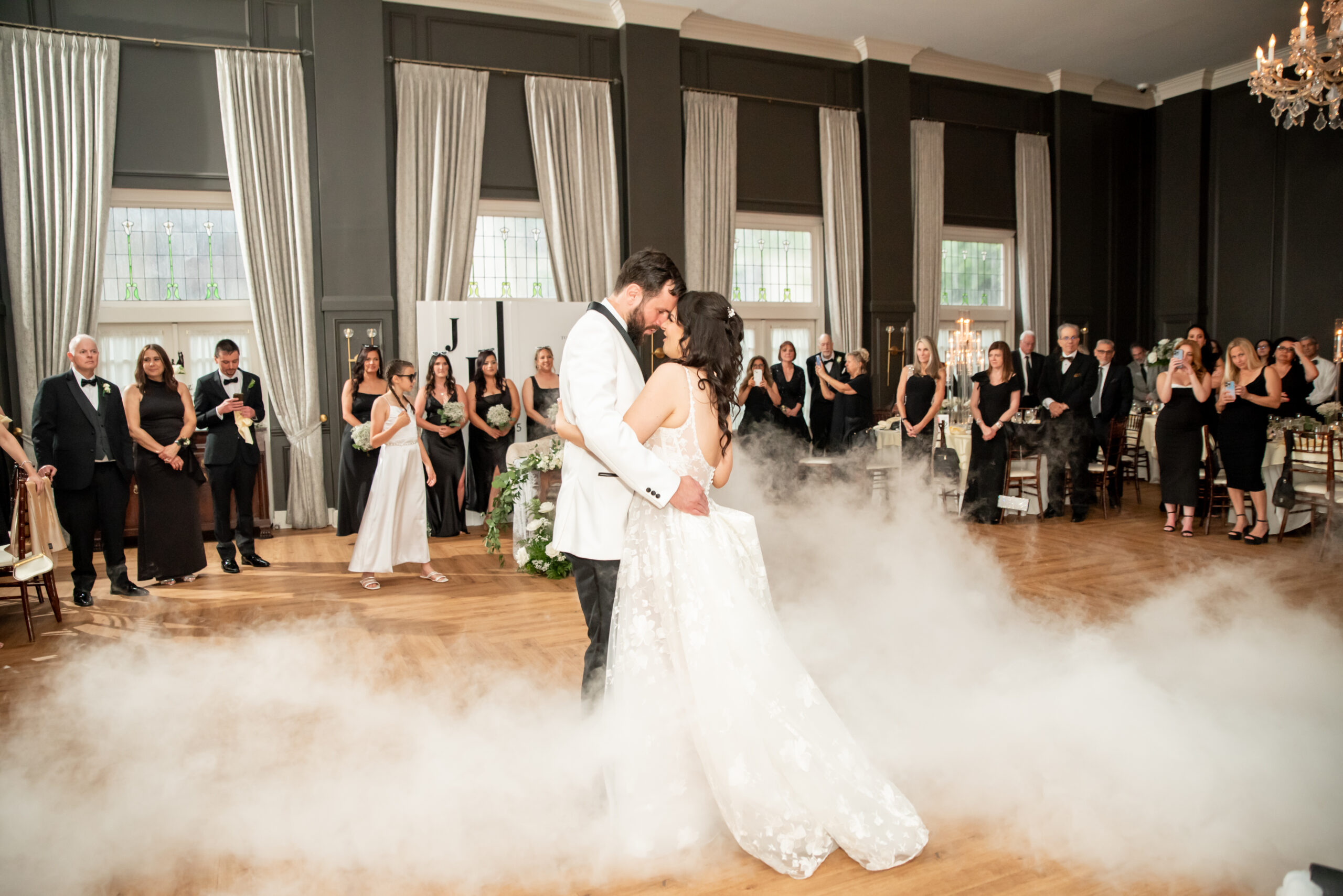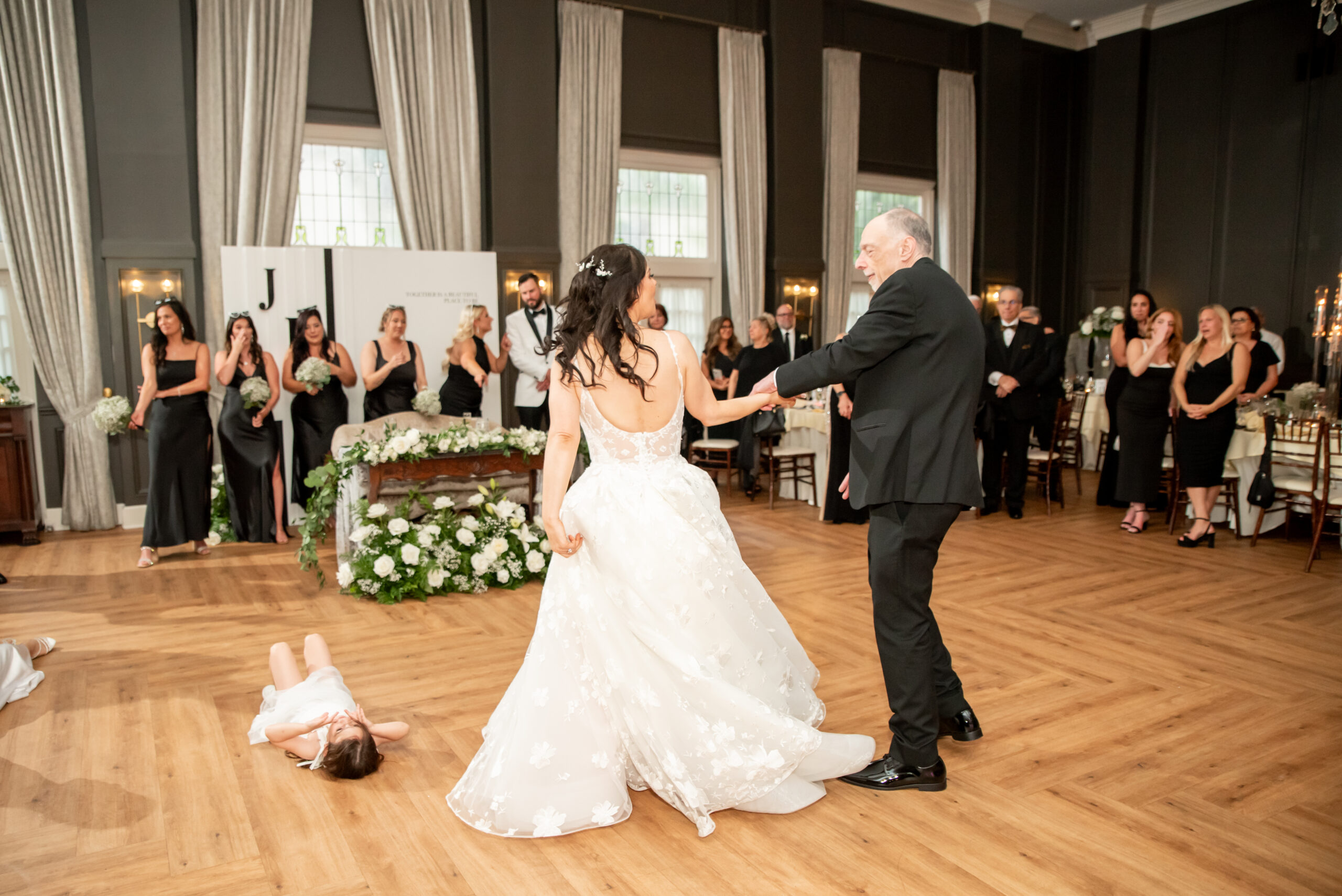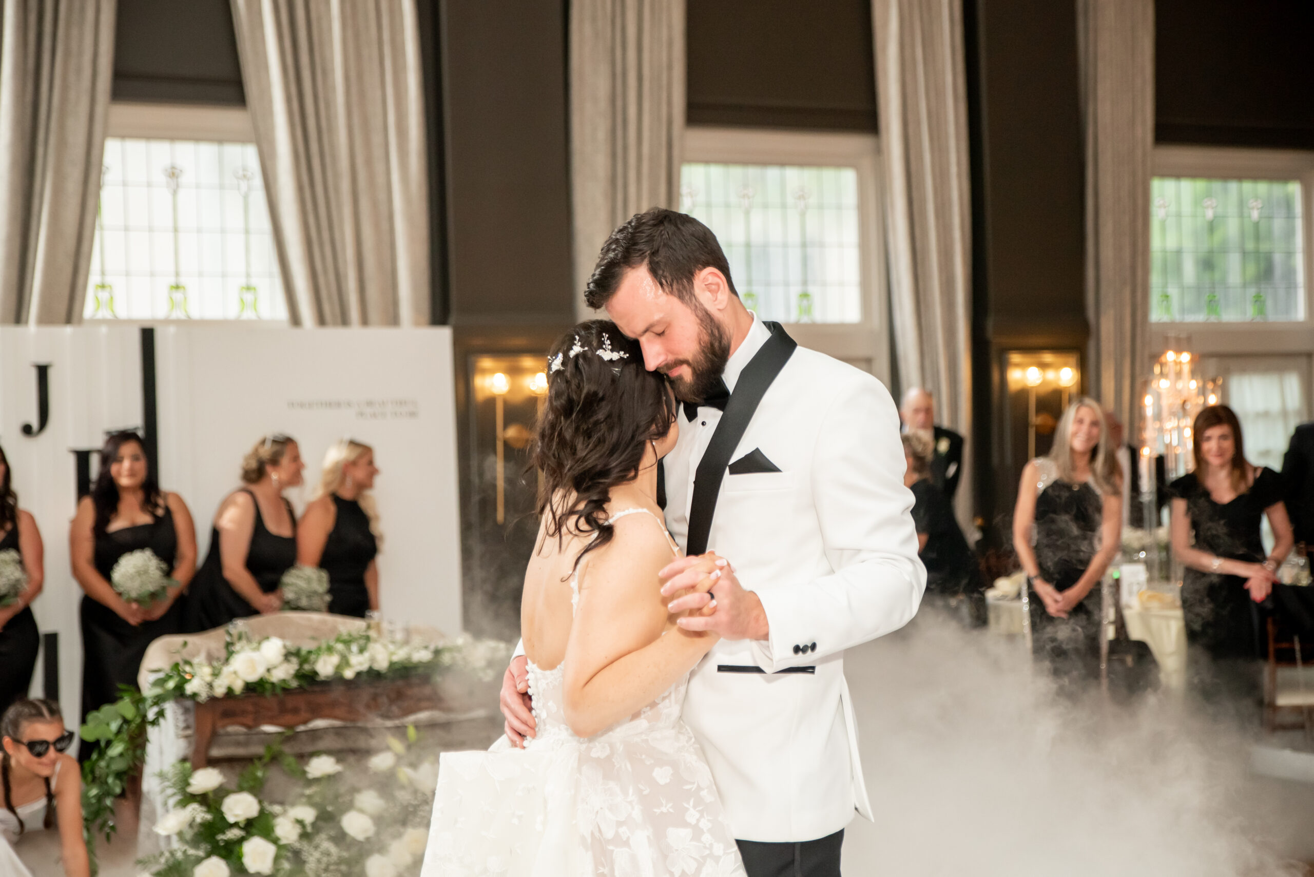 Their grand entrance down the staircase into the ballroom was nothing short of cinematic. Their first dance was surrounded by the dreamy “dancing on the clouds”, with their daughters gleefully playing in the mist at their feet. It was a lovely scene of a family dancing together in a dream.