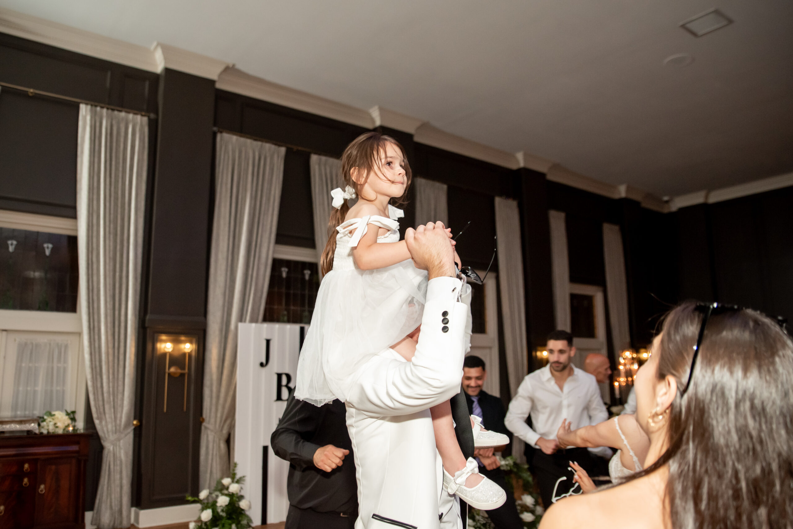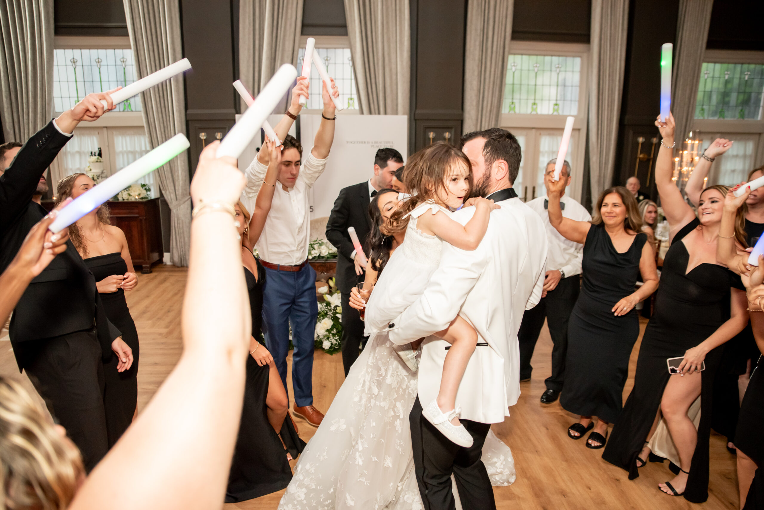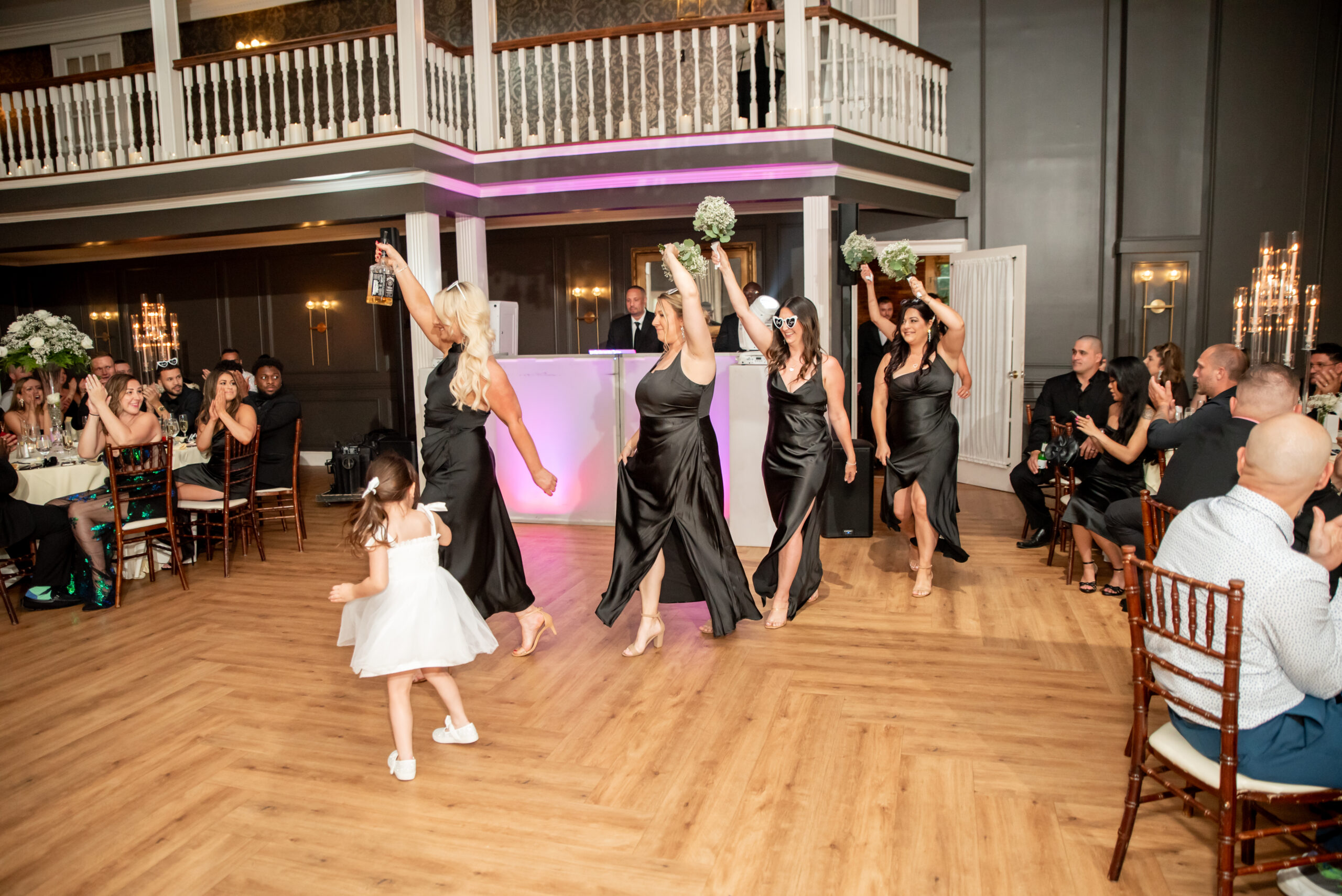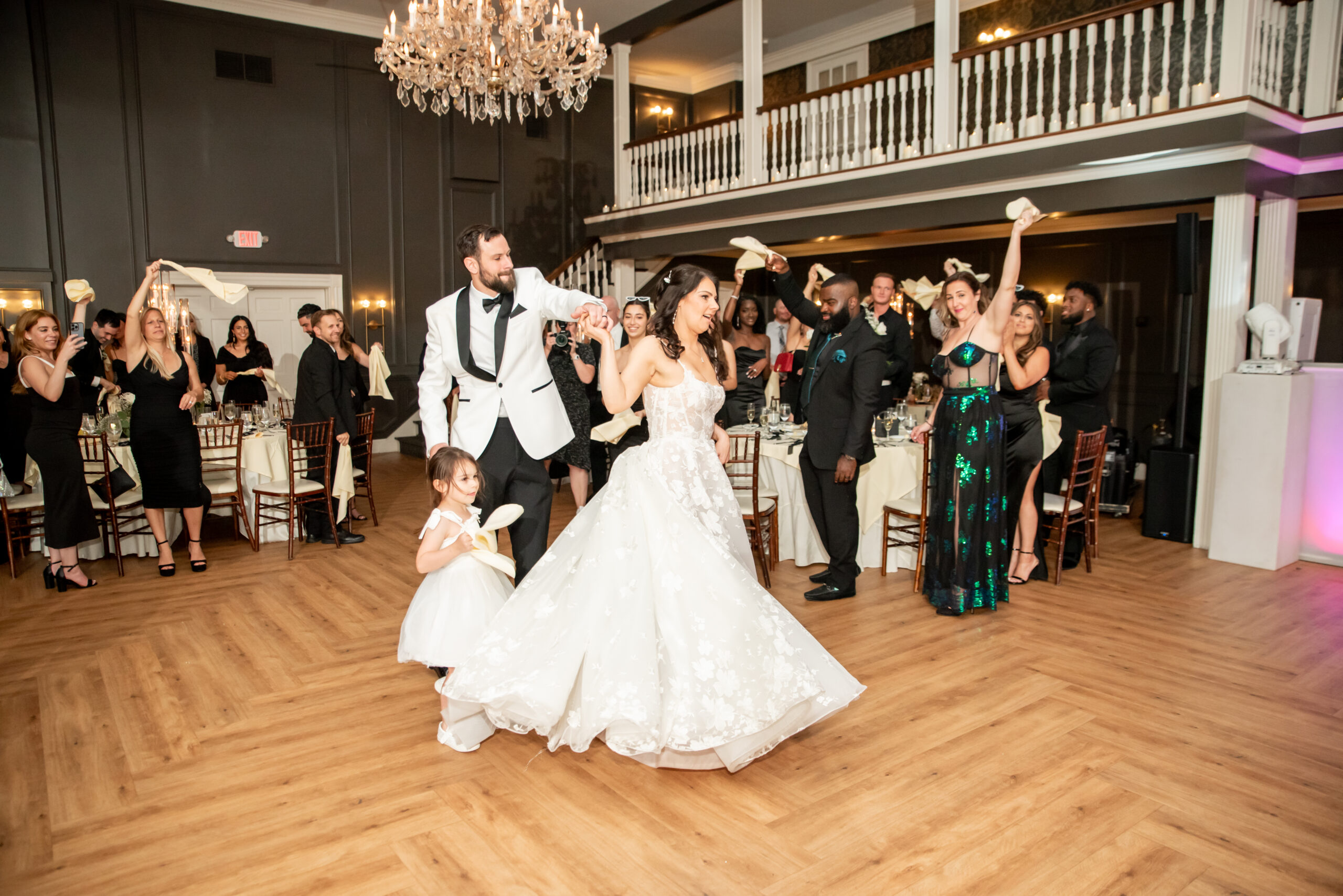 Their grand entrance down the staircase into the ballroom was nothing short of cinematic. Their first dance was surrounded by the dreamy “dancing on the clouds”, with their daughters gleefully playing in the mist at their feet. It was a lovely scene of a family dancing together in a dream.
