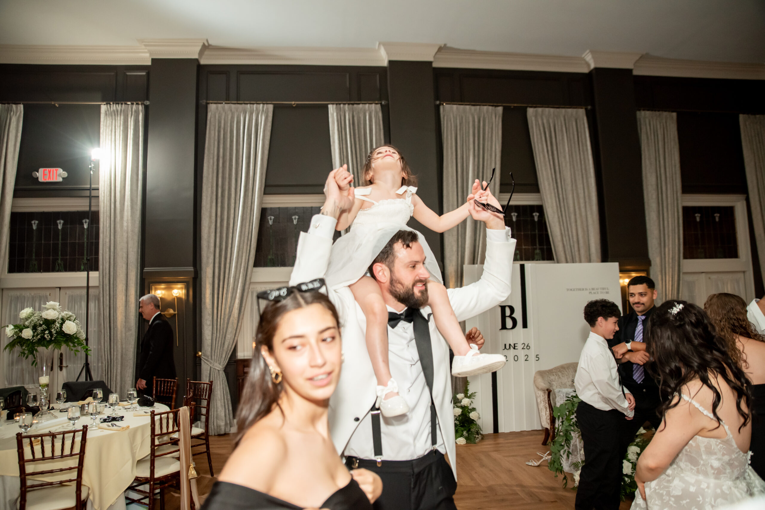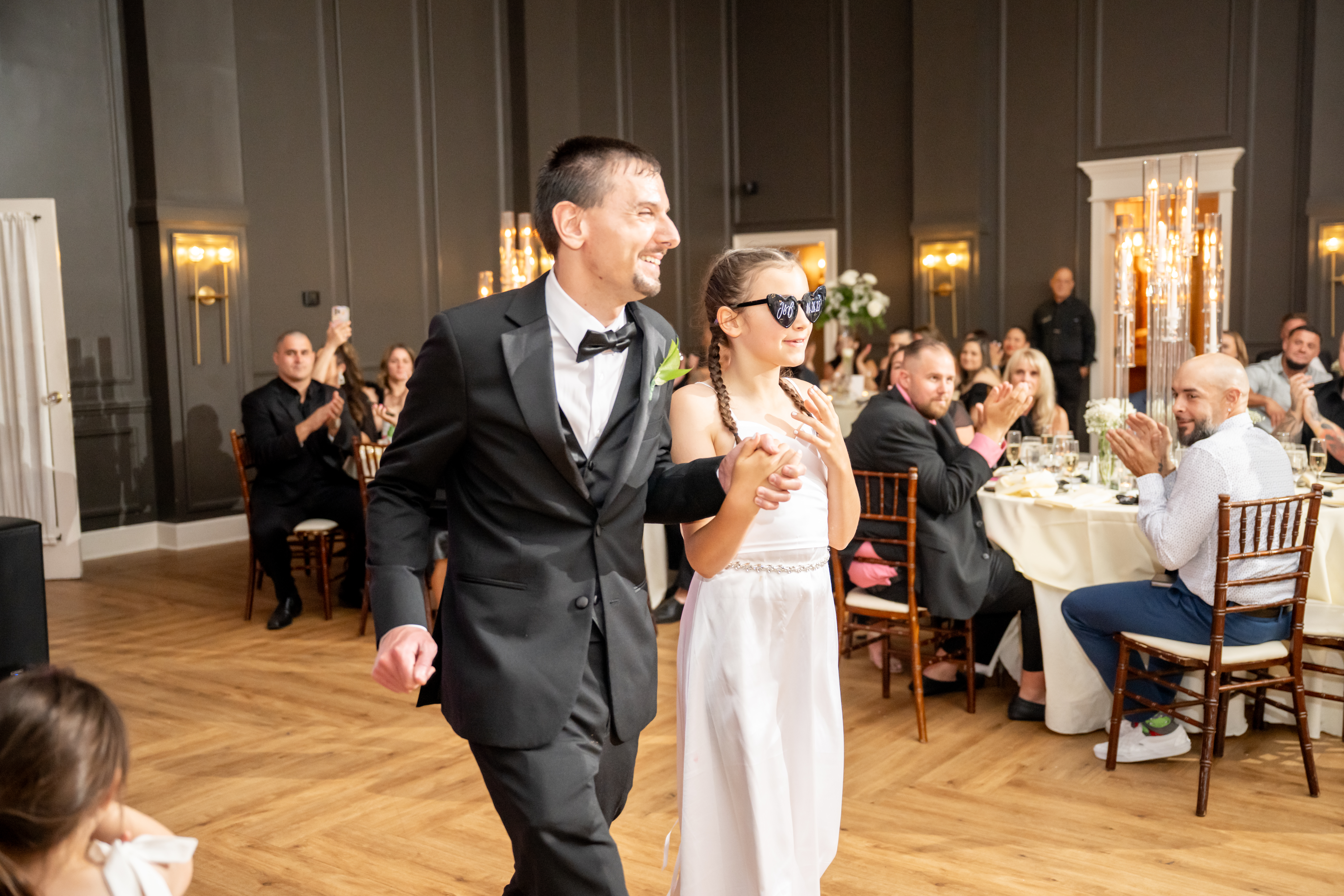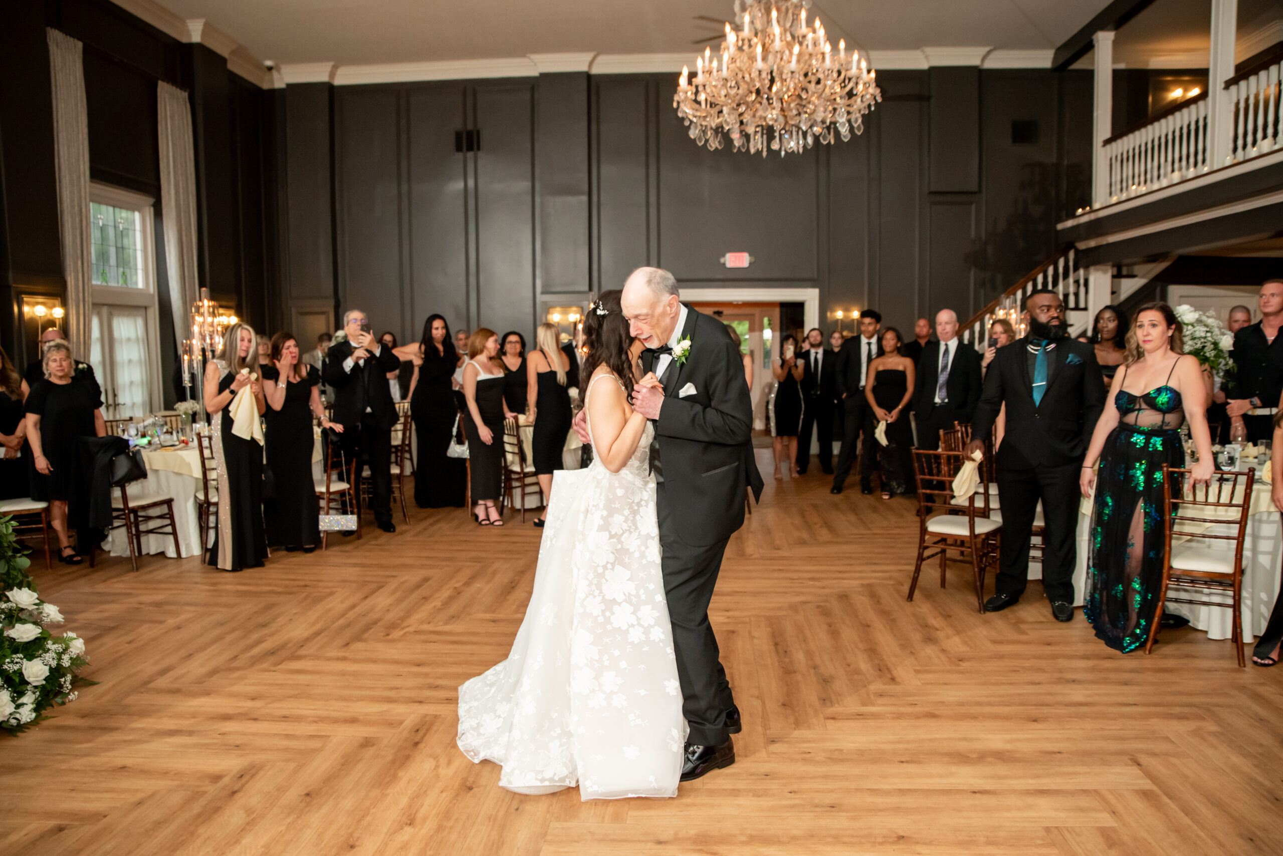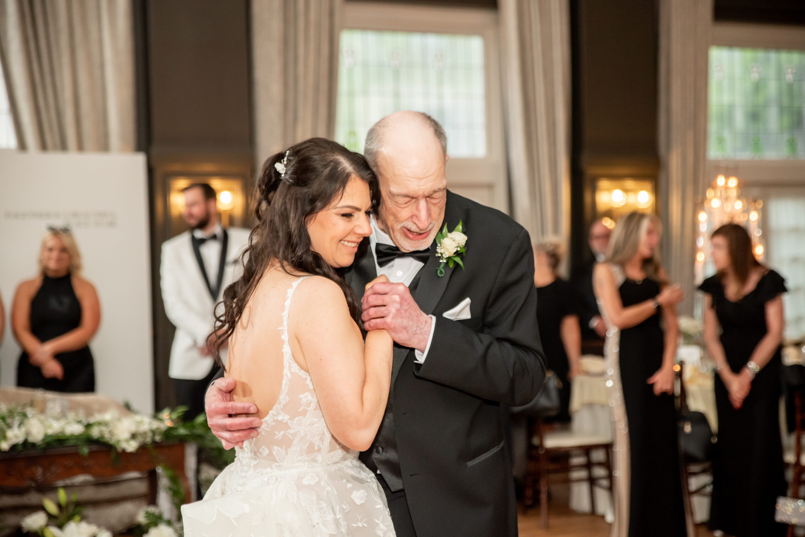 Their grand entrance down the staircase into the ballroom was nothing short of cinematic. Their first dance was surrounded by the dreamy “dancing on the clouds”, with their daughters gleefully playing in the mist at their feet. It was a lovely scene of a family dancing together in a dream.