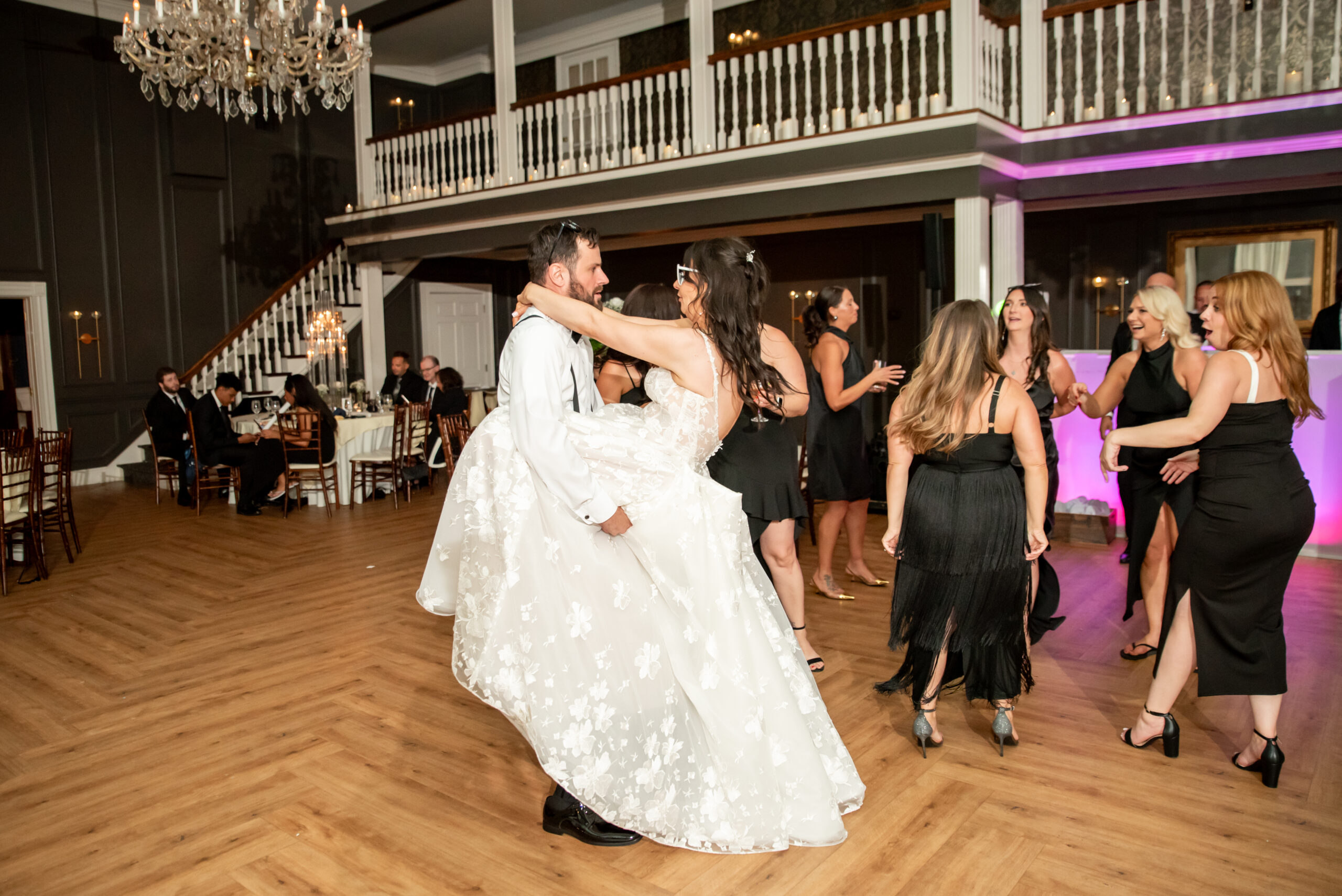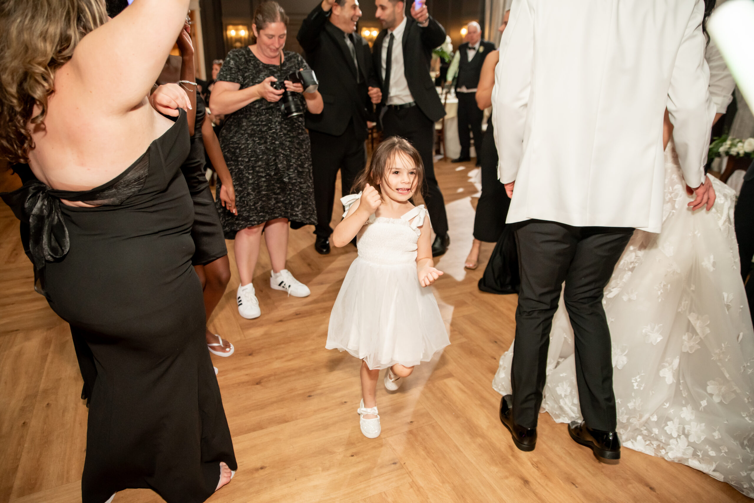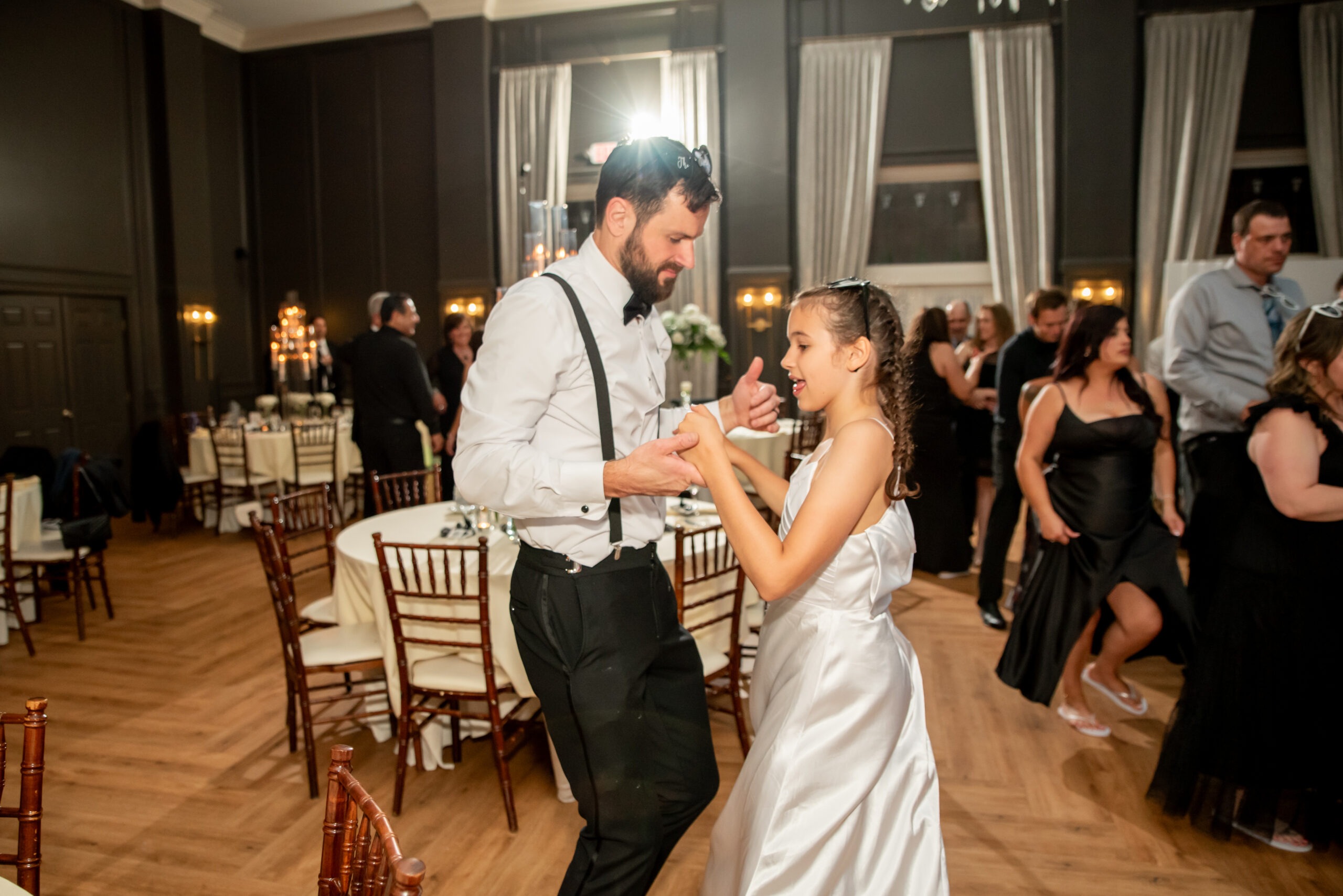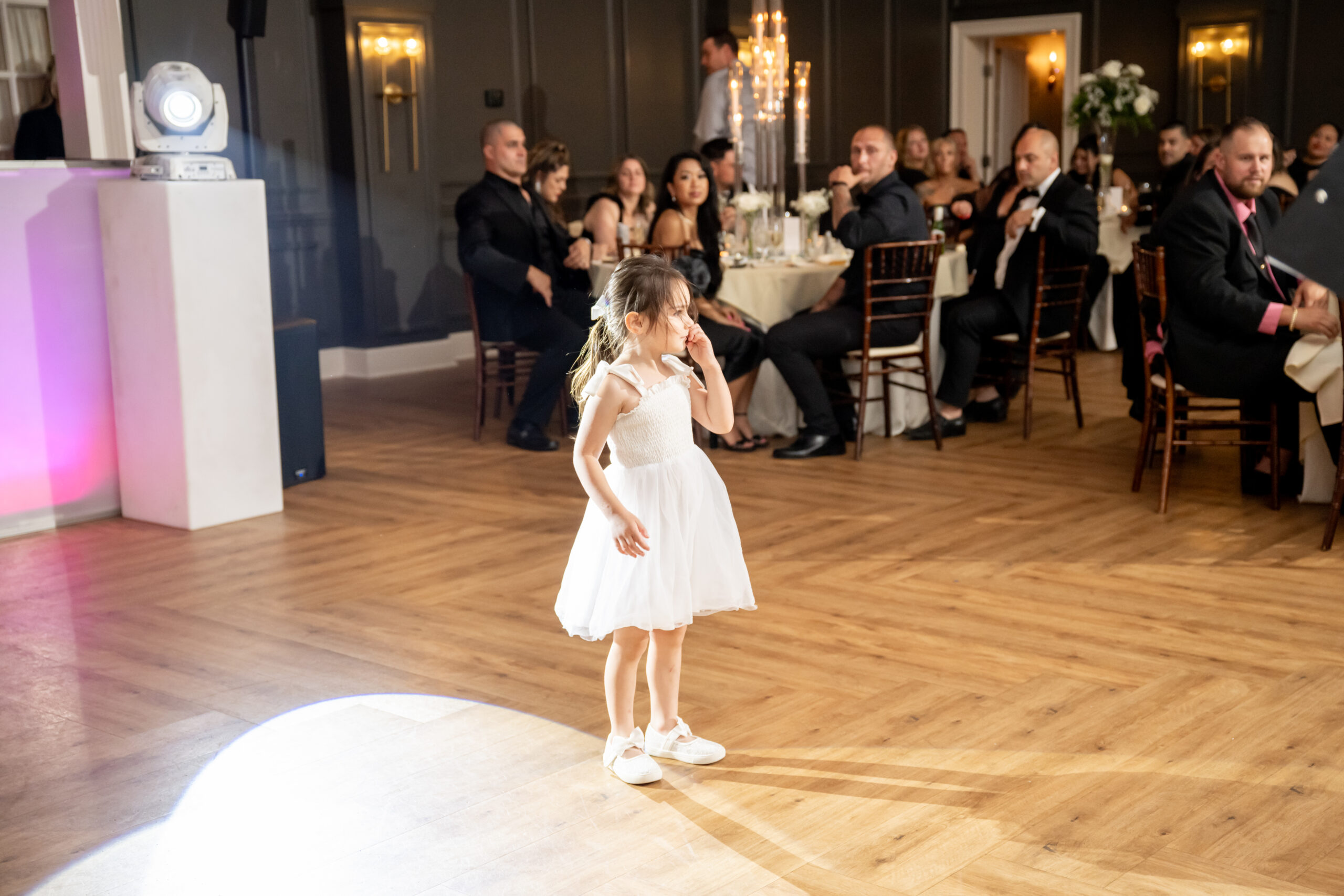 Their grand entrance down the staircase into the ballroom was nothing short of cinematic. Their first dance was surrounded by the dreamy “dancing on the clouds”, with their daughters gleefully playing in the mist at their feet. It was a lovely scene of a family dancing together in a dream.
