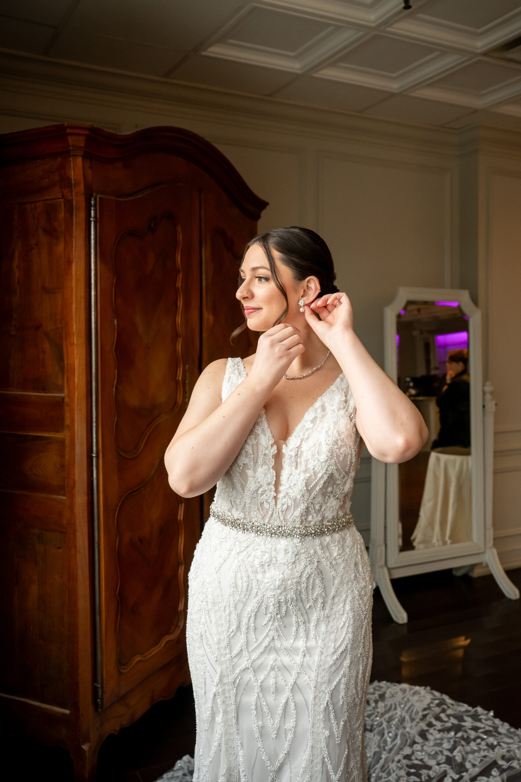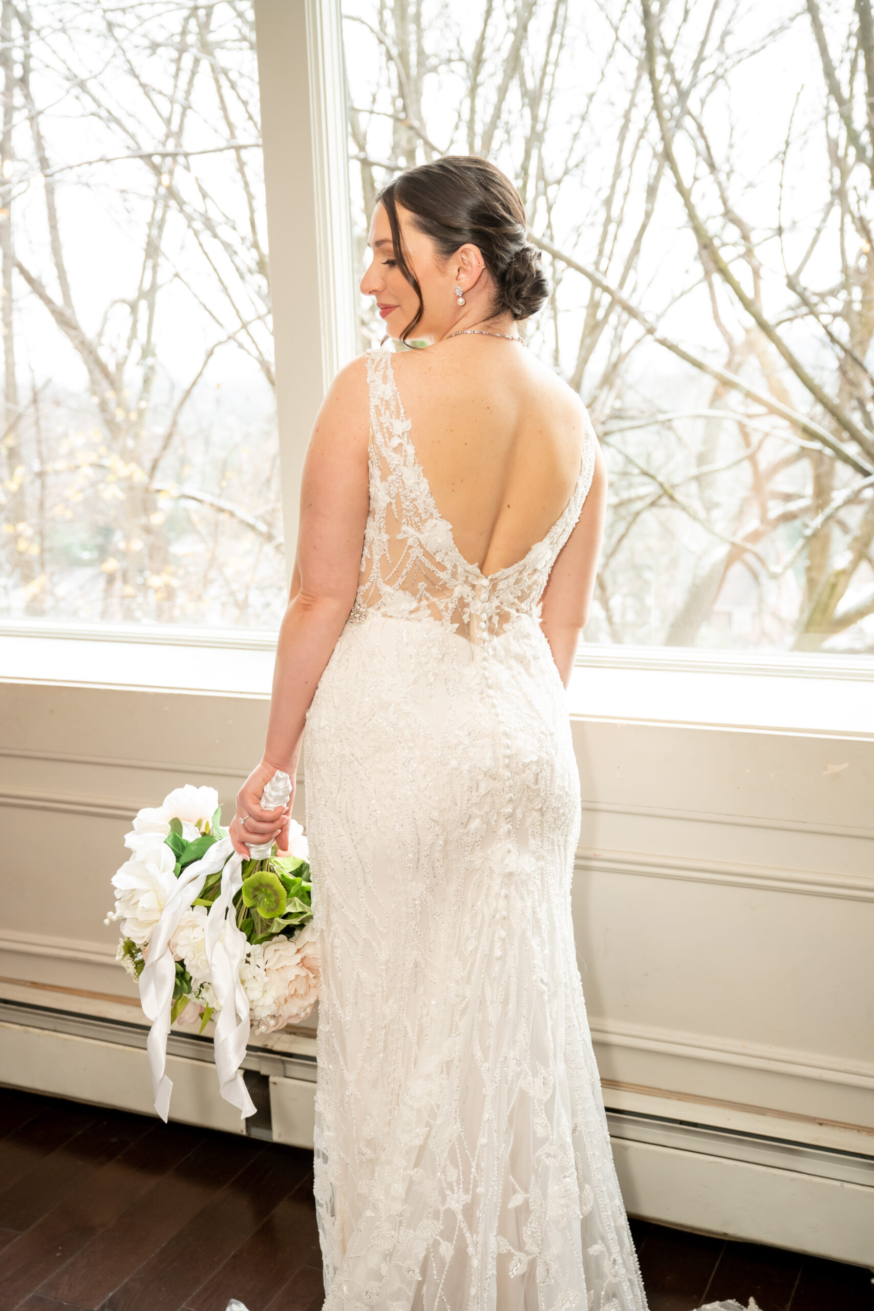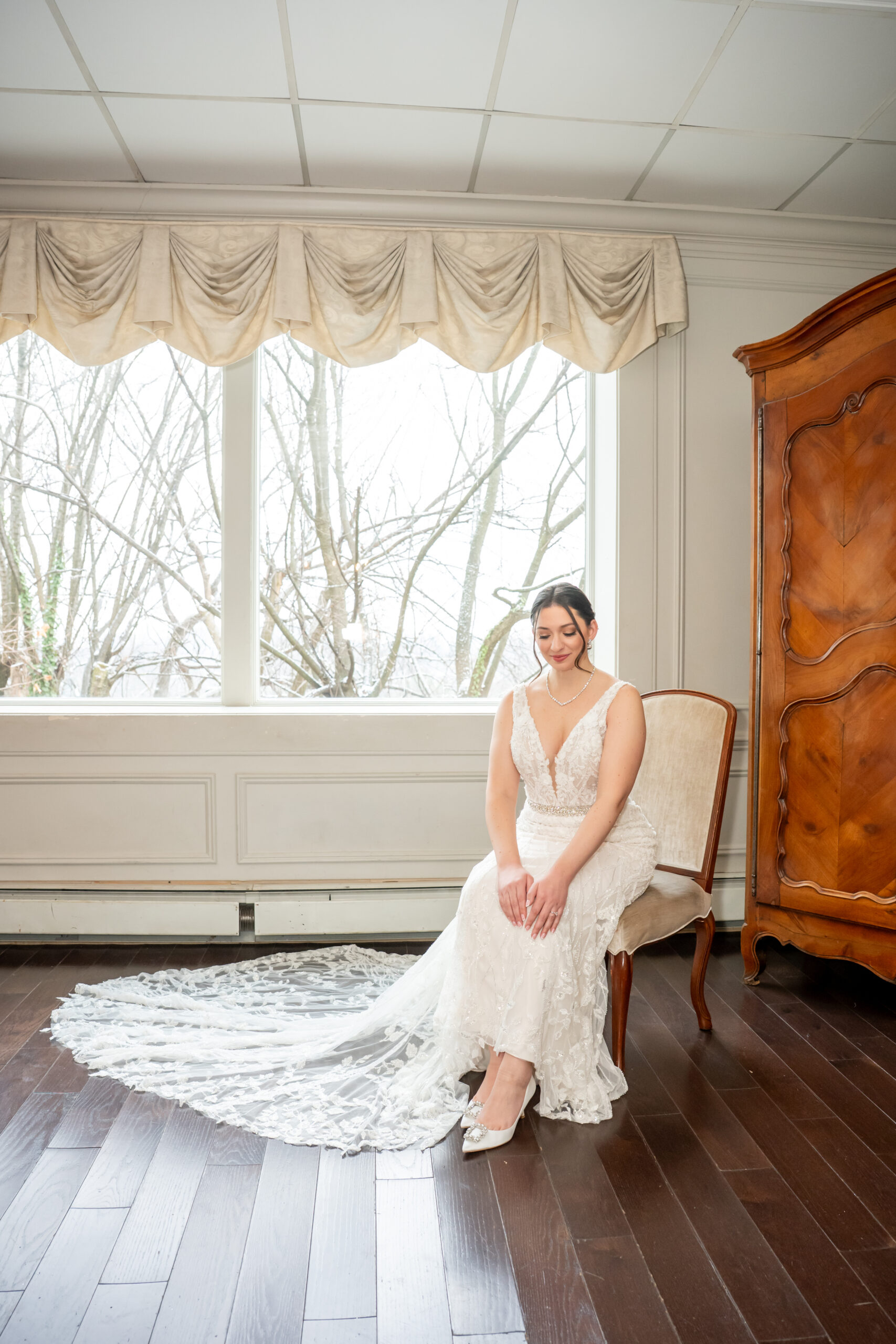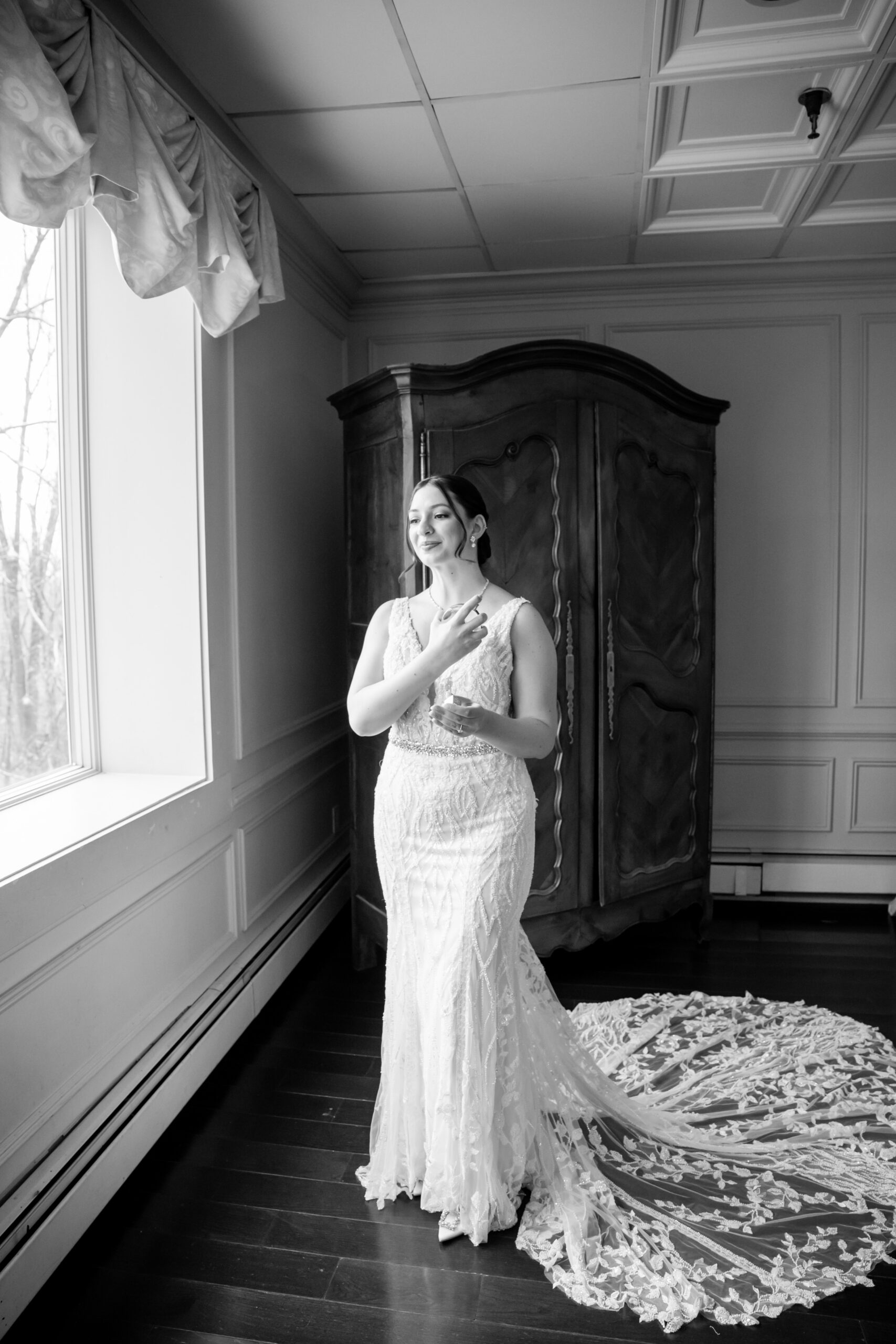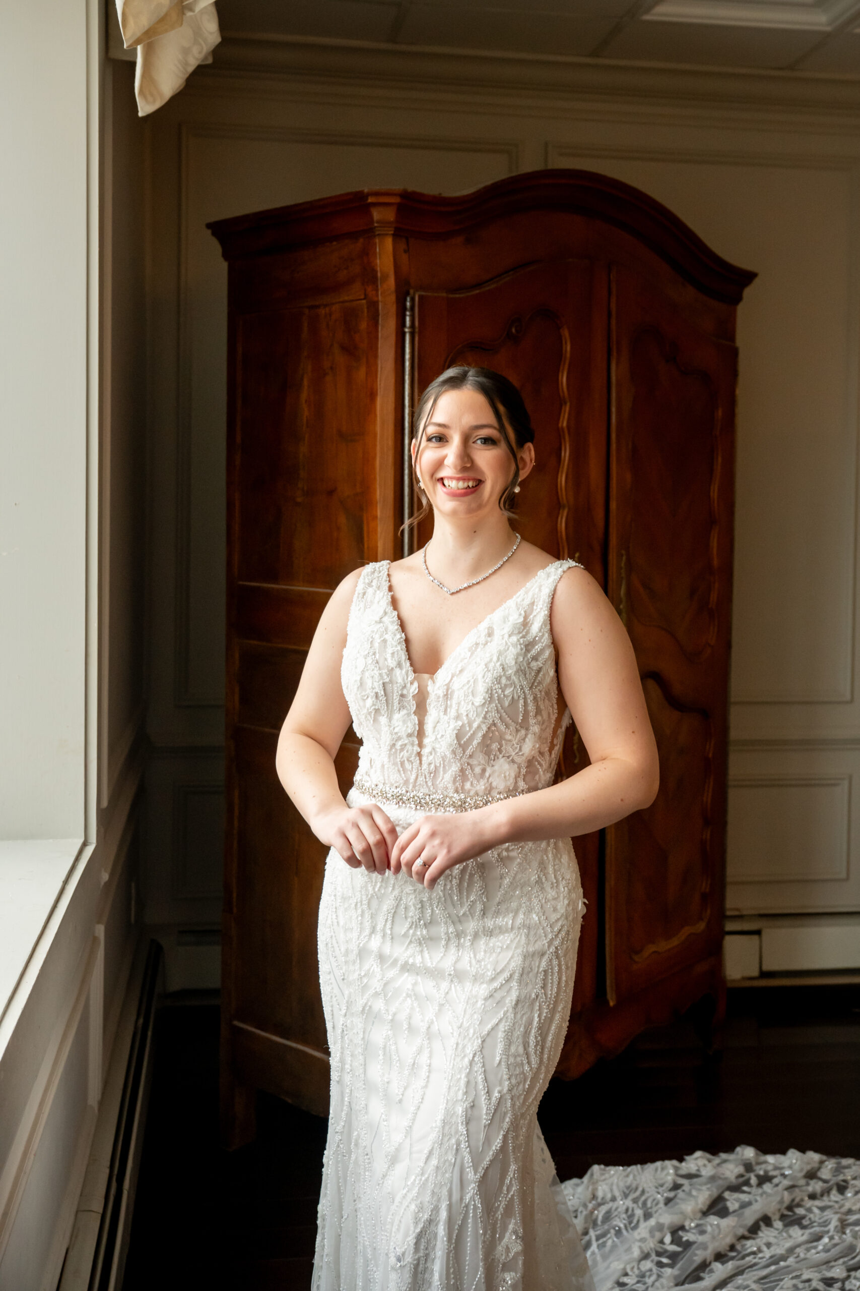 Once Andréa was ready, we took a few quiet portraits of her in her stunning beaded wedding gown. The dress featured intricate lace details and a long flowing train that shimmered beautifully in the soft winter light. It honestly sparkled like fresh snow or a Christmas tree glowing with white lights.