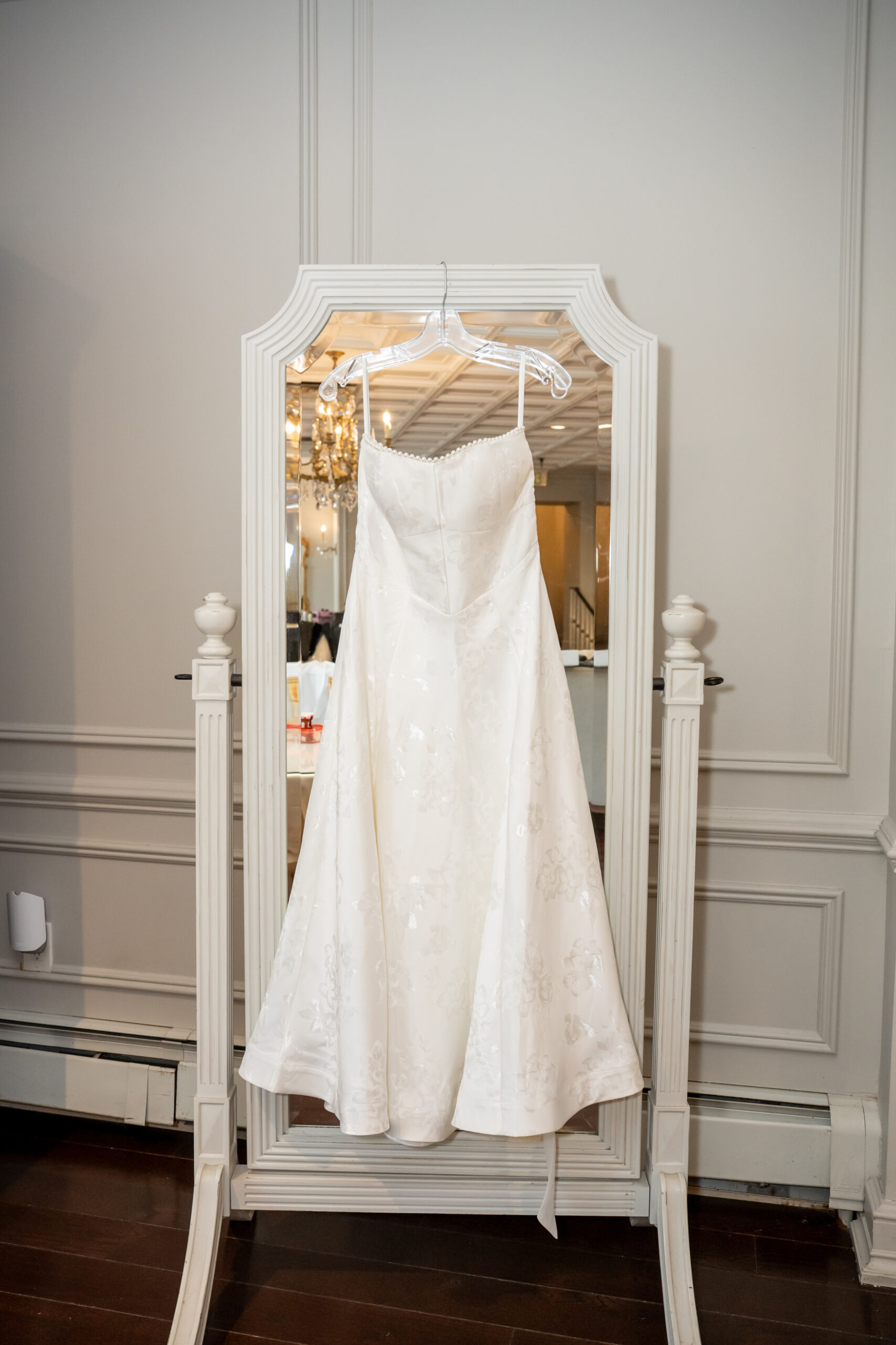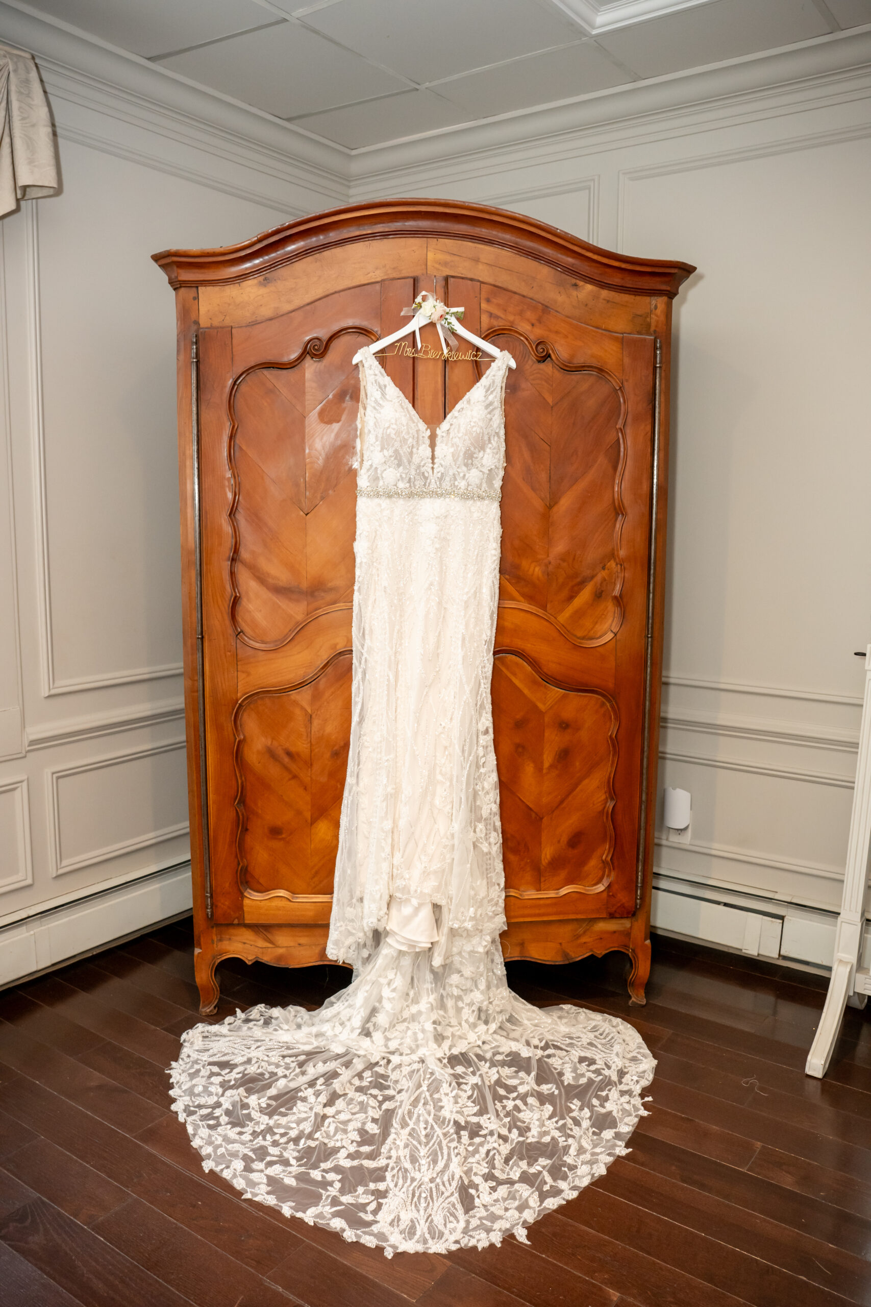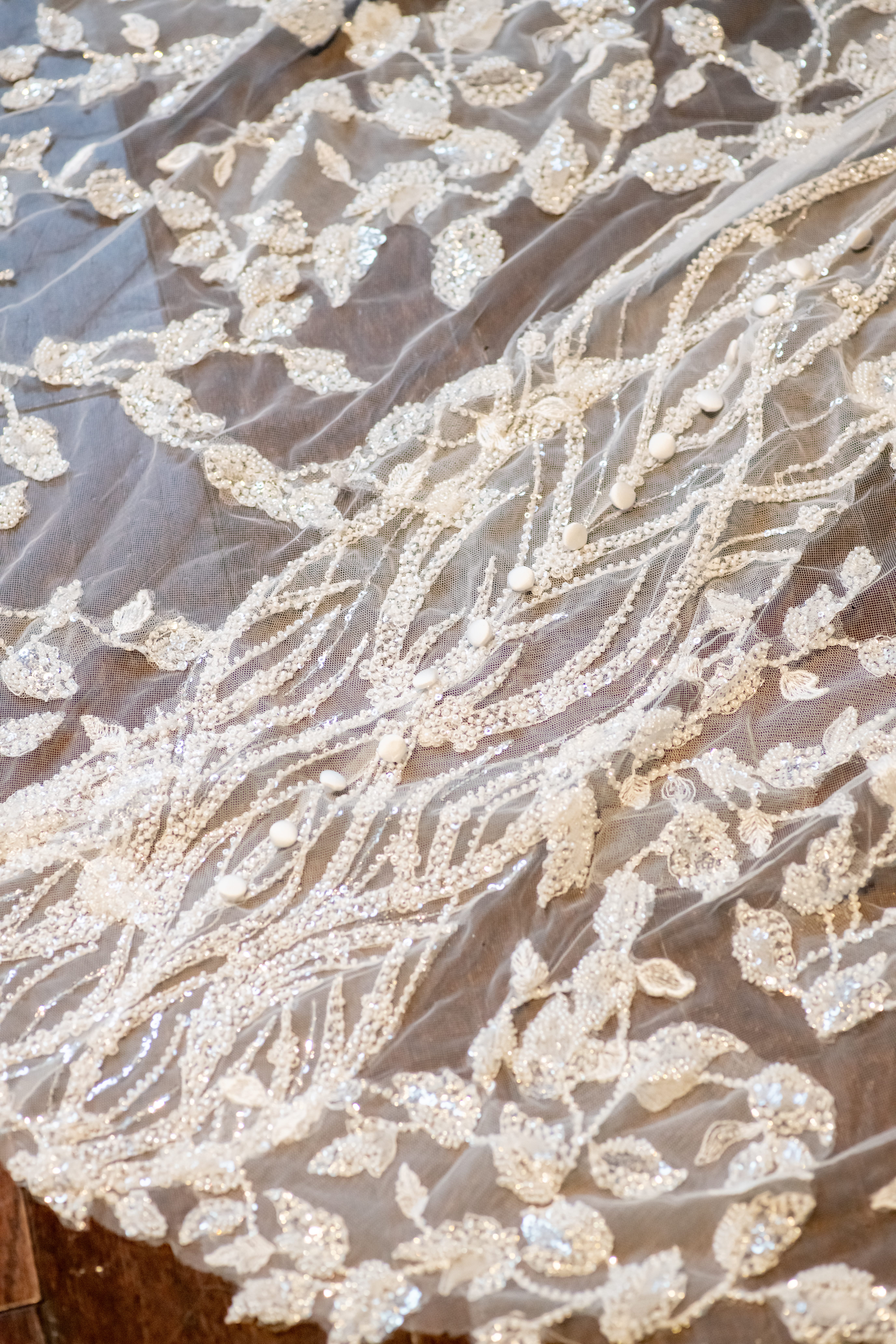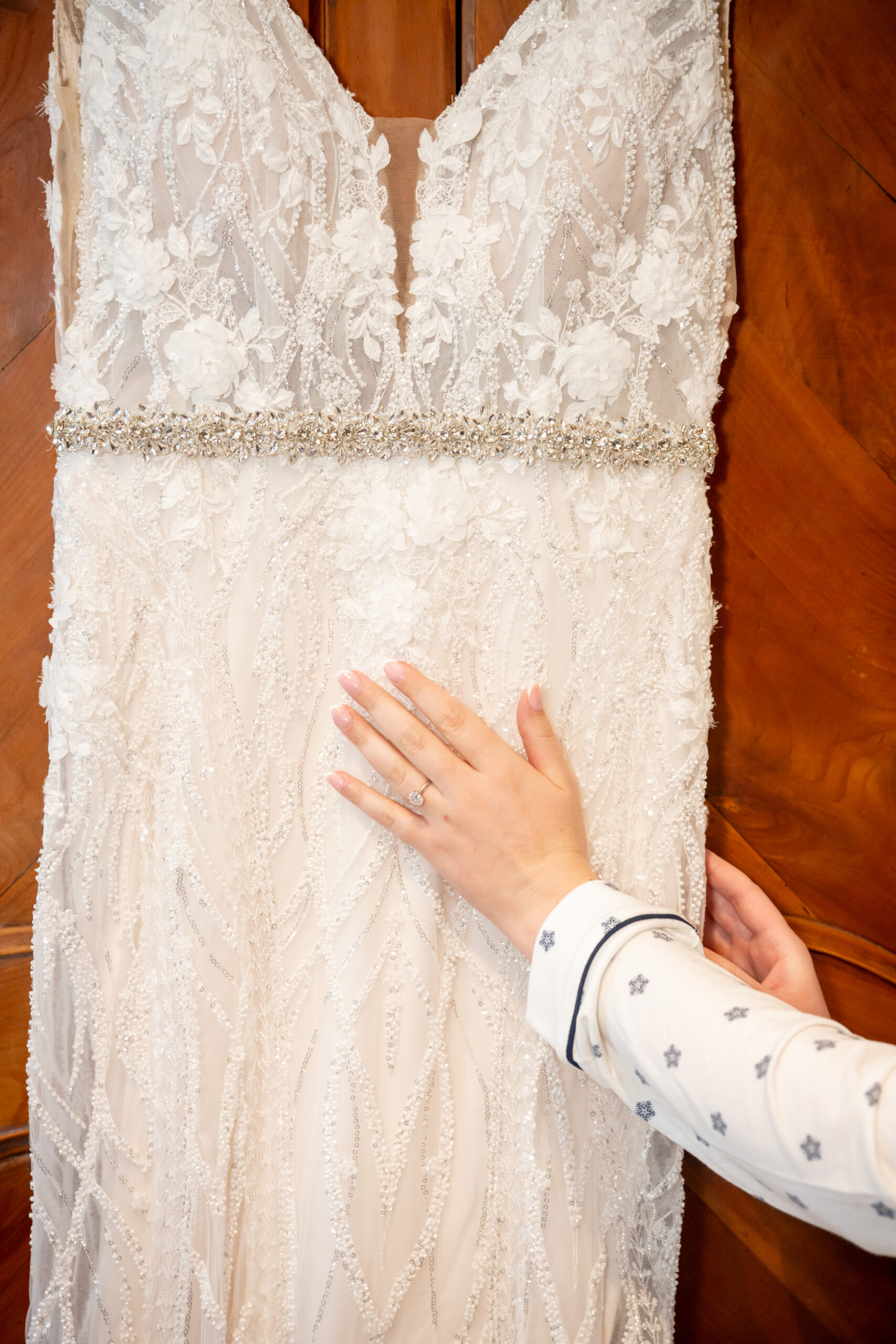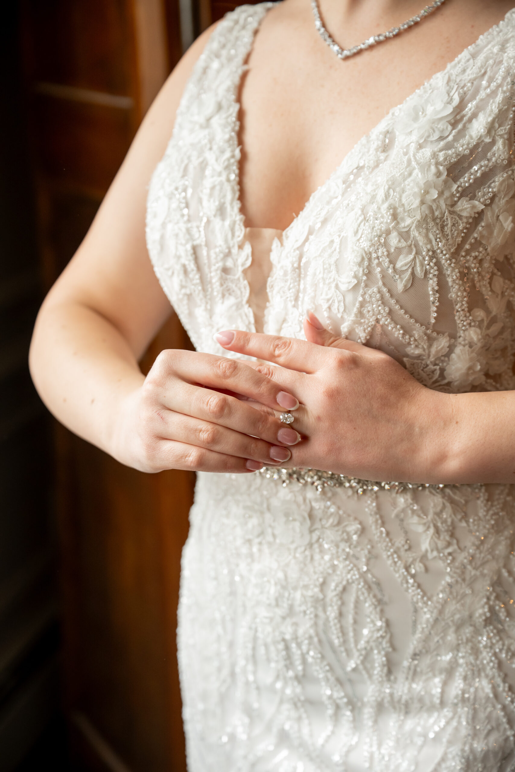 Once Andréa was ready, we took a few quiet portraits of her in her stunning beaded wedding gown. The dress featured intricate lace details and a long flowing train that shimmered beautifully in the soft winter light. It honestly sparkled like fresh snow or a Christmas tree glowing with white lights.