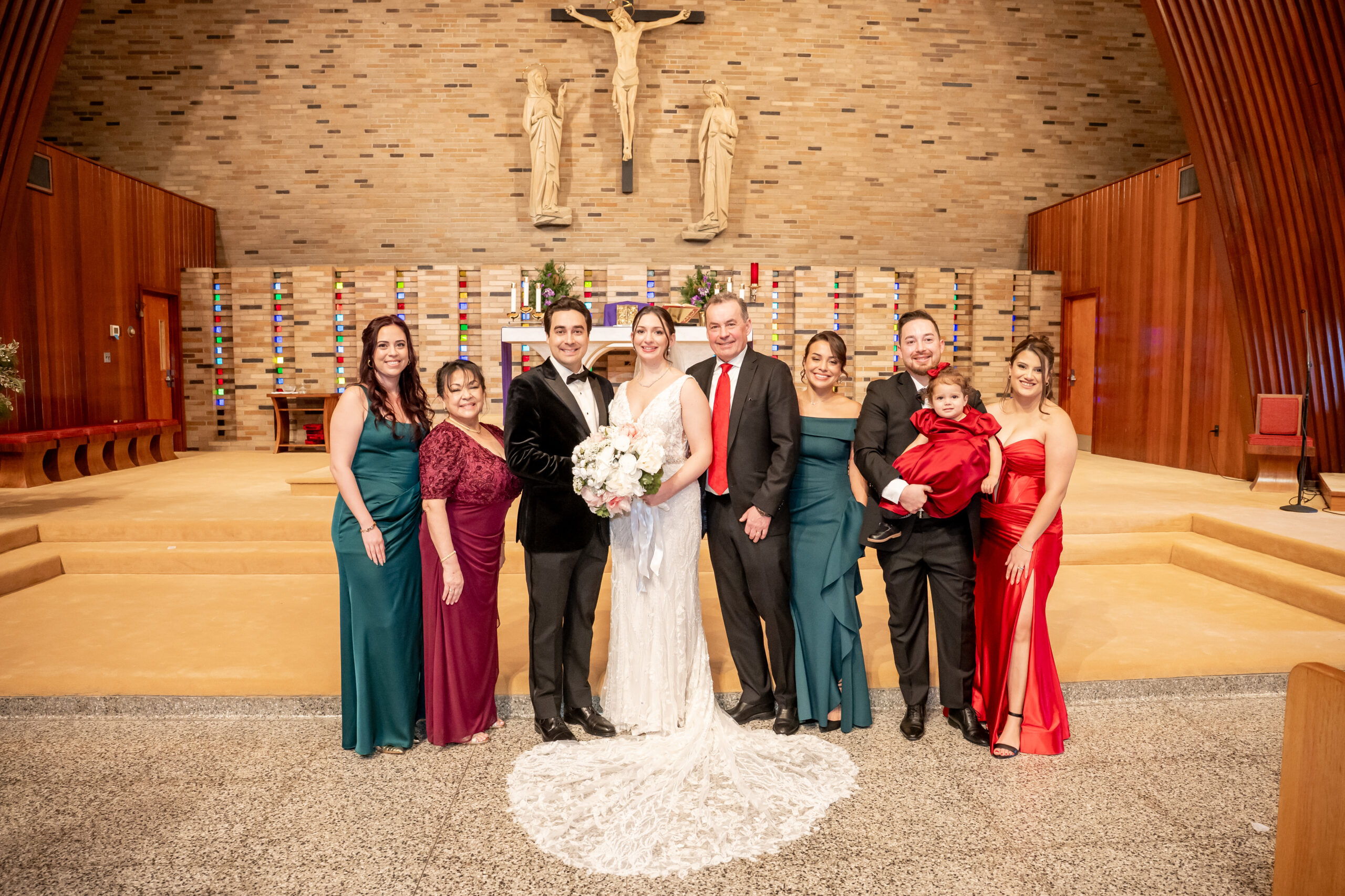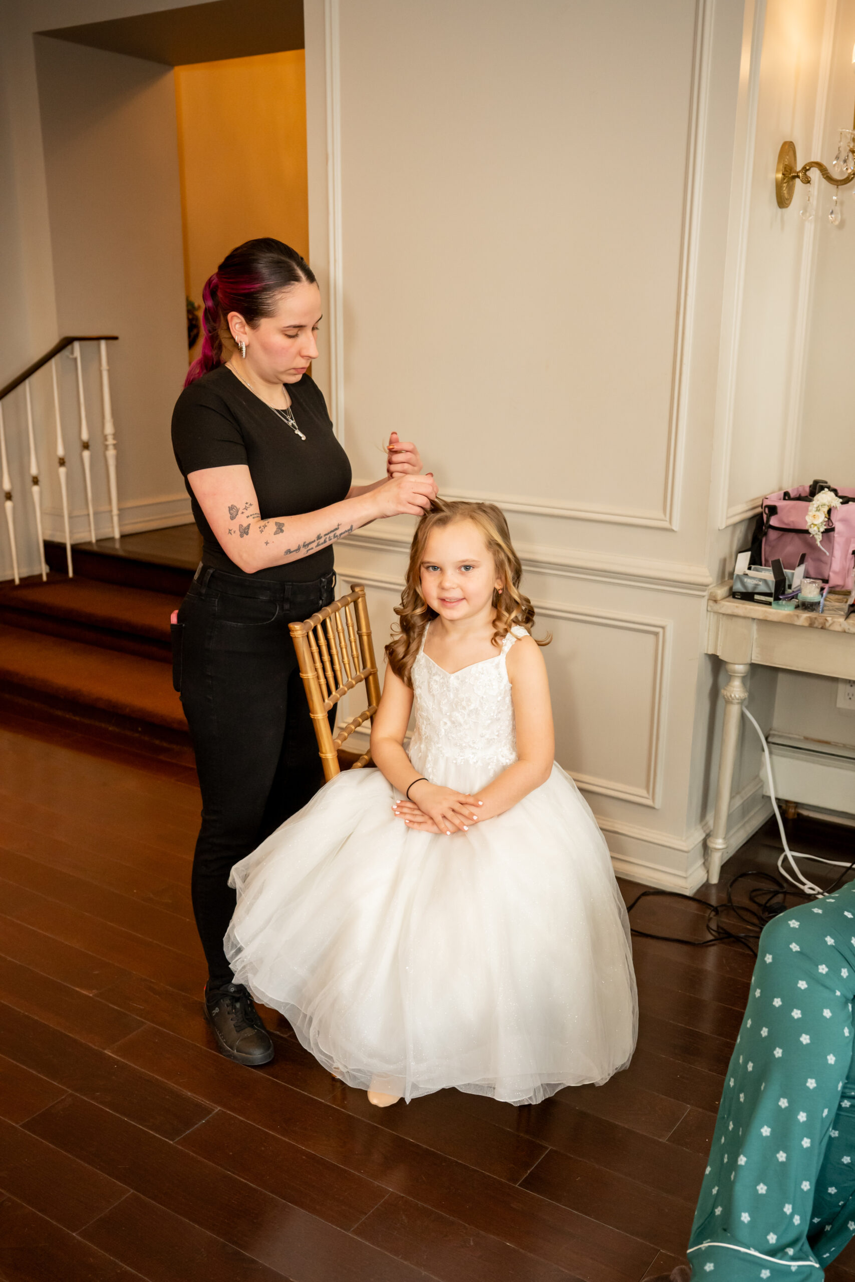 We even included one of her flower girls, who was dressed all in white and ready to toss her petals down the aisle. Nearby, the ring bearers were getting dressed with the help of their dad, including one tiny baby ring bearer, which was the sweetest sight. With 27 kids attending the wedding, these moments added so much heart and personality to the day.