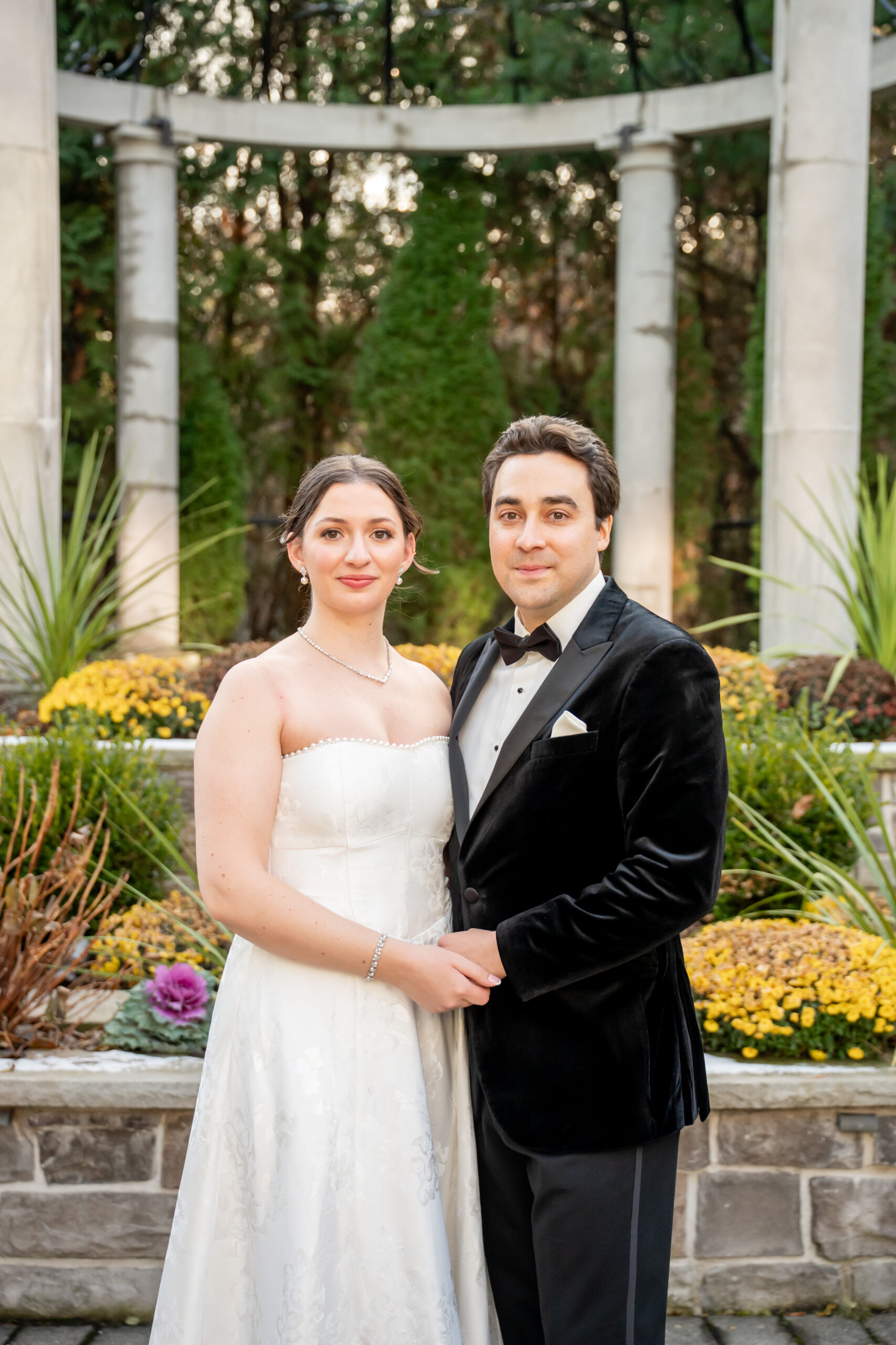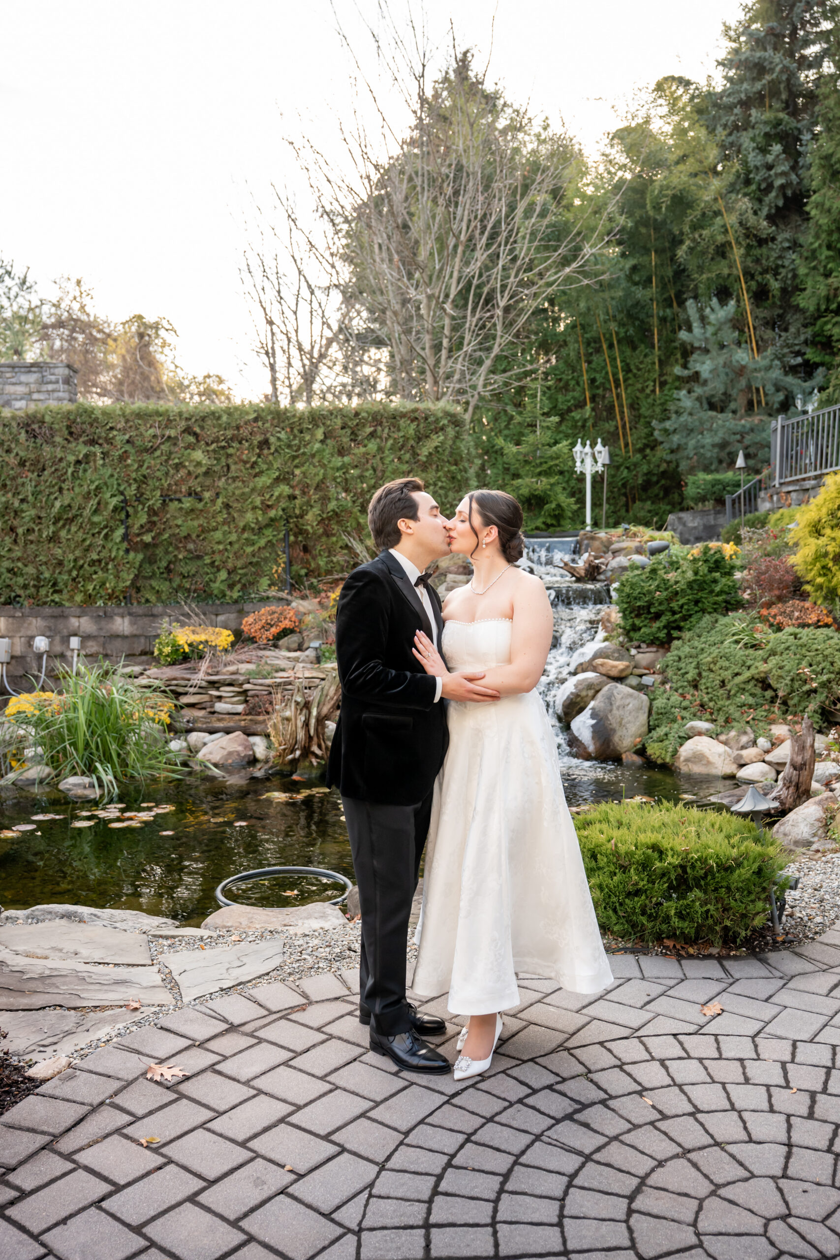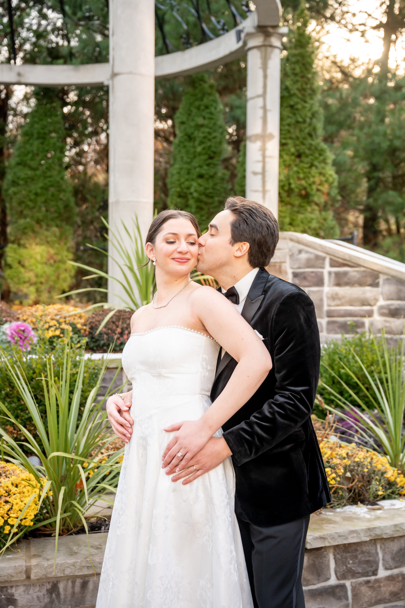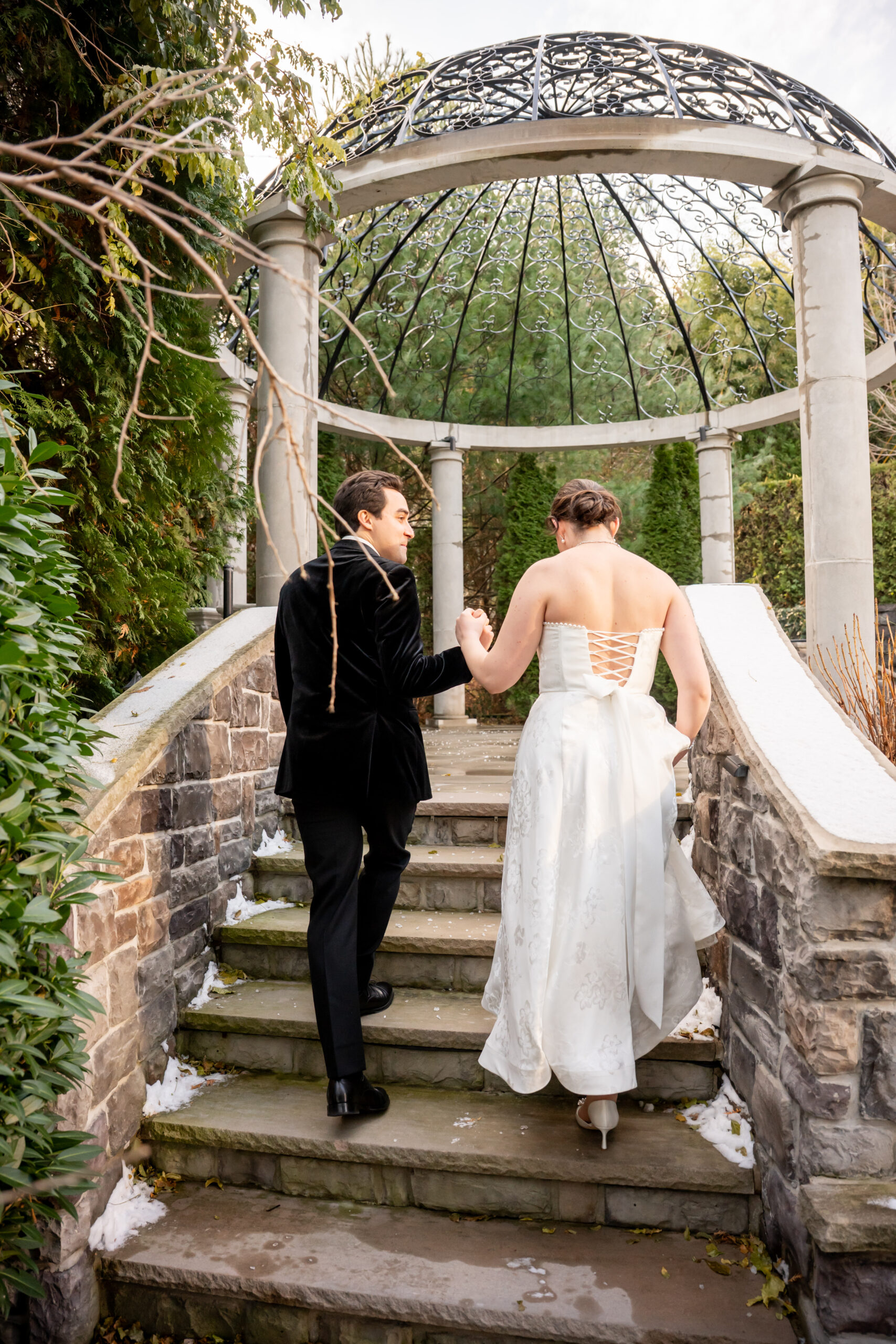 After a few photos at the church, we made our way back to the elegant Valley Regency wedding venue to explore the beautiful grounds. Every corner of the estate is stunning in every season, and winter made it feel especially romantic. We captured portraits by the koi pond, near the large white arbor, and along the elegant staircases.