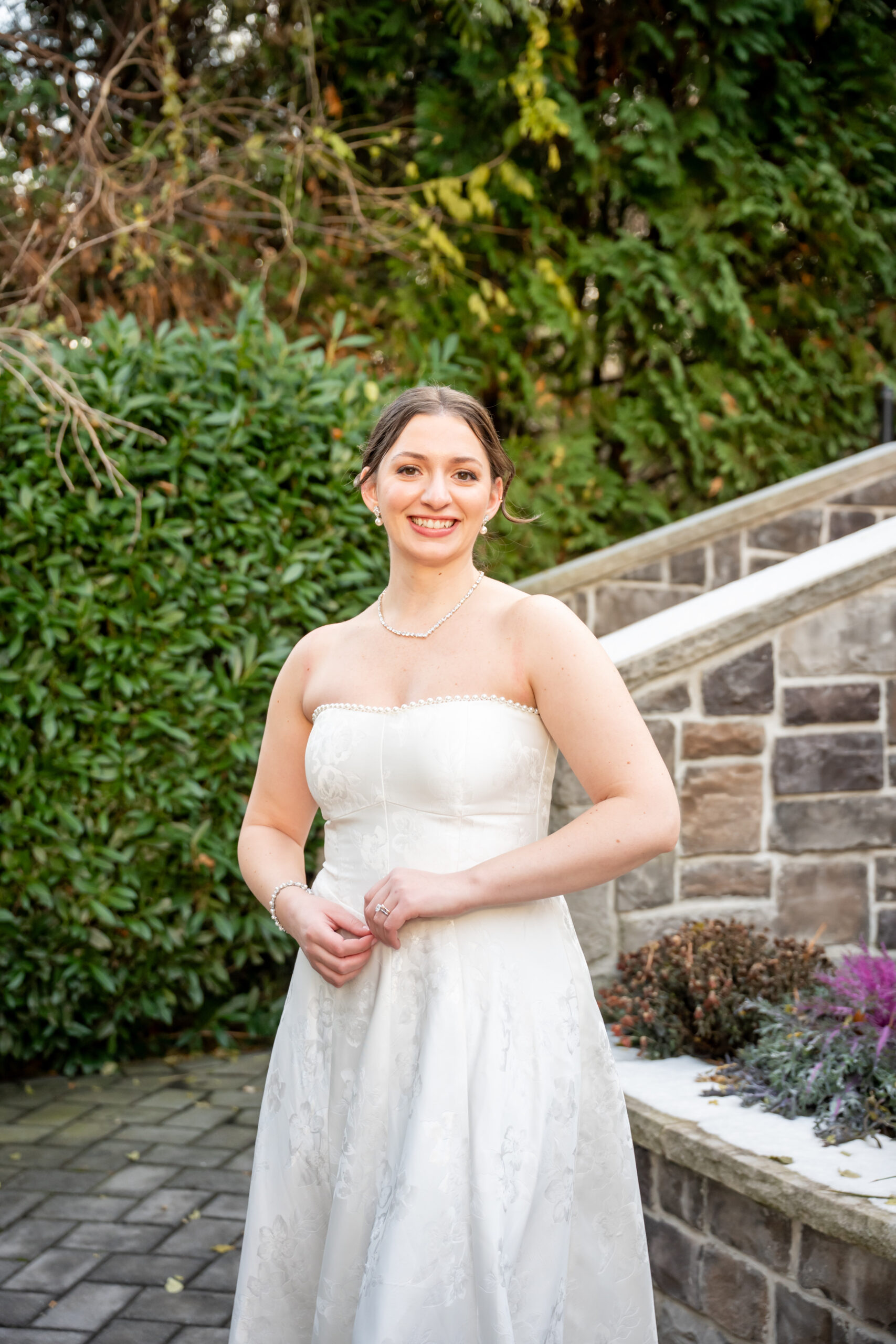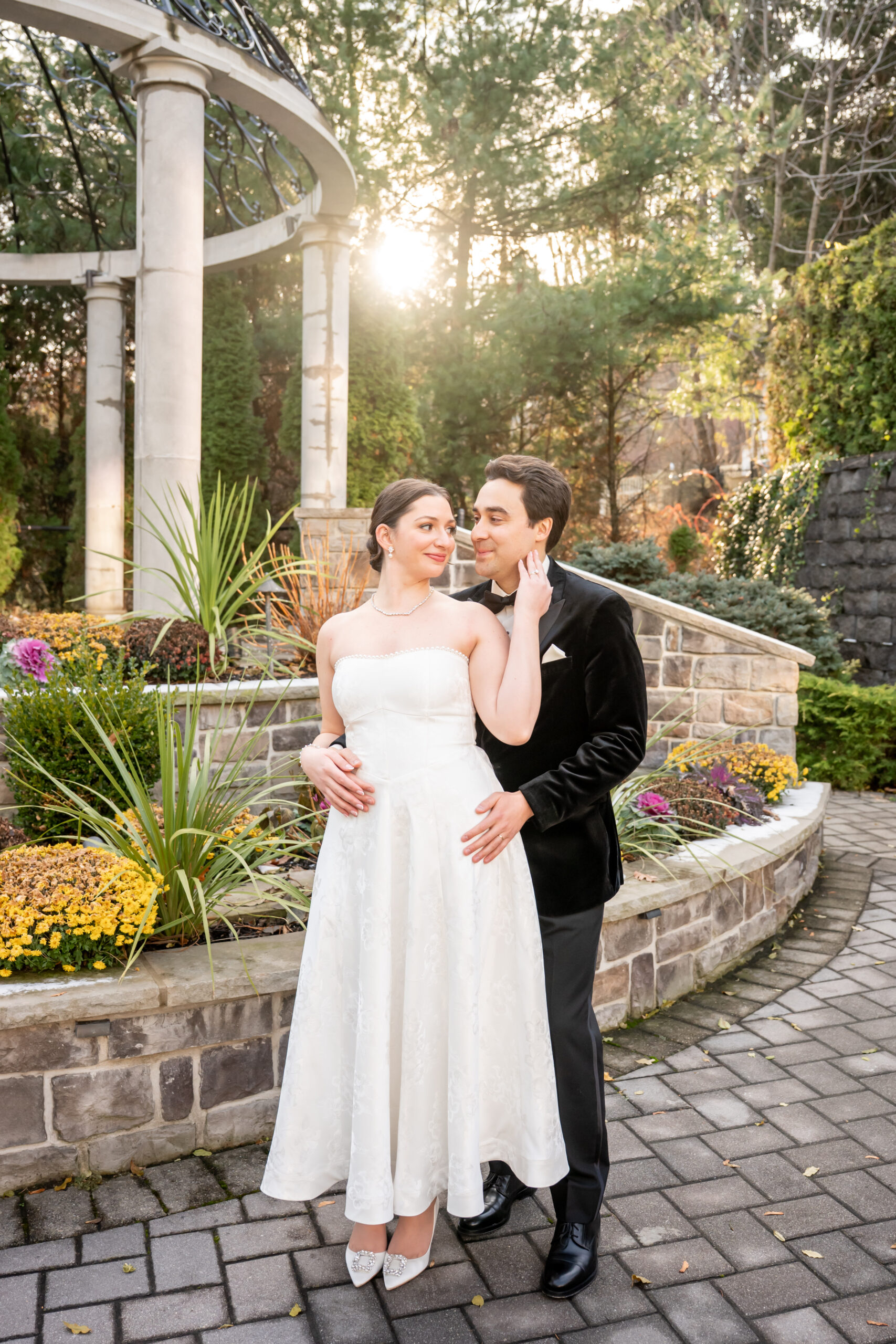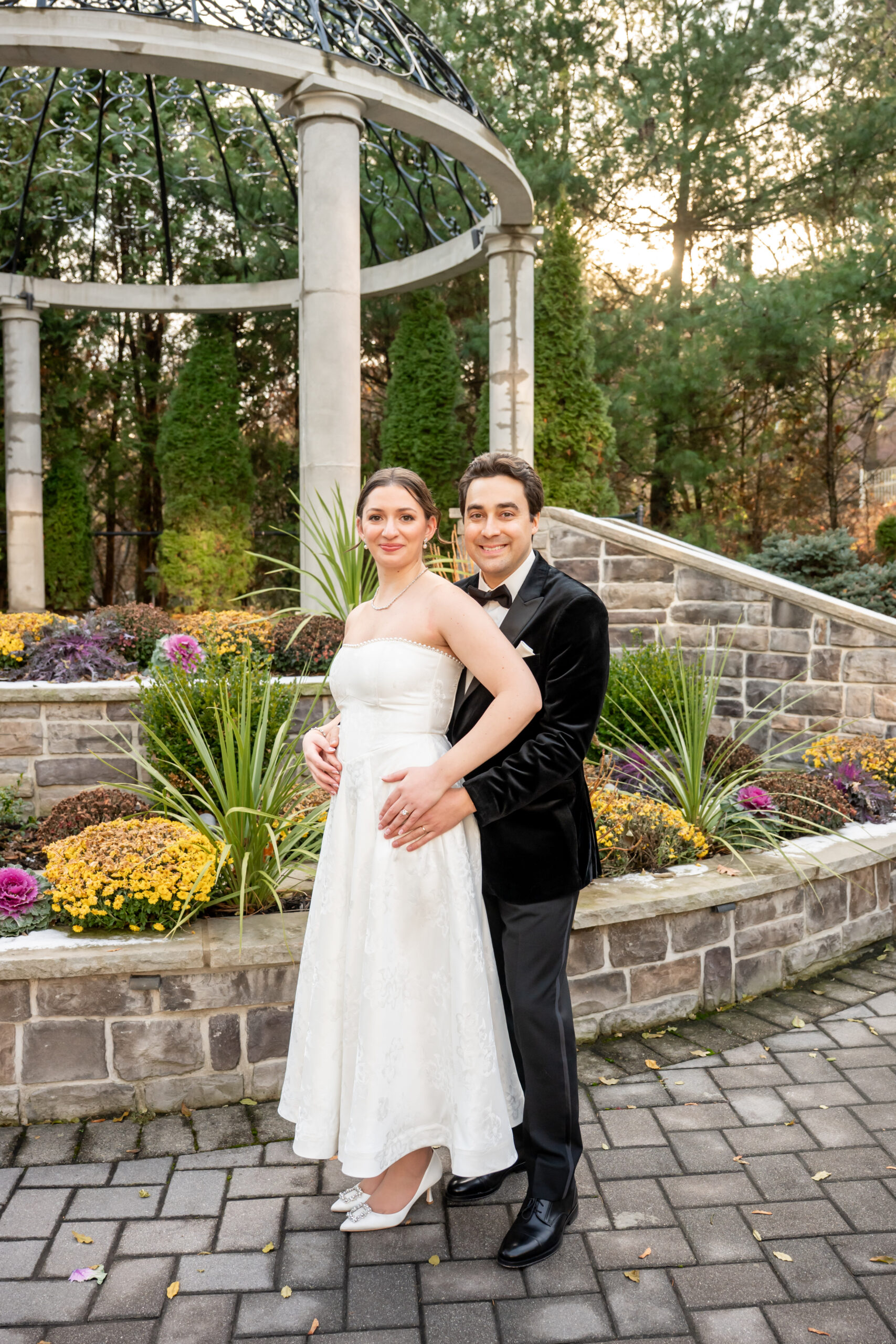 After a few photos at the church, we made our way back to the elegant Valley Regency wedding venue to explore the beautiful grounds. Every corner of the estate is stunning in every season, and winter made it feel especially romantic. We captured portraits by the koi pond, near the large white arbor, and along the elegant staircases.