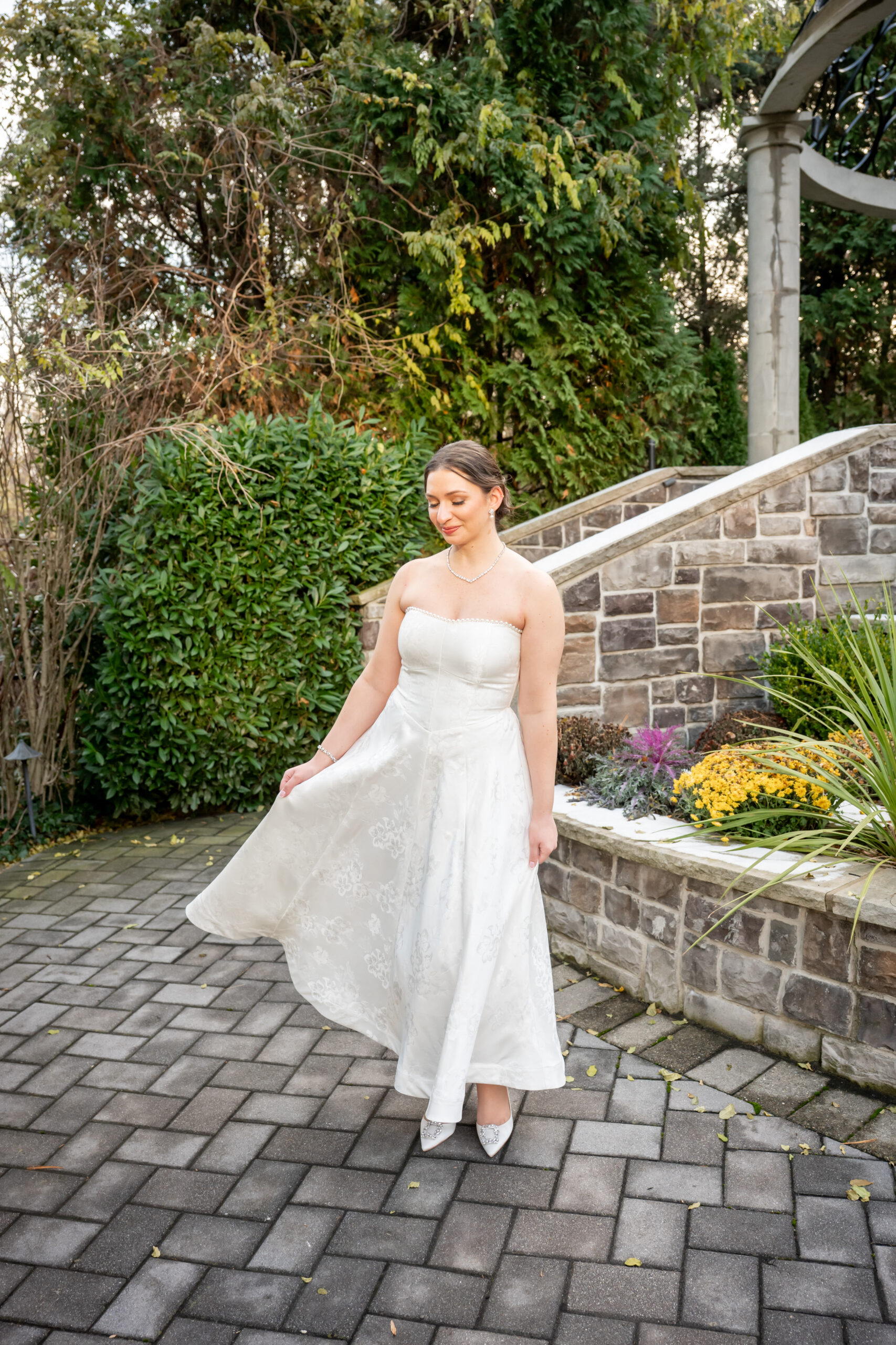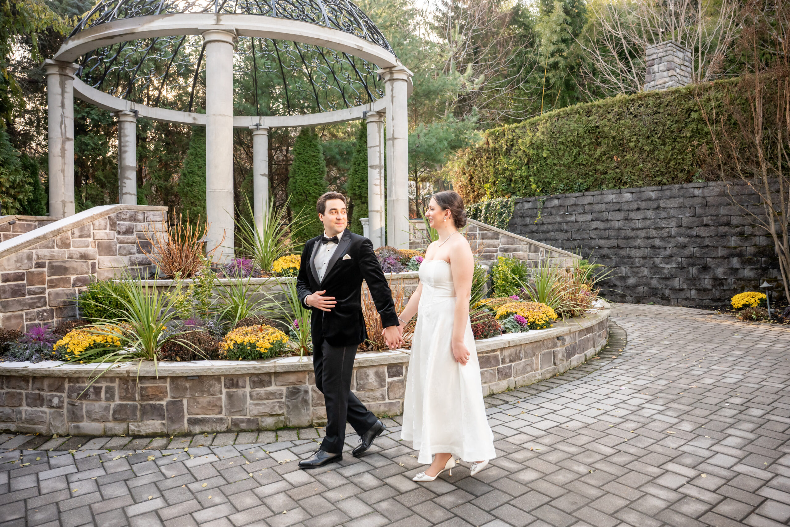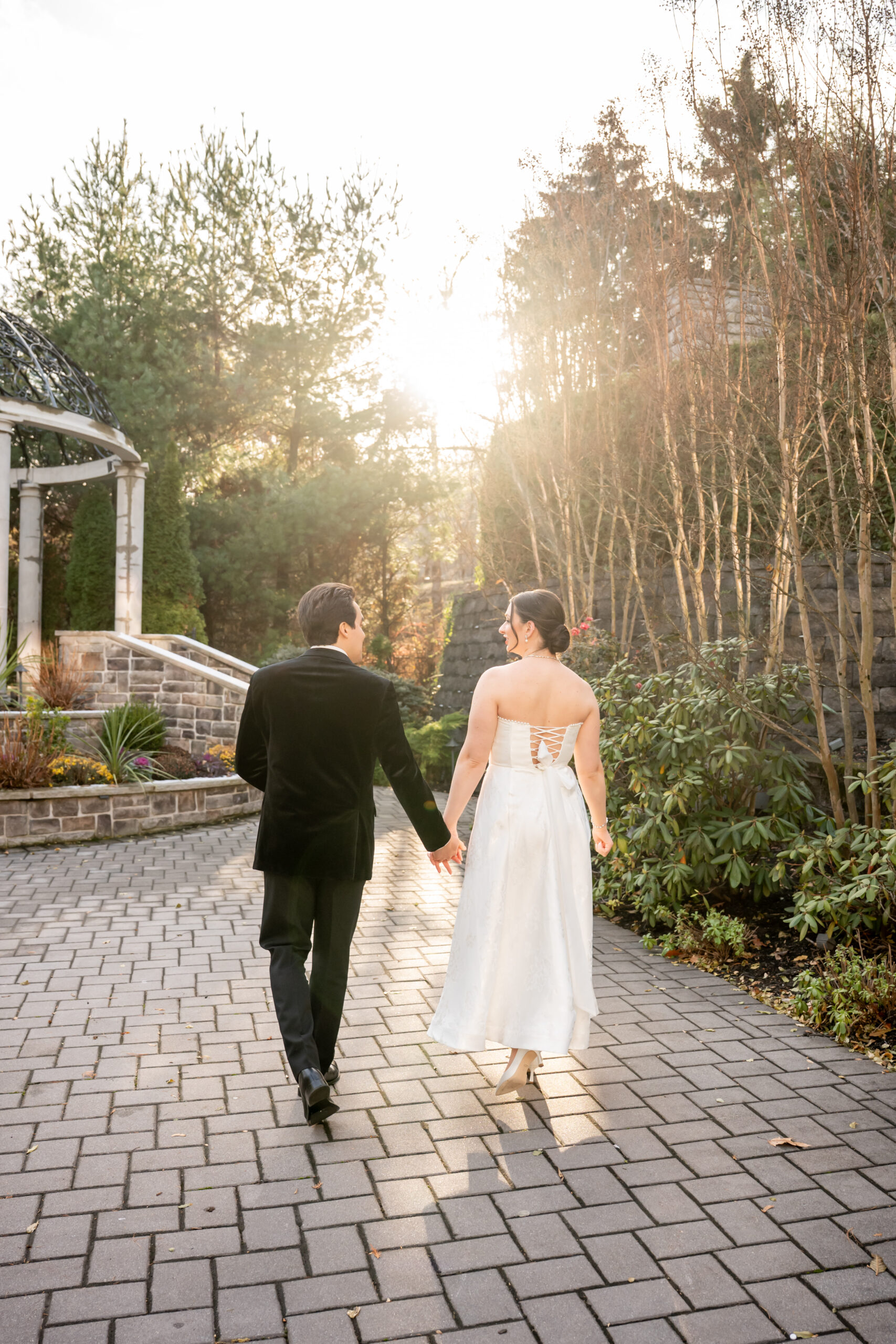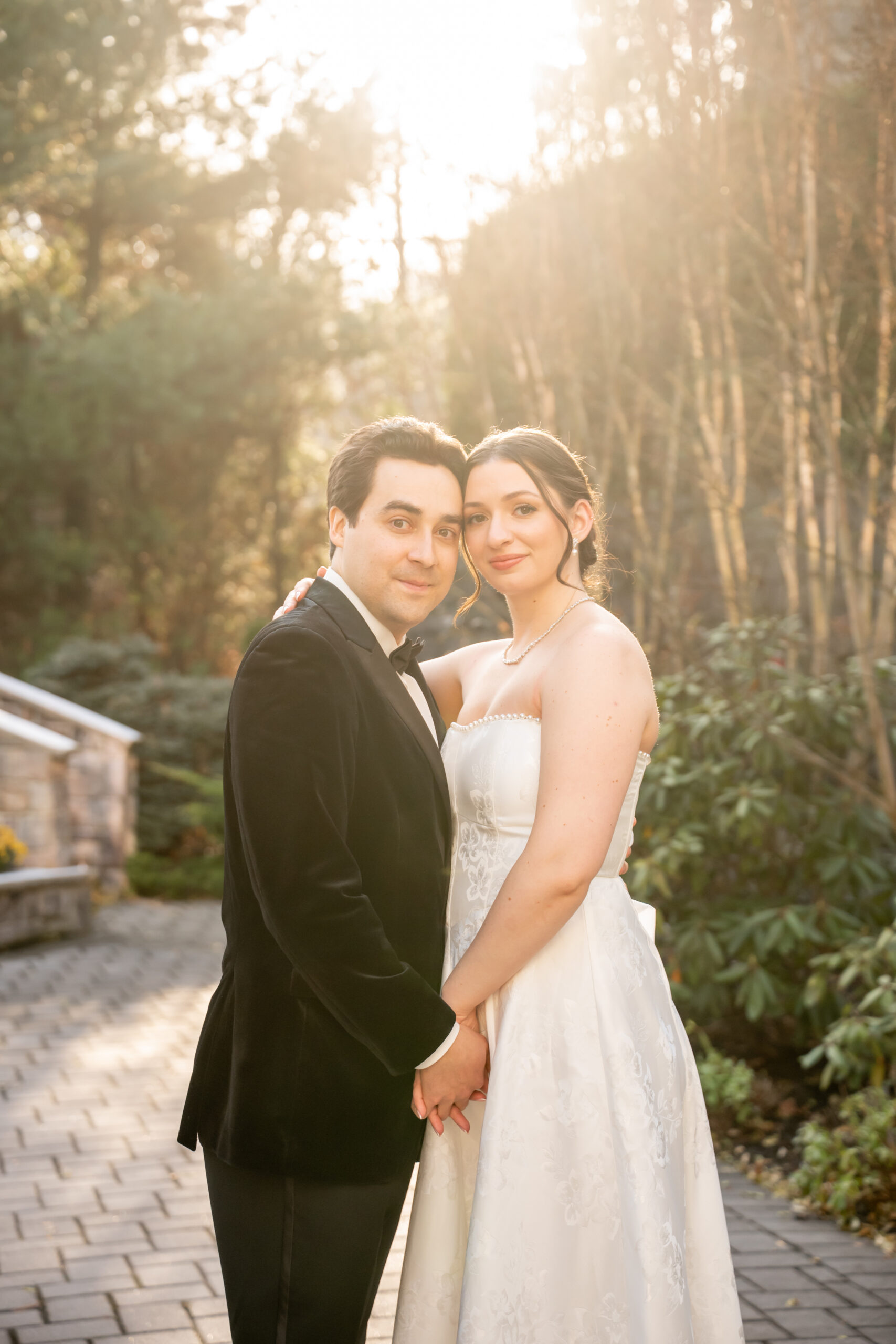 After a few photos at the church, we made our way back to the elegant Valley Regency wedding venue to explore the beautiful grounds. Every corner of the estate is stunning in every season, and winter made it feel especially romantic. We captured portraits by the koi pond, near the large white arbor, and along the elegant staircases.