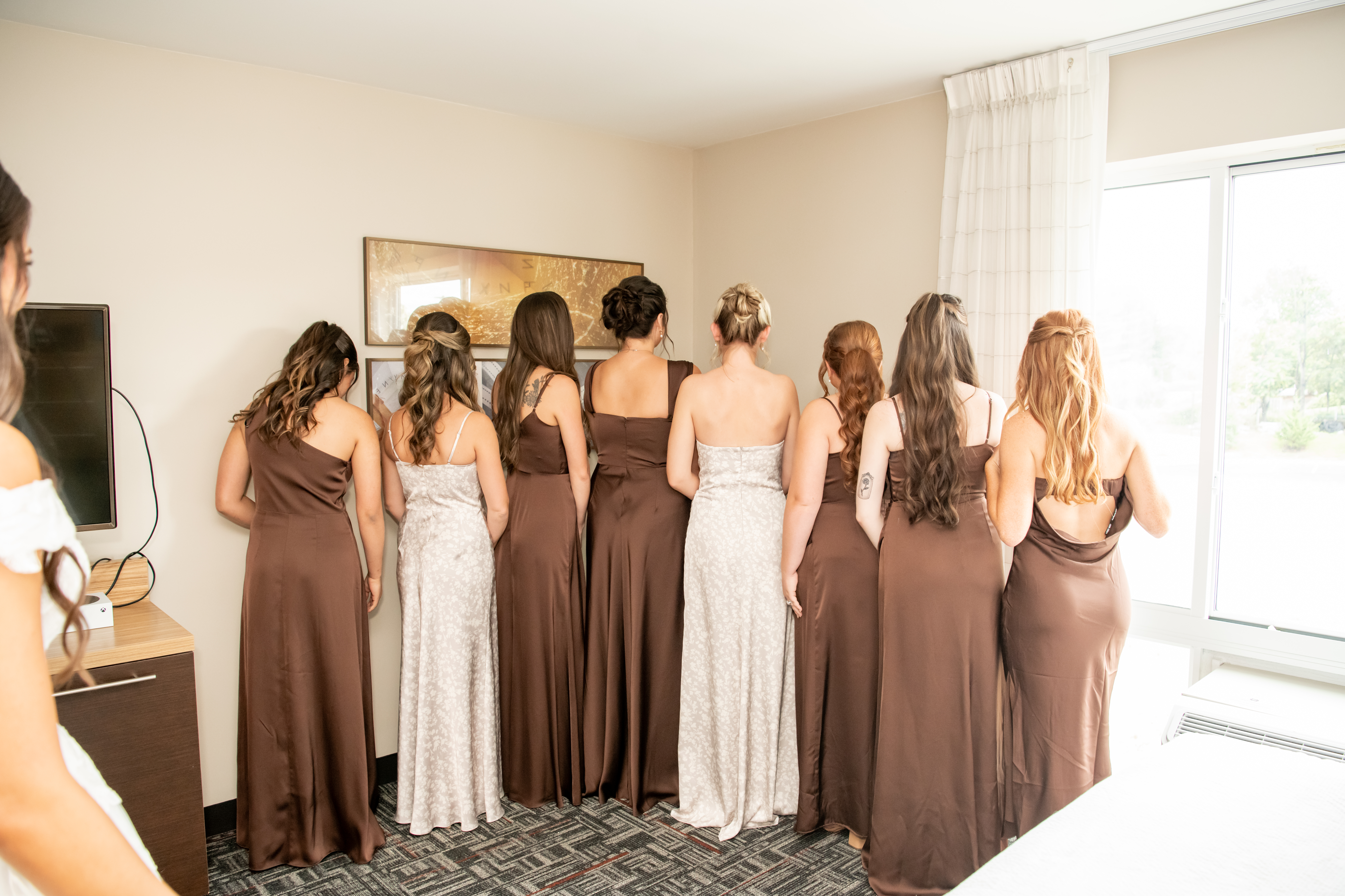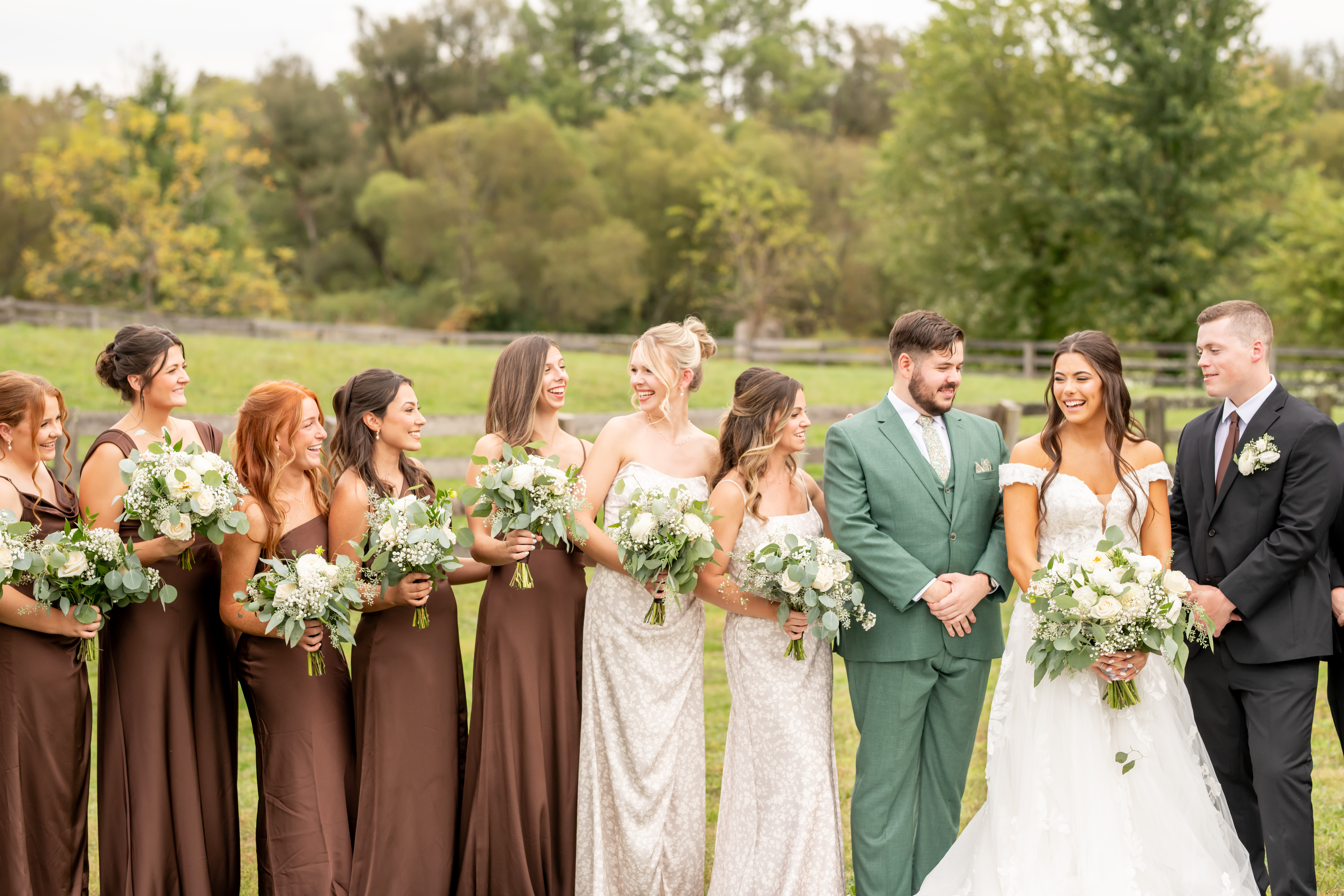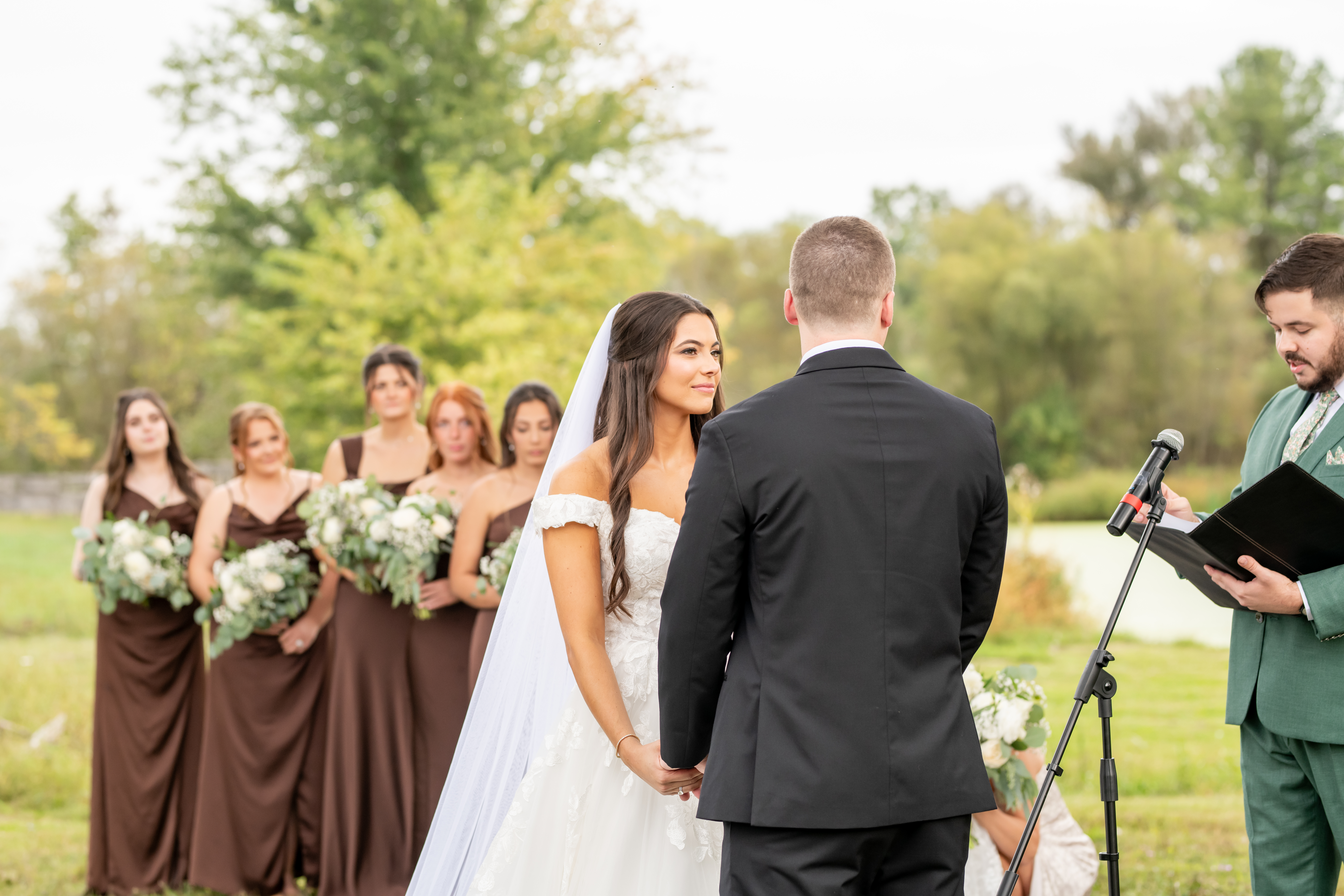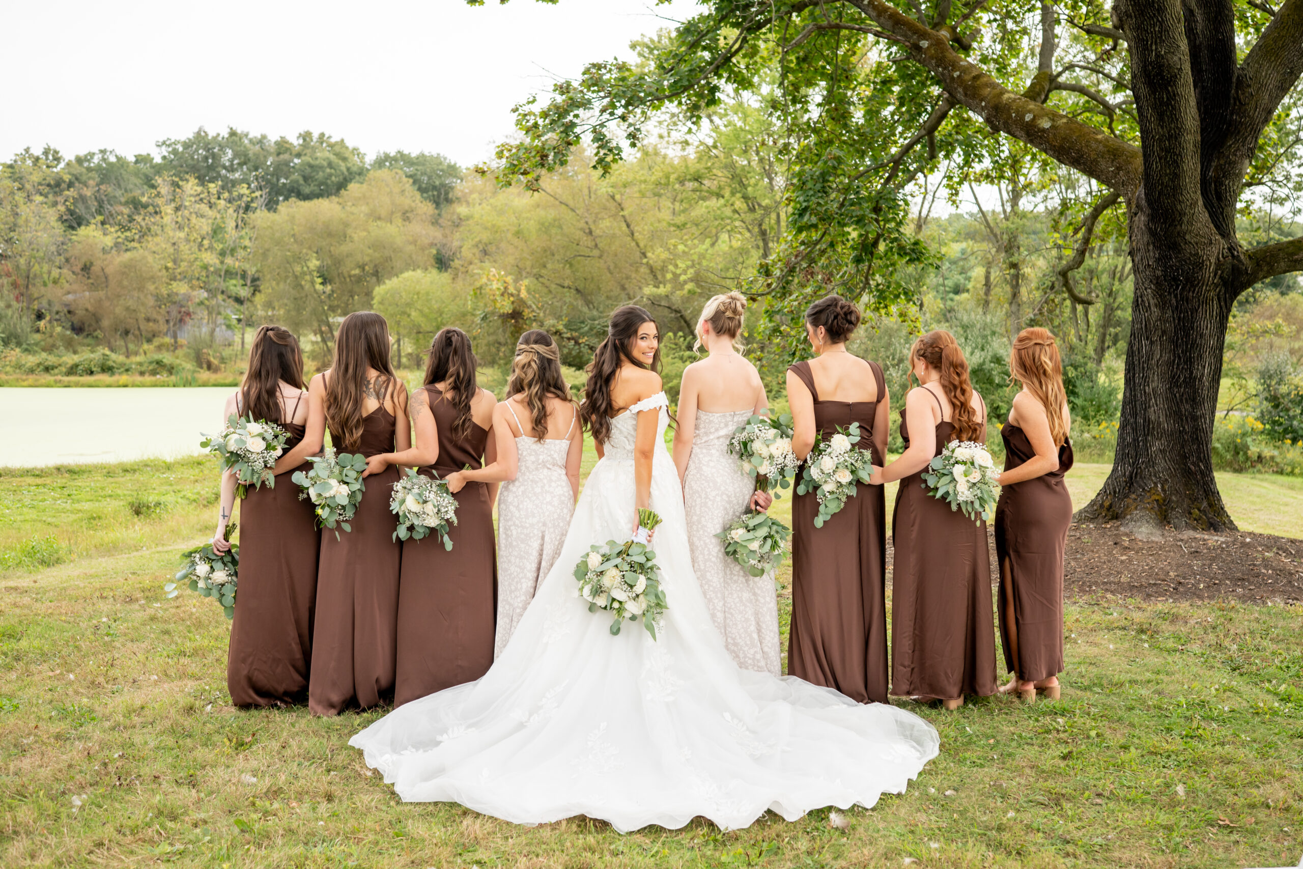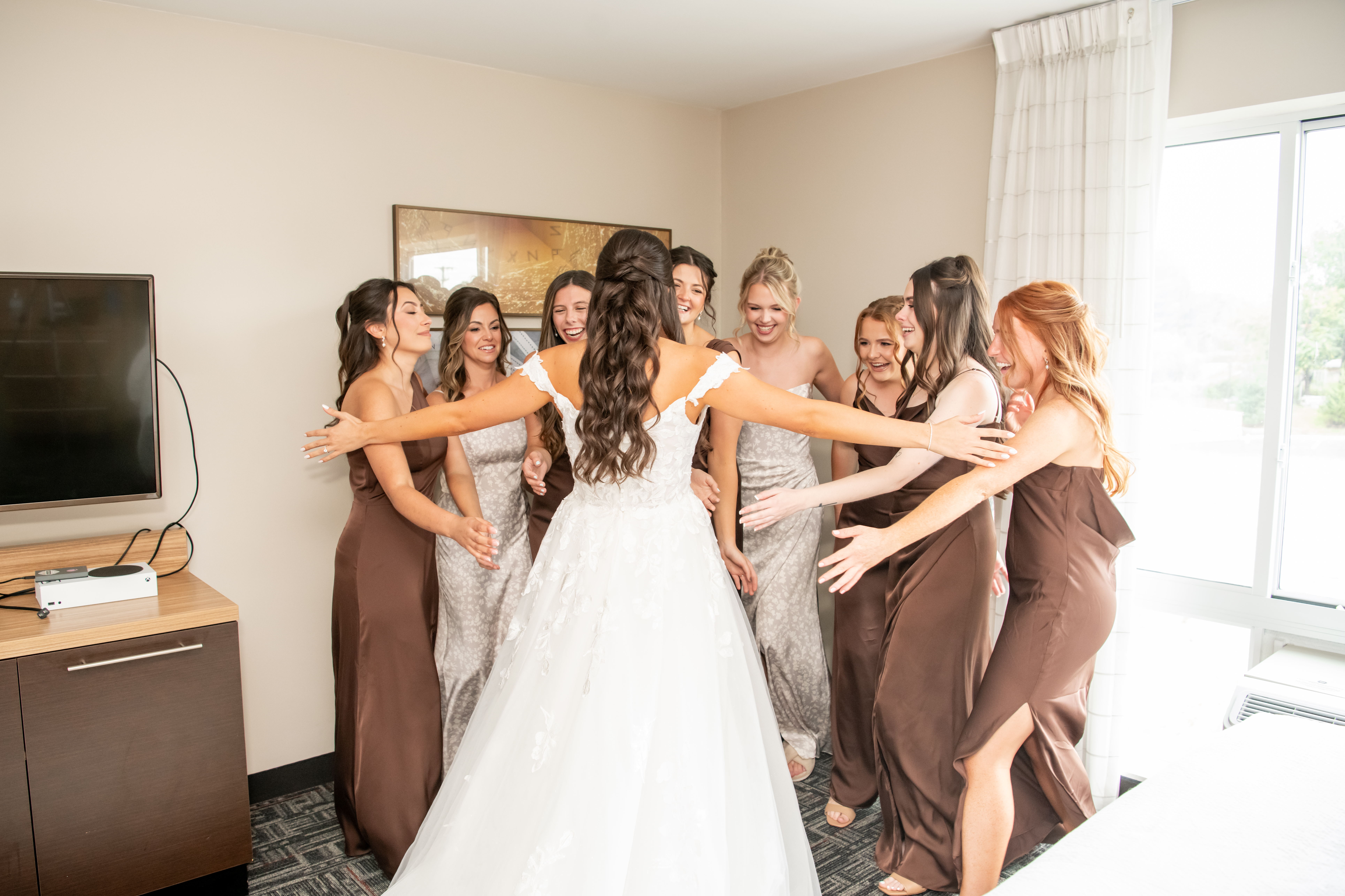 Once dressed, the bridesmaids stepped into stunning brown gowns that were perfect for the season. The two maids of honor stood out in cream patterned dresses that tied beautifully into the color palette. When they turned around for Sabrinaās first look, the room filled with happy screams and tears.