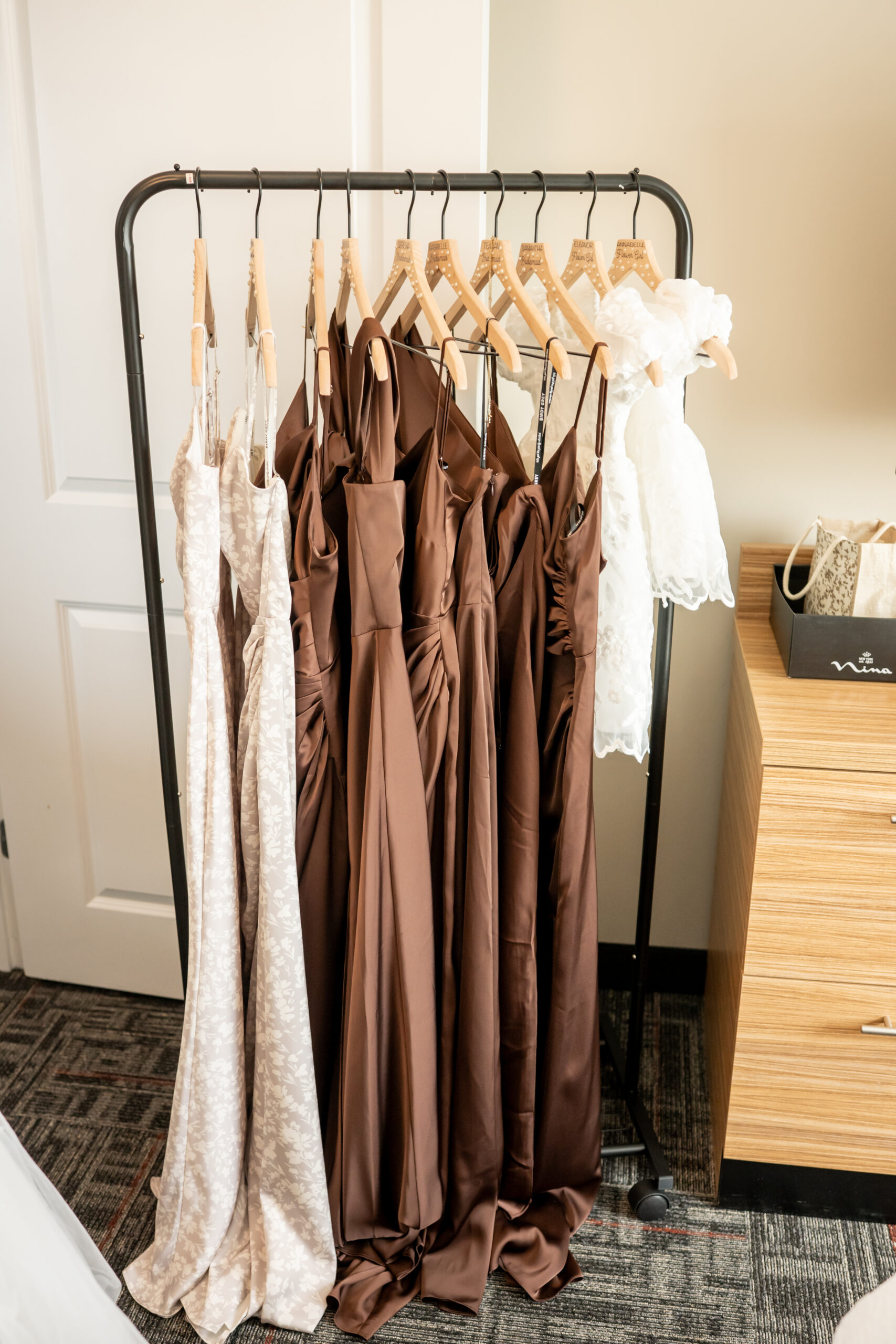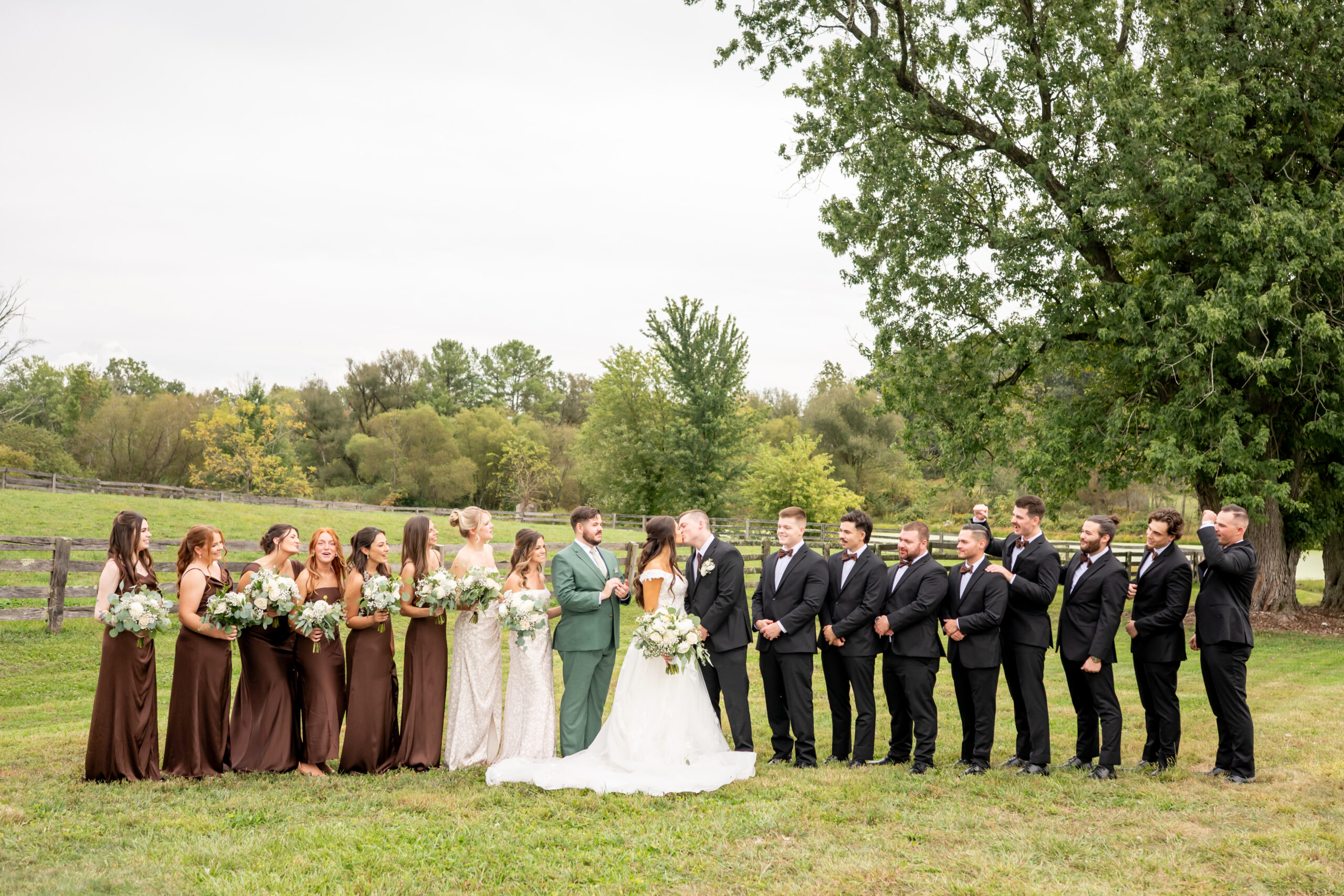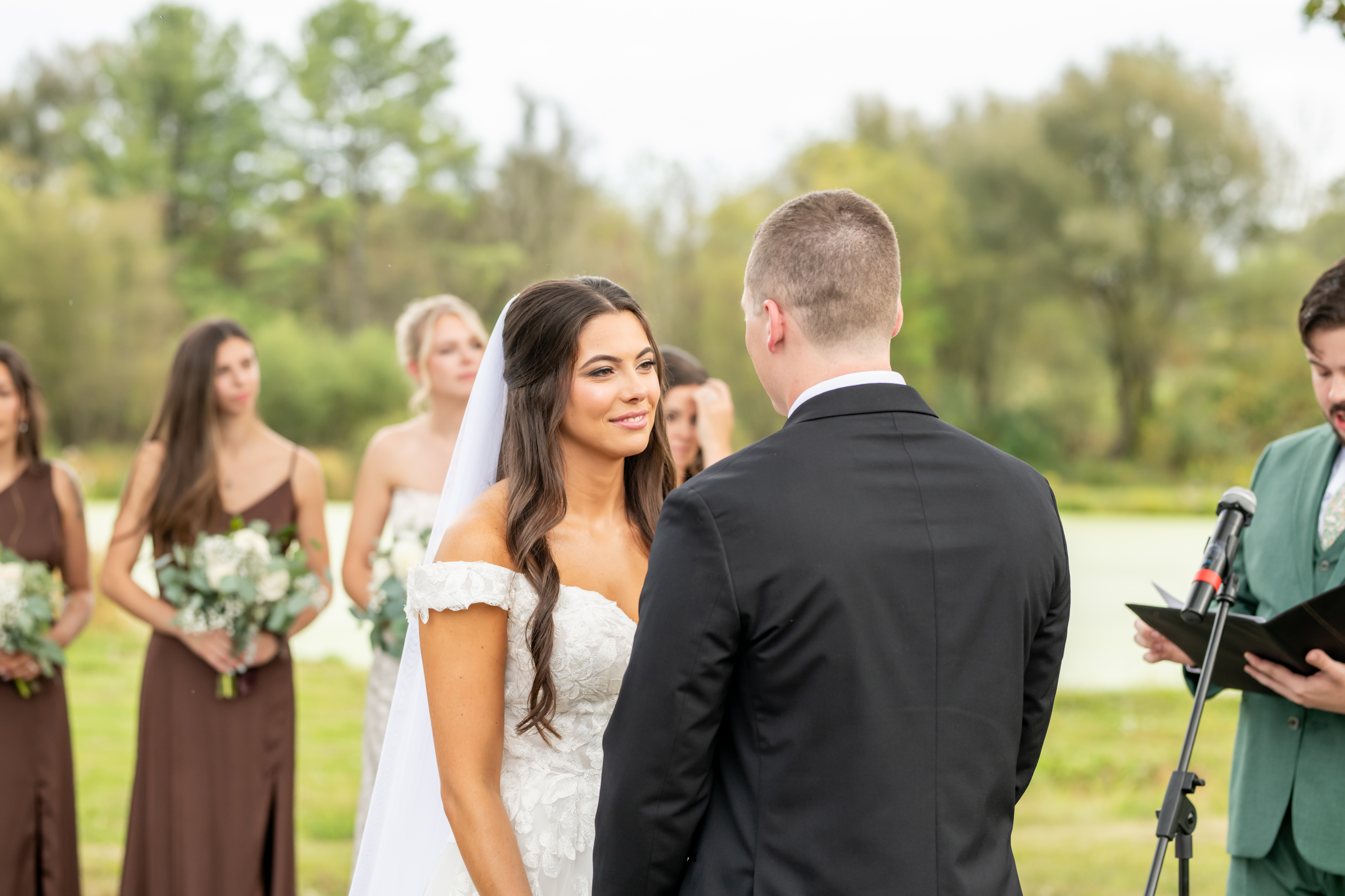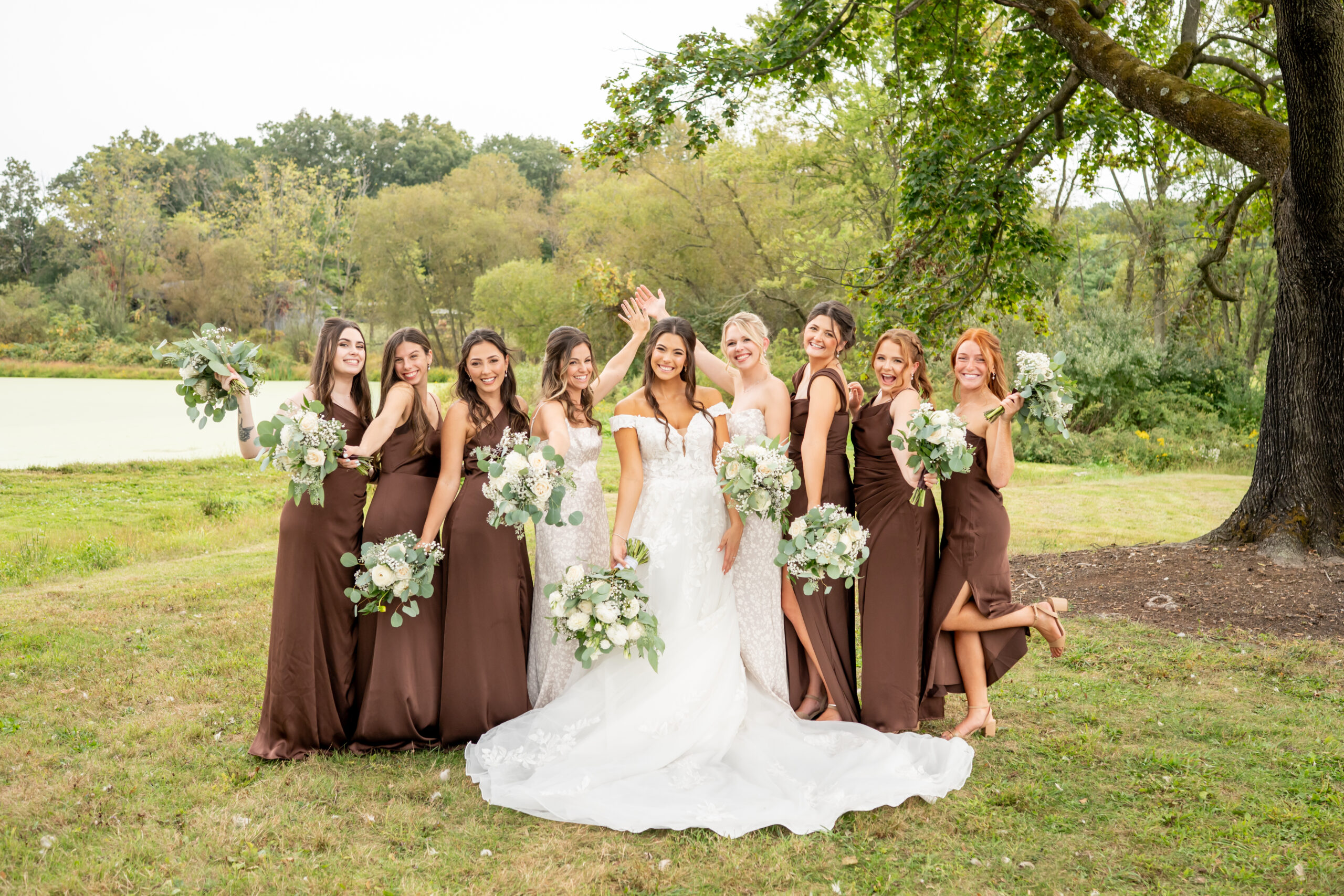 Once dressed, the bridesmaids stepped into stunning brown gowns that were perfect for the season. The two maids of honor stood out in cream patterned dresses that tied beautifully into the color palette. When they turned around for Sabrinaās first look, the room filled with happy screams and tears.