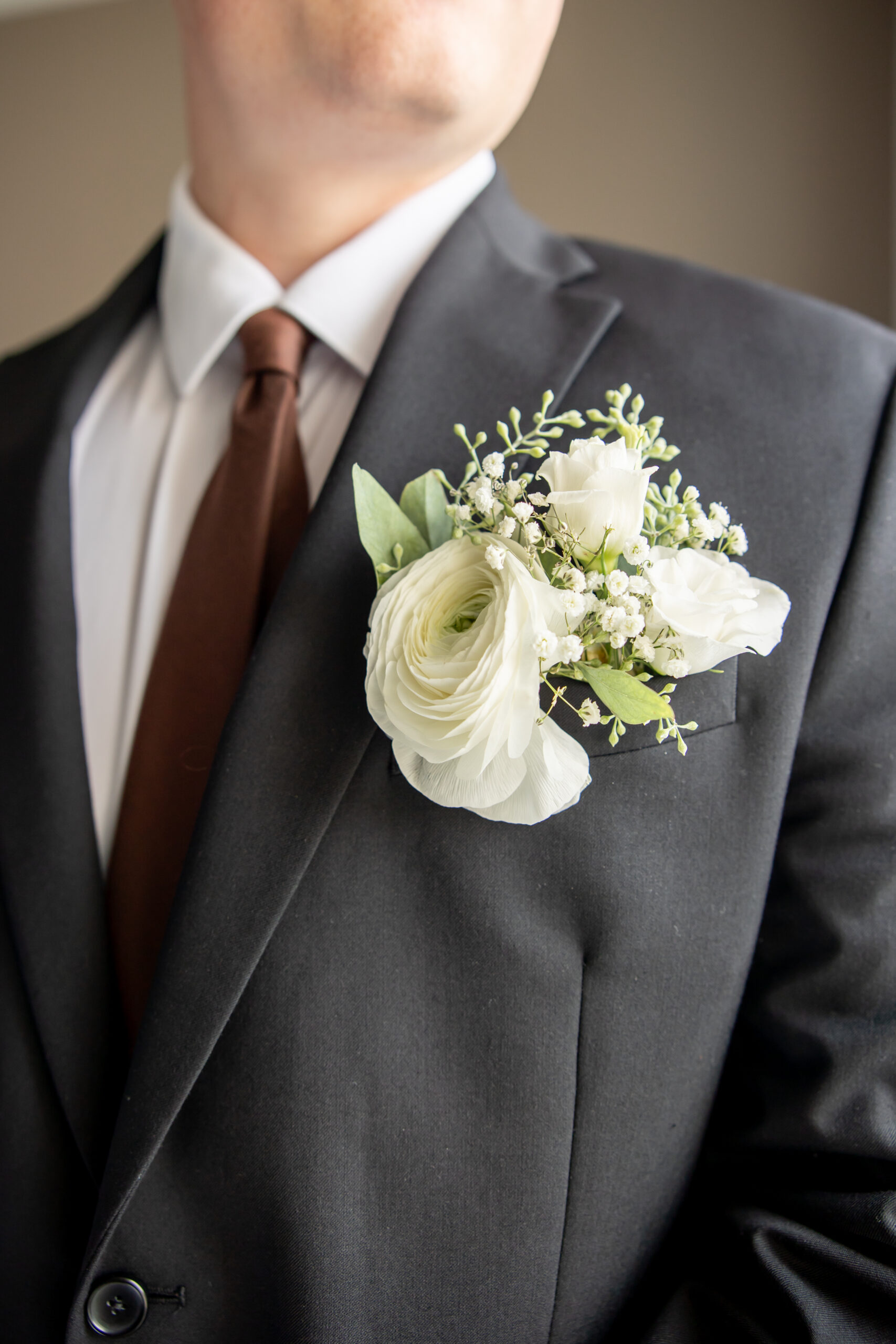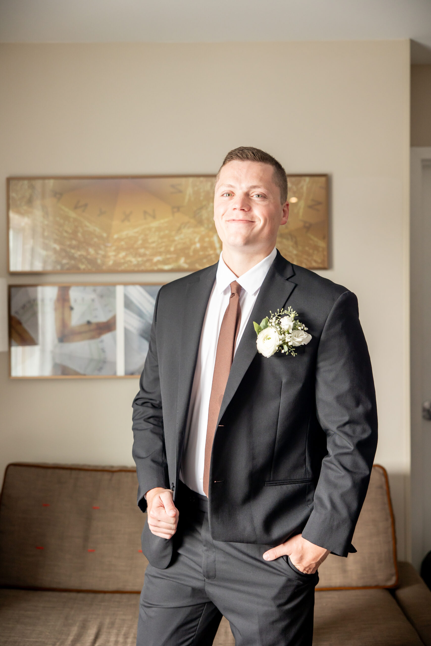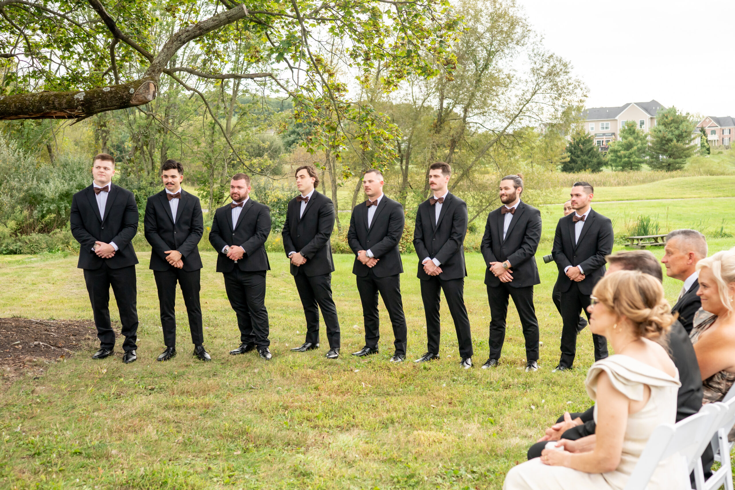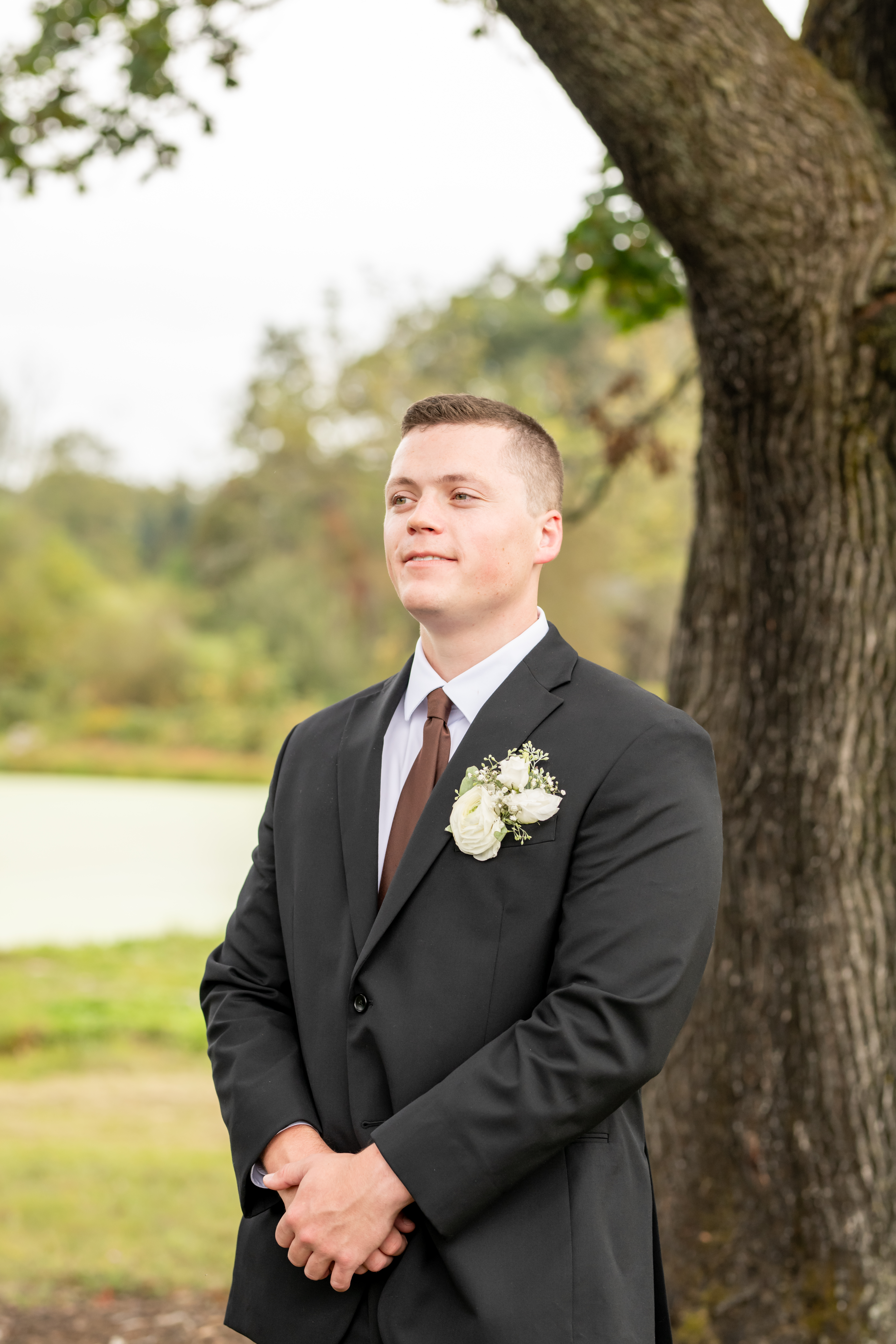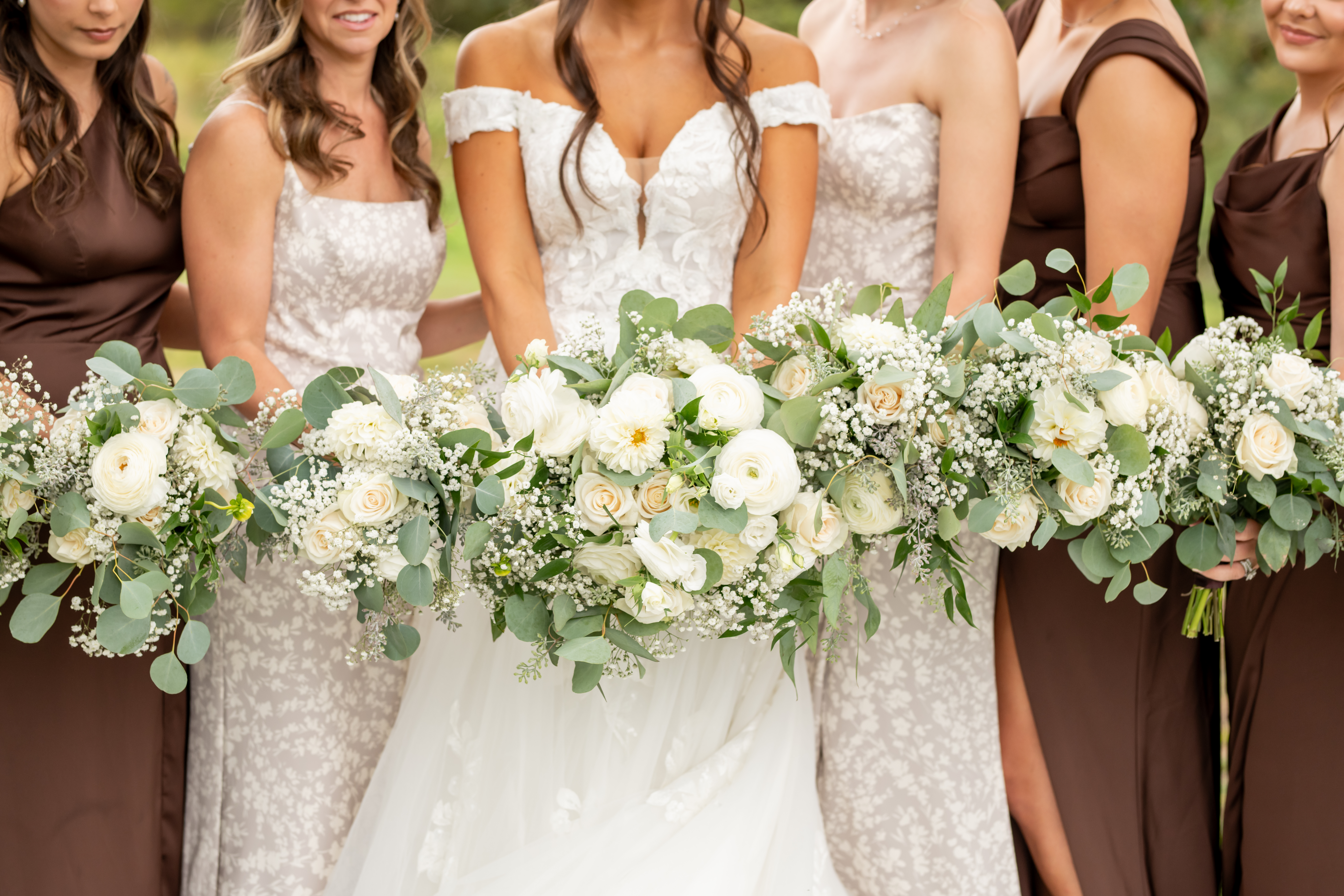 Once dressed, the bridesmaids stepped into stunning brown gowns that were perfect for the season. The two maids of honor stood out in cream patterned dresses that tied beautifully into the color palette. When they turned around for Sabrinaās first look, the room filled with happy screams and tears.