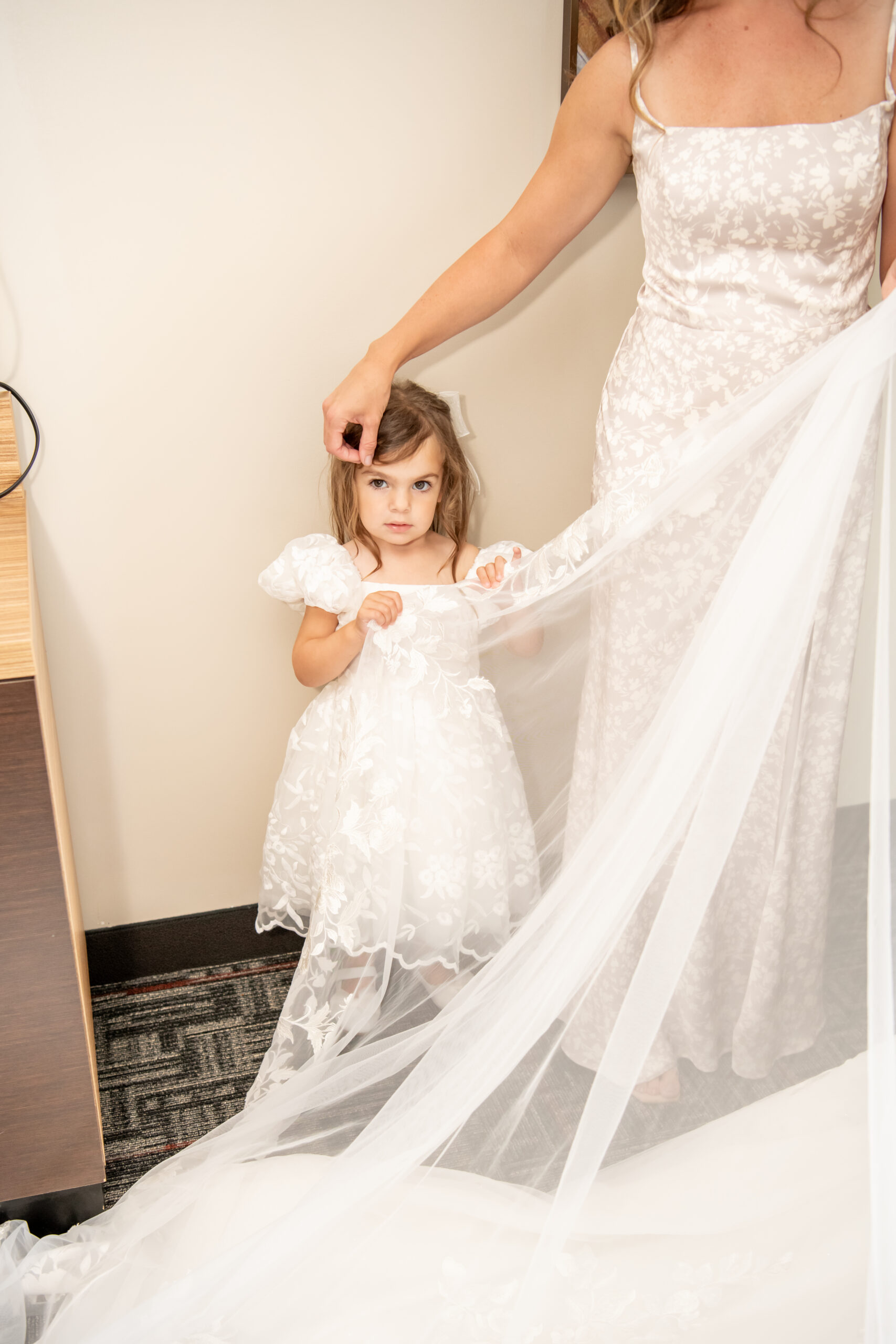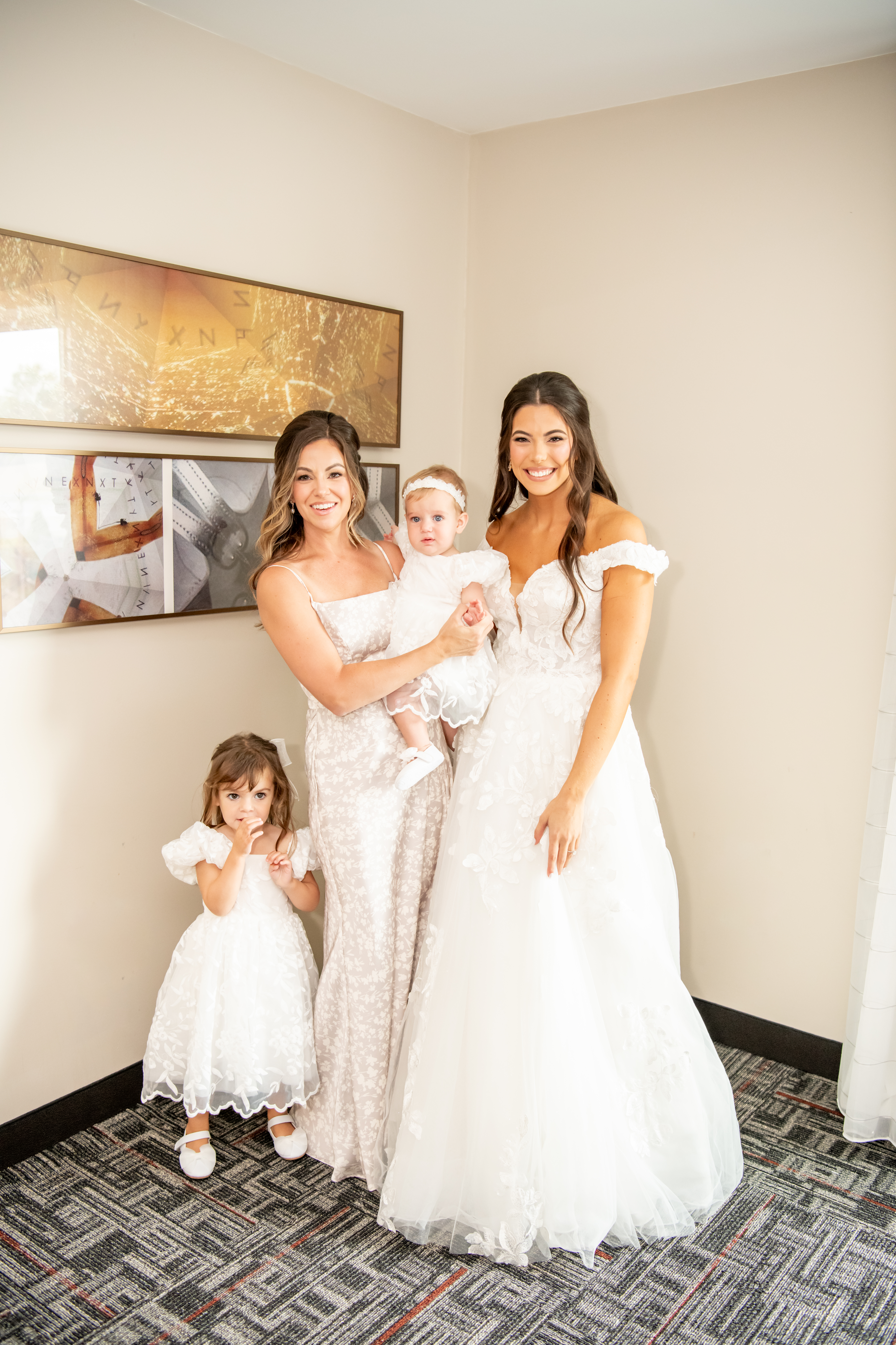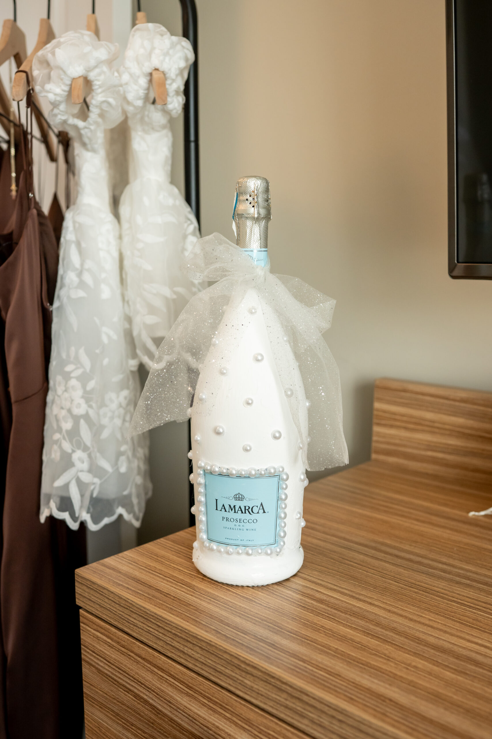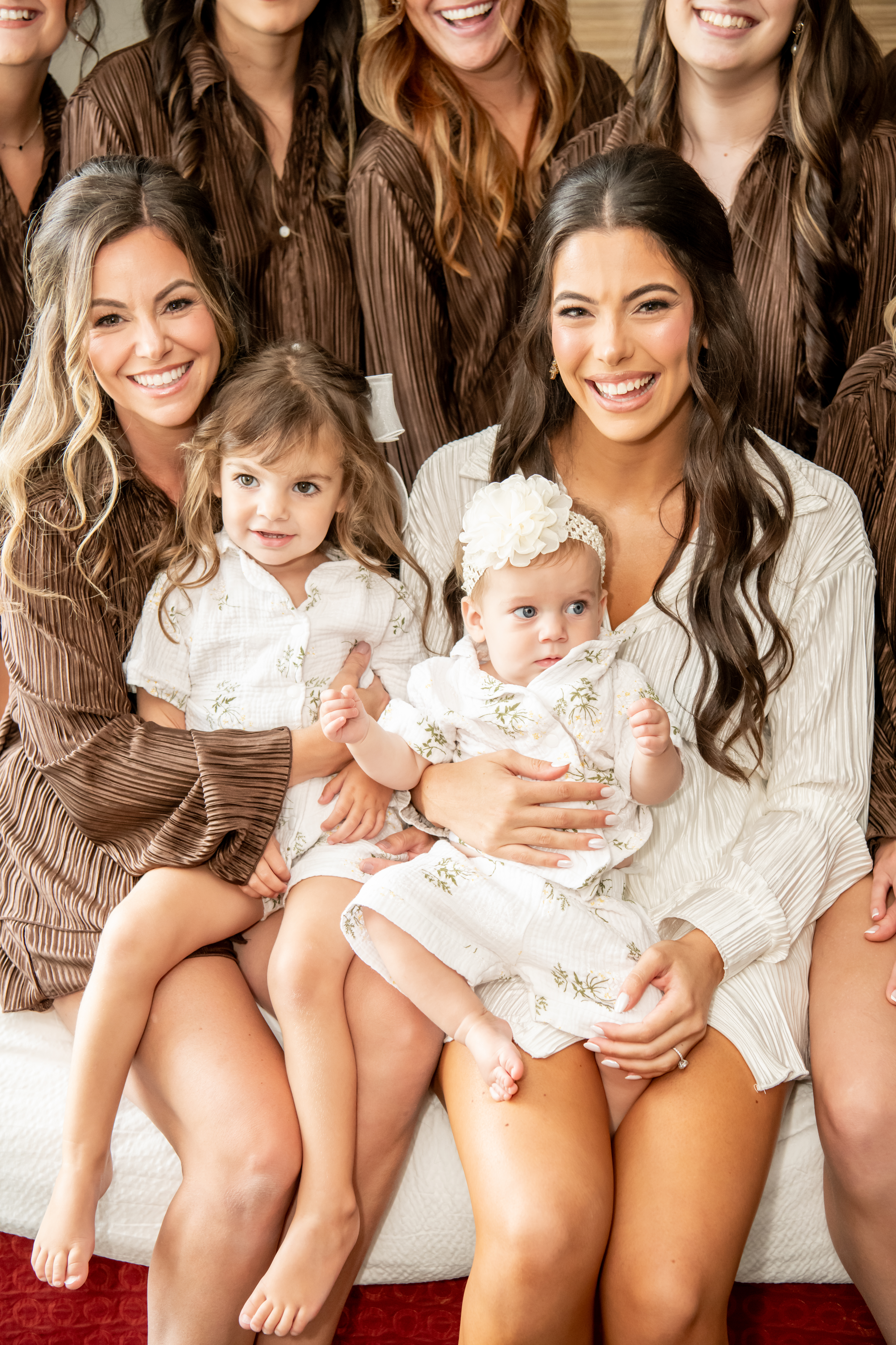 The girls slipped into matching brown satin pajamas and fuzzy slippers while popping champagne, including a custom bottle one of the bridesmaids had made as a gift. Glasses clinked as everyone celebrated Sabrina, and even the flower girls joined in with excitement. The little ones were full of energy, smiling, jumping on the bed, and making everyone laugh.