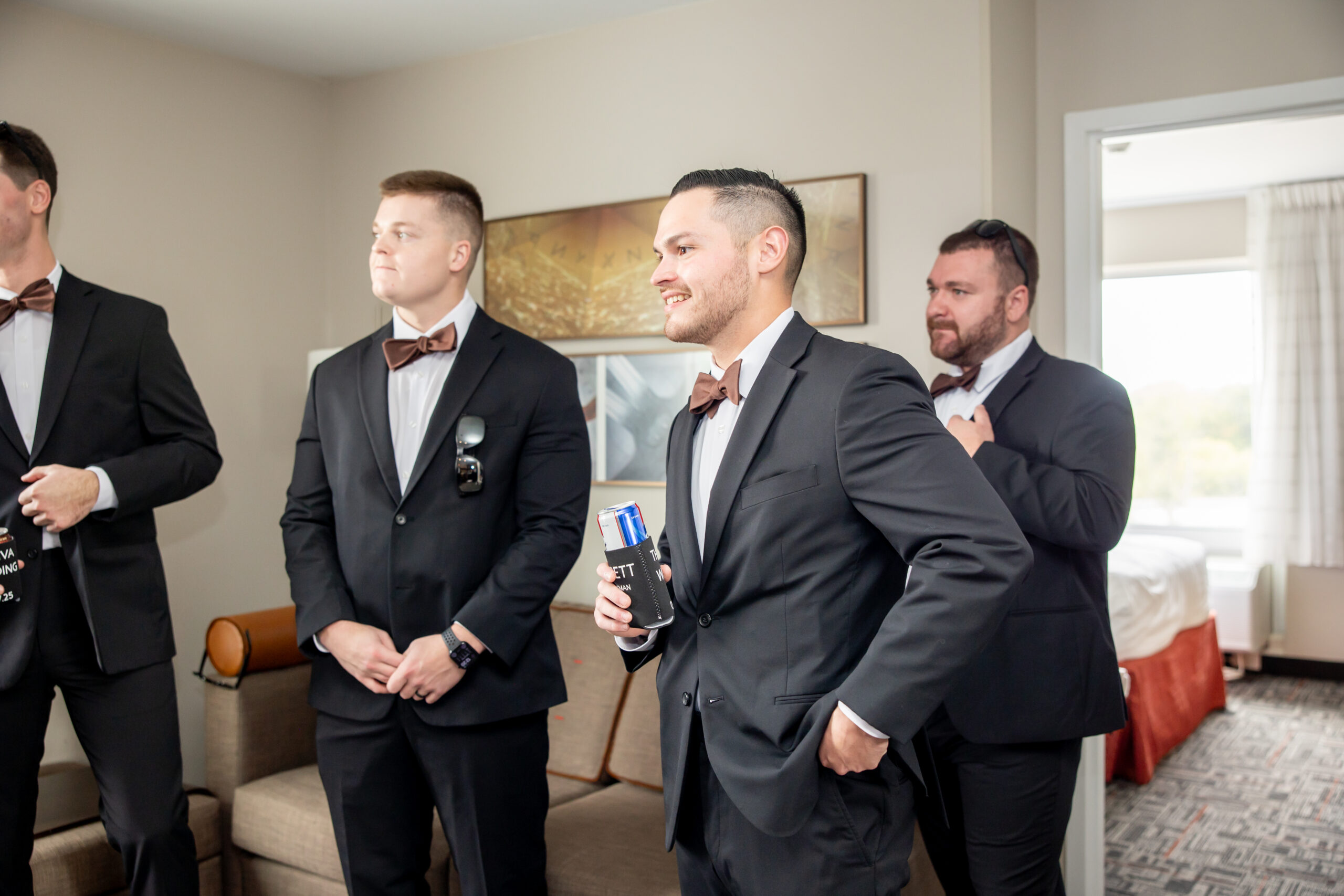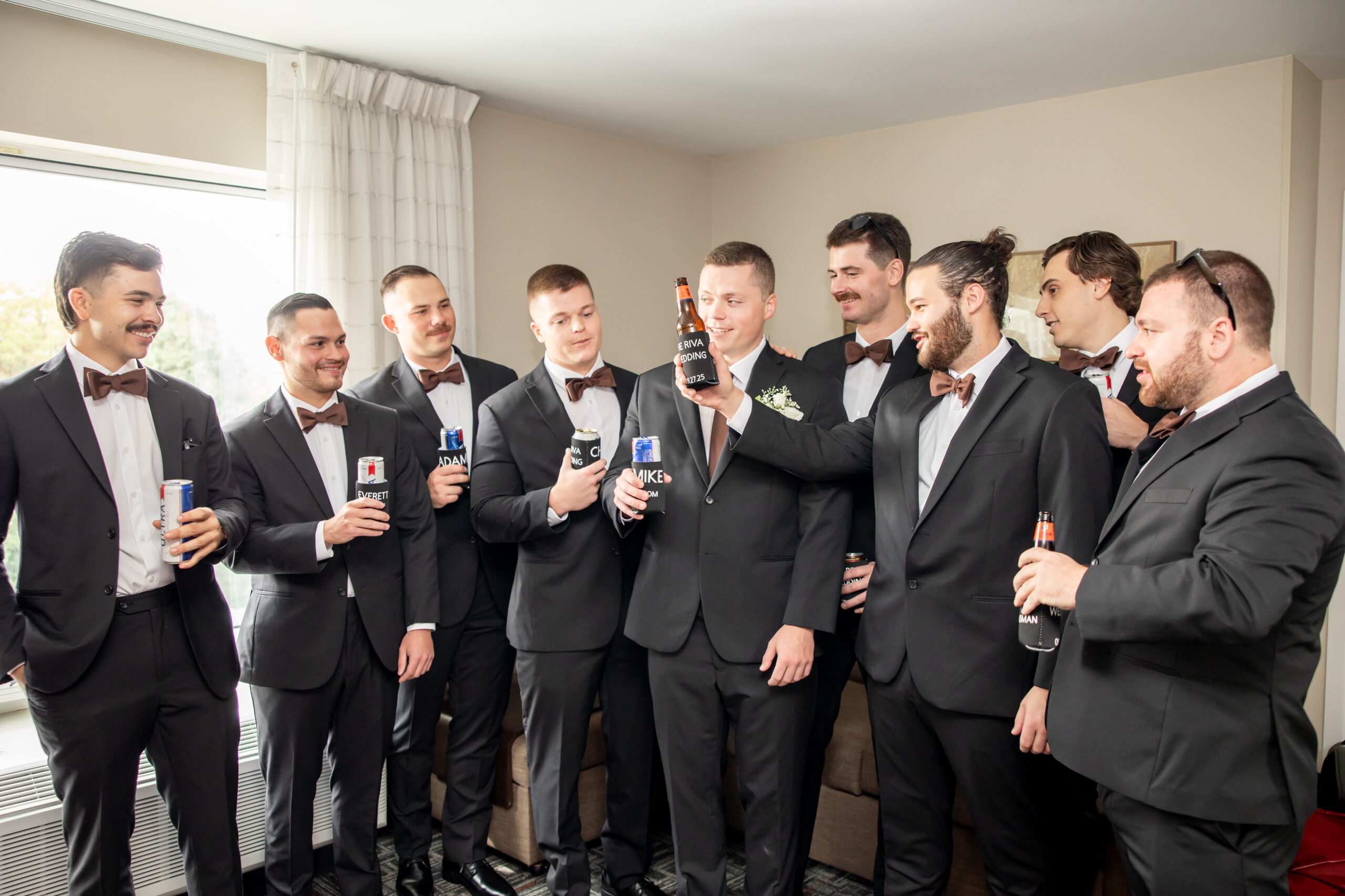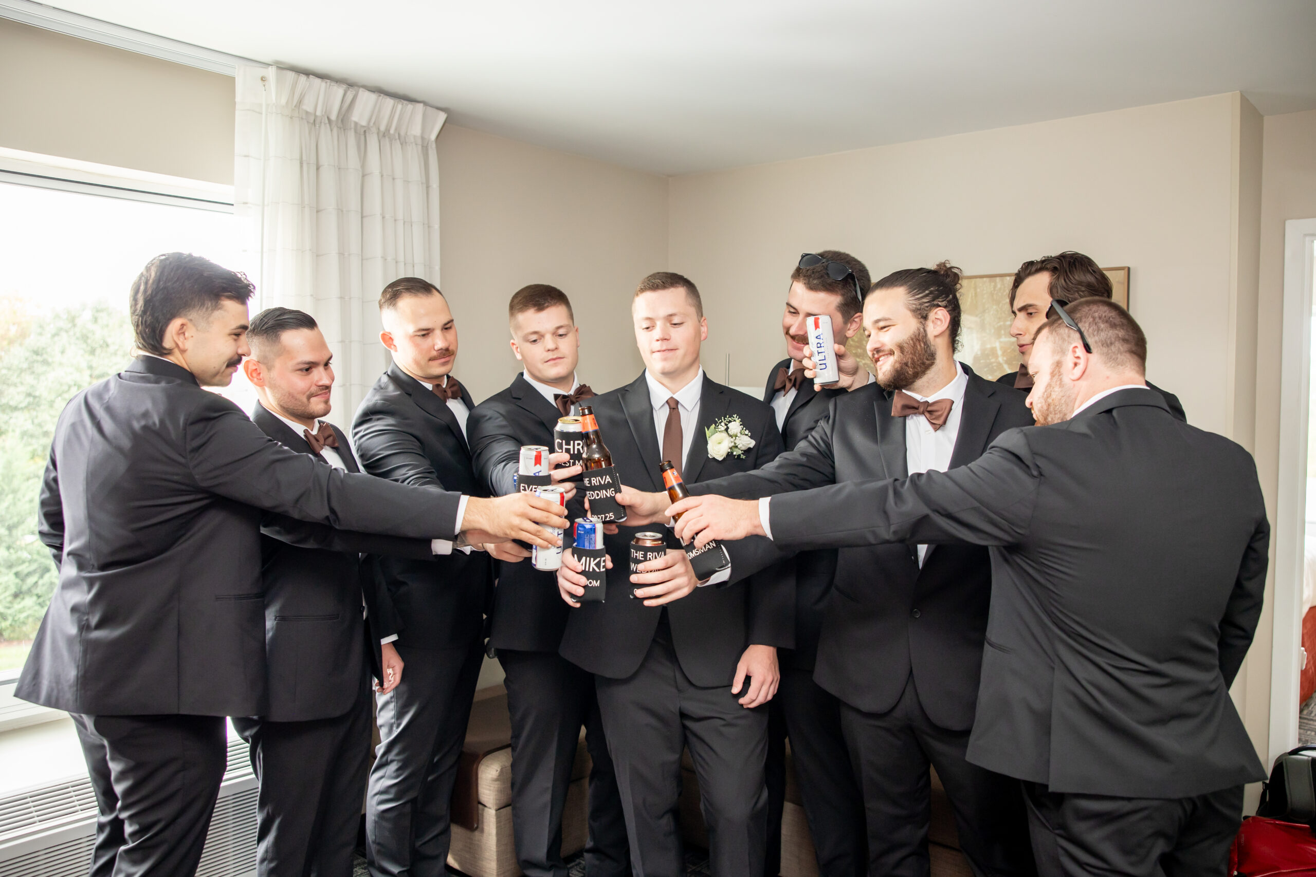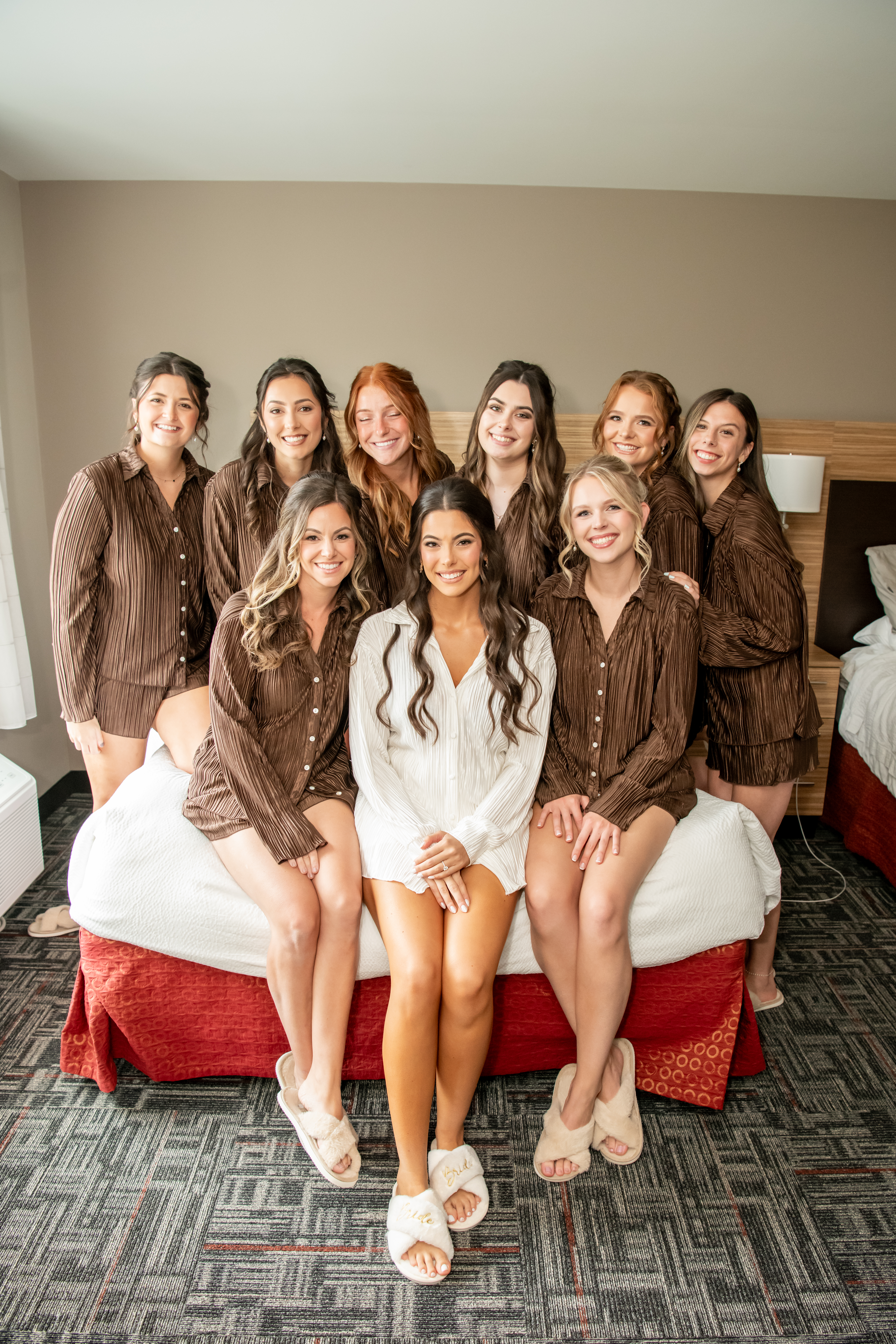 The morning started at the hotel with rooms full of excitement as both sides of the bridal party got ready. I spent the morning with the girls while my second shooter captured the guys, and with nine bridesmaids and nine groomsmen, every space was filled with energy. It felt like a party from the very start.