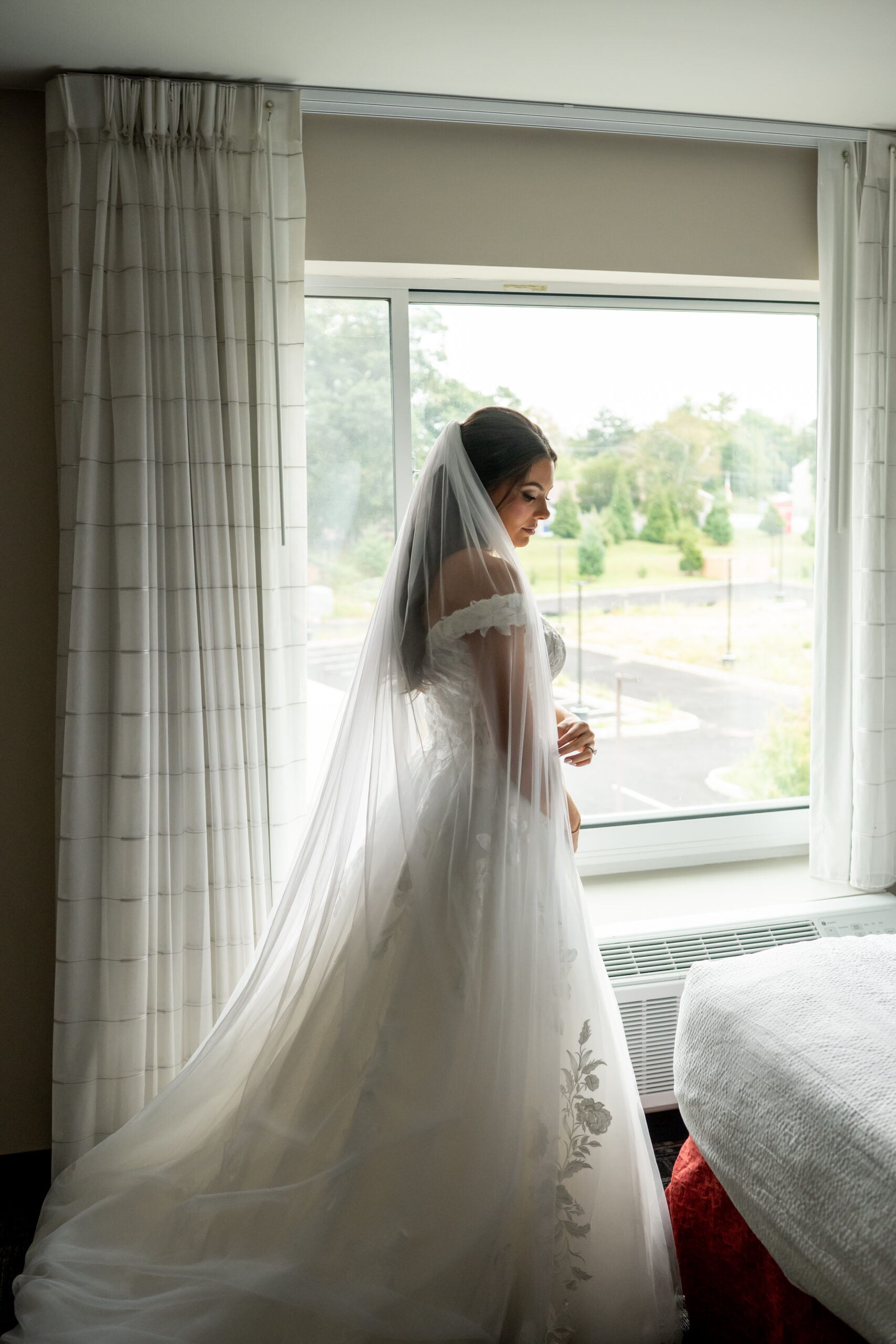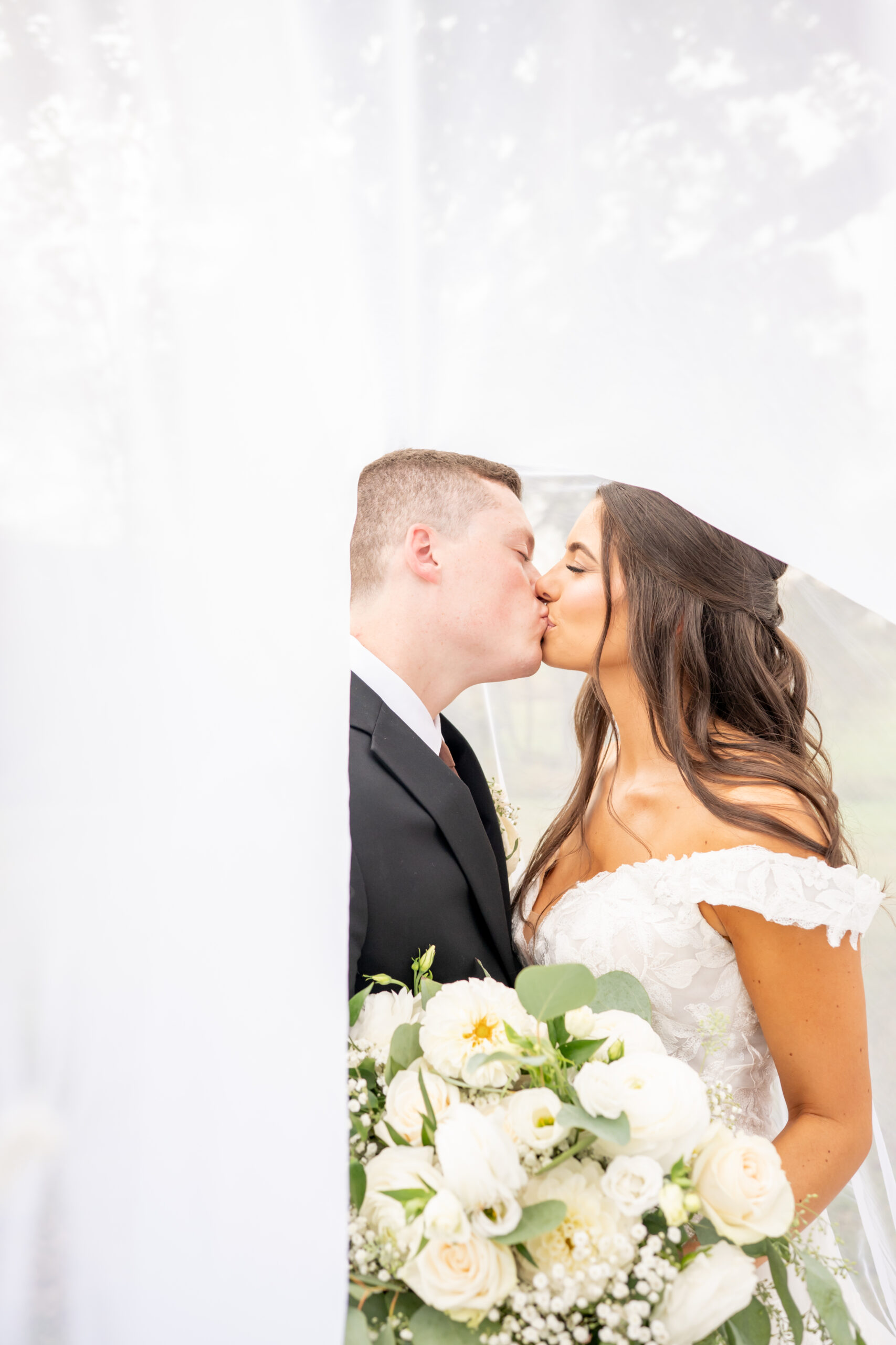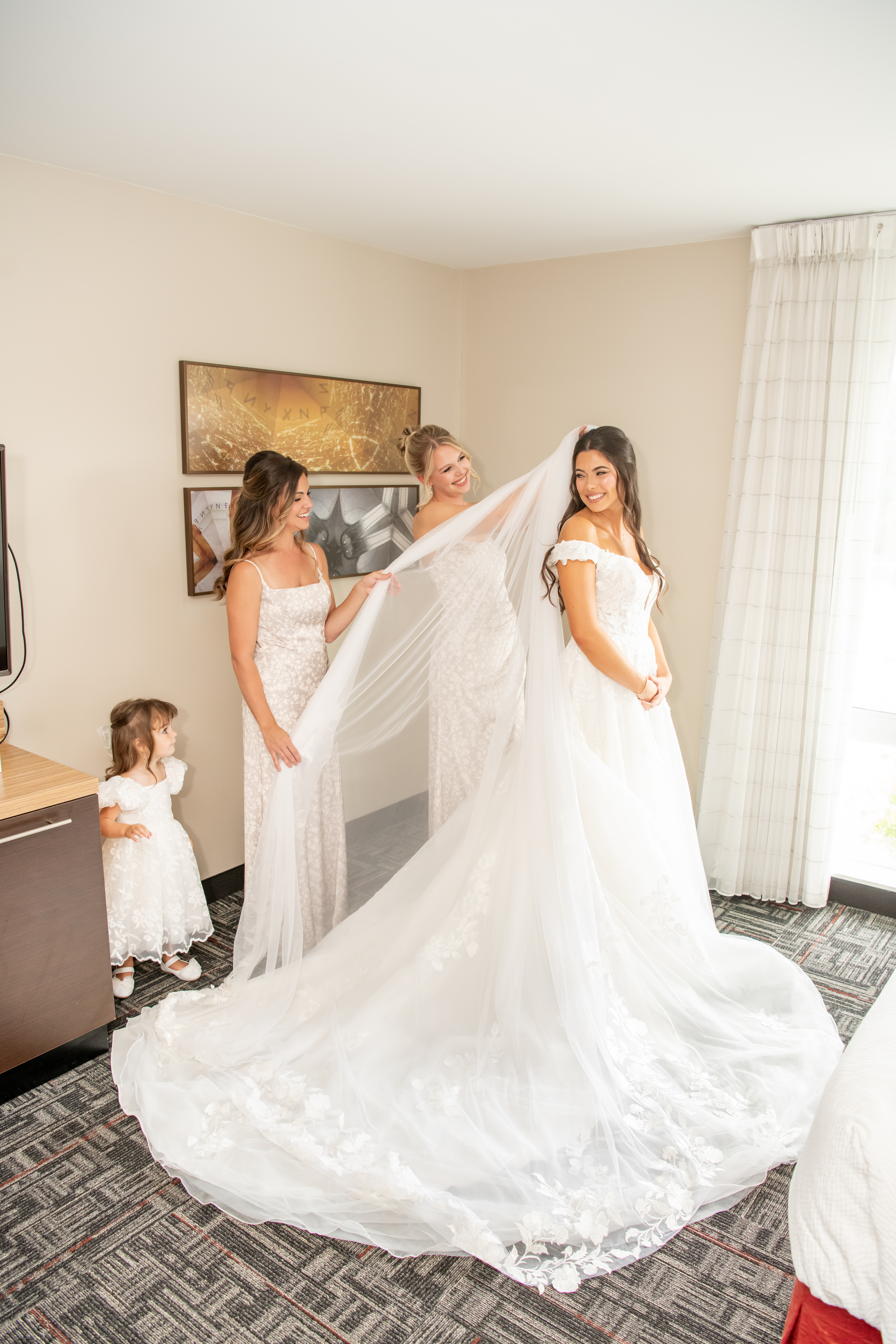 Sabrinaās gown was breathtaking with an off-the-shoulder sweetheart neckline and a floral lace 3D pattern covering the entire dress. The layered chiffon skirt flowed beautifully and led into an extra-long train that felt incredibly romantic. Her simple tulle veil matched the length perfectly and completed the look.