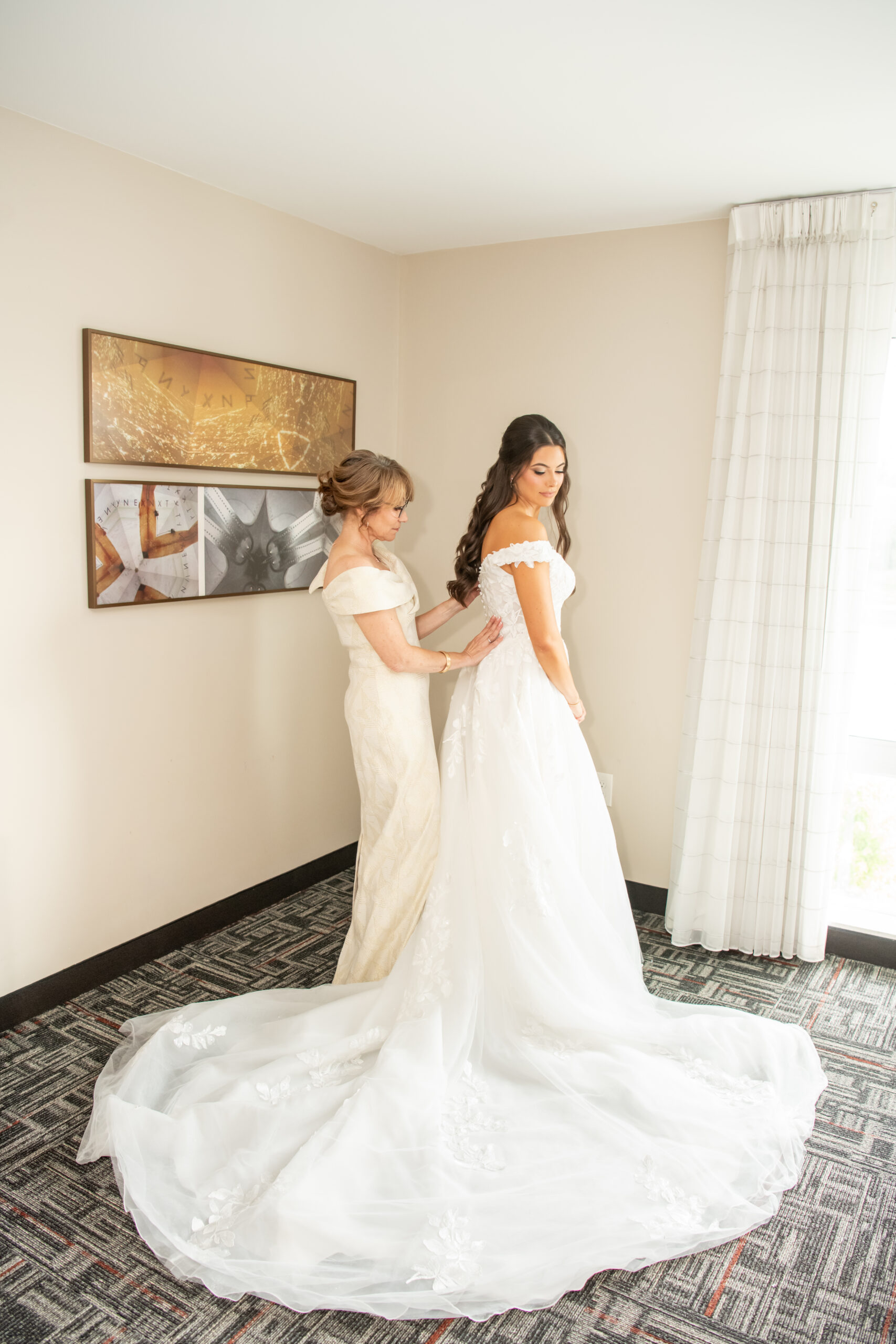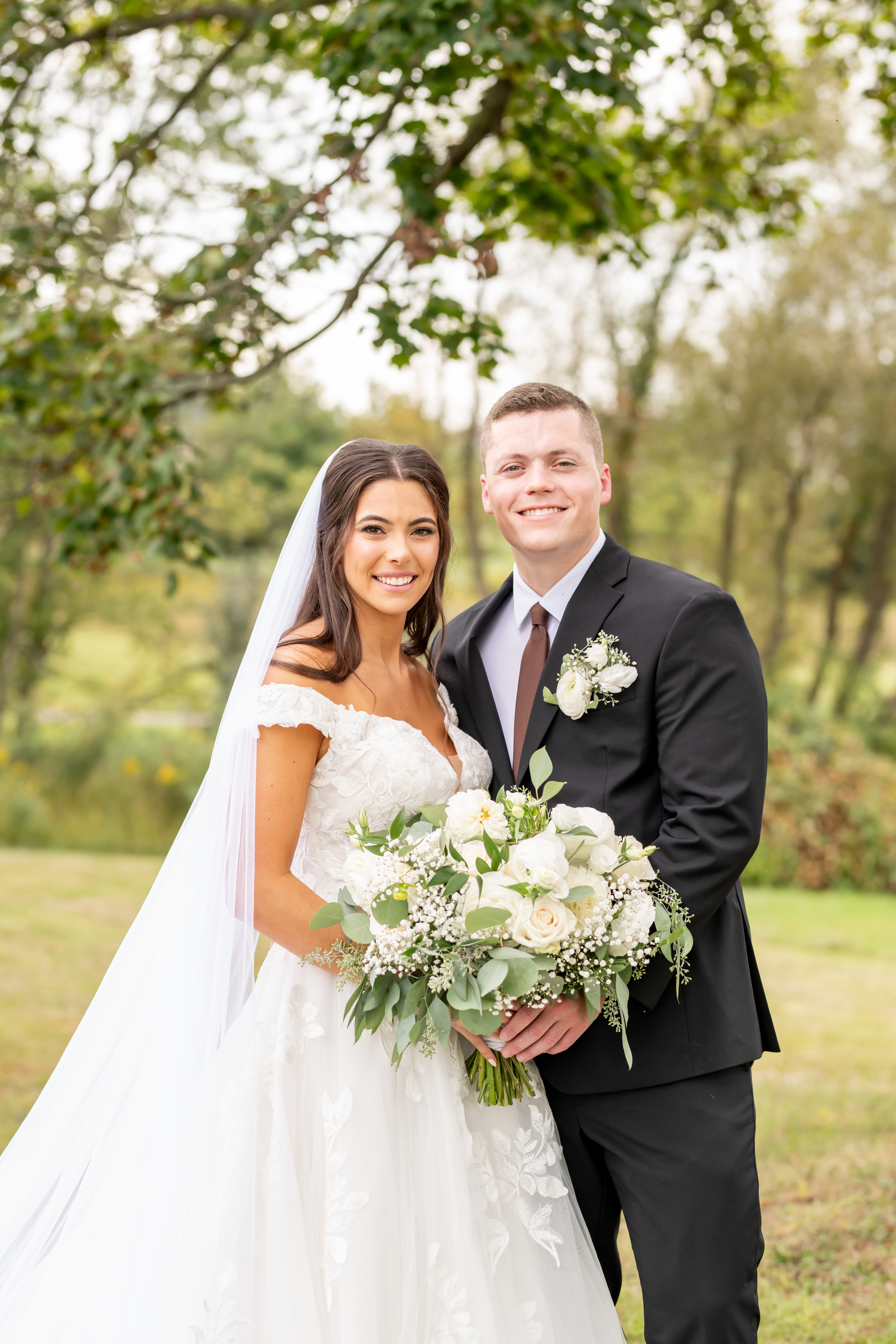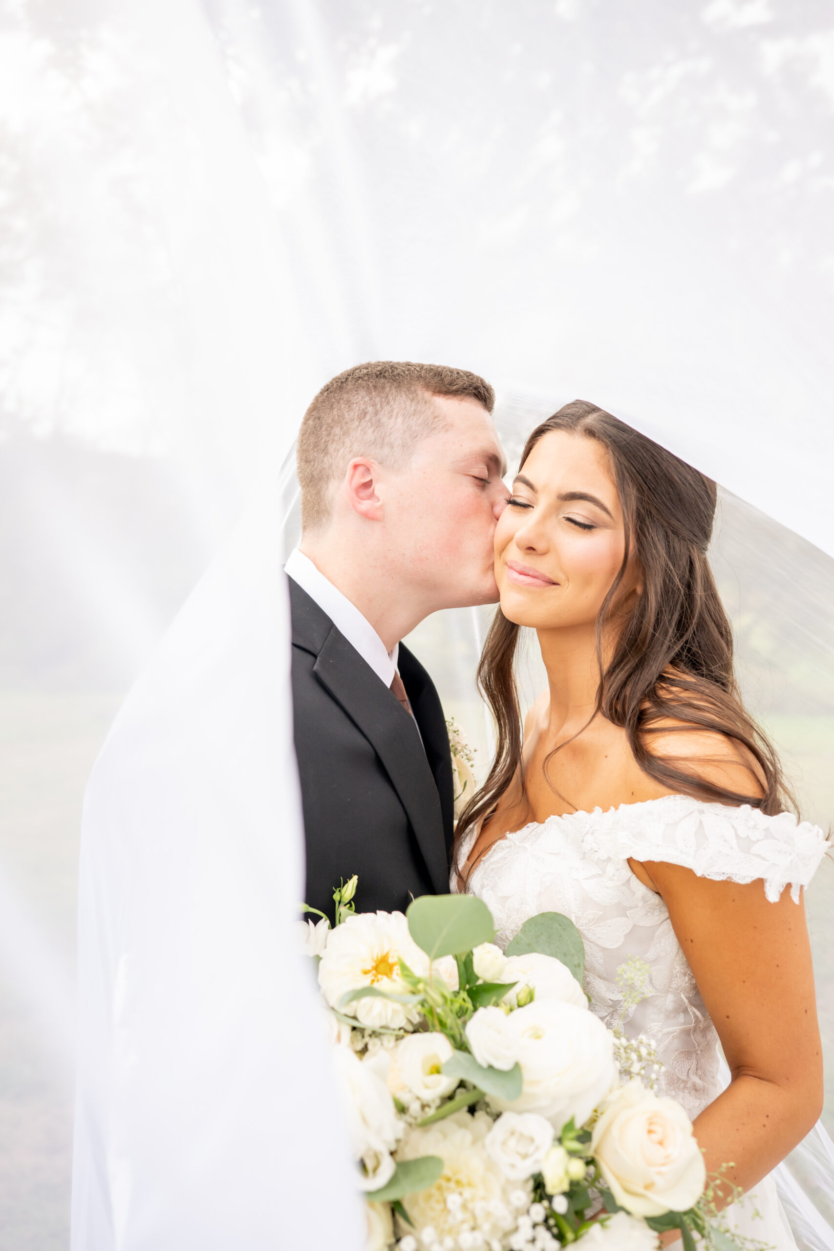 Sabrinaās gown was breathtaking with an off-the-shoulder sweetheart neckline and a floral lace 3D pattern covering the entire dress. The layered chiffon skirt flowed beautifully and led into an extra-long train that felt incredibly romantic. Her simple tulle veil matched the length perfectly and completed the look.