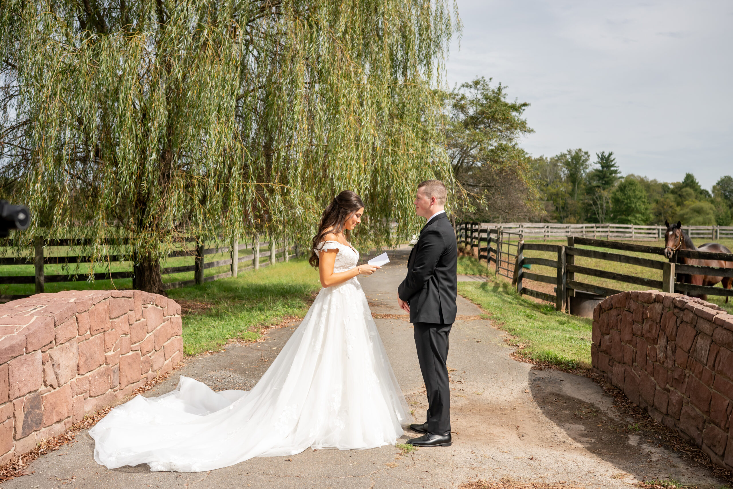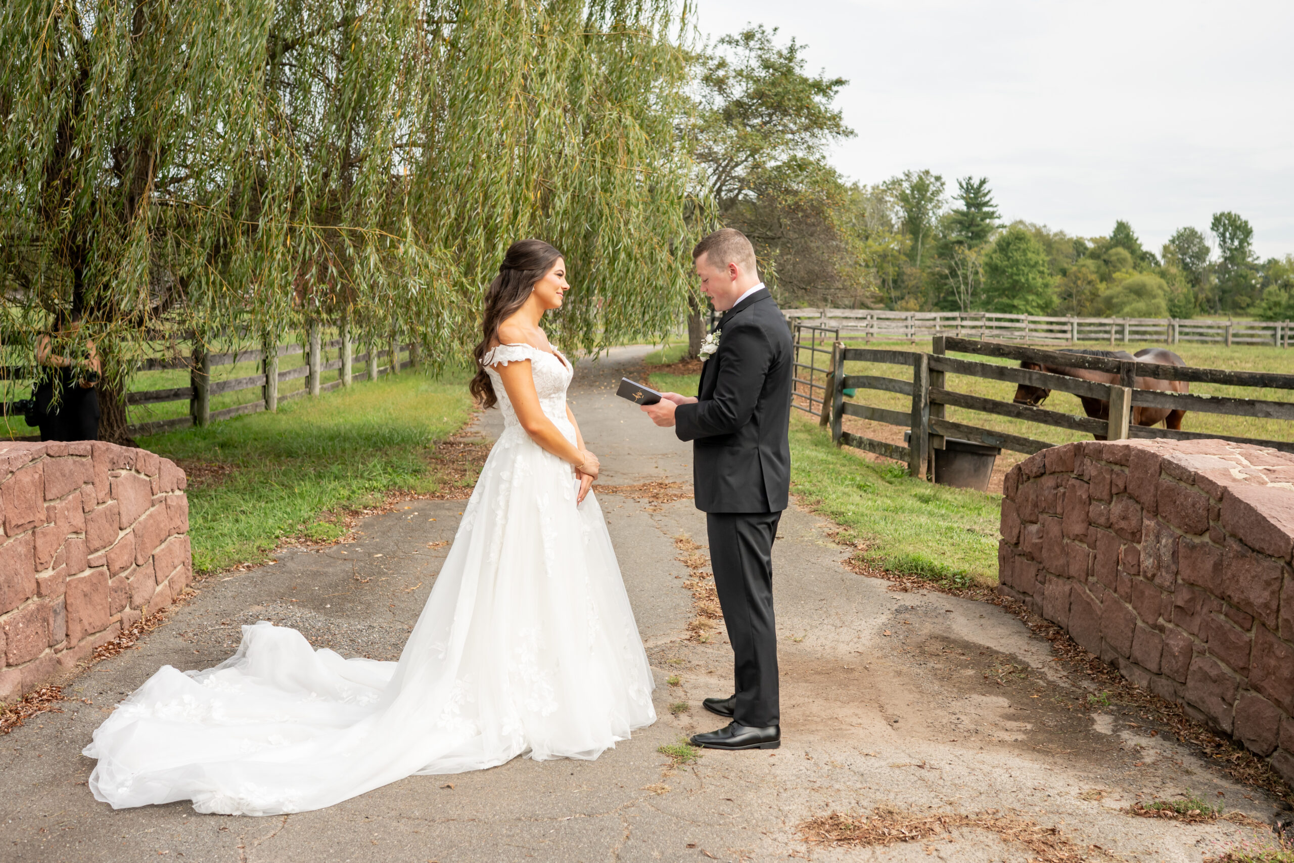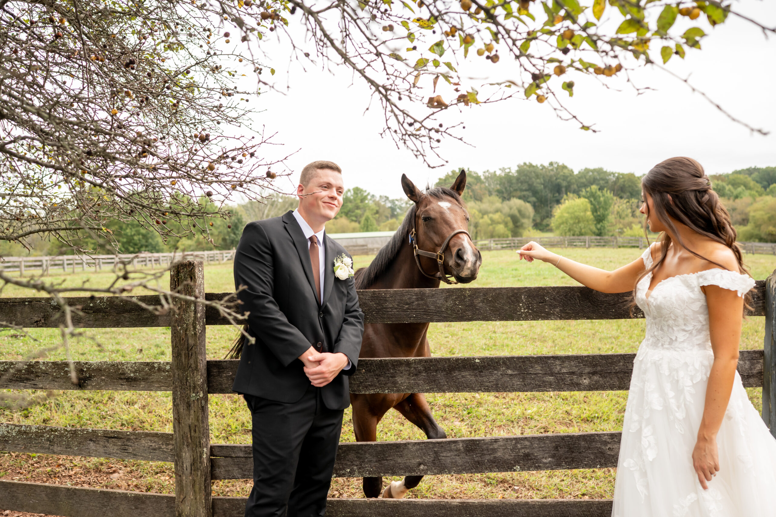 After their vows, we explored the farm grounds for portraits, and every spot felt magical. We even took a few photos with one of the horses, who tried to nibble Mikeās boutonniere right off his jacket, making everyone laugh. It was such a fun and unforgettable moment.