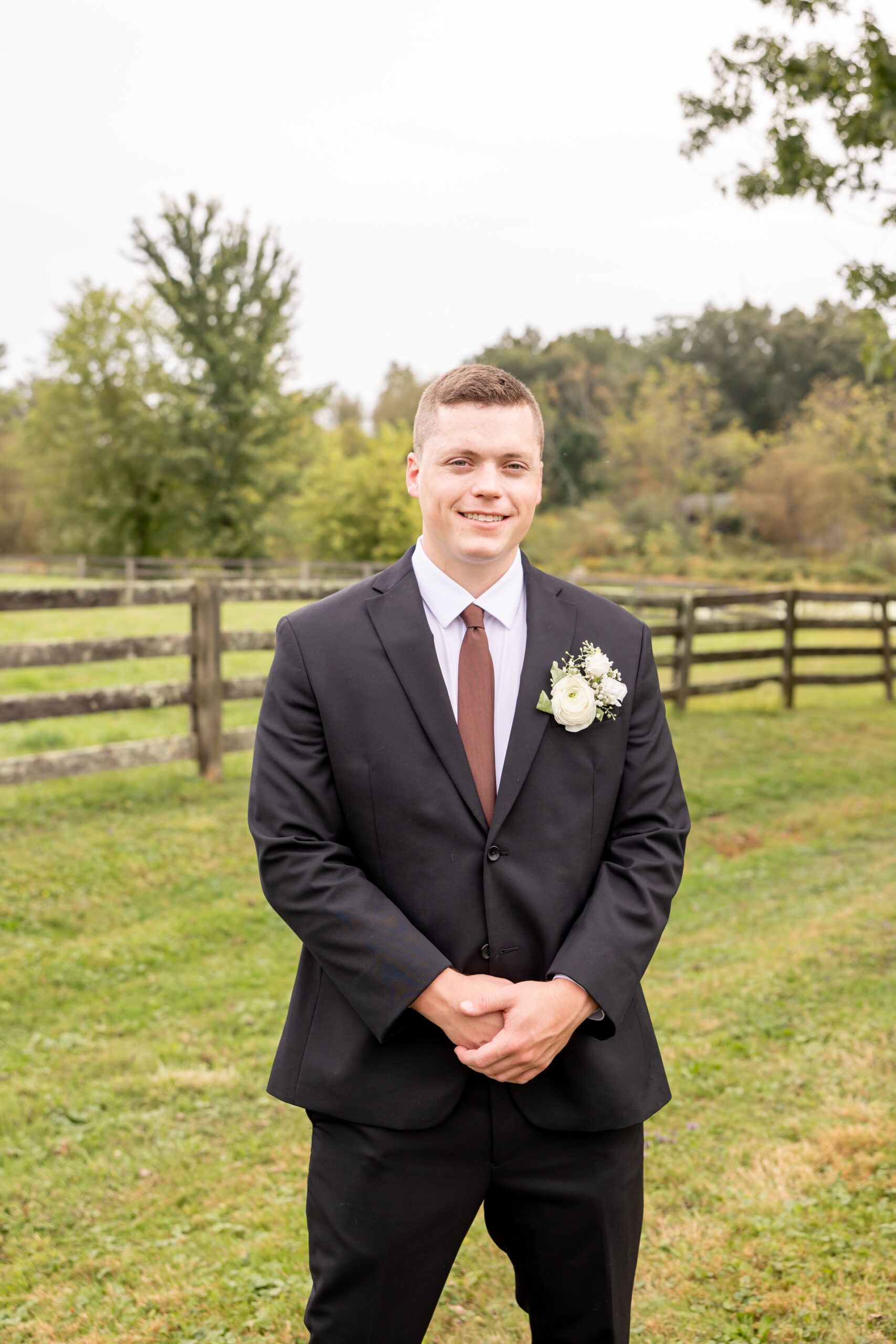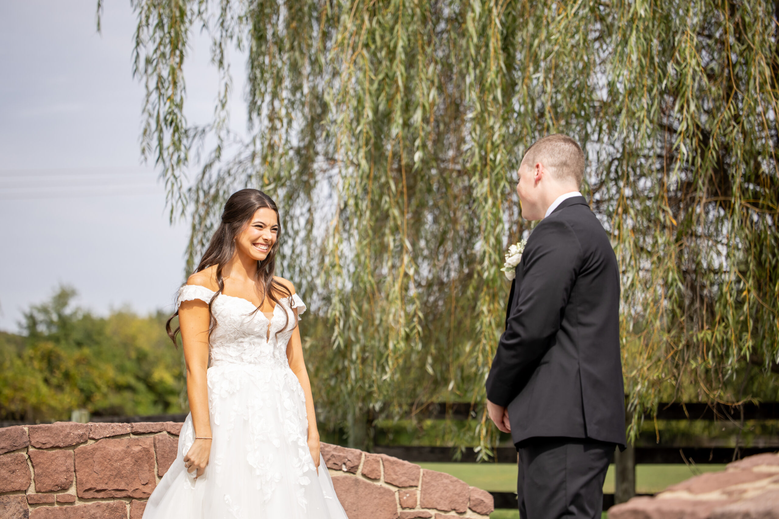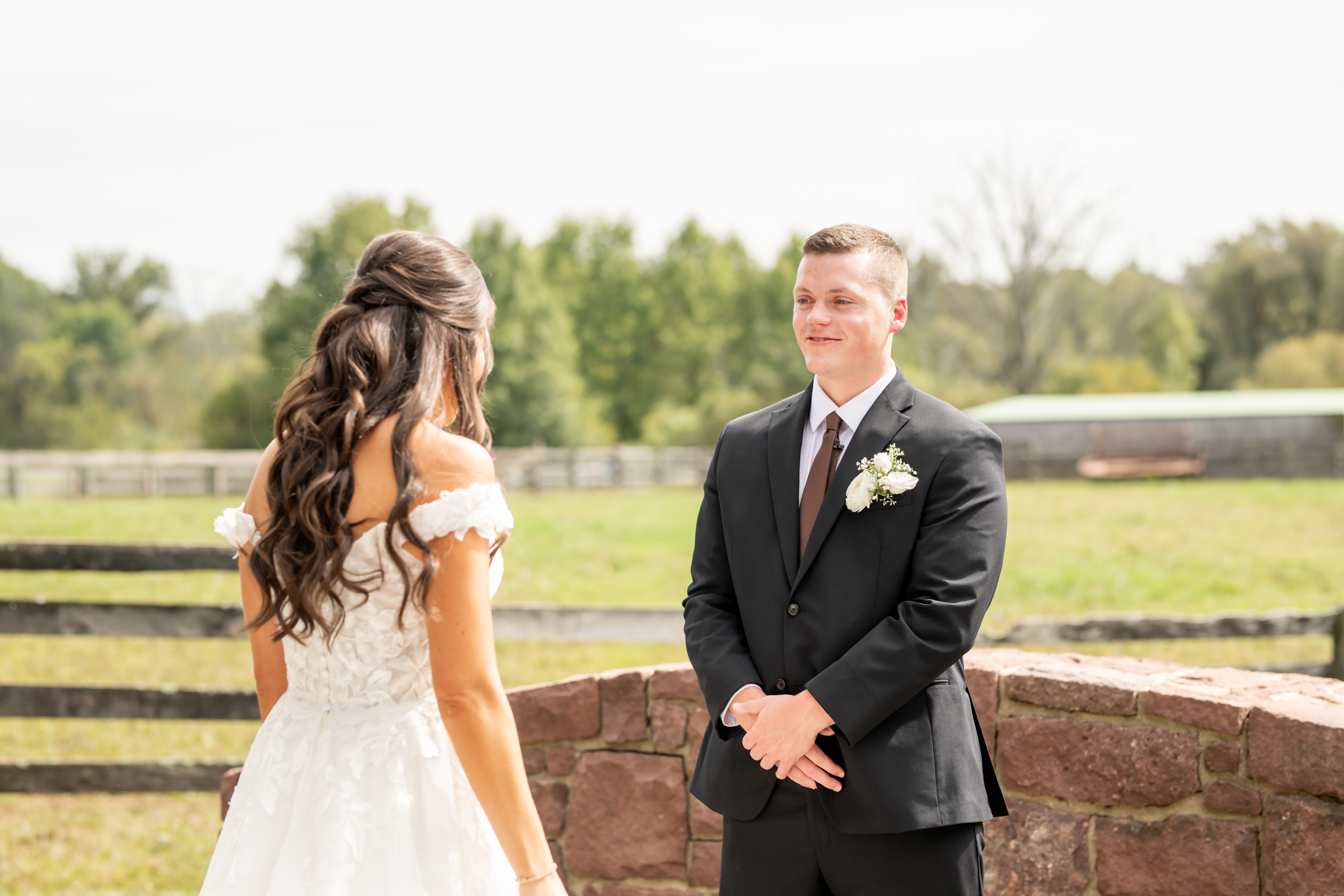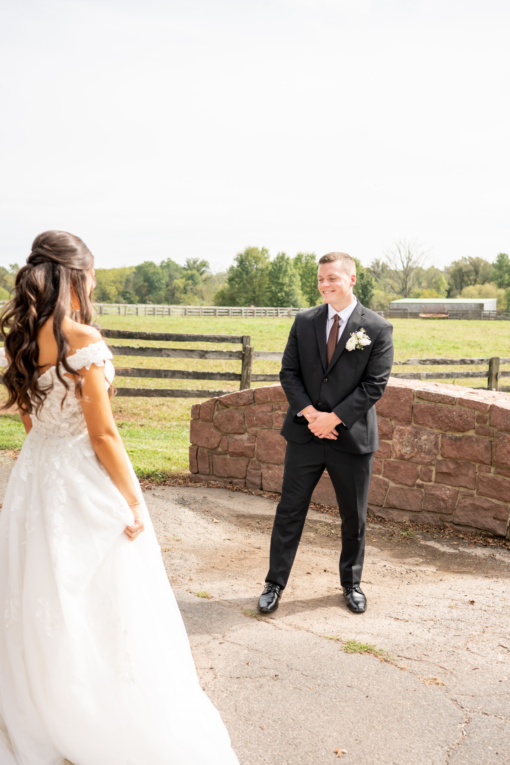 Once everyone was ready, we headed to the venue, the stunning Sterlingbrook Farms. The property is a beautiful historic farm filled with acres of rolling land, large old trees, blooming flowers, and rustic barns. Horses graze nearby, adding so much charm and character to the peaceful countryside setting.