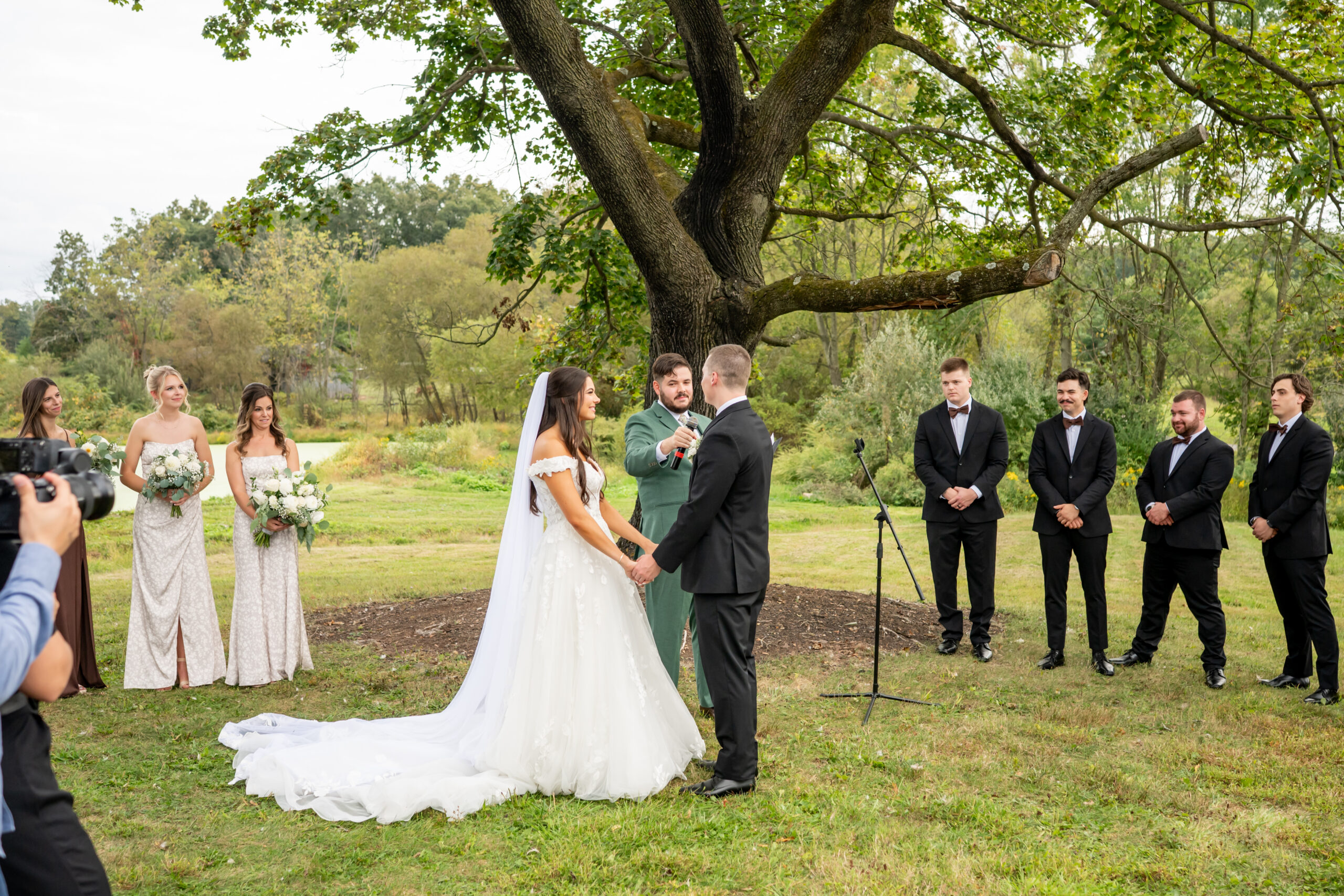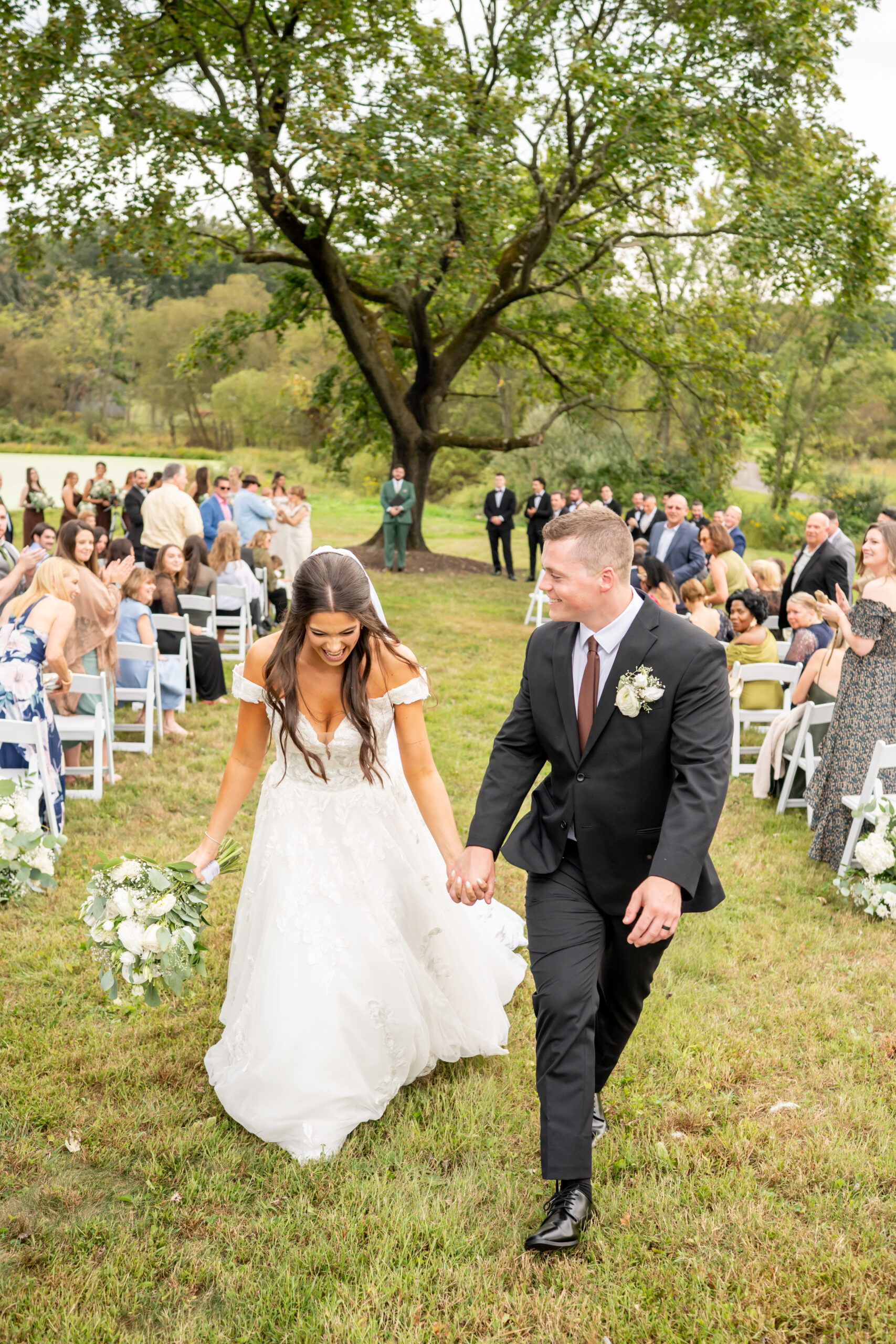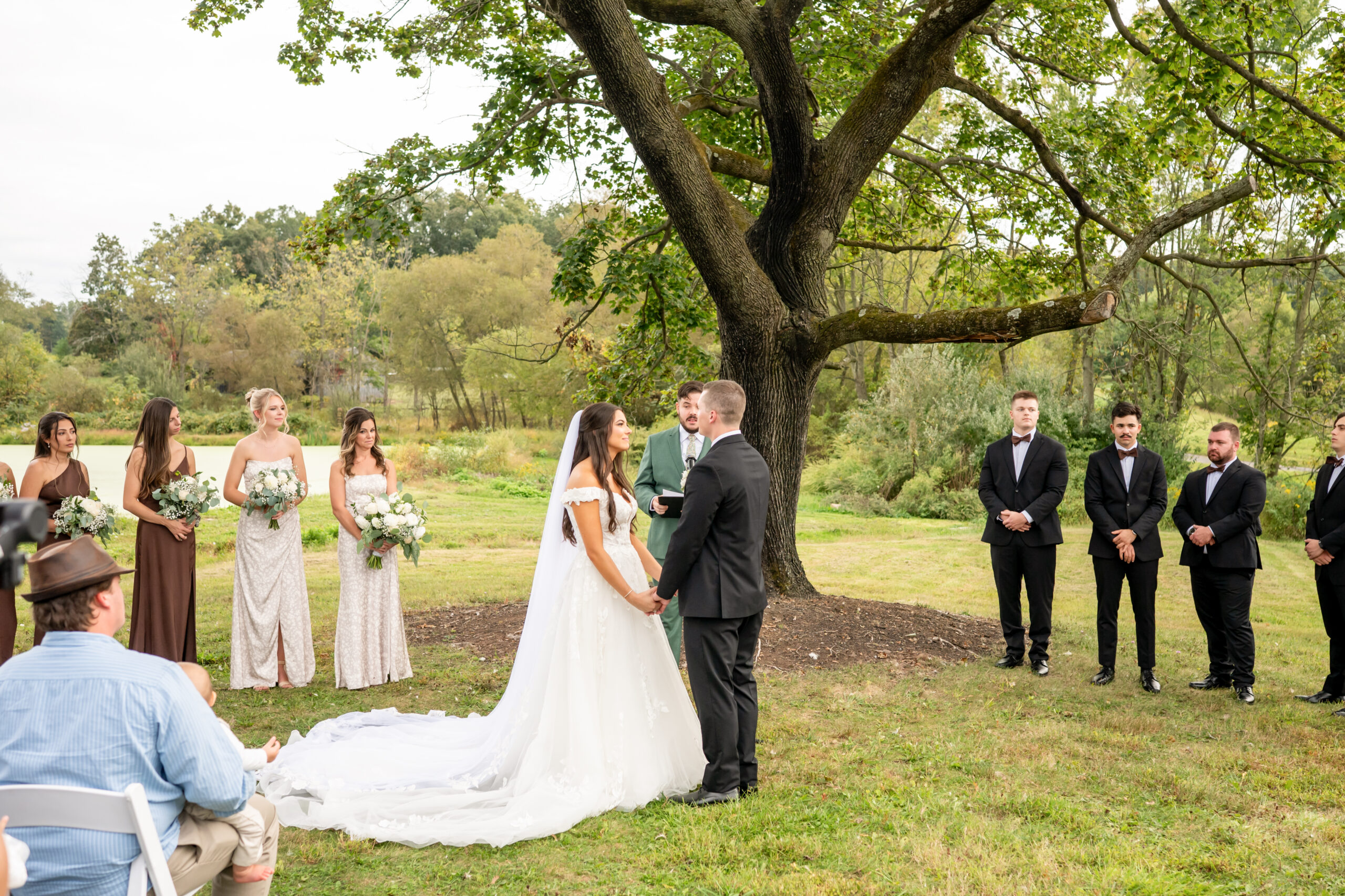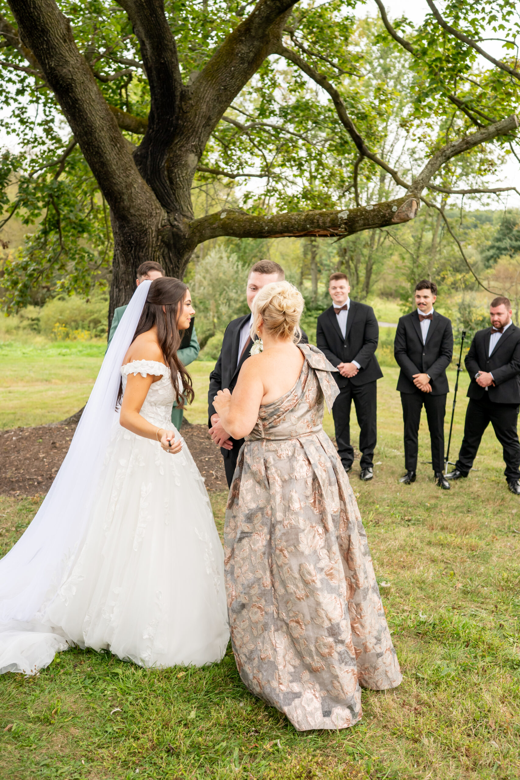 The ceremony took place just outside the barn beneath a huge tree that provided the perfect natural backdrop. Guests watched as the bridal party, flower girls, and ring bearer walked down the aisle, followed by Sabrina with both of her parents. Mike stood waiting proudly for his bride.