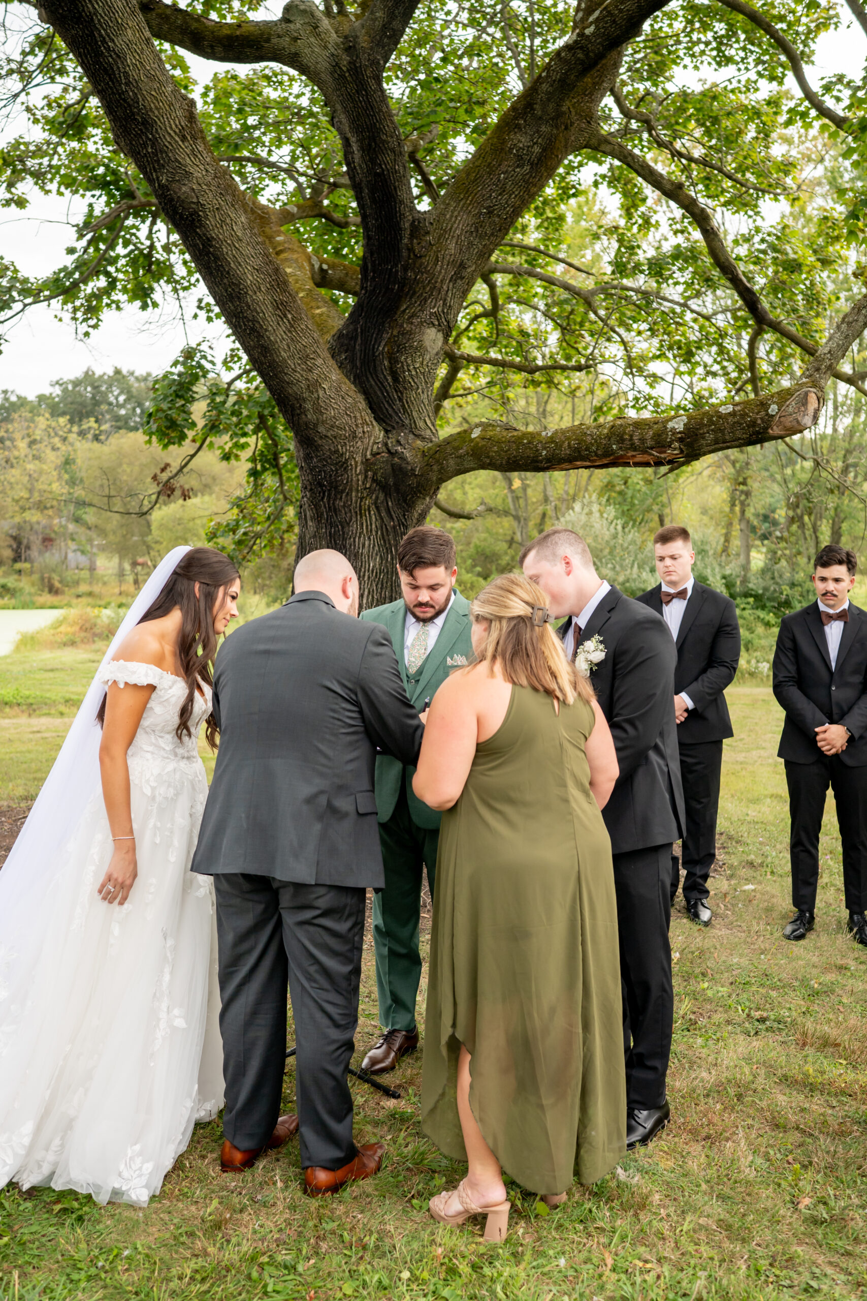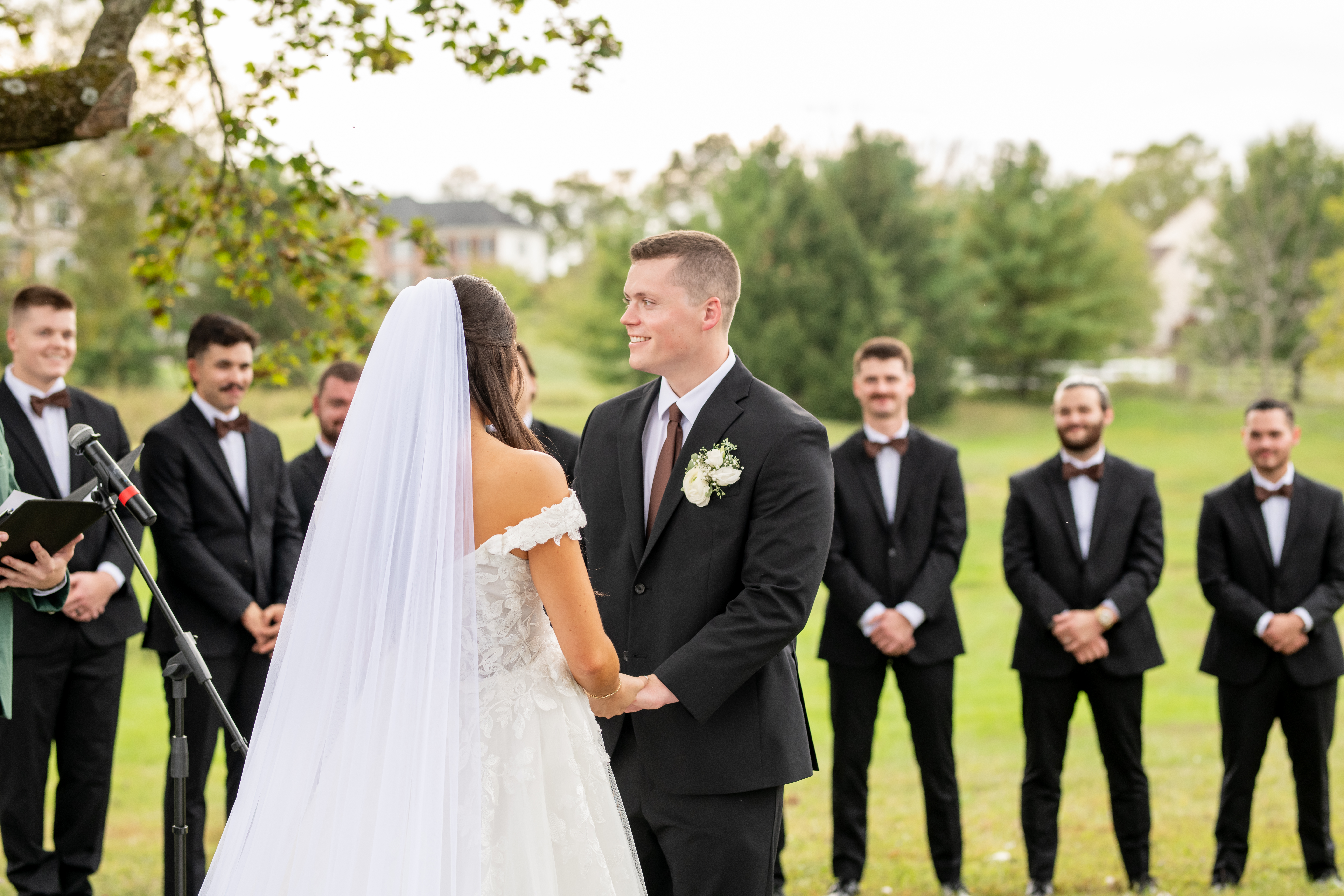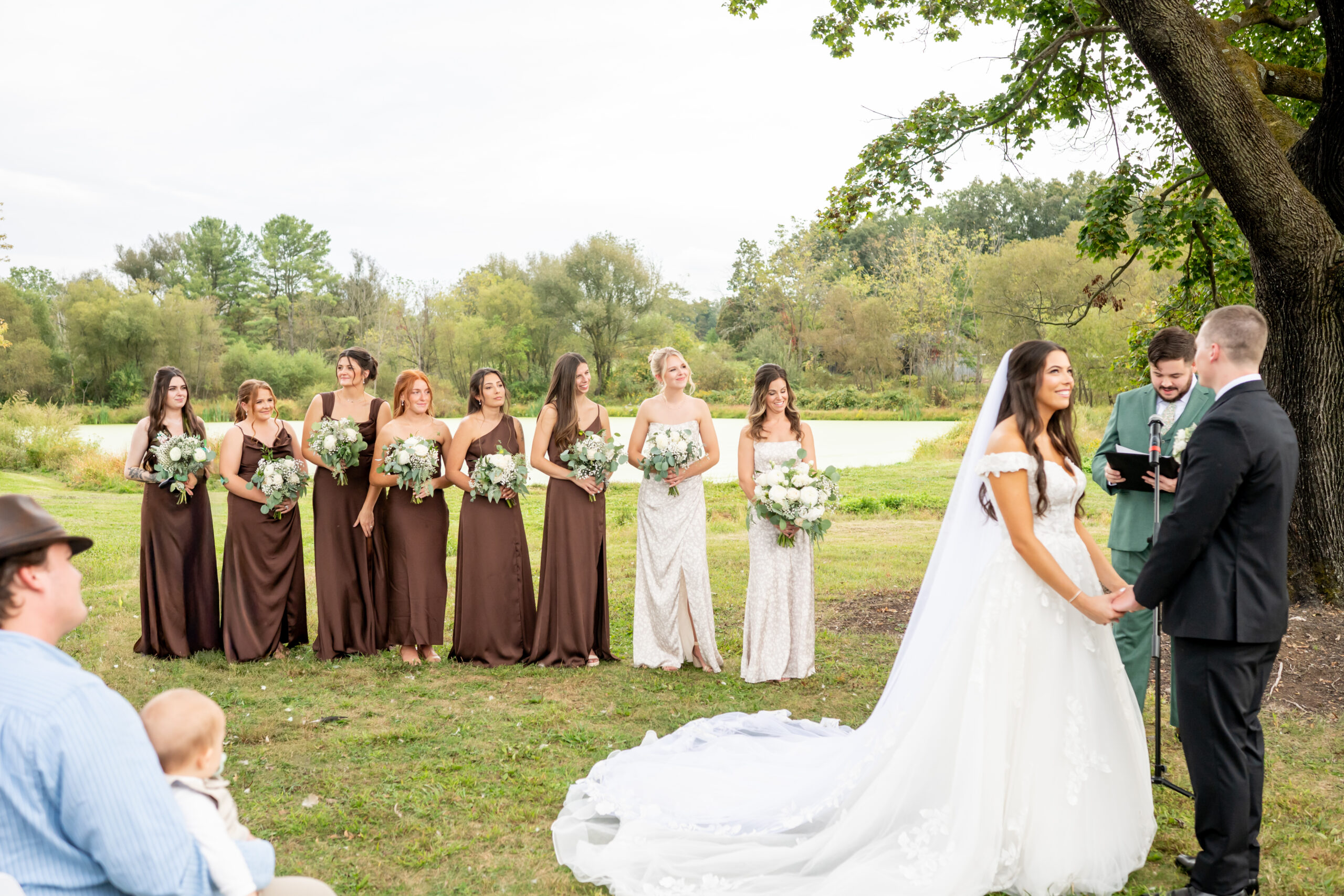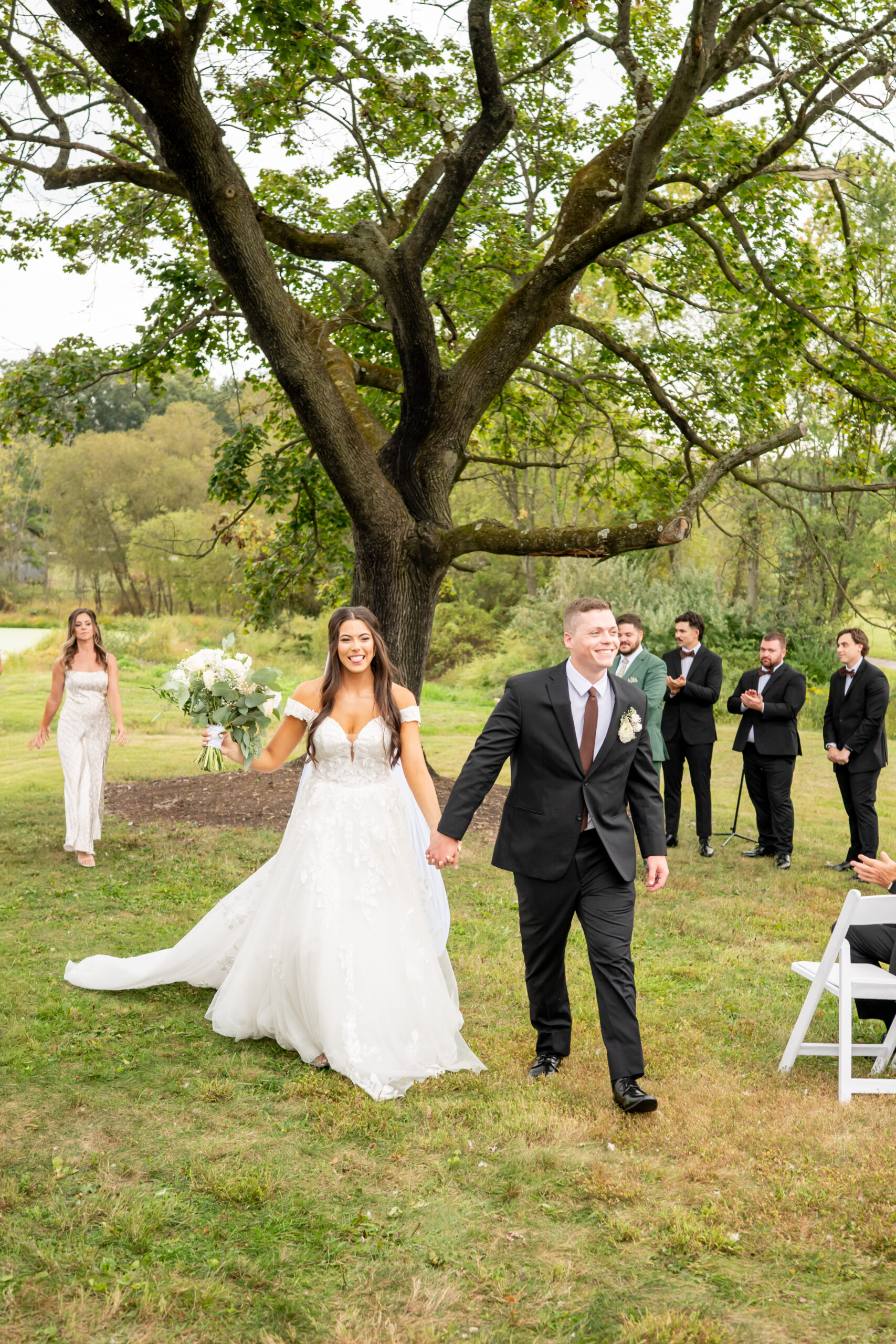 The ceremony took place just outside the barn beneath a huge tree that provided the perfect natural backdrop. Guests watched as the bridal party, flower girls, and ring bearer walked down the aisle, followed by Sabrina with both of her parents. Mike stood waiting proudly for his bride.