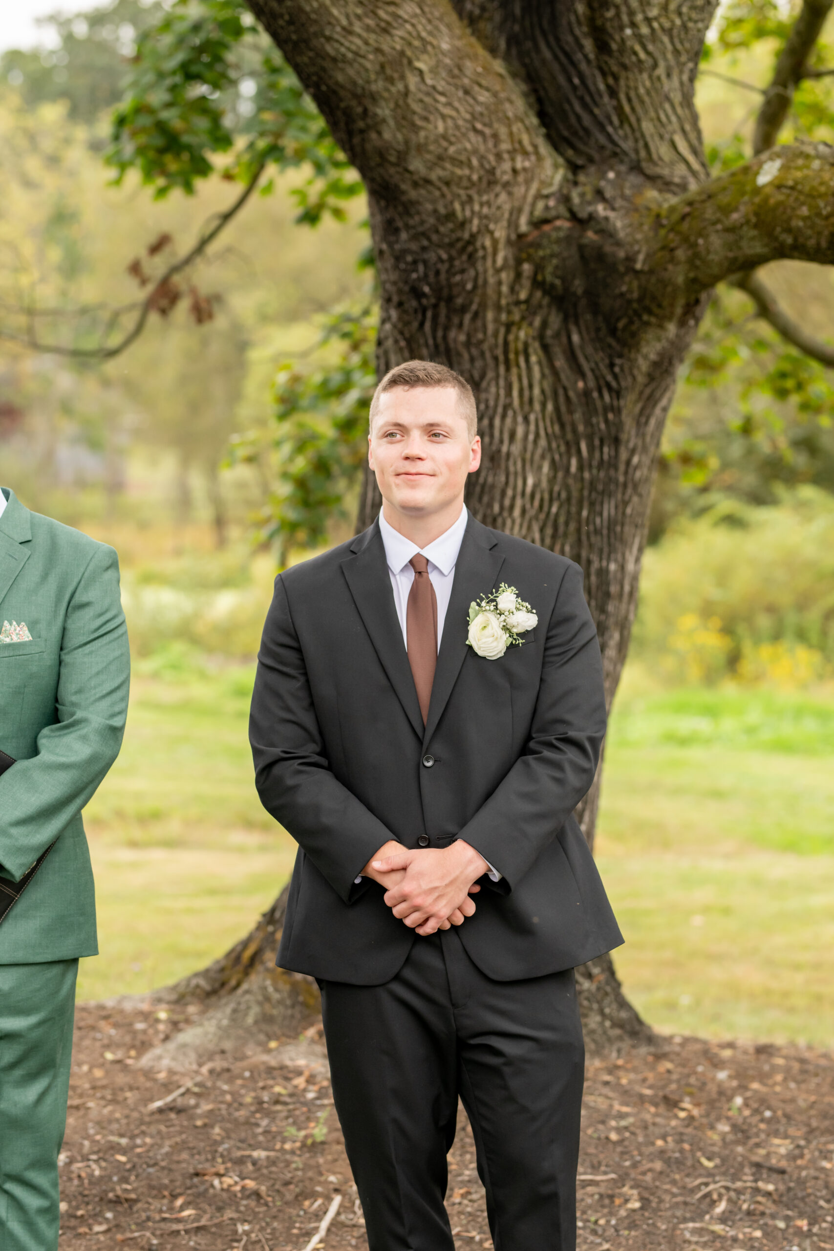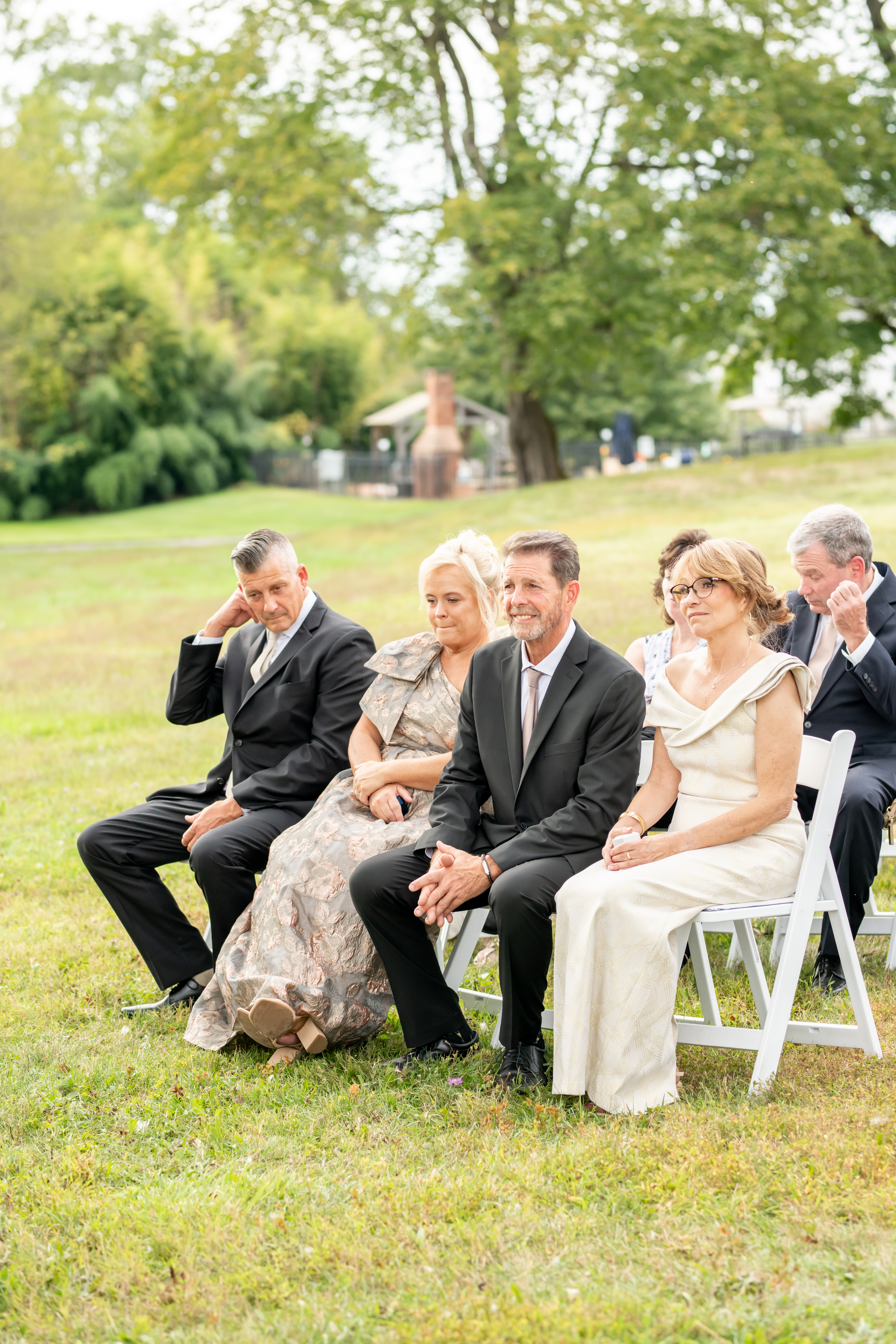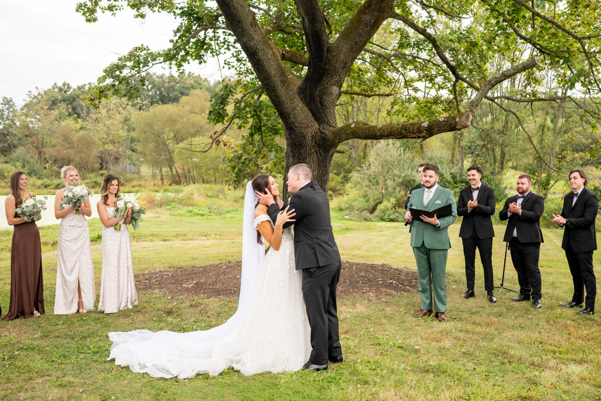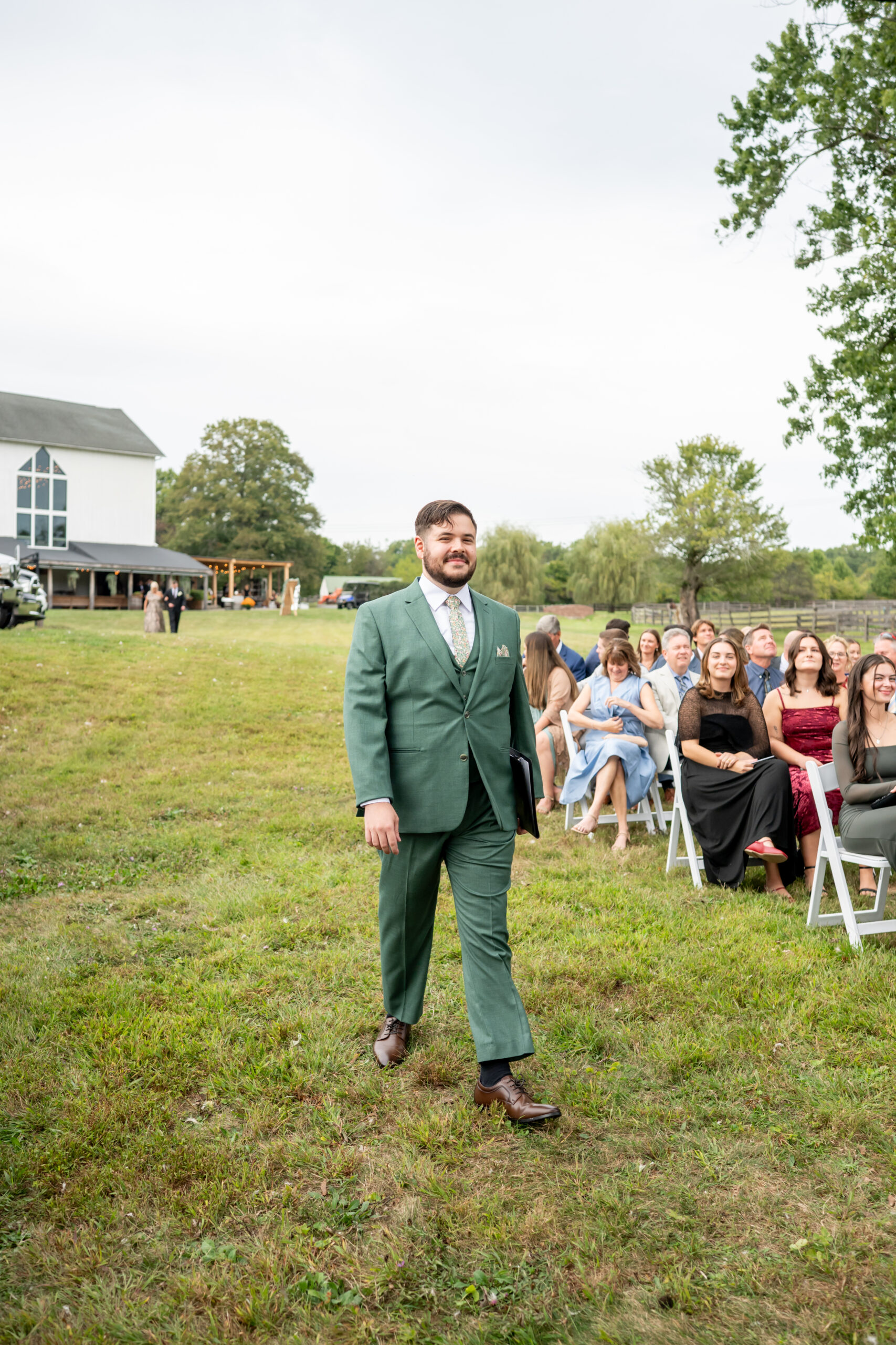 The ceremony took place just outside the barn beneath a huge tree that provided the perfect natural backdrop. Guests watched as the bridal party, flower girls, and ring bearer walked down the aisle, followed by Sabrina with both of her parents. Mike stood waiting proudly for his bride.