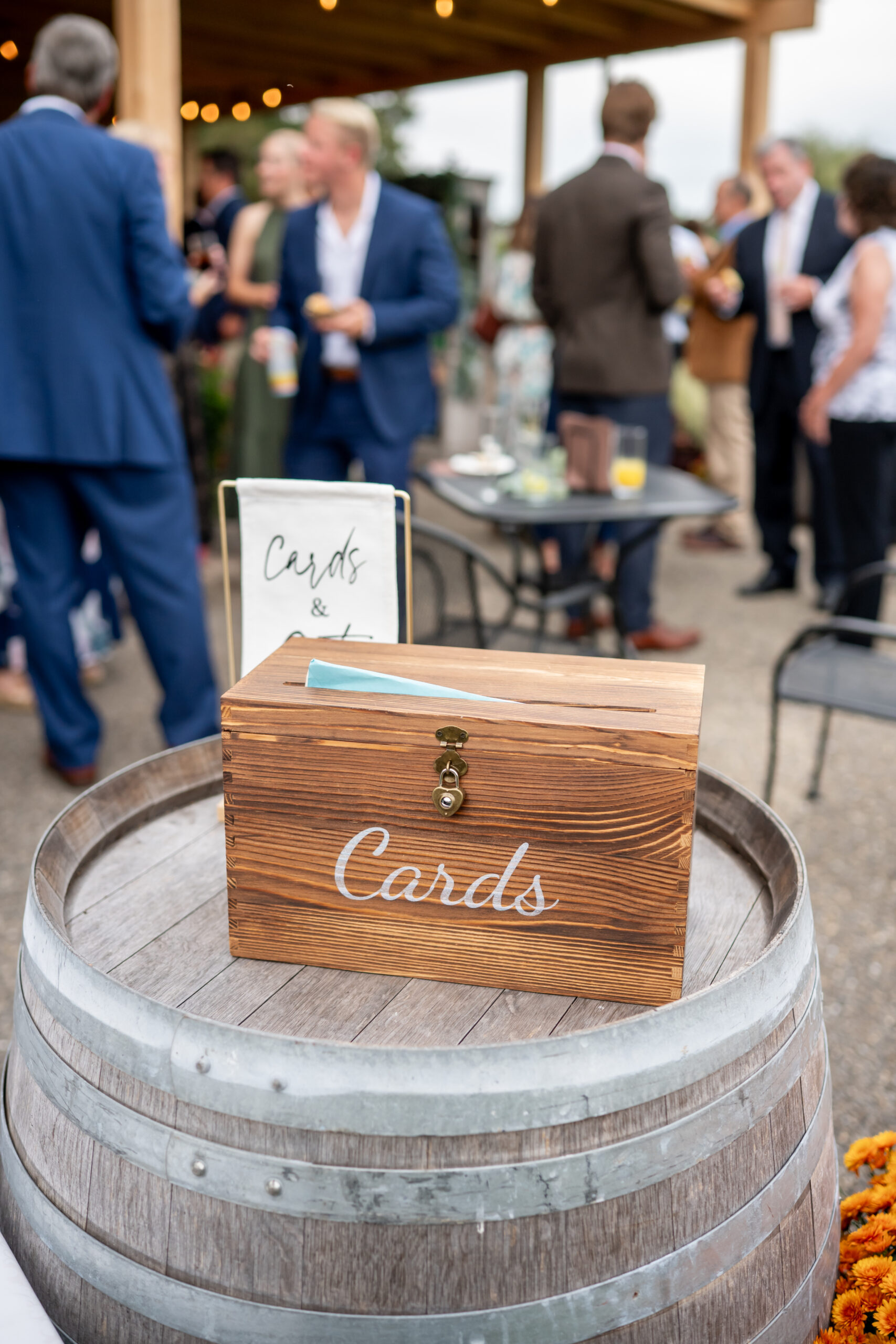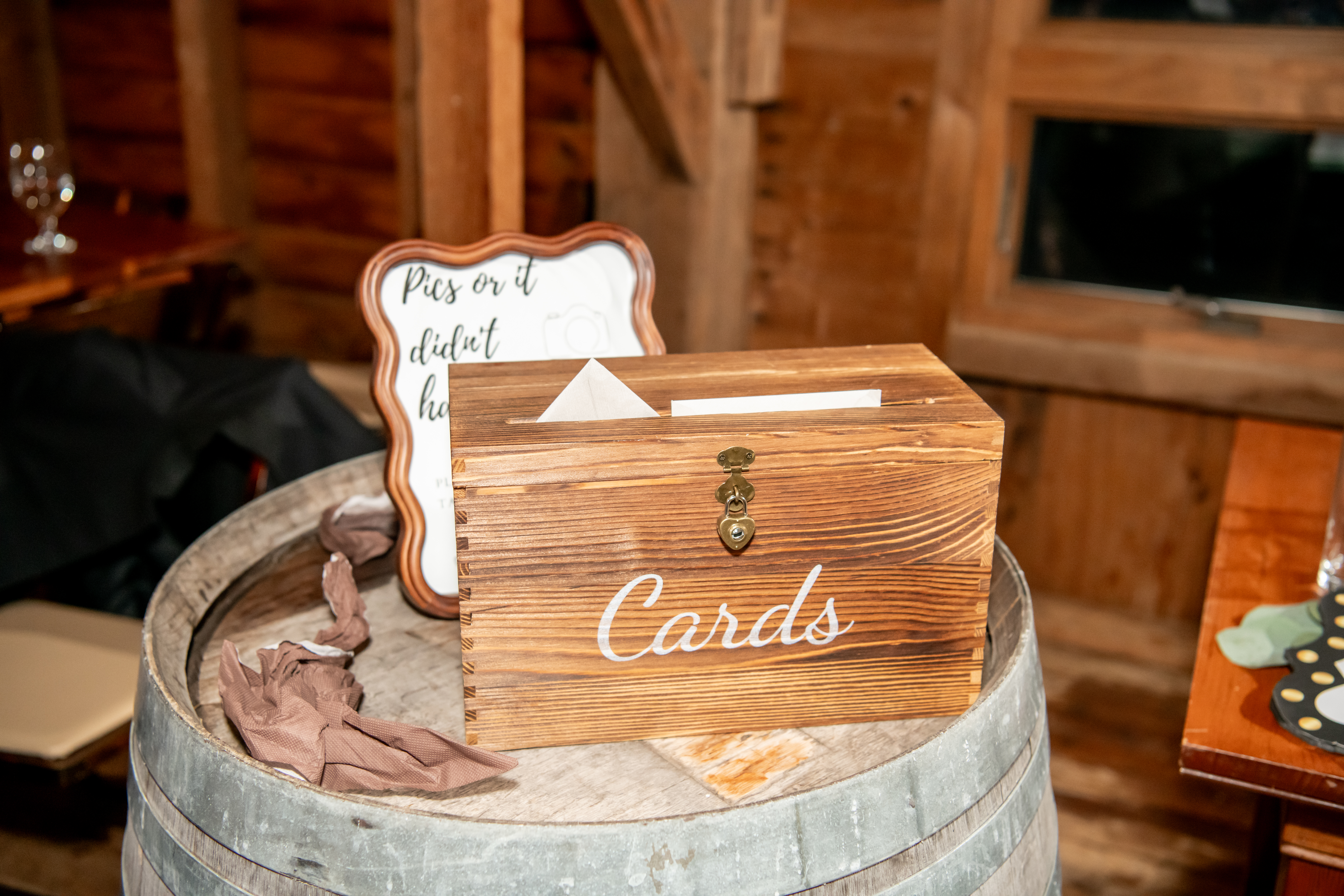 Sabrina and Mikeās invitation suite featured a beautiful illustration of their wedding venue, which instantly tied the entire day together. It was such a lovely personal touch that reflected the rustic charm of their celebration. They also included a gifted wooden box from Sabrinaās bridal shower engraved with their names and wedding date, which added even more warmth and sentiment.
