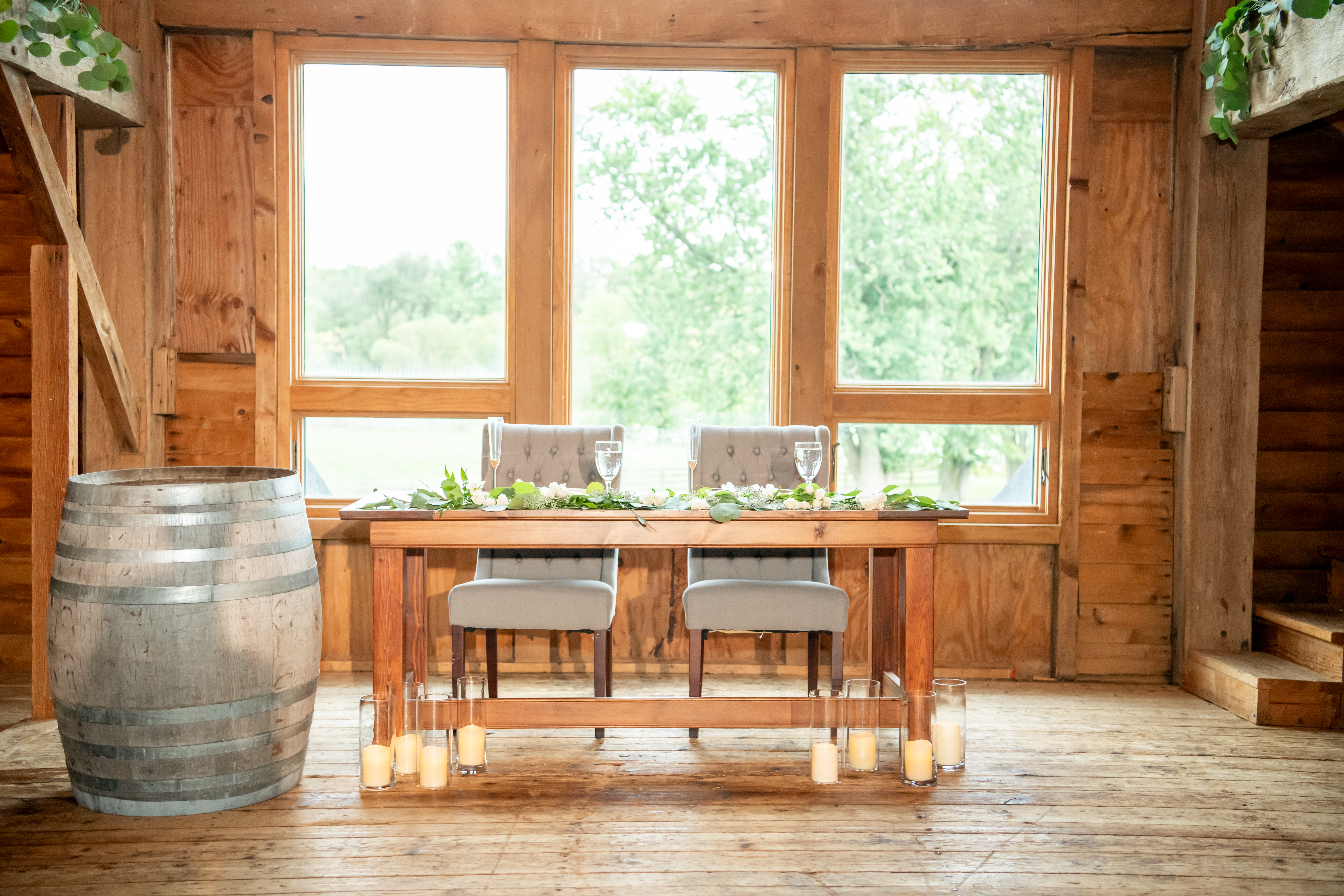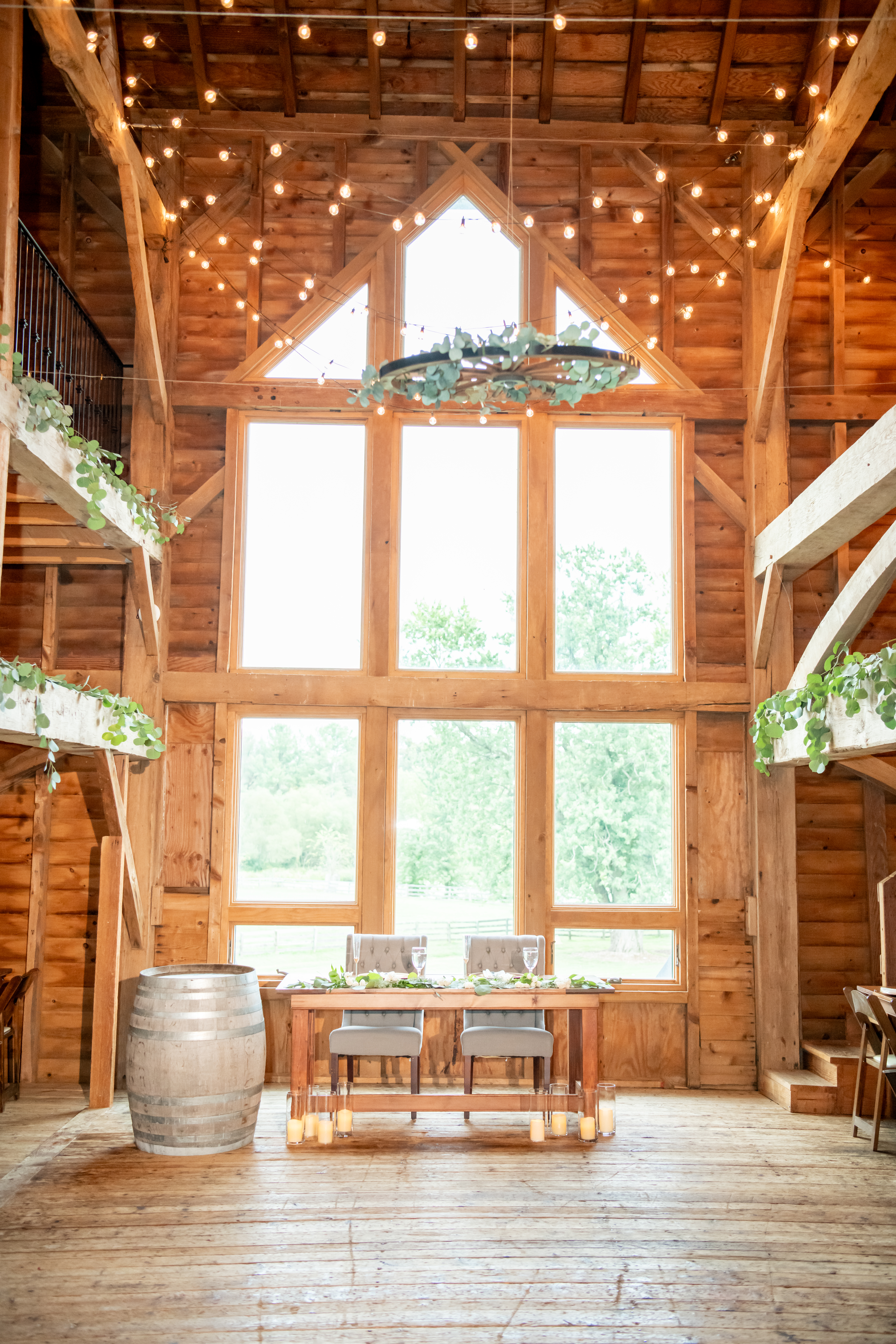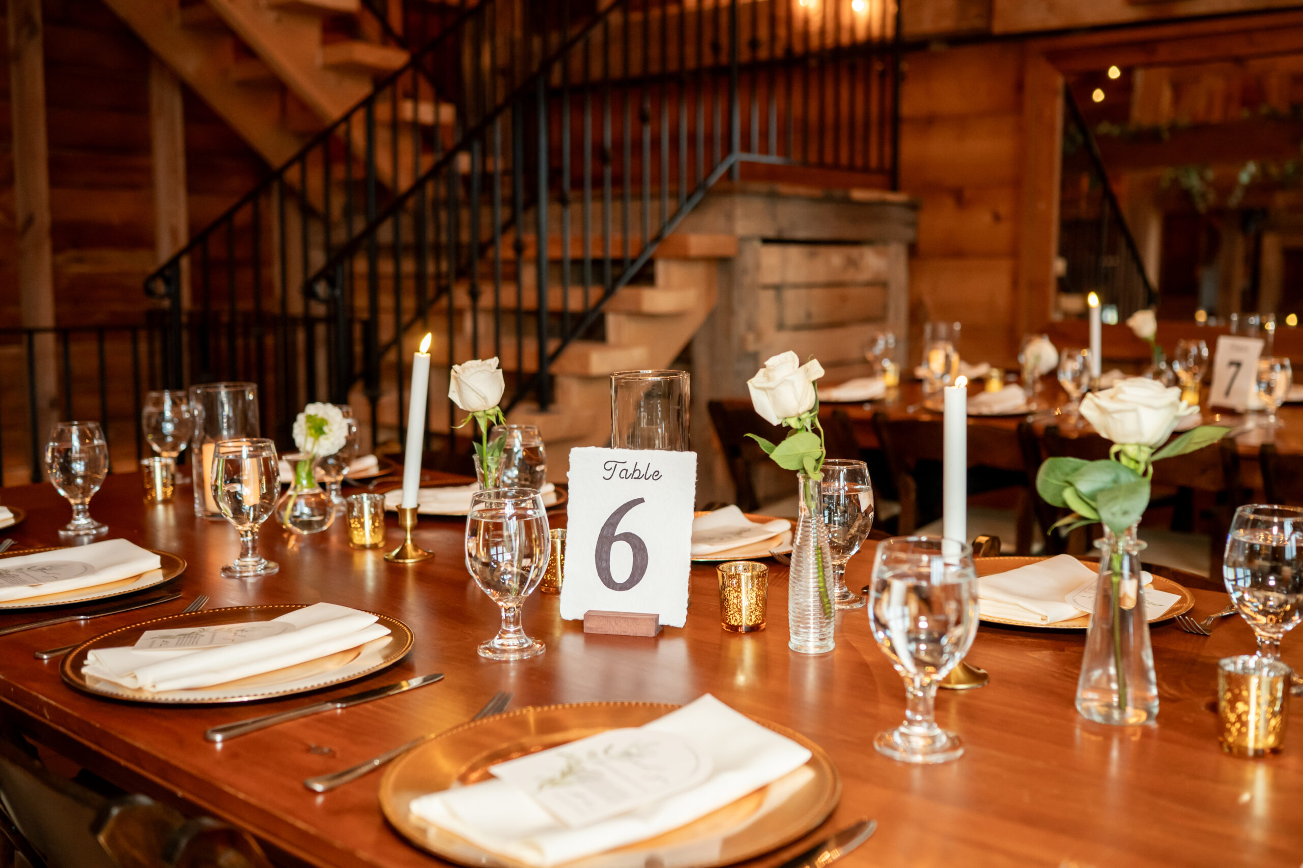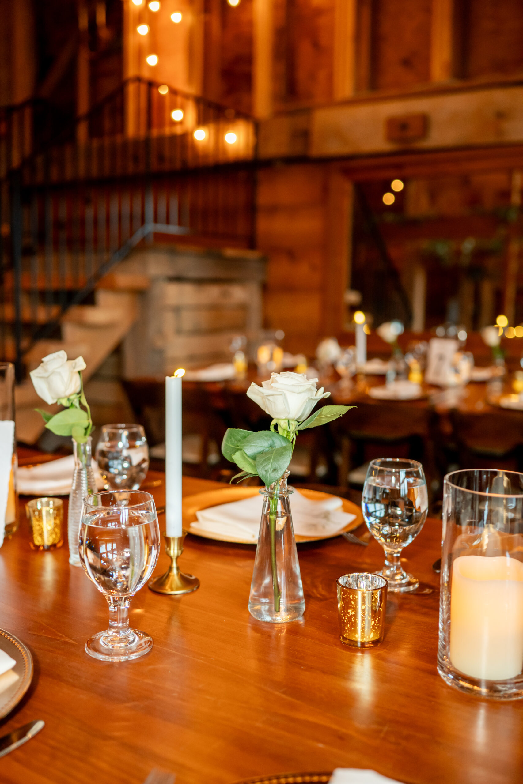 Inside the barn, the reception space was glowing with string lights across the ceiling and rustic wooden charm everywhere you looked. Long farm tables were decorated with gold votives, chargers, and white florals in small glass vases. The sweetheart table was covered in beautiful white flowers and felt so romantic.