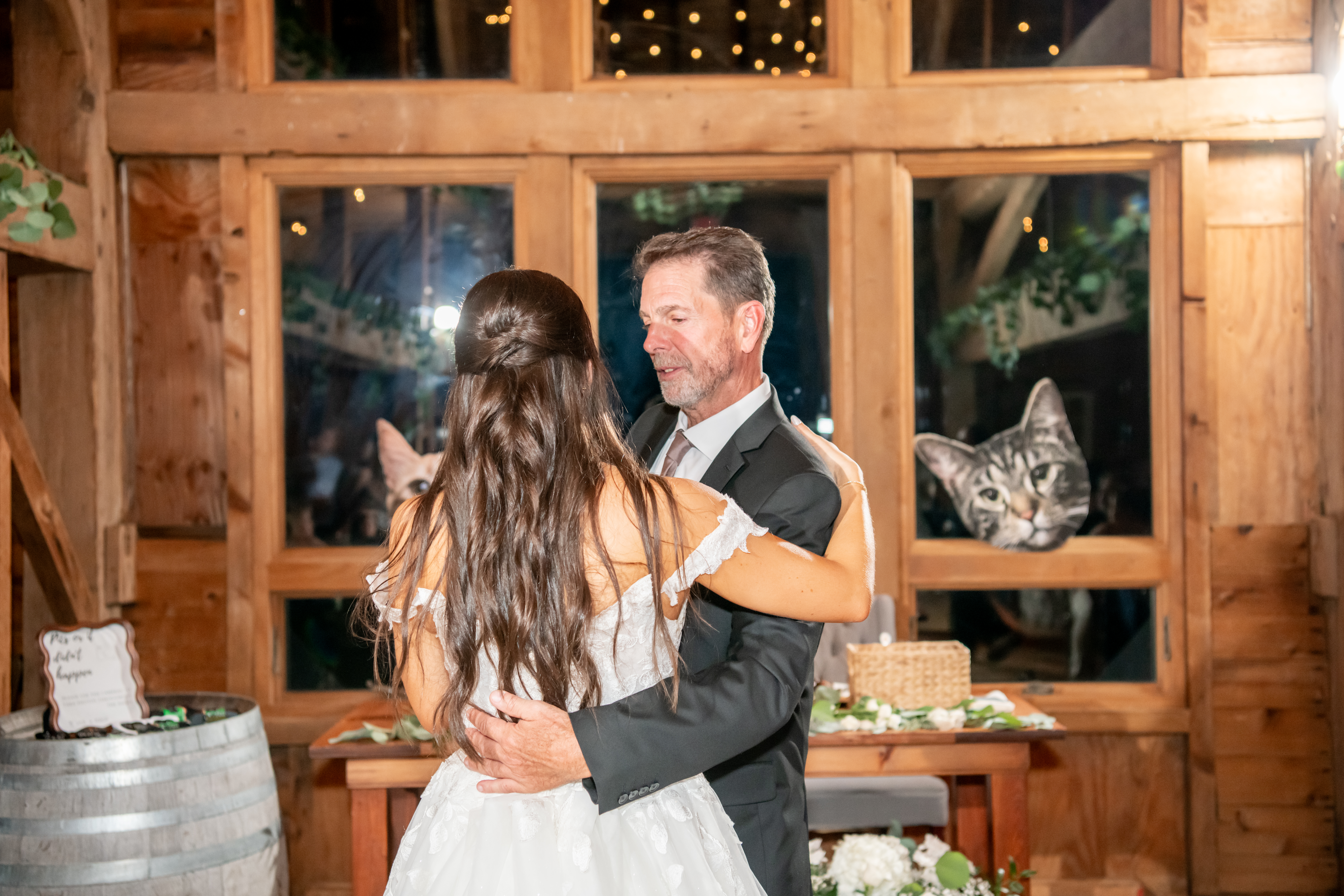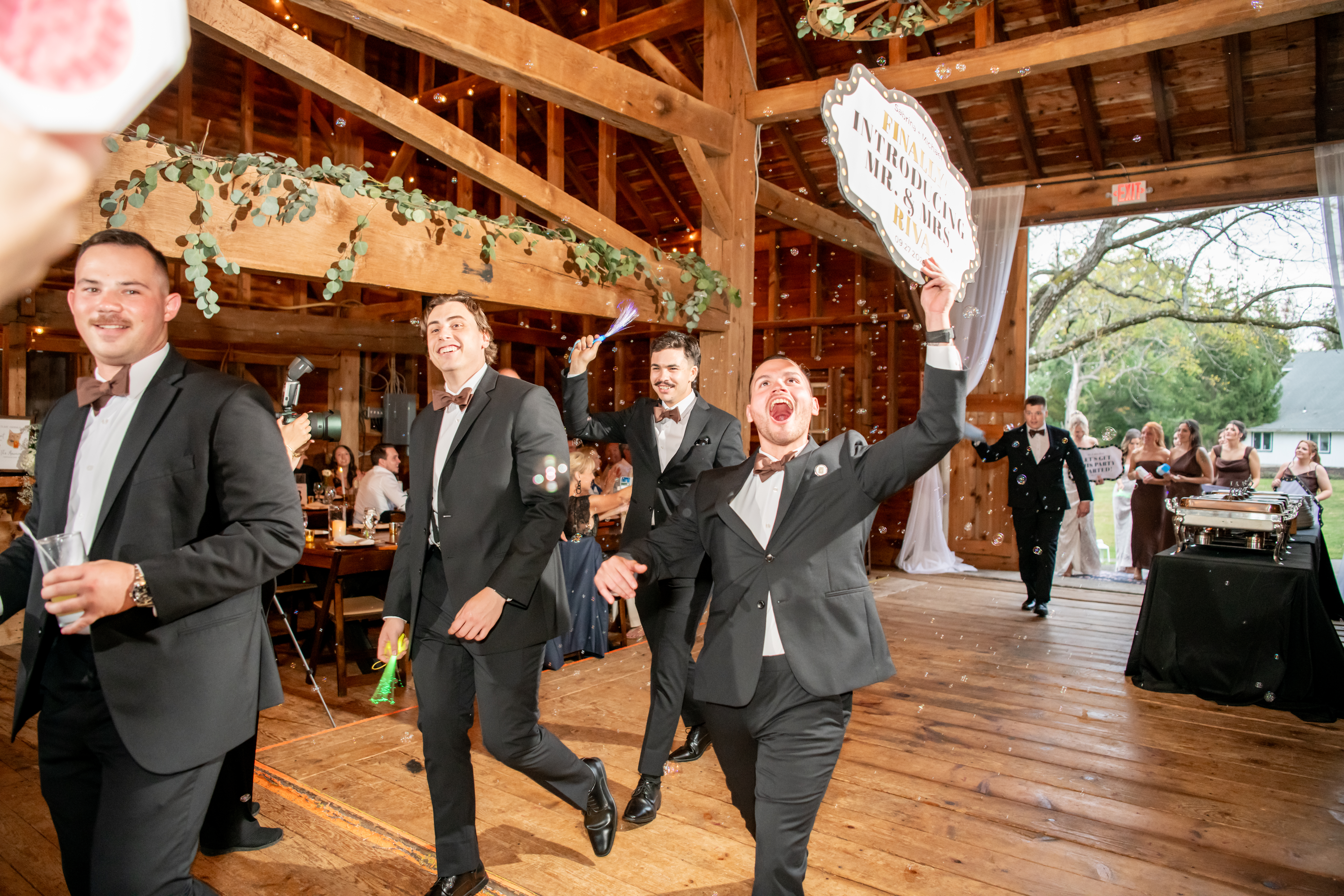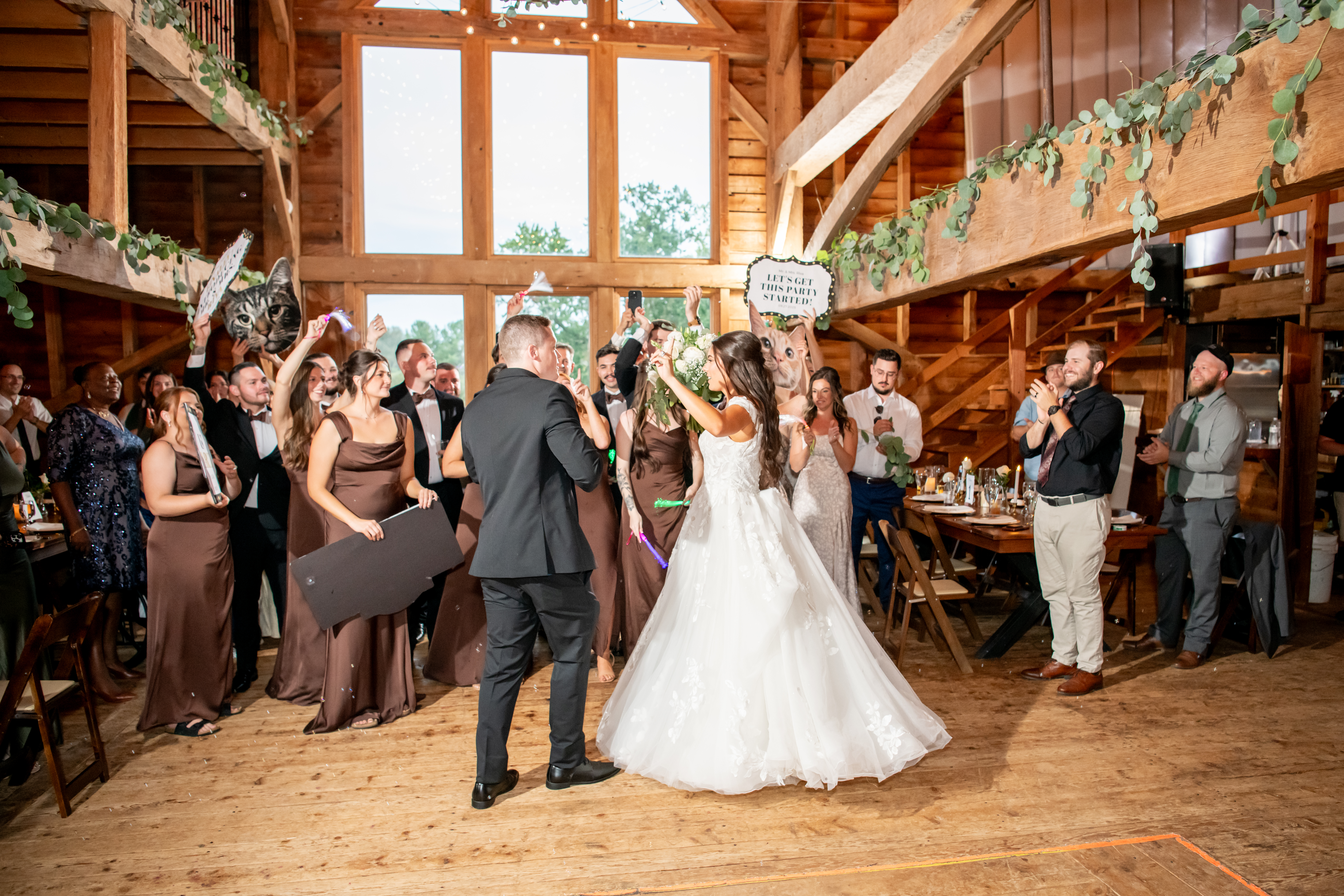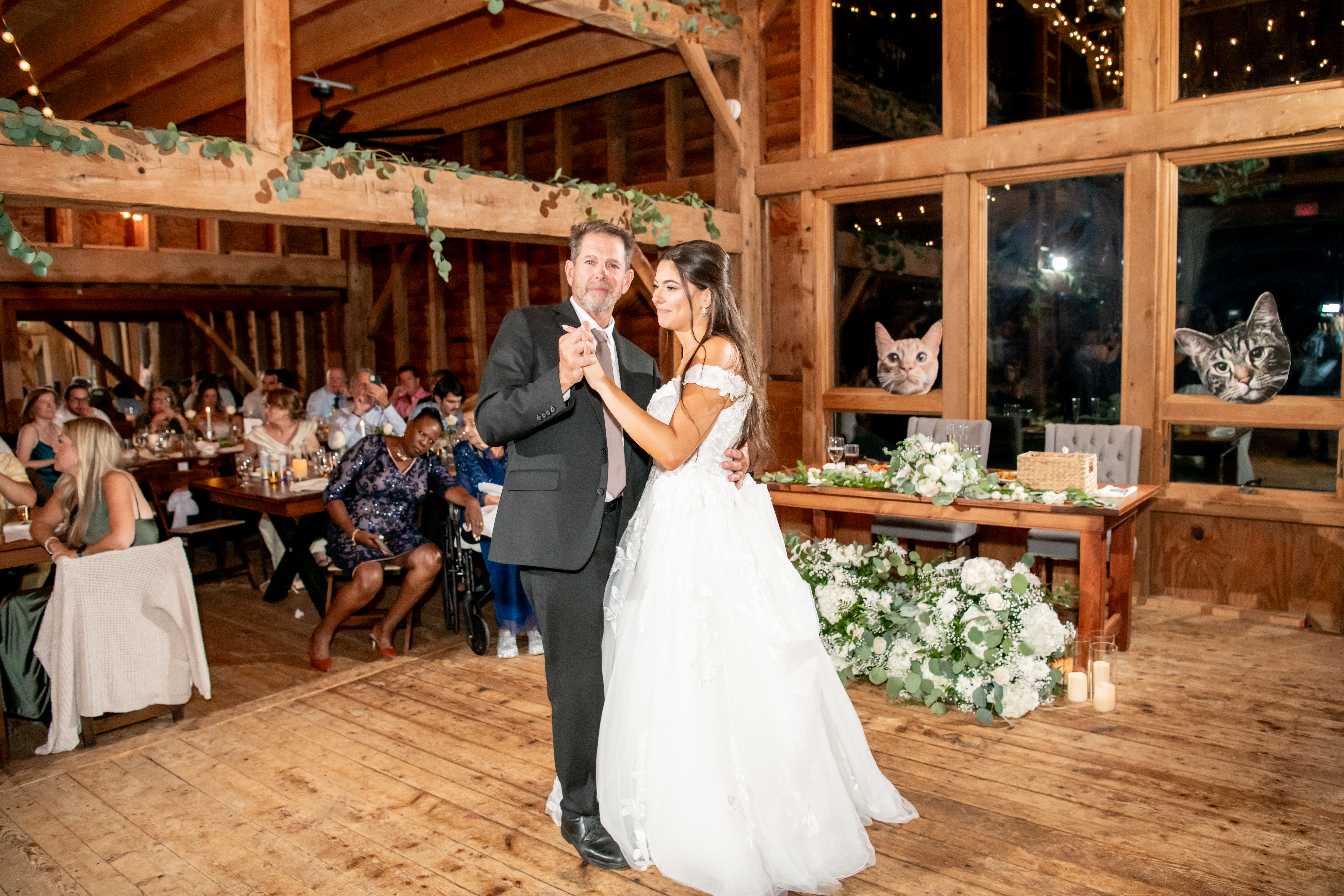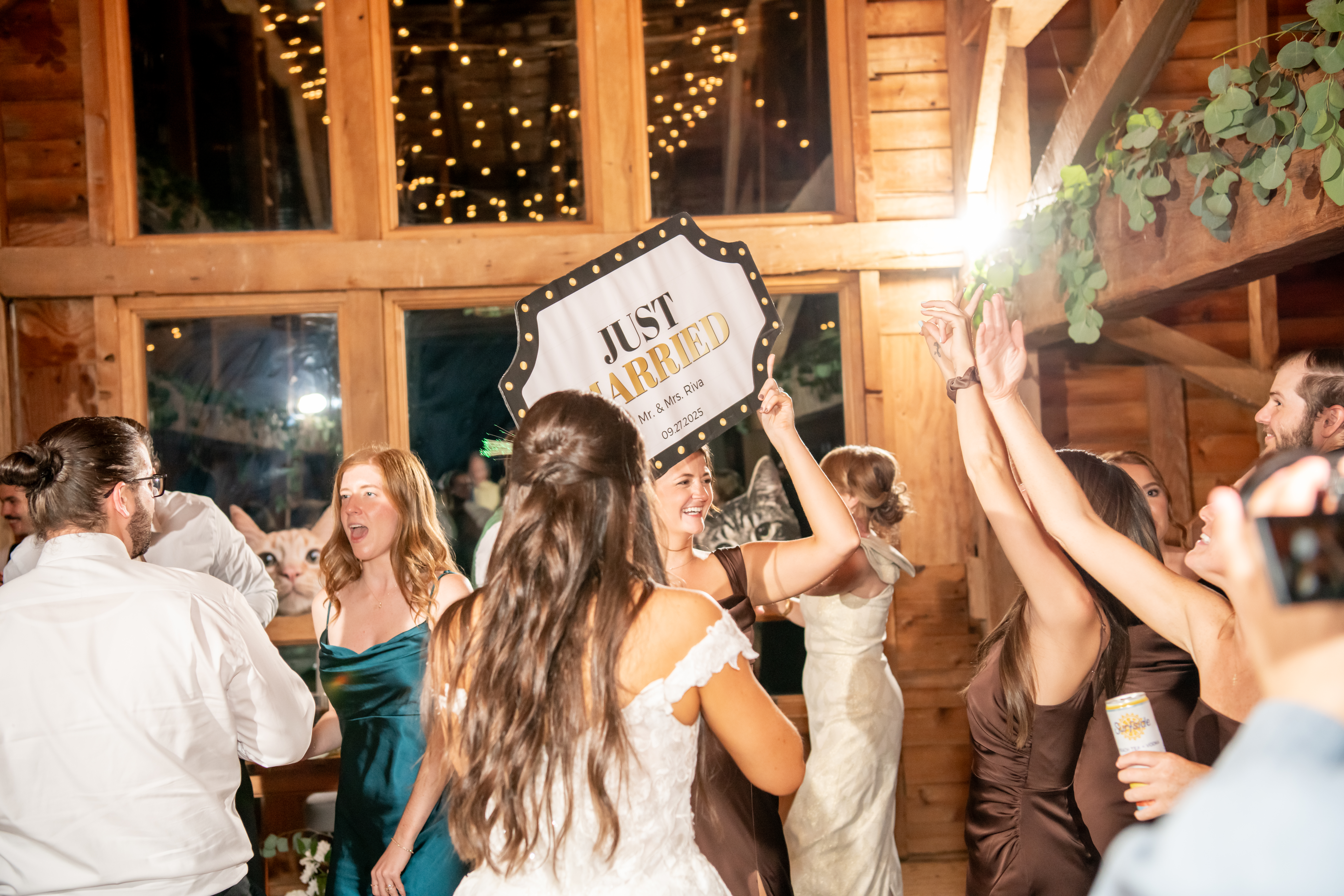 The bridal party made their entrance with signs, bubbles, and giant cutouts of their catsā faces, bringing so much laughter and excitement. When Sabrina and Mike entered, the energy was through the roof. Their first dance was sweet and emotional, followed by heartfelt parent dances and touching speeches.