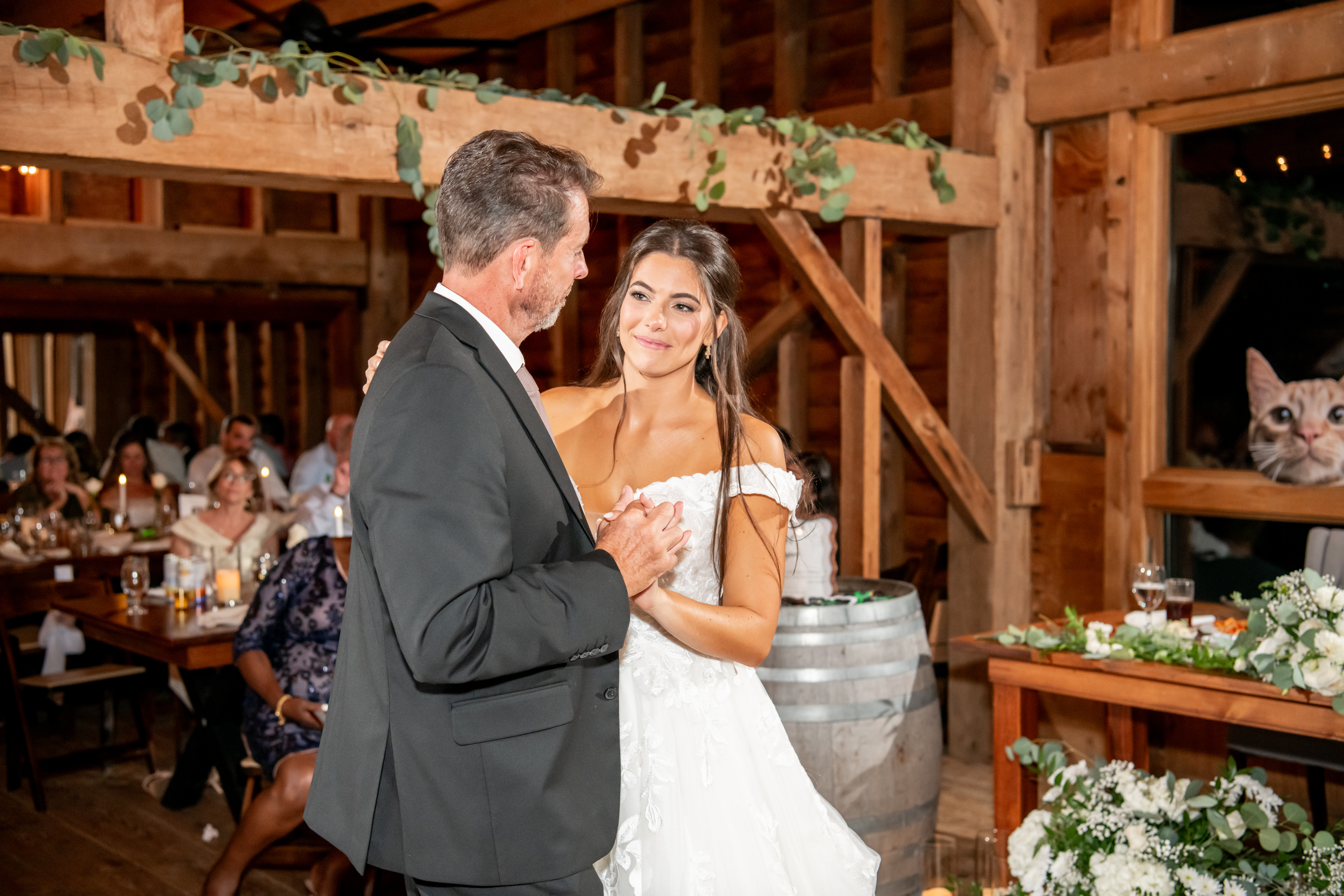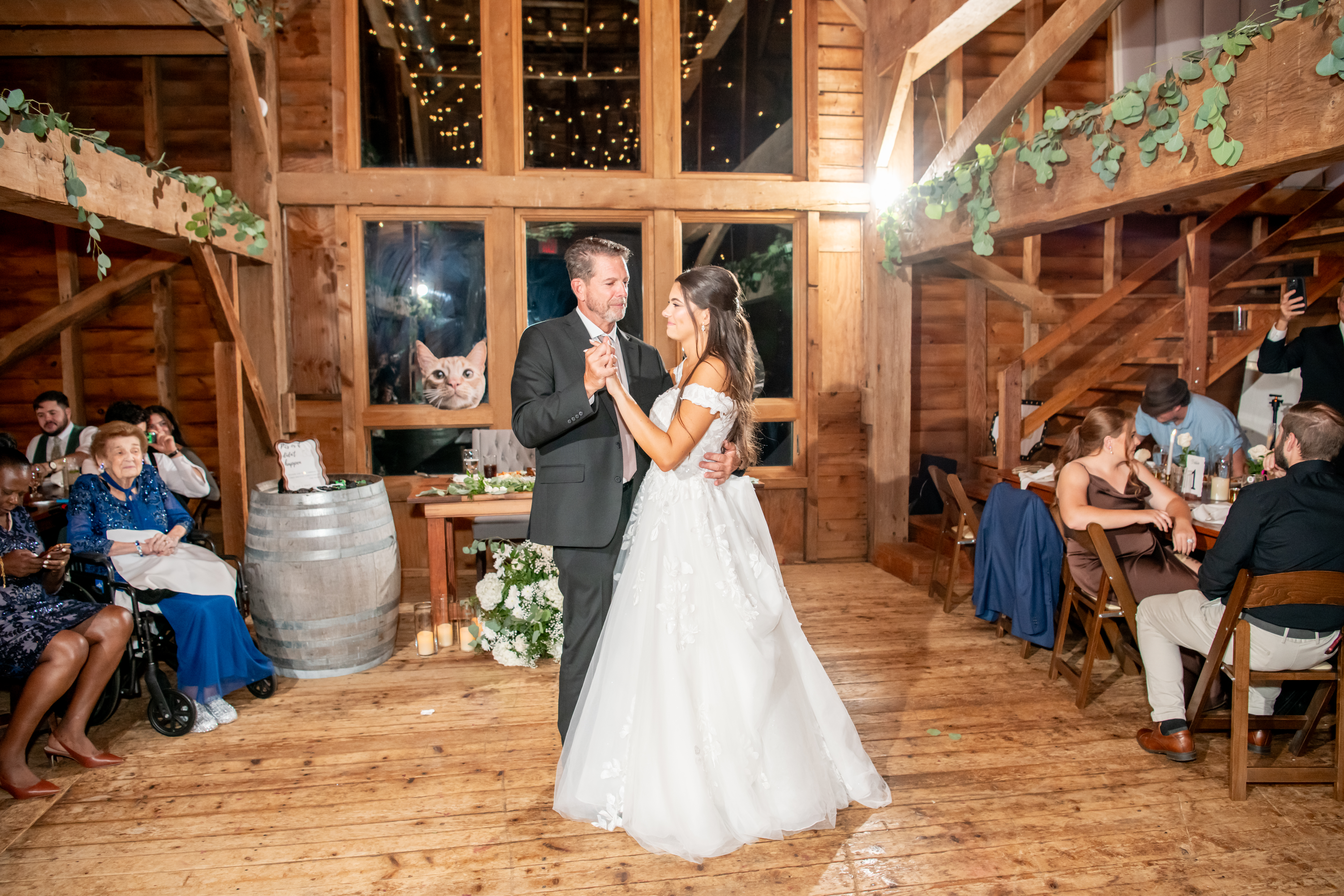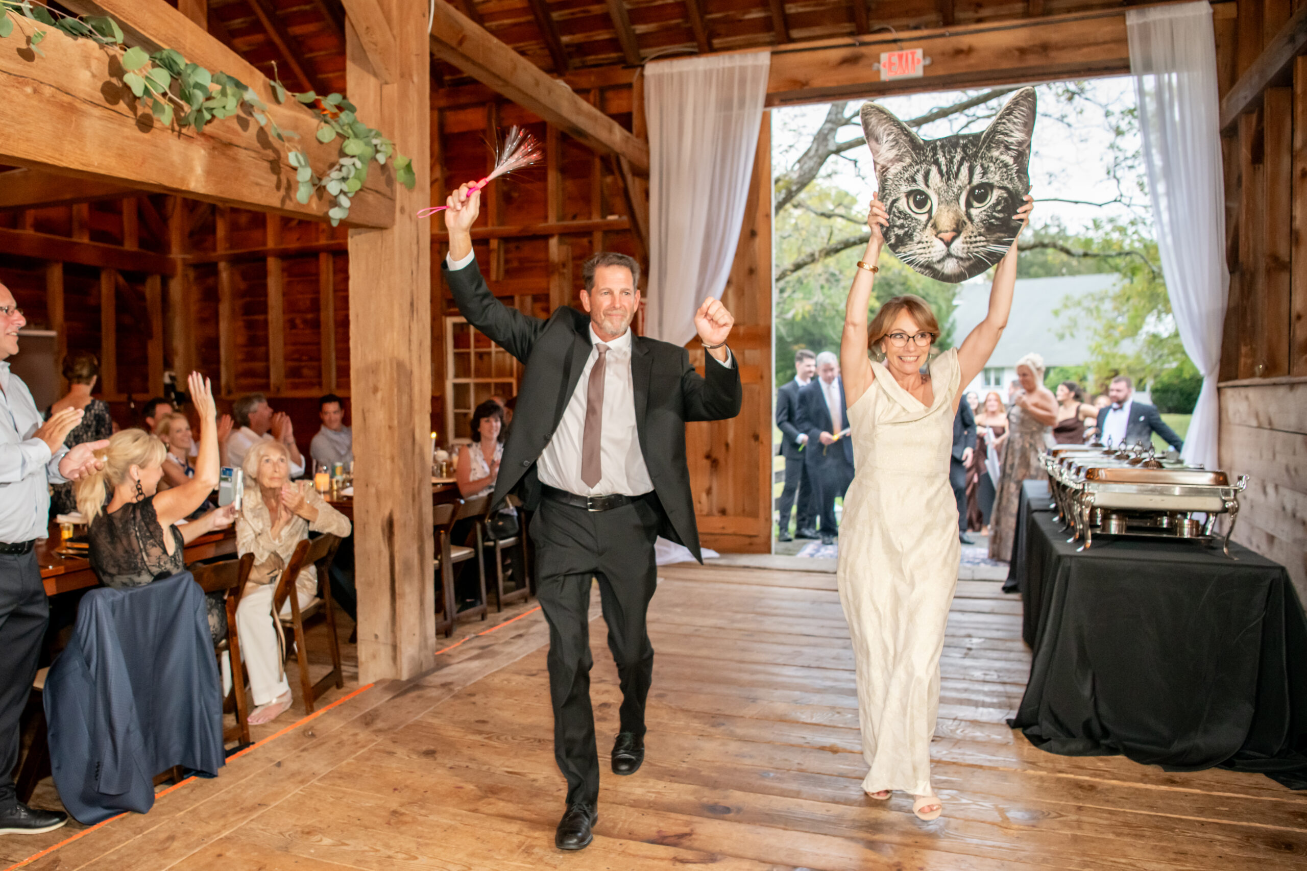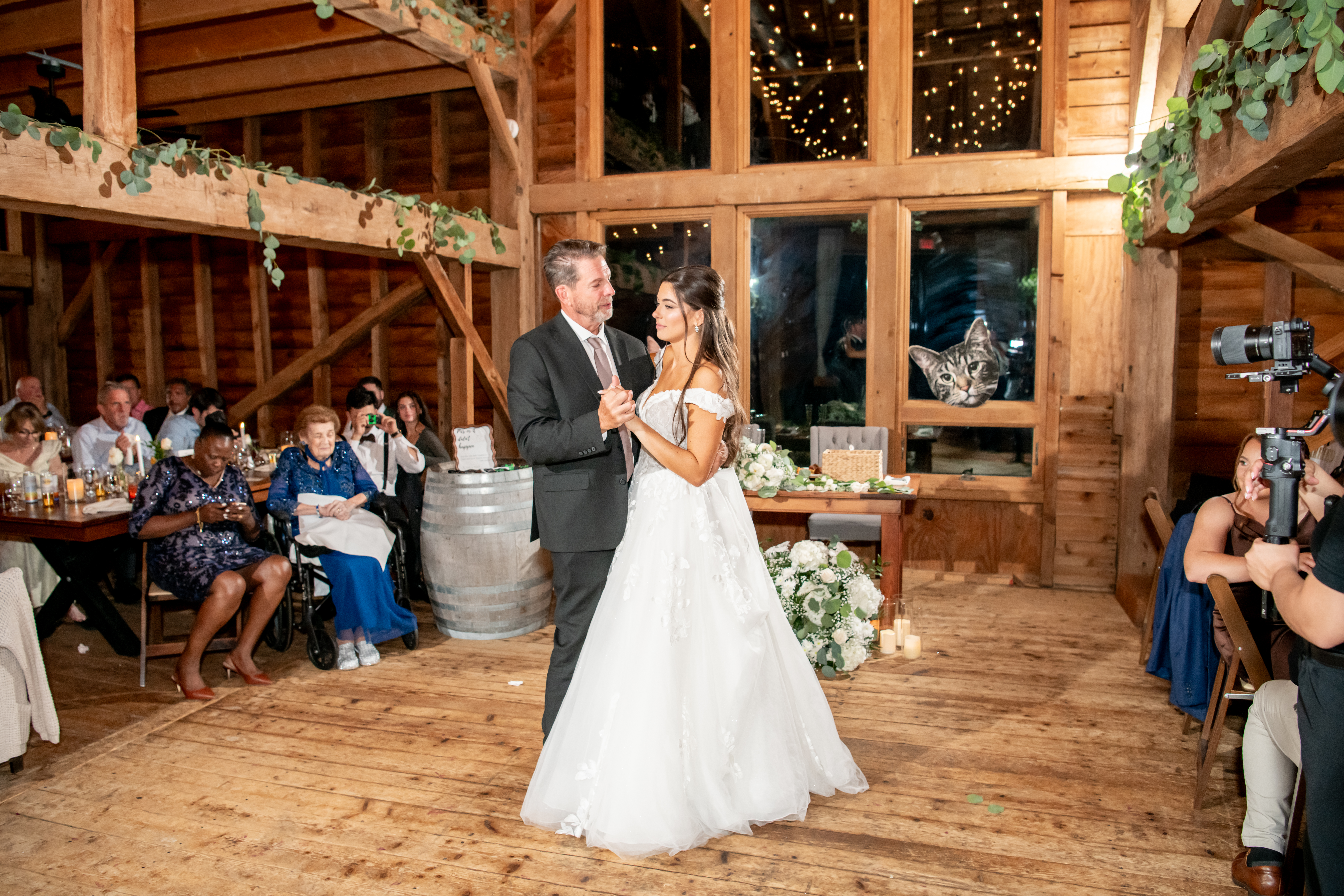 The bridal party made their entrance with signs, bubbles, and giant cutouts of their catsā faces, bringing so much laughter and excitement. When Sabrina and Mike entered, the energy was through the roof. Their first dance was sweet and emotional, followed by heartfelt parent dances and touching speeches.