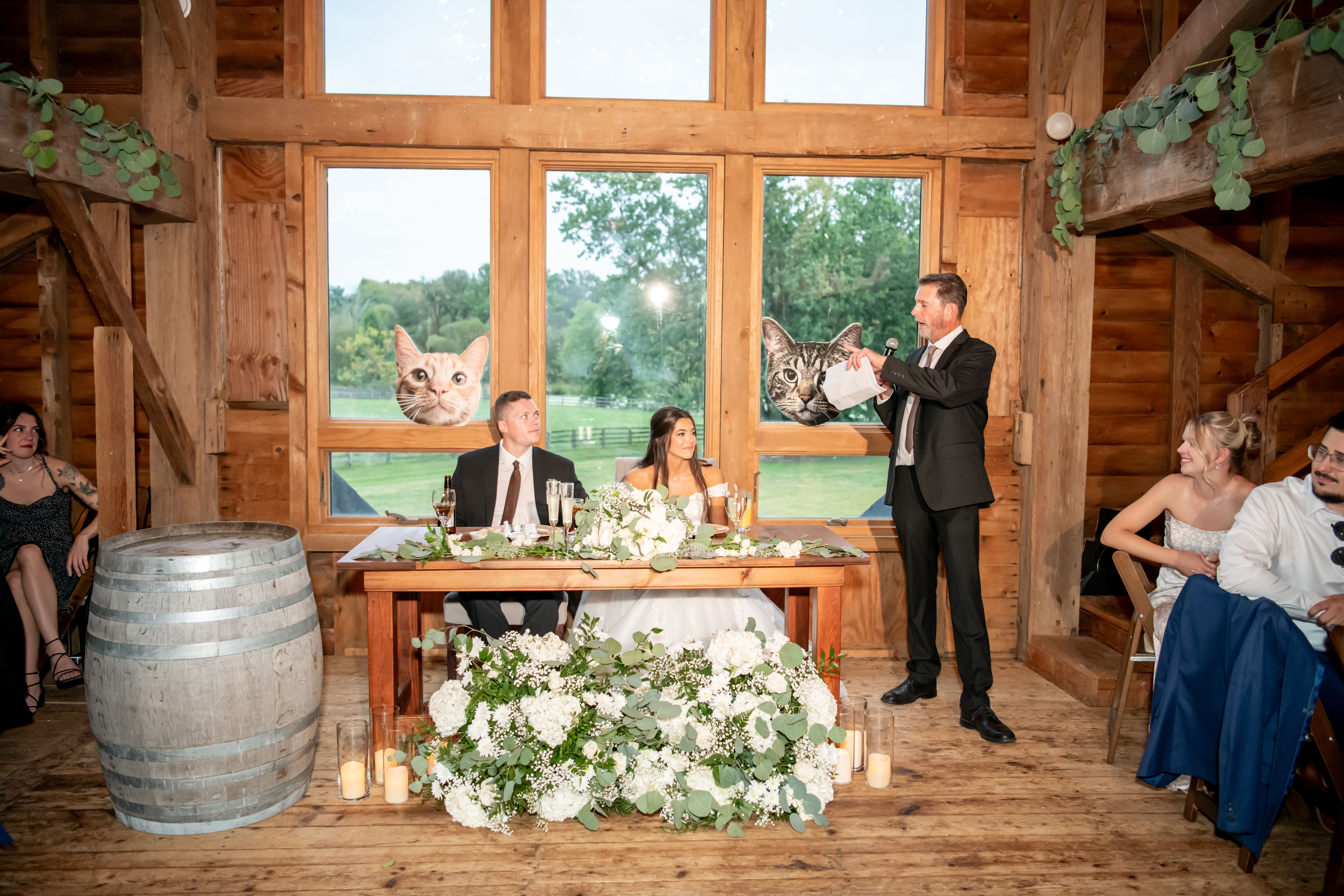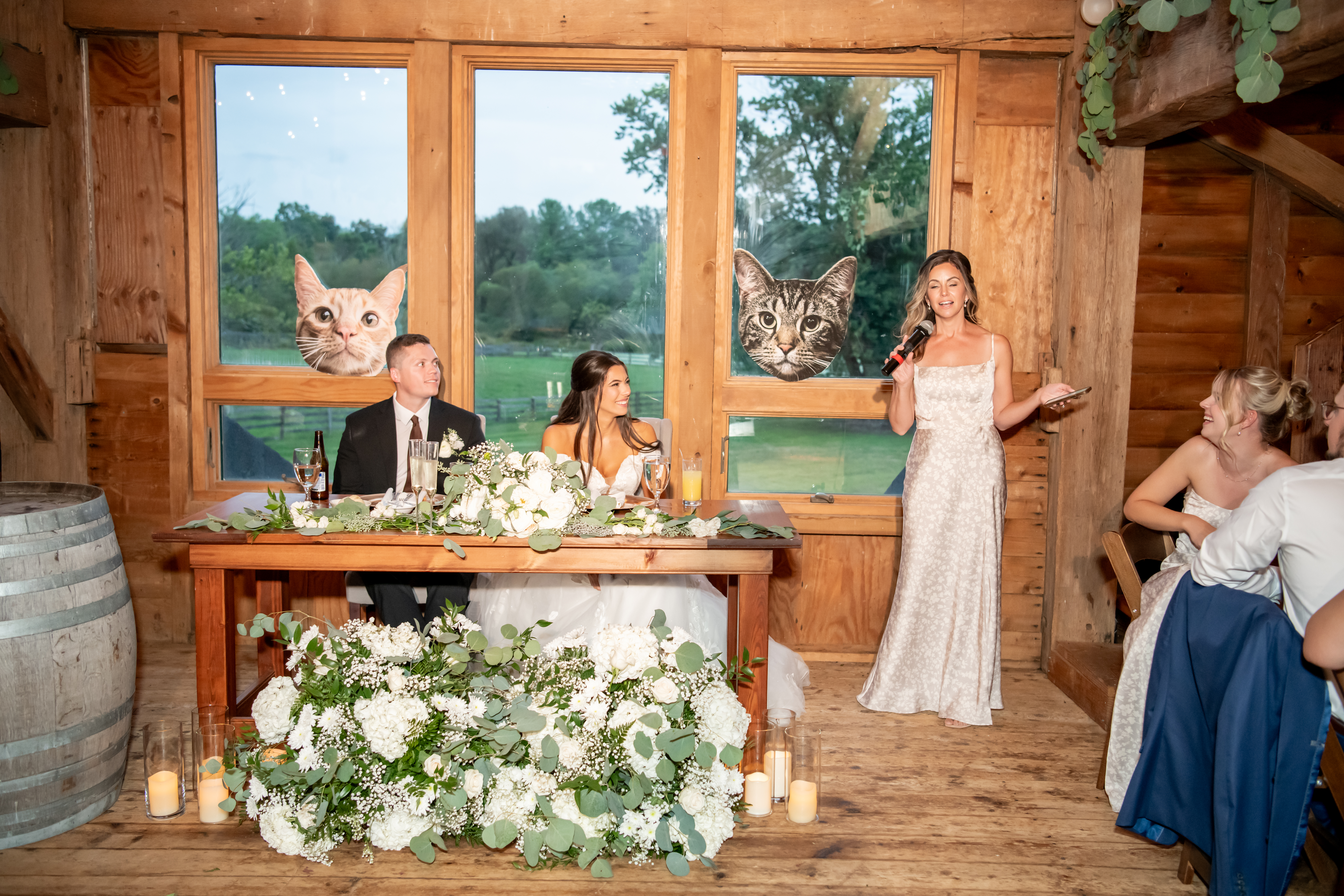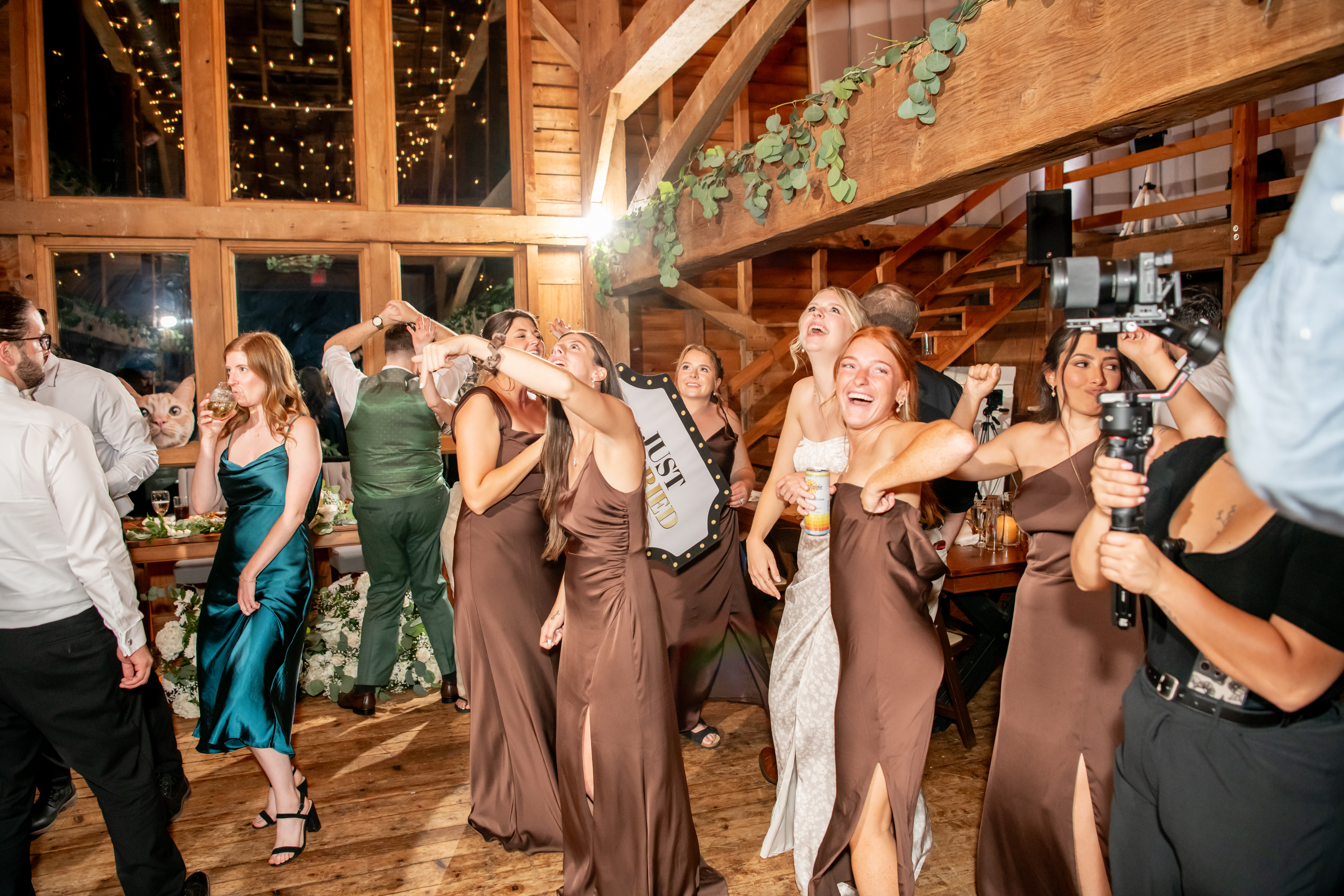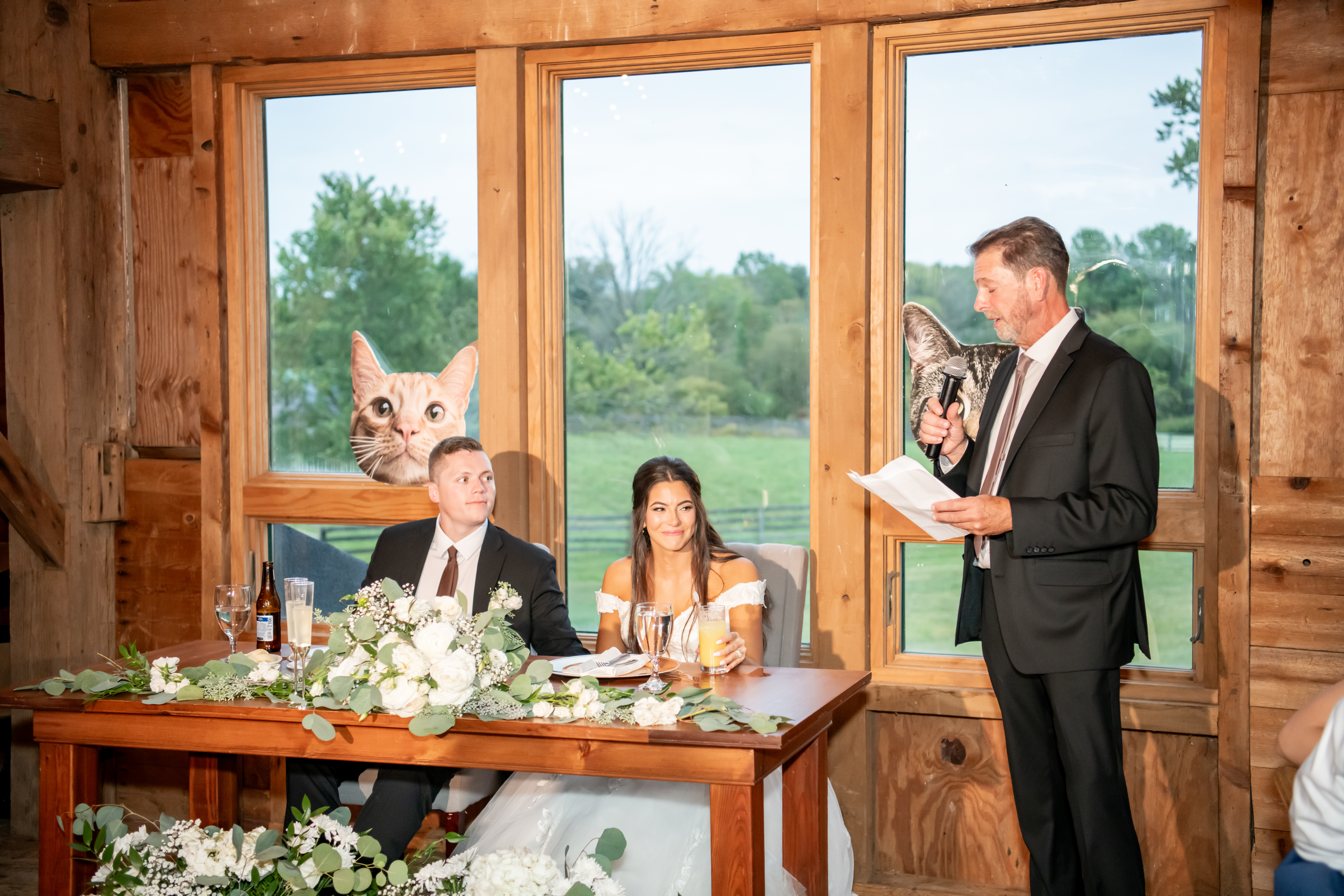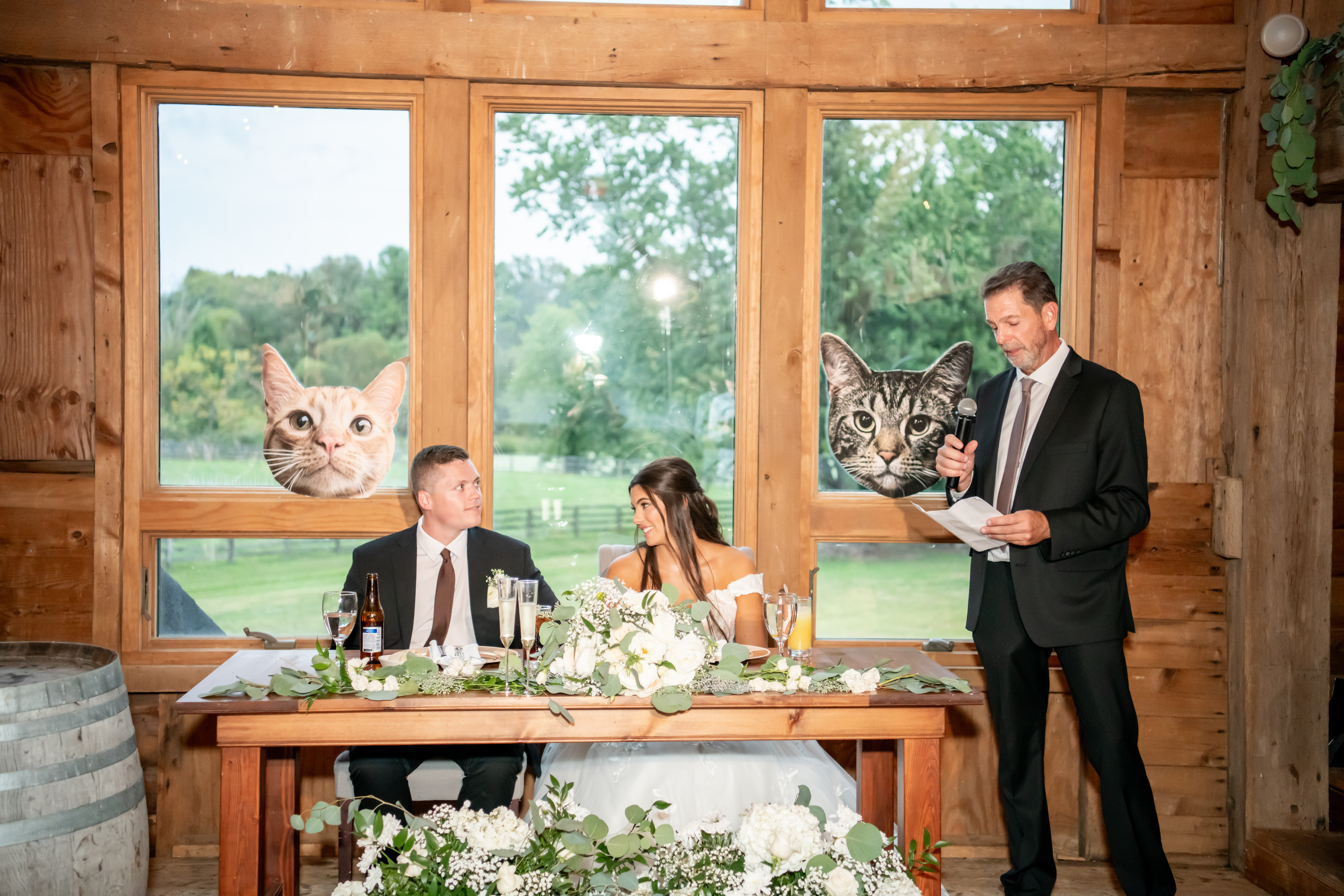 The bridal party made their entrance with signs, bubbles, and giant cutouts of their catsā faces, bringing so much laughter and excitement. When Sabrina and Mike entered, the energy was through the roof. Their first dance was sweet and emotional, followed by heartfelt parent dances and touching speeches.