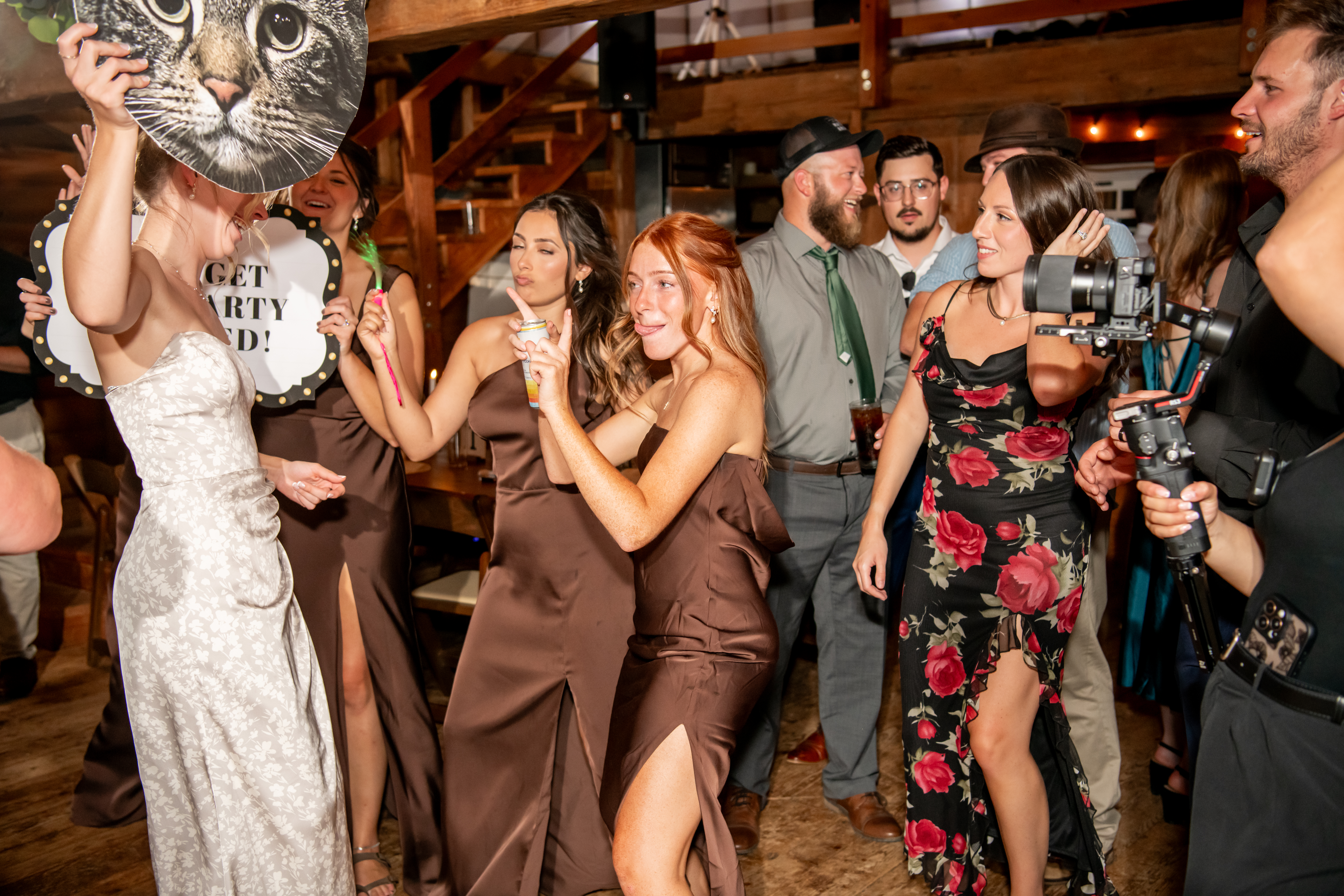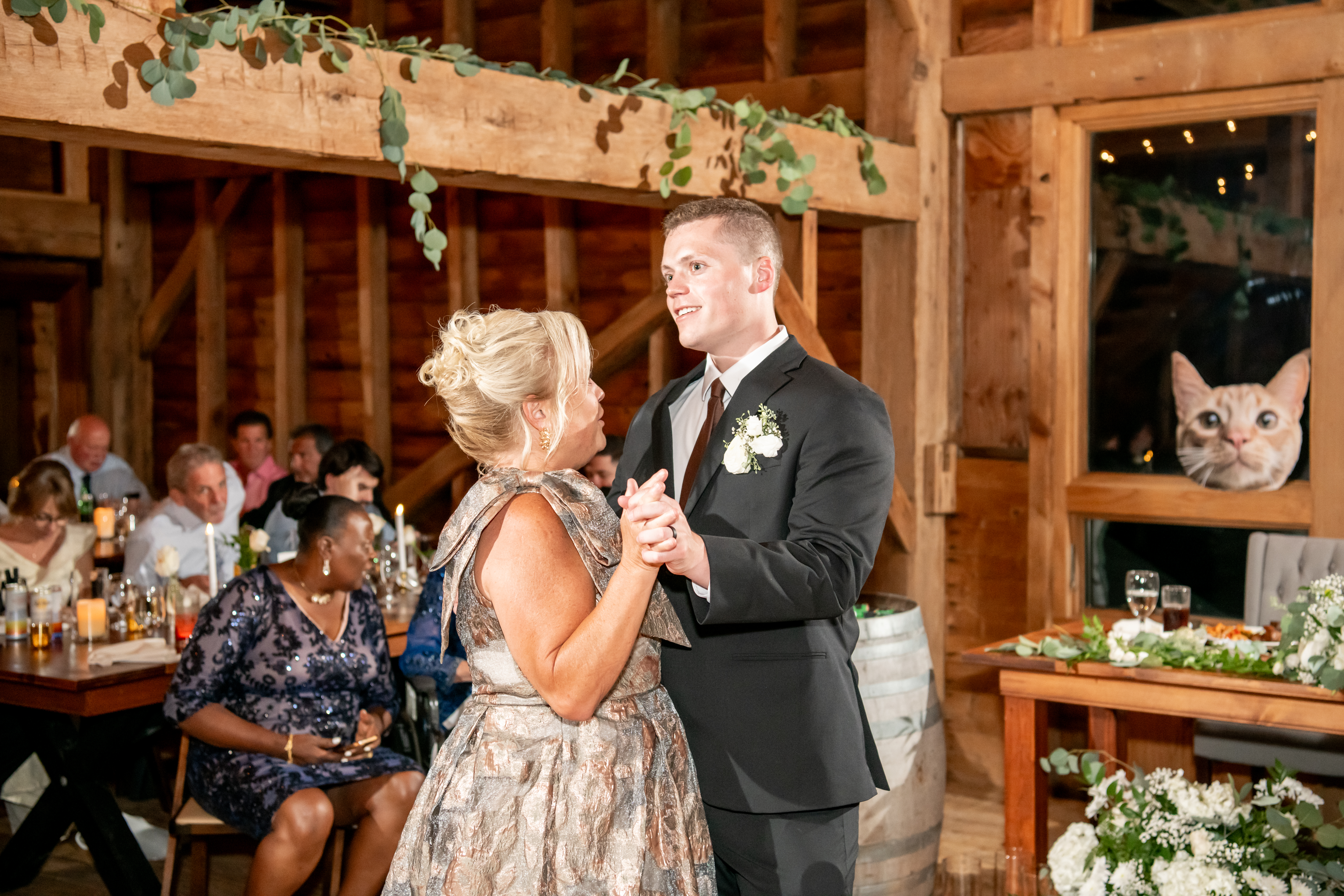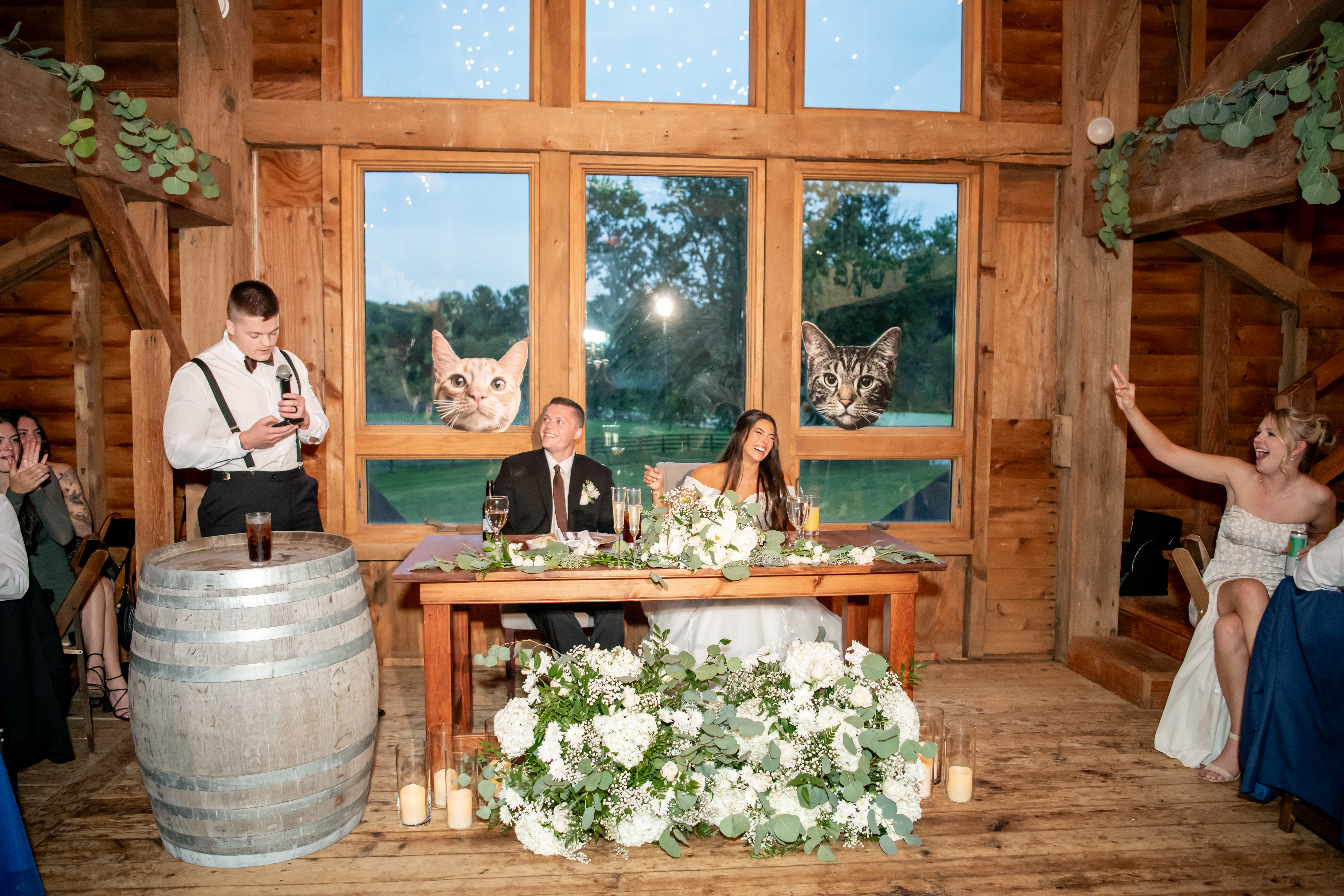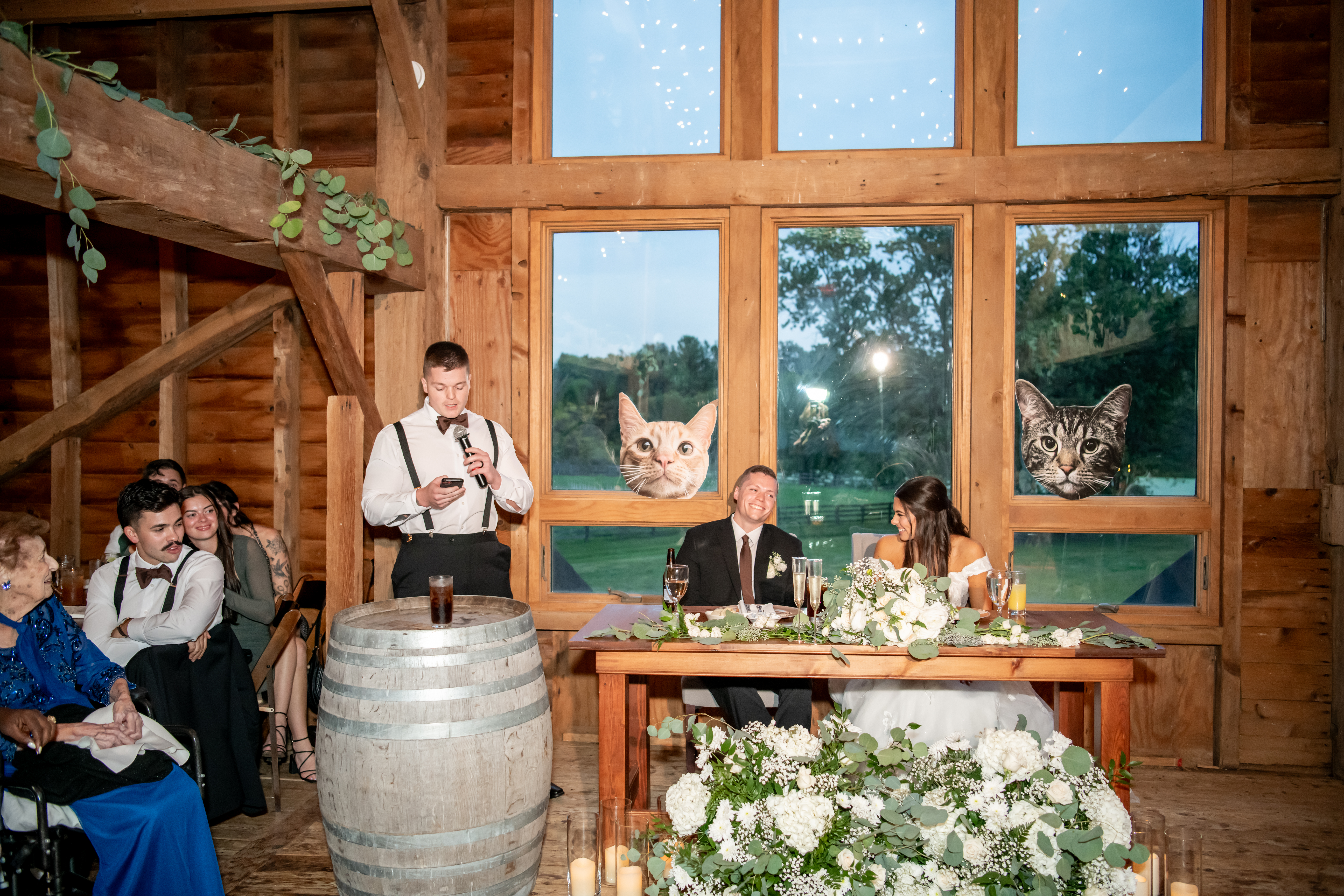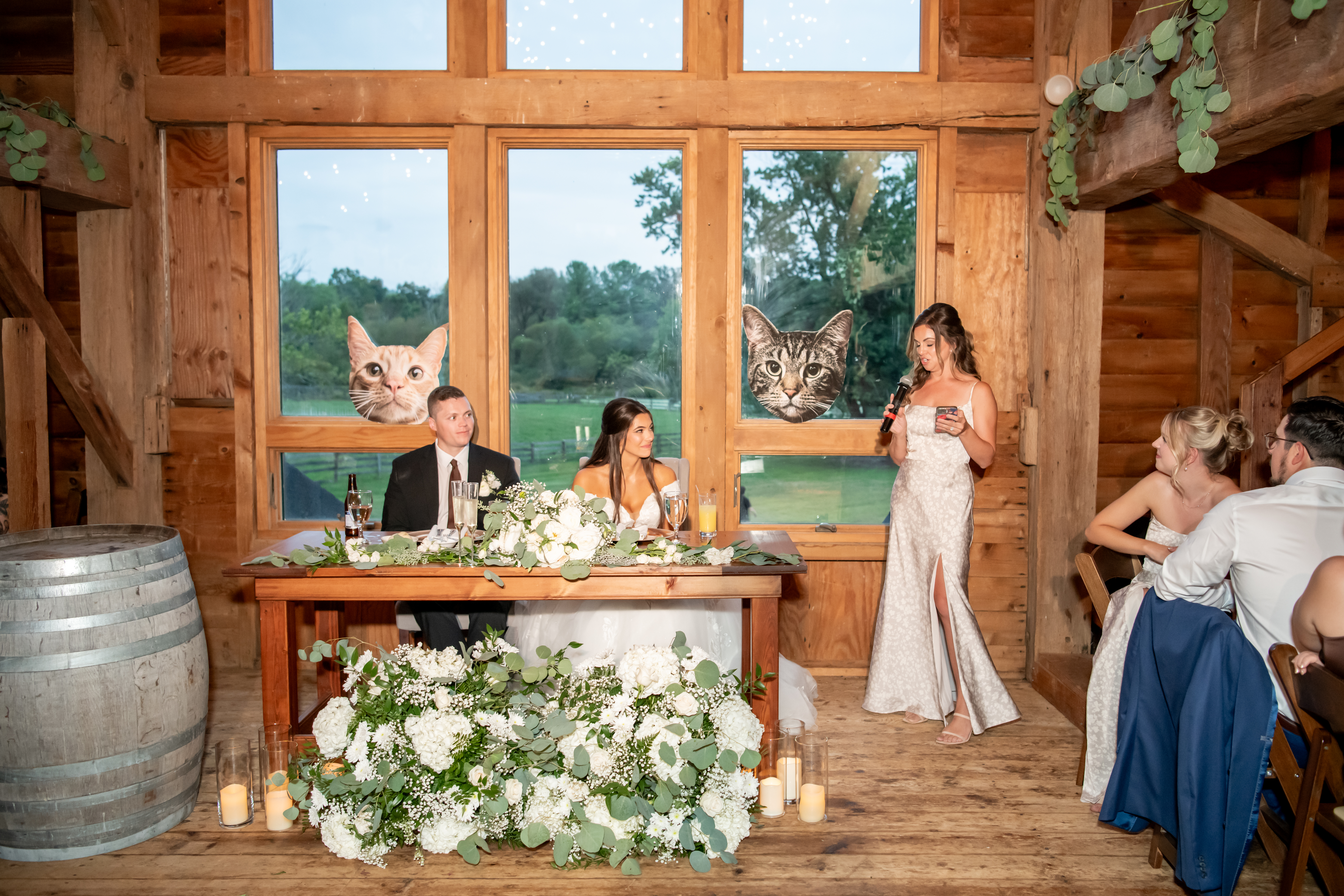 The bridal party made their entrance with signs, bubbles, and giant cutouts of their catsā faces, bringing so much laughter and excitement. When Sabrina and Mike entered, the energy was through the roof. Their first dance was sweet and emotional, followed by heartfelt parent dances and touching speeches.