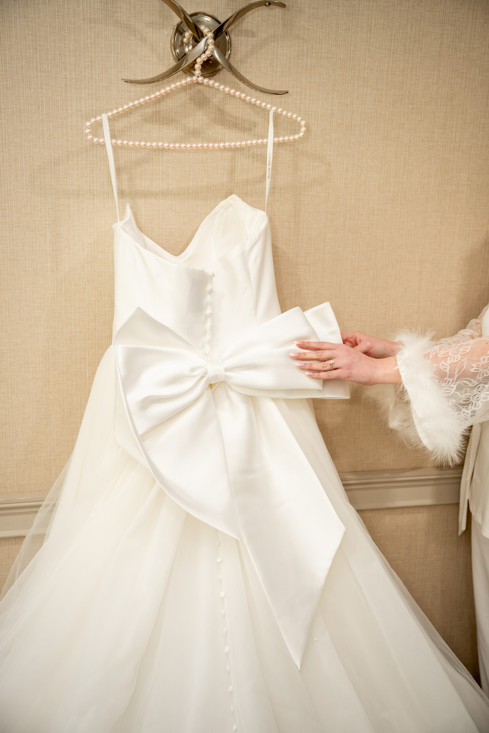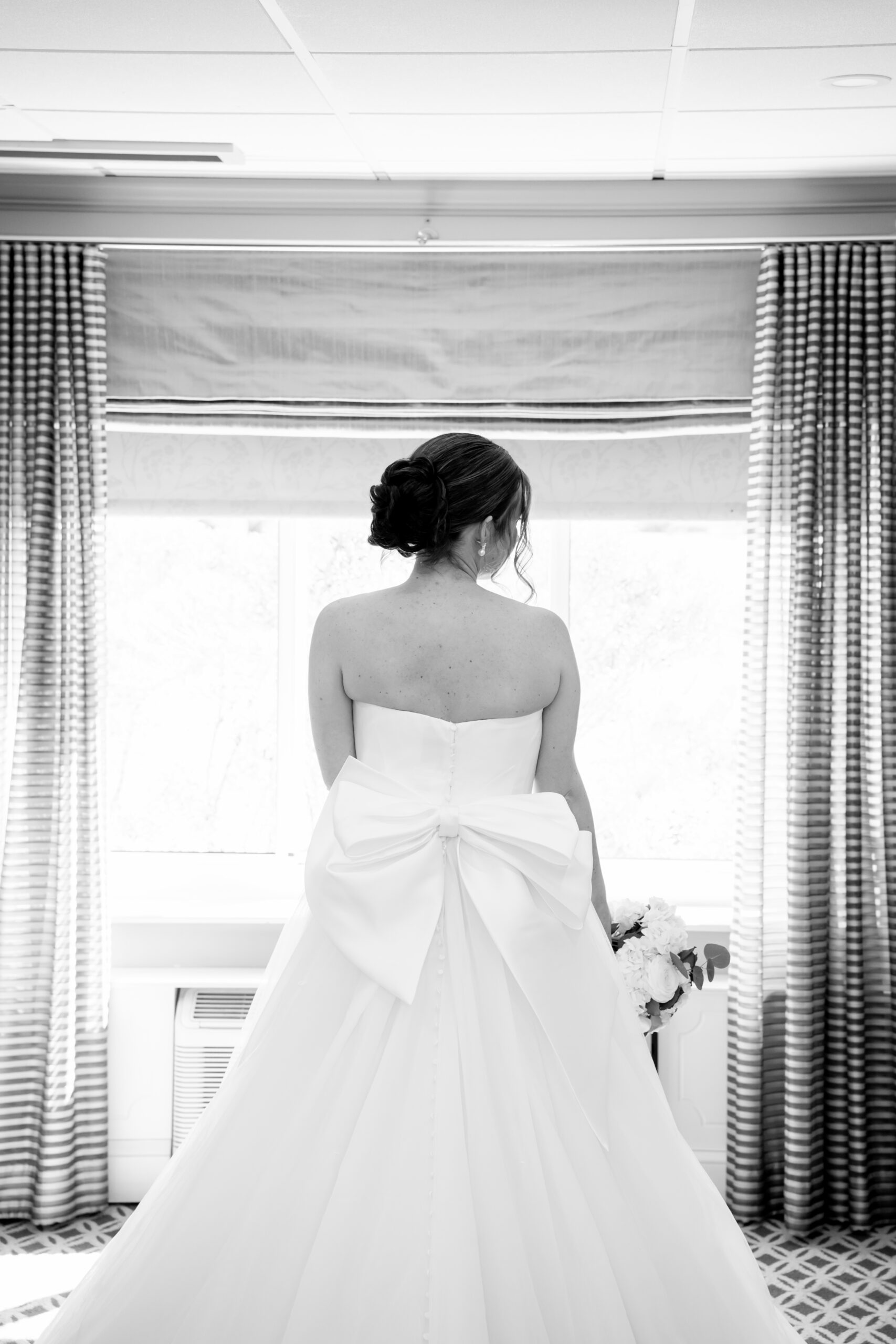 Her dress was an A-line silhouette with a satin sweetheart neckline and layers of soft chiffon that flowed into a long, dreamy train. But the standout detail? The most beautiful oversized asymmetrical bow on the back. It added such a romantic, modern touch. And don’t forget the row of buttons trailing down the back.