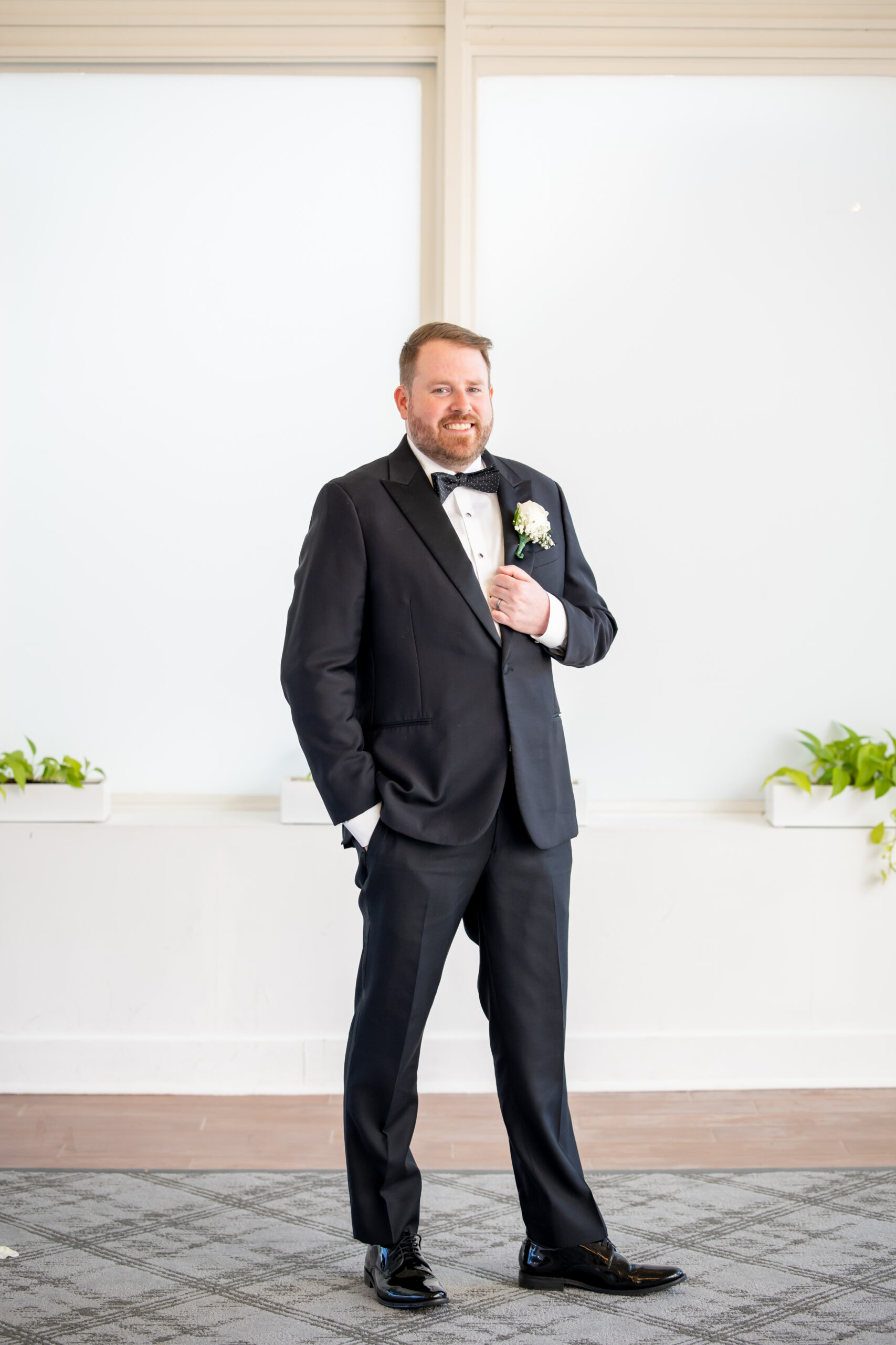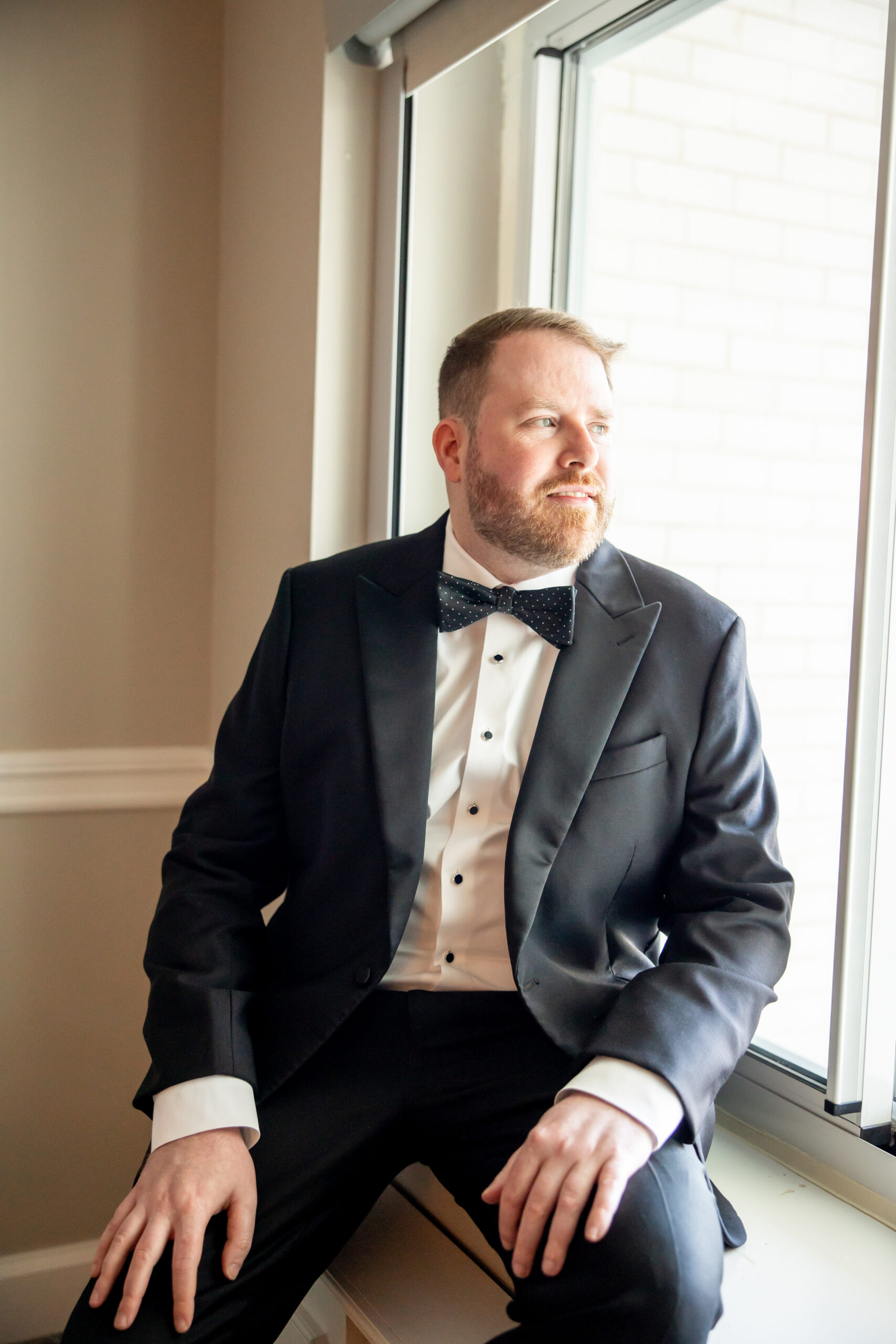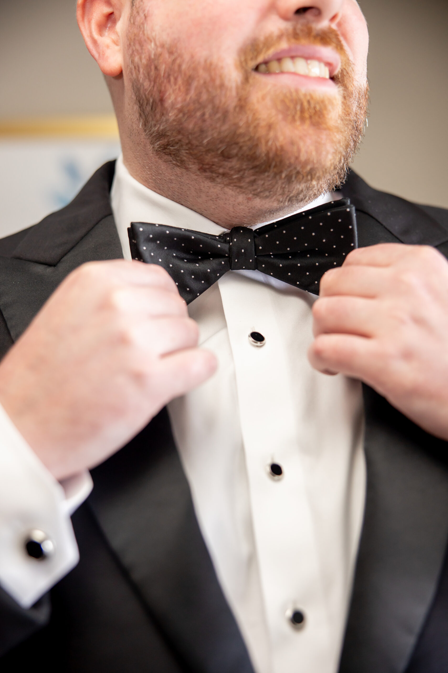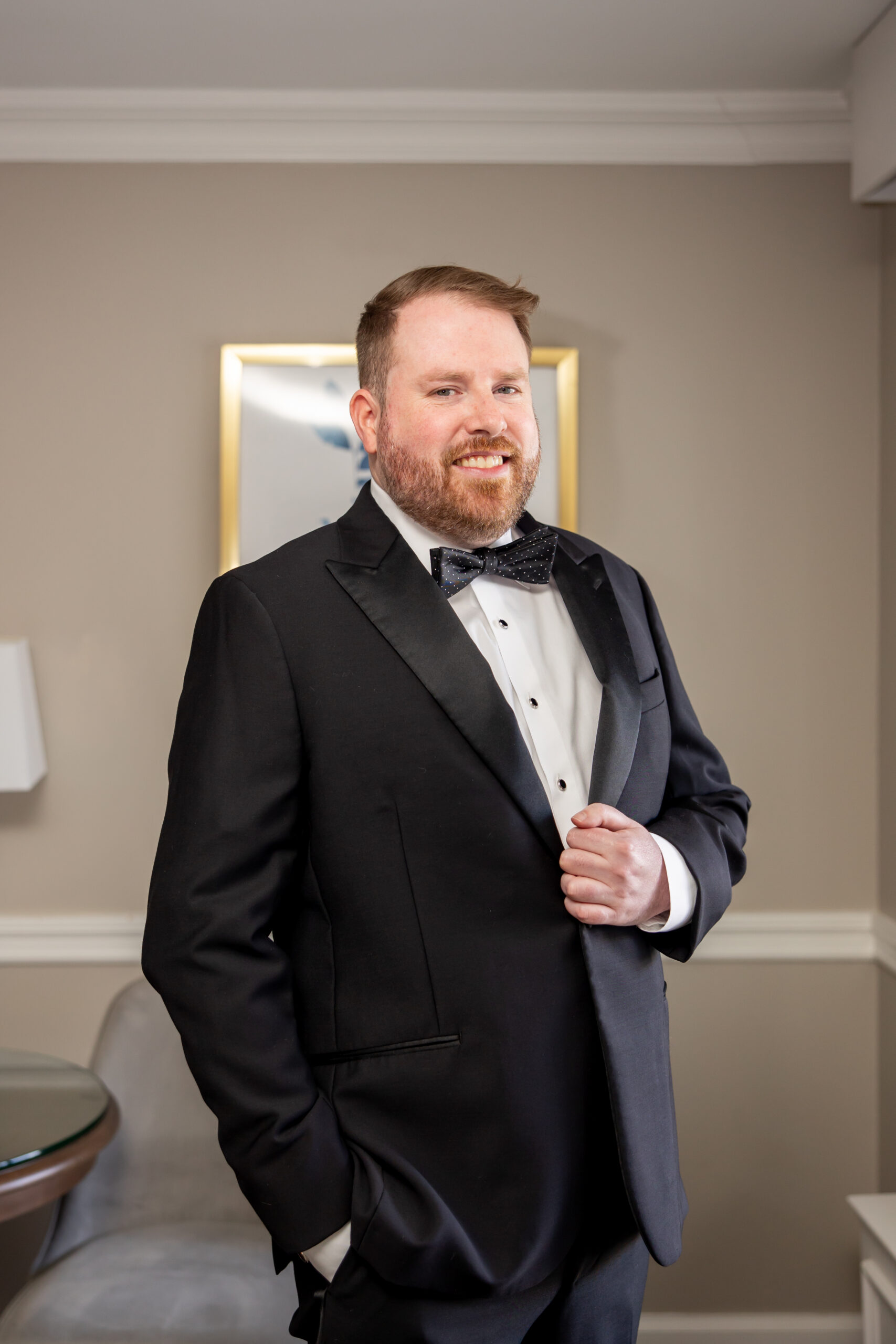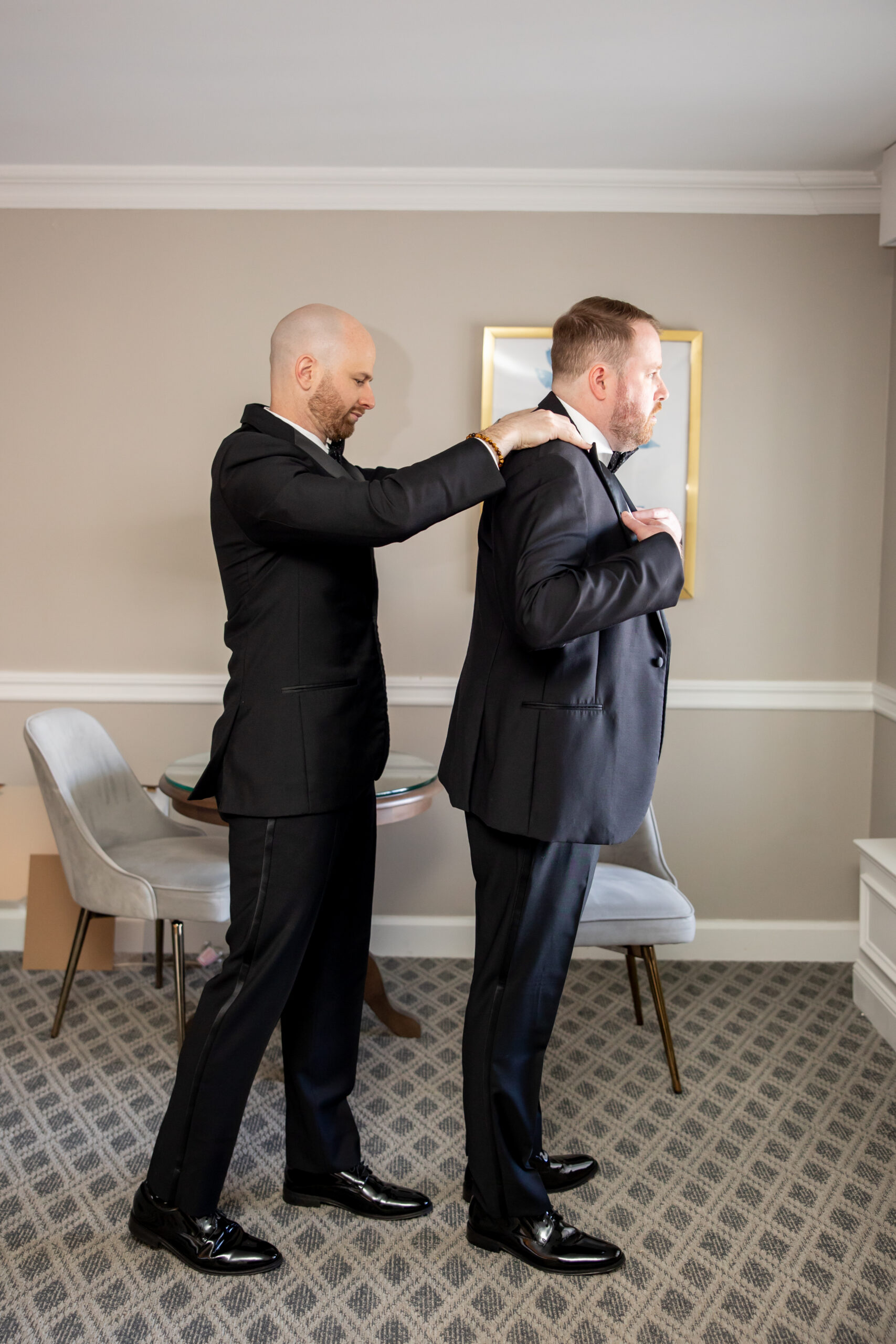 Patrick got ready with the help of his best man, buttoning up his jacket and tying his bow tie. He looked incredibly sharp in a classic black tux, very timeless and refined. Downstairs, Michelle stepped into her gown with the help of her mom.