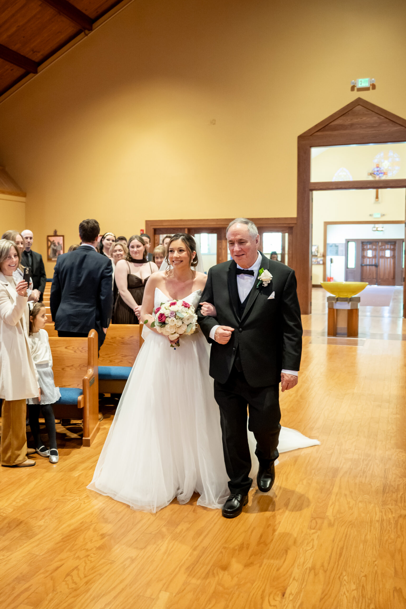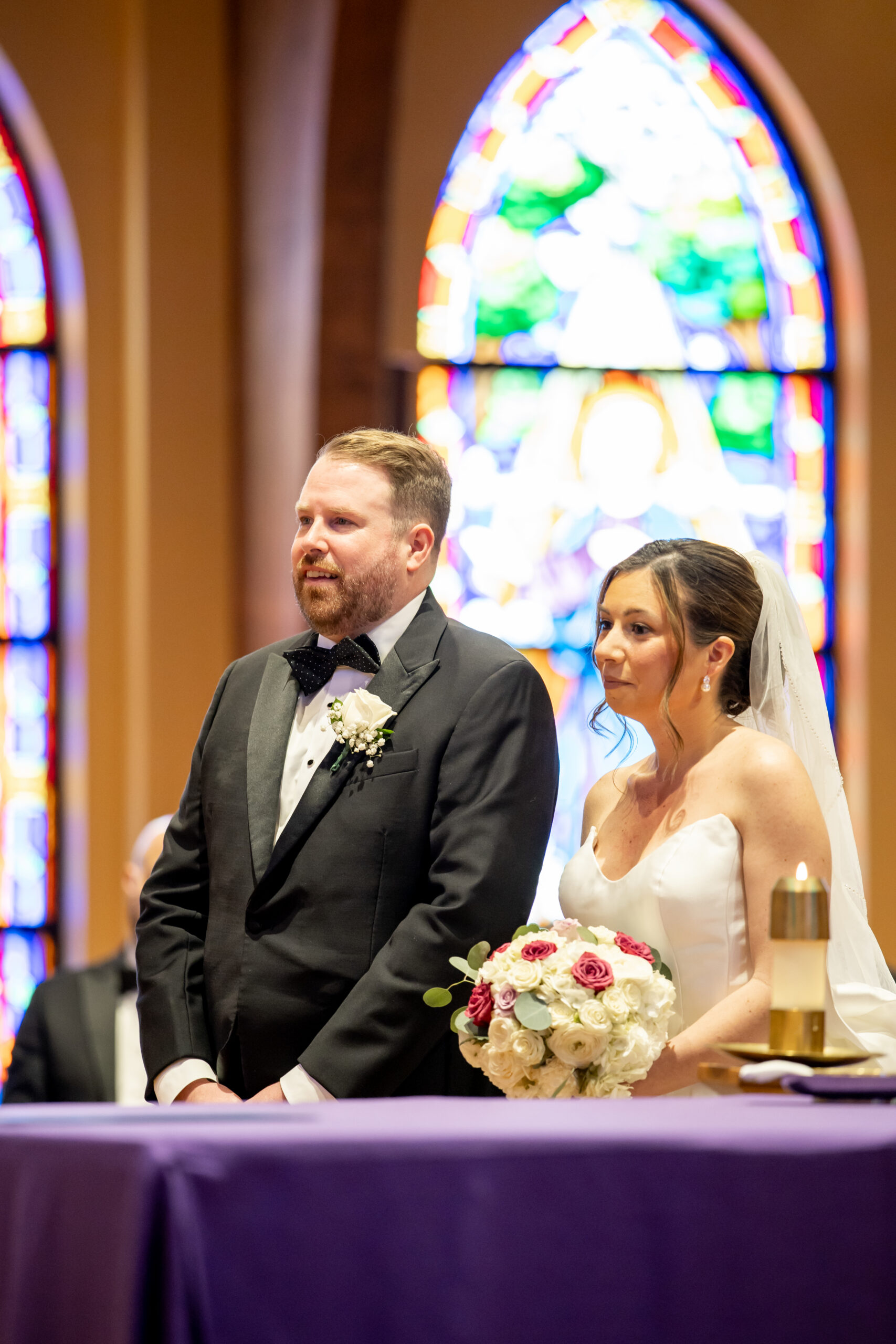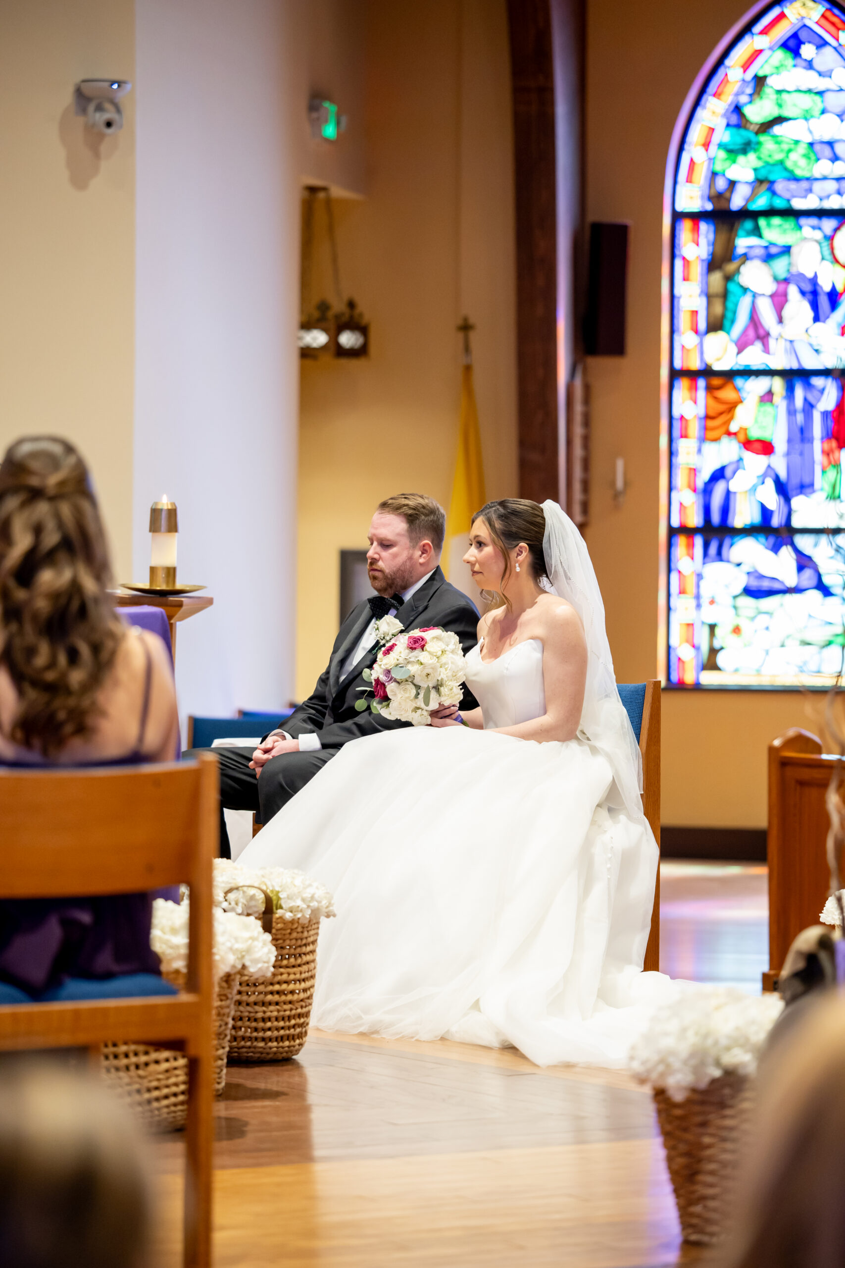 Once everyone was ready, we headed to the church for their ceremony. Michelle arrived in style, riding with her father in a white vintage Rolls Royce. Watching her step out of the car and walk up those steps was such a special moment. Inside, the church was filled with natural light streaming through large stained glass windows. It created the most beautiful, soft glow.