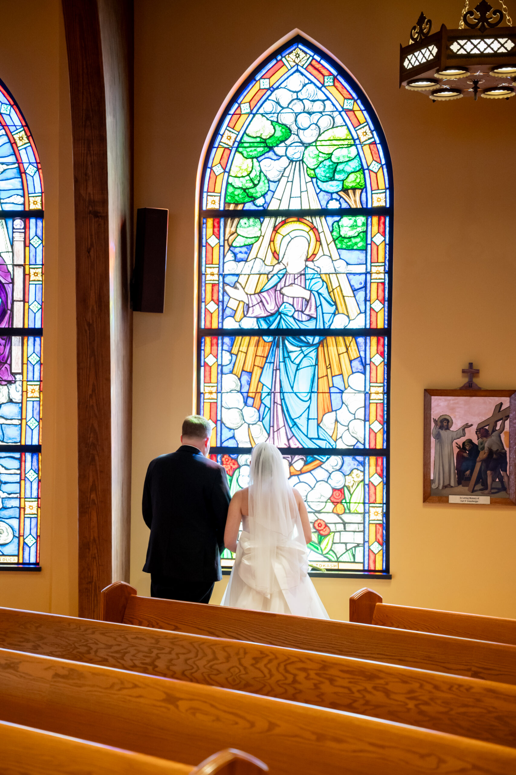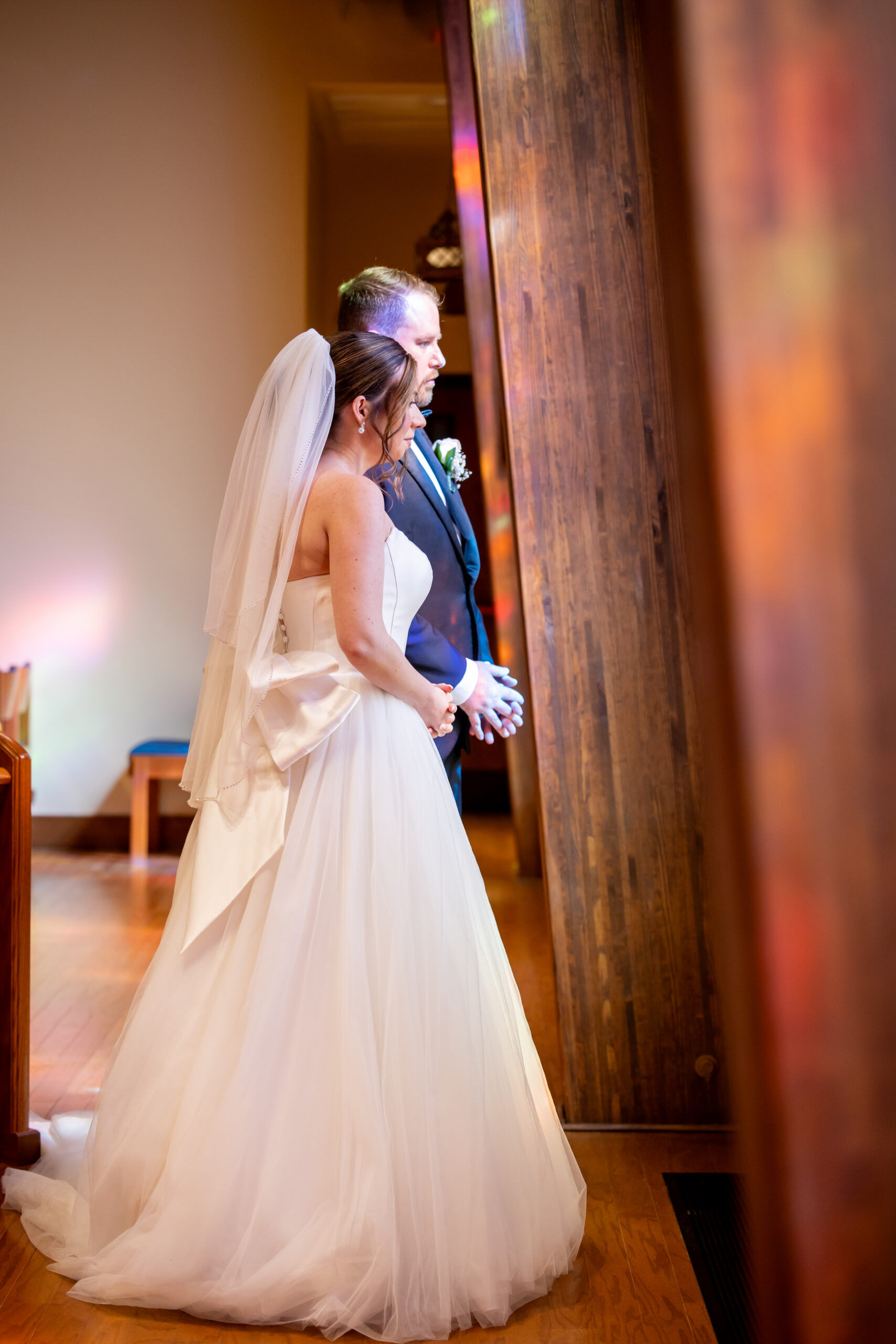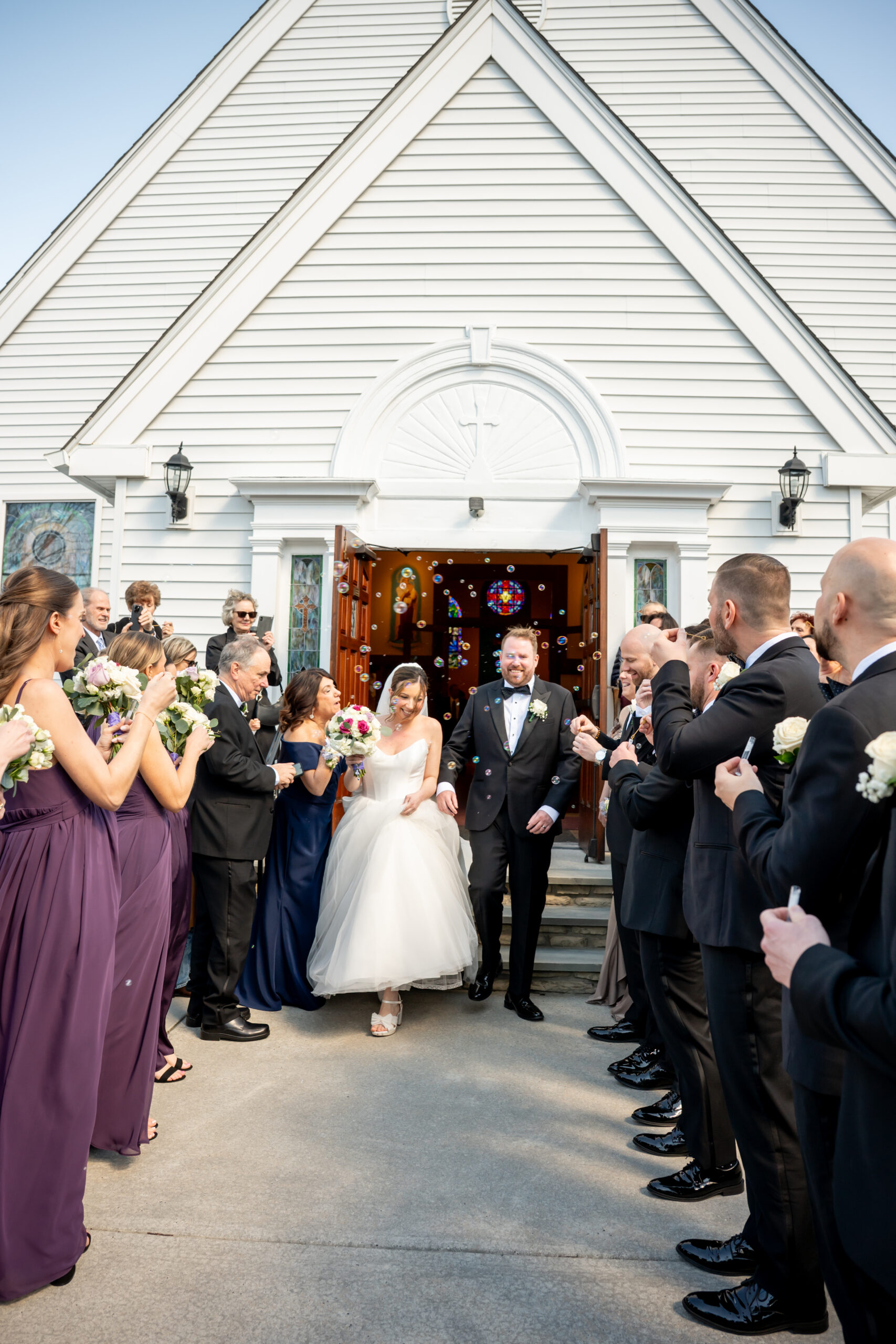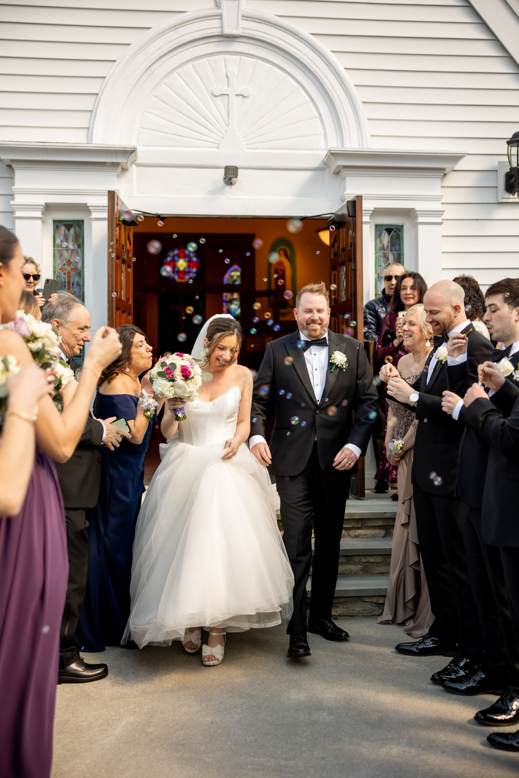 Once everyone was ready, we headed to the church for their ceremony. Michelle arrived in style, riding with her father in a white vintage Rolls Royce. Watching her step out of the car and walk up those steps was such a special moment. Inside, the church was filled with natural light streaming through large stained glass windows. It created the most beautiful, soft glow.