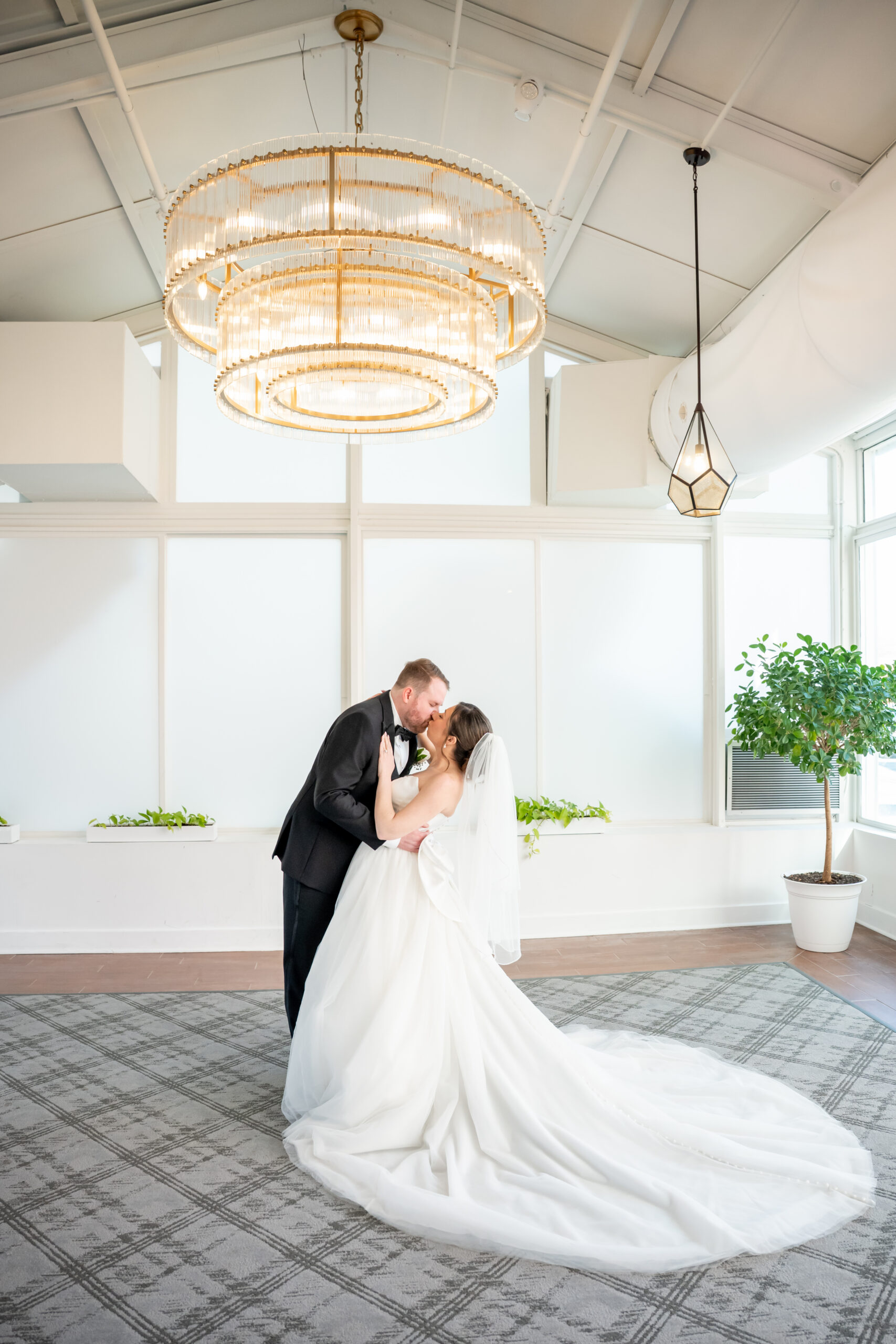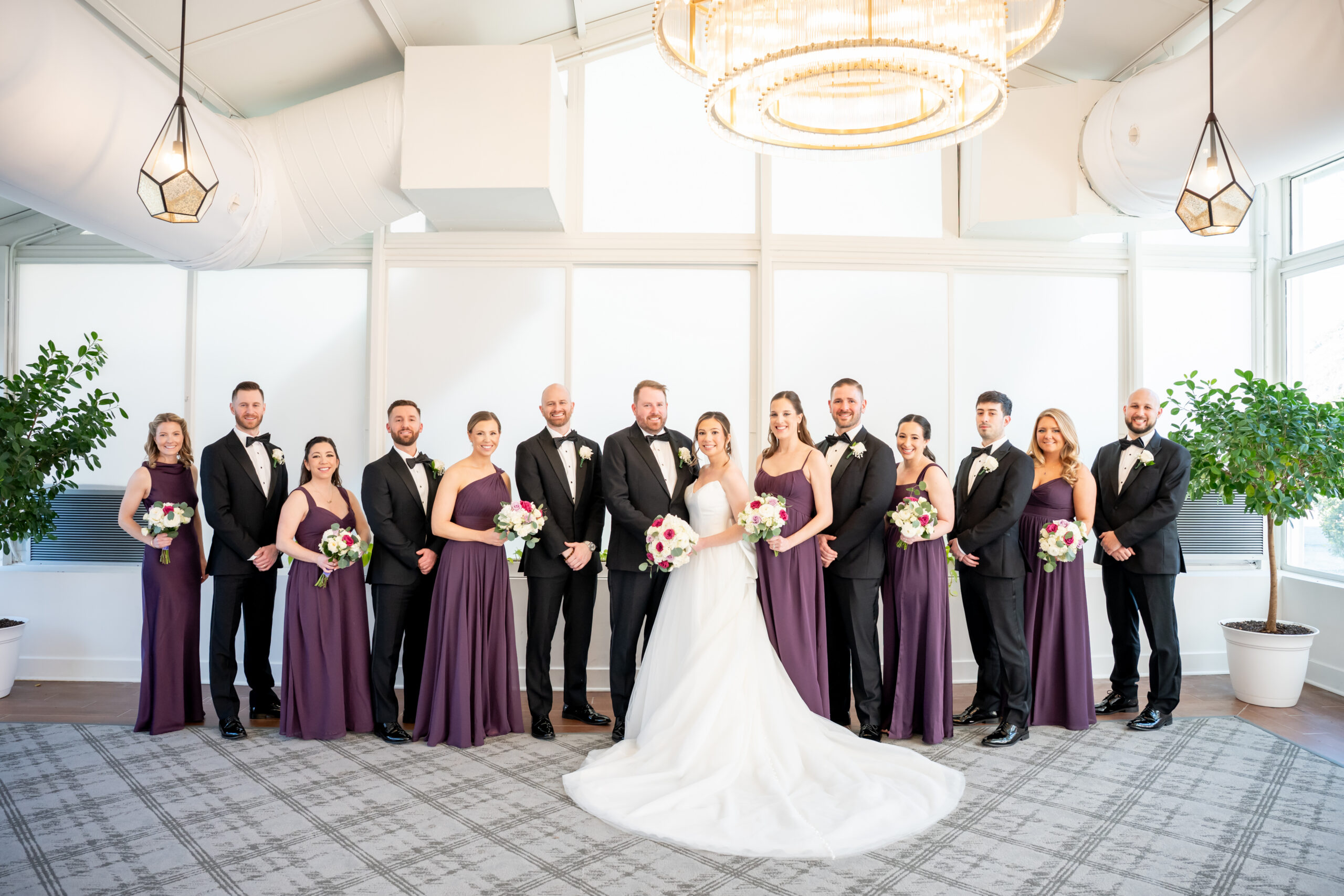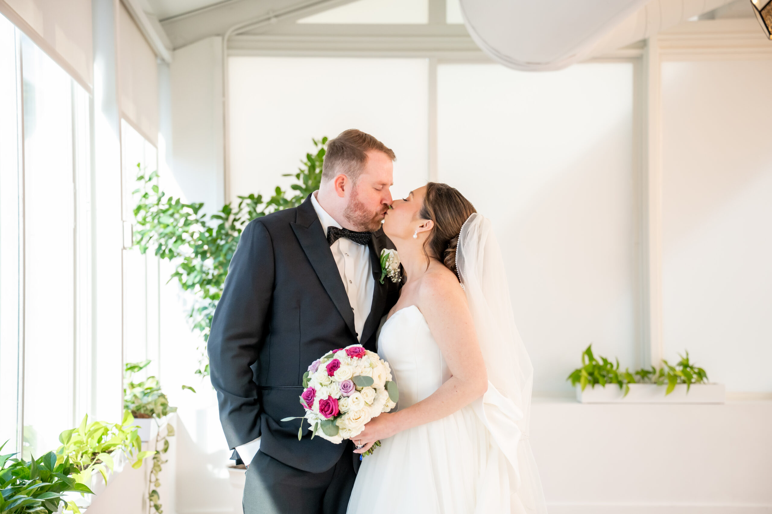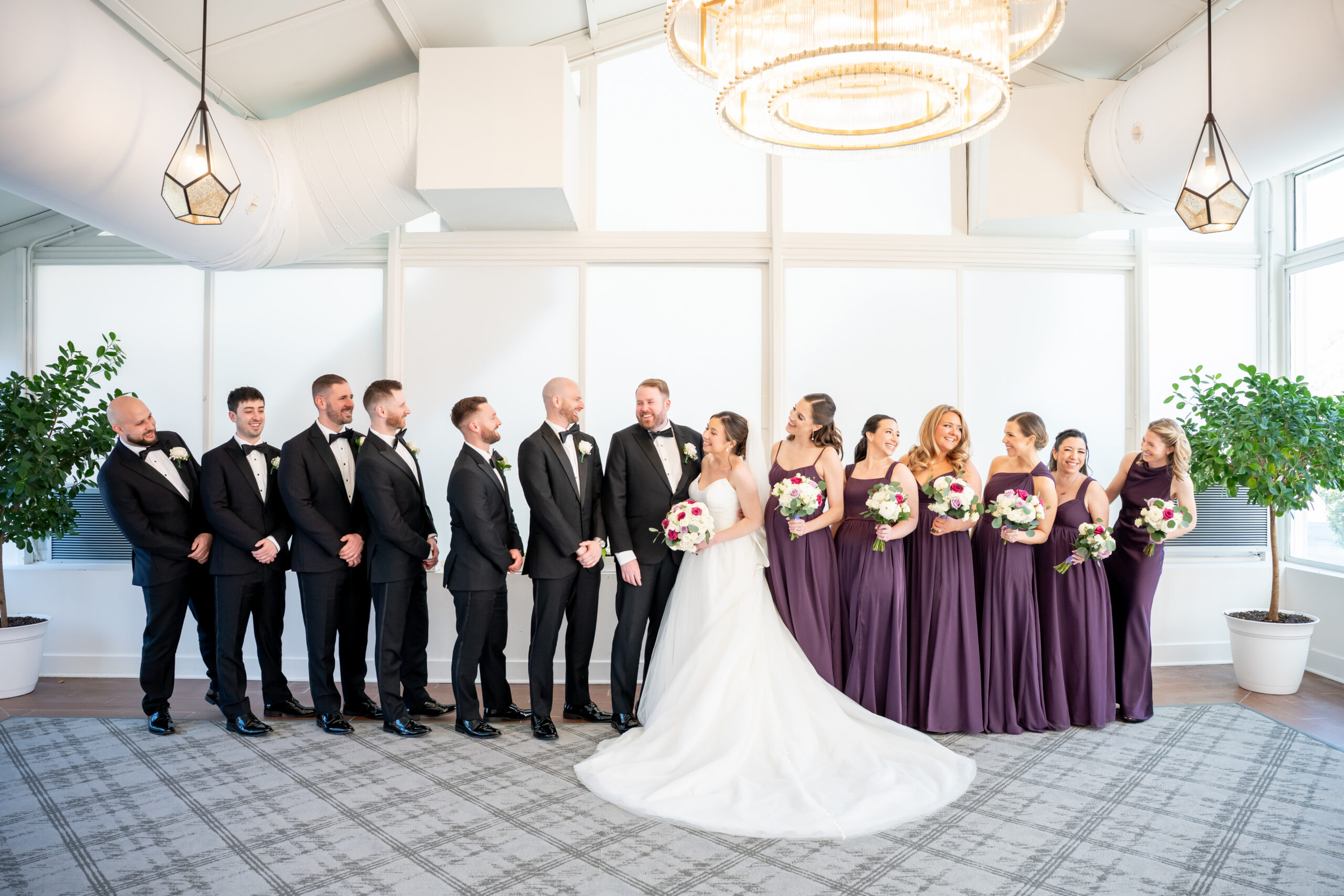 Even though the main conservatory space was occupied, we found another gorgeous room filled with natural light, greenery, and soft white tones. It even had a huge beautiful chandelier. It was the perfect setting for bridal party photos and romantic portraits. This is one of the reasons I love photographing a The Madison Hotel Wedding, there are endless beautiful backdrops no matter the season.