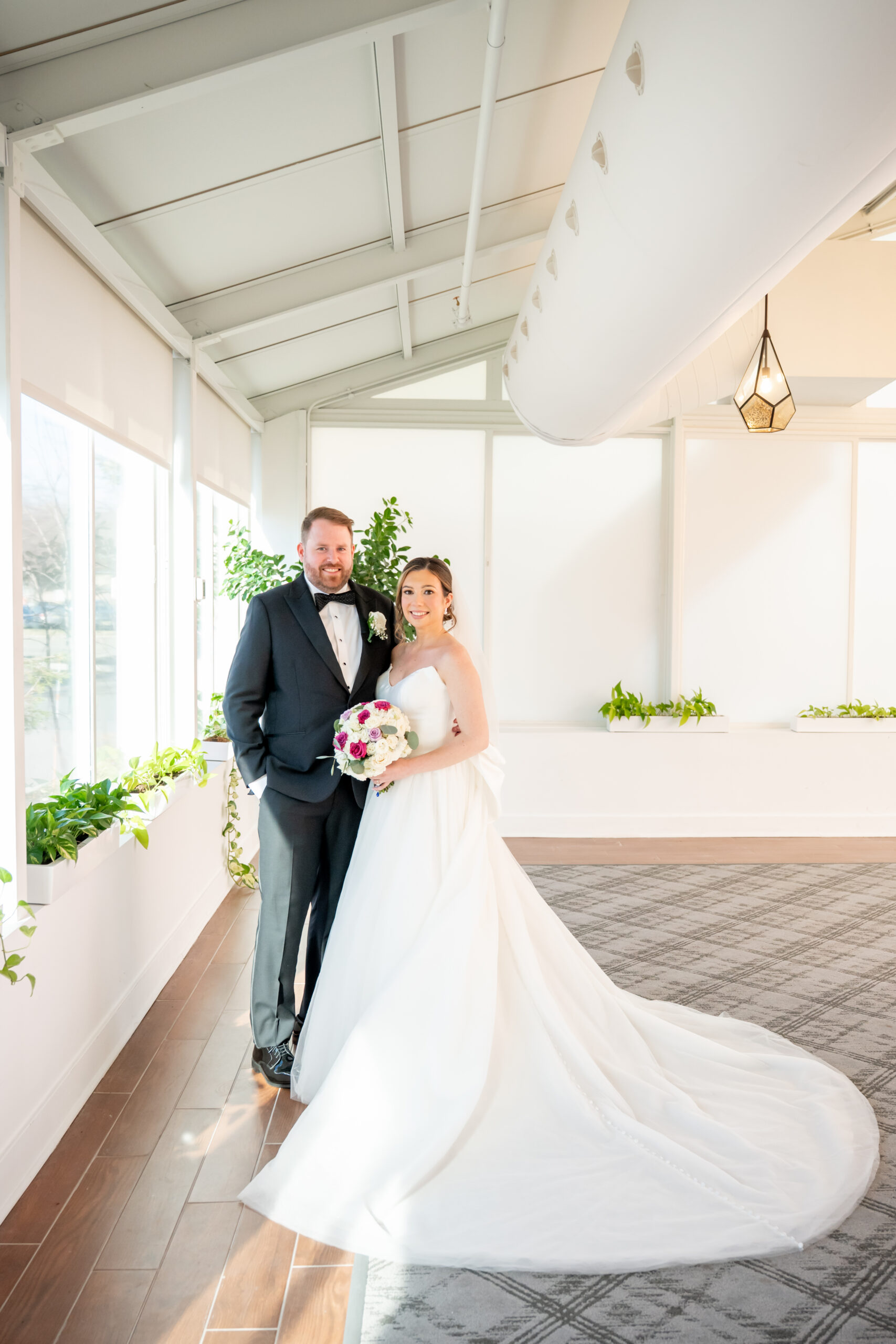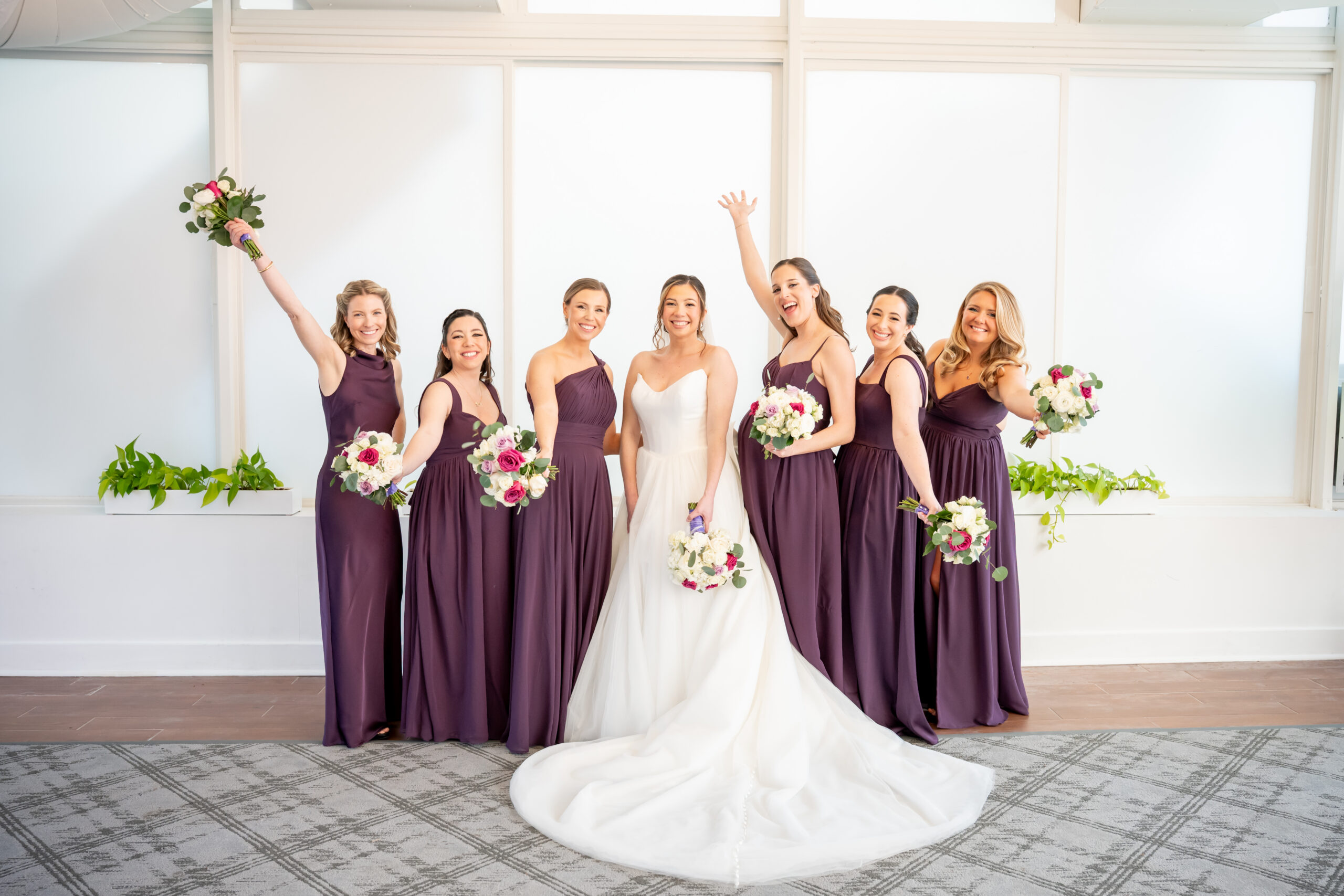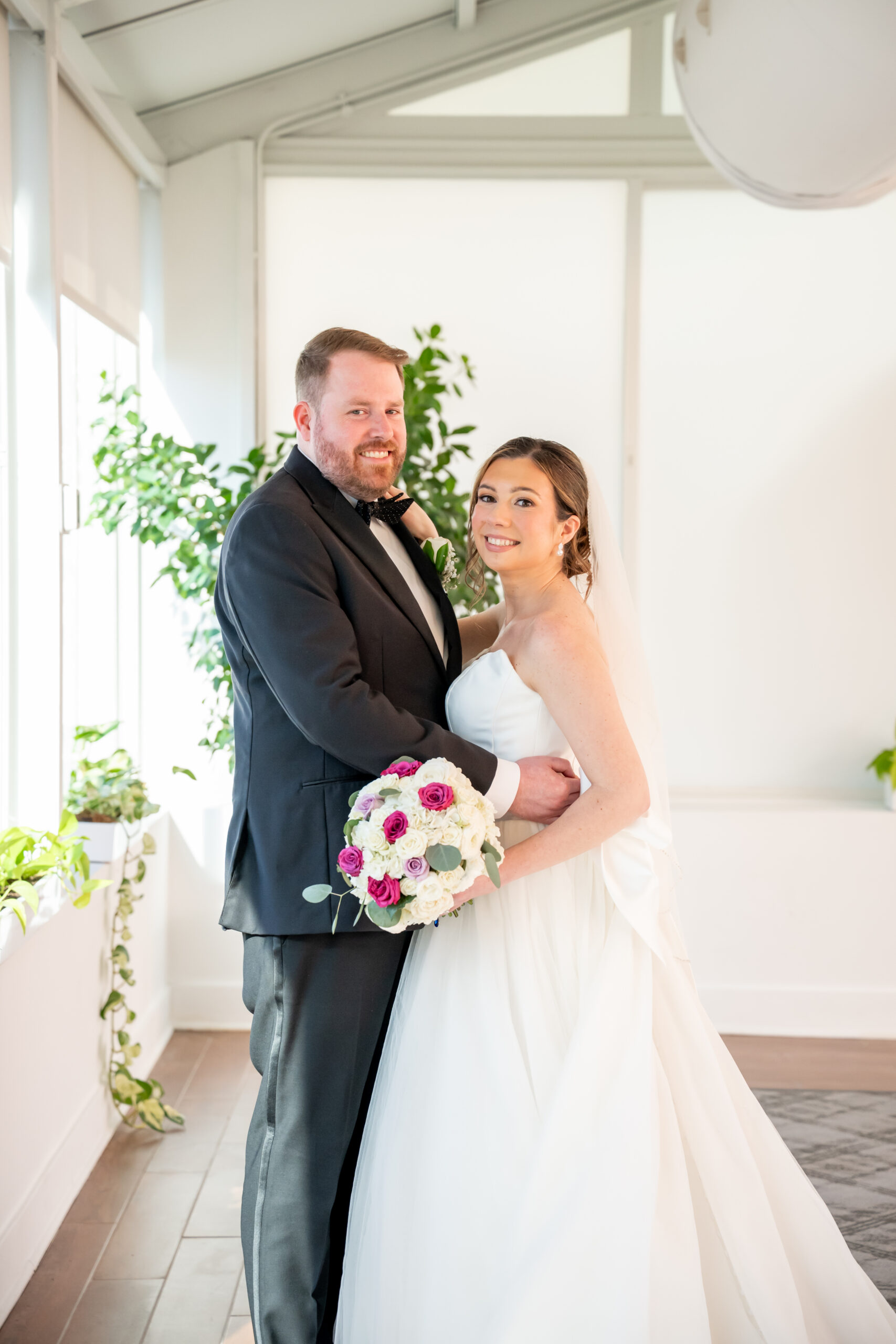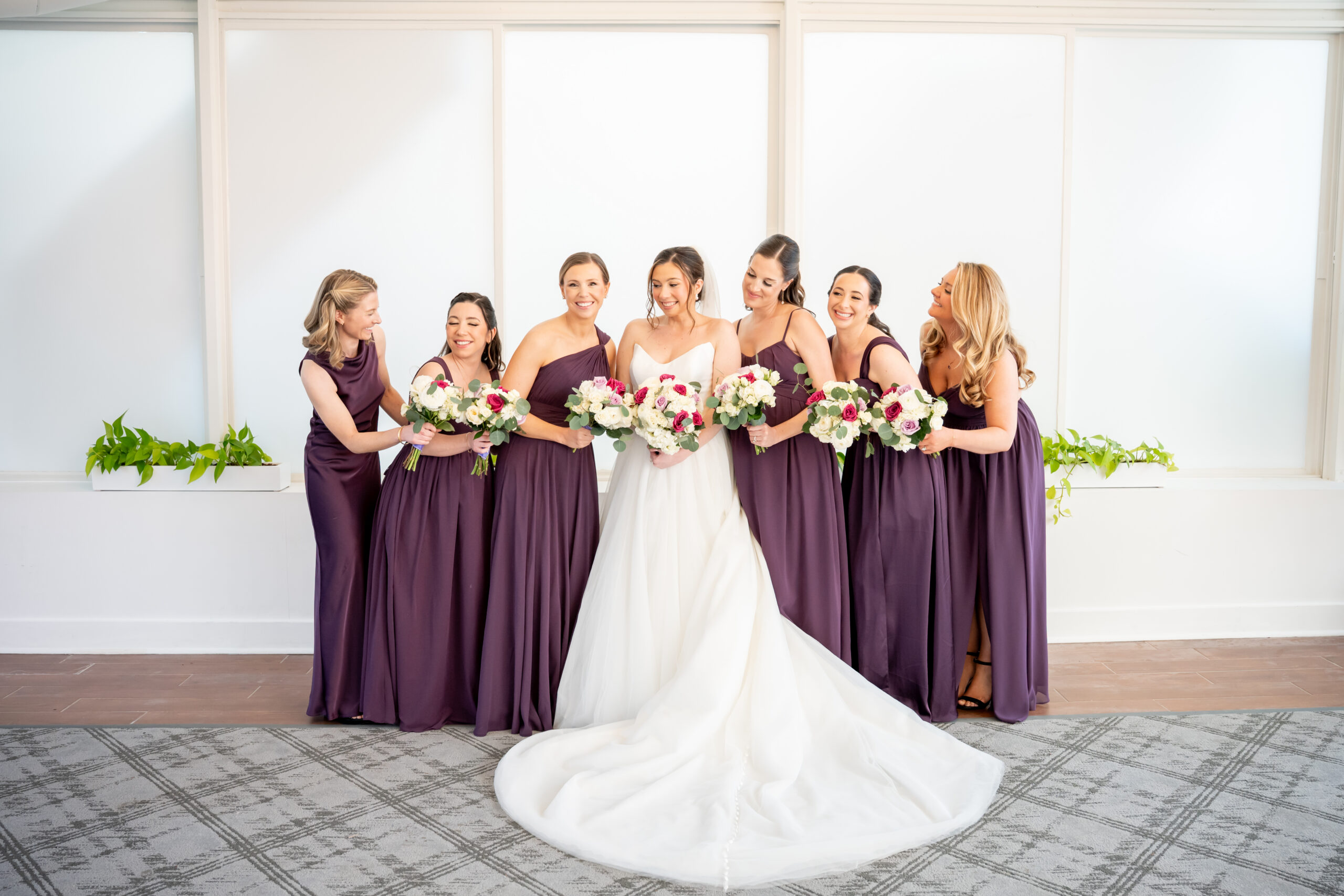 Even though the main conservatory space was occupied, we found another gorgeous room filled with natural light, greenery, and soft white tones. It even had a huge beautiful chandelier. It was the perfect setting for bridal party photos and romantic portraits. This is one of the reasons I love photographing a The Madison Hotel Wedding, there are endless beautiful backdrops no matter the season.