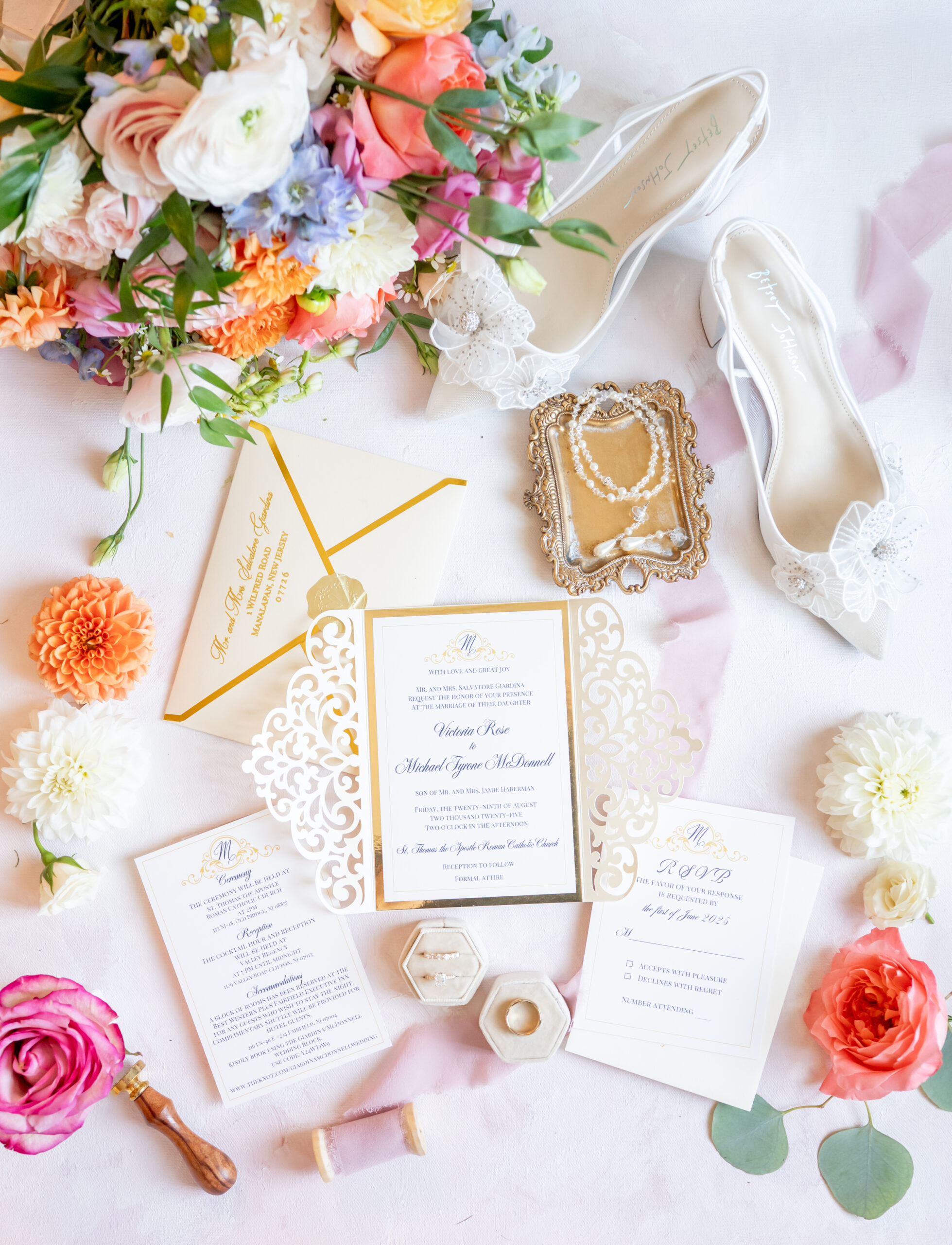Her invitation suite was just as stunning, with ivory cardstock, gold accents, and delicate lace details. Even her jewelry and shoes followed the same elegant theme, tying everything together seamlessly. You could truly see how thoughtfully every detail had been chosen.