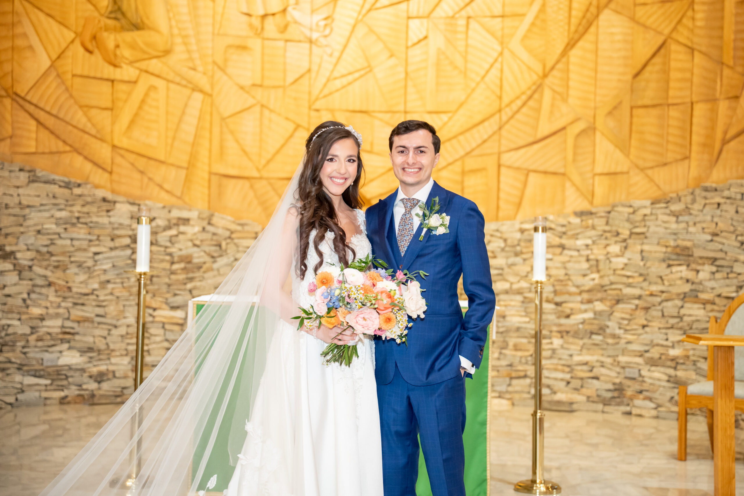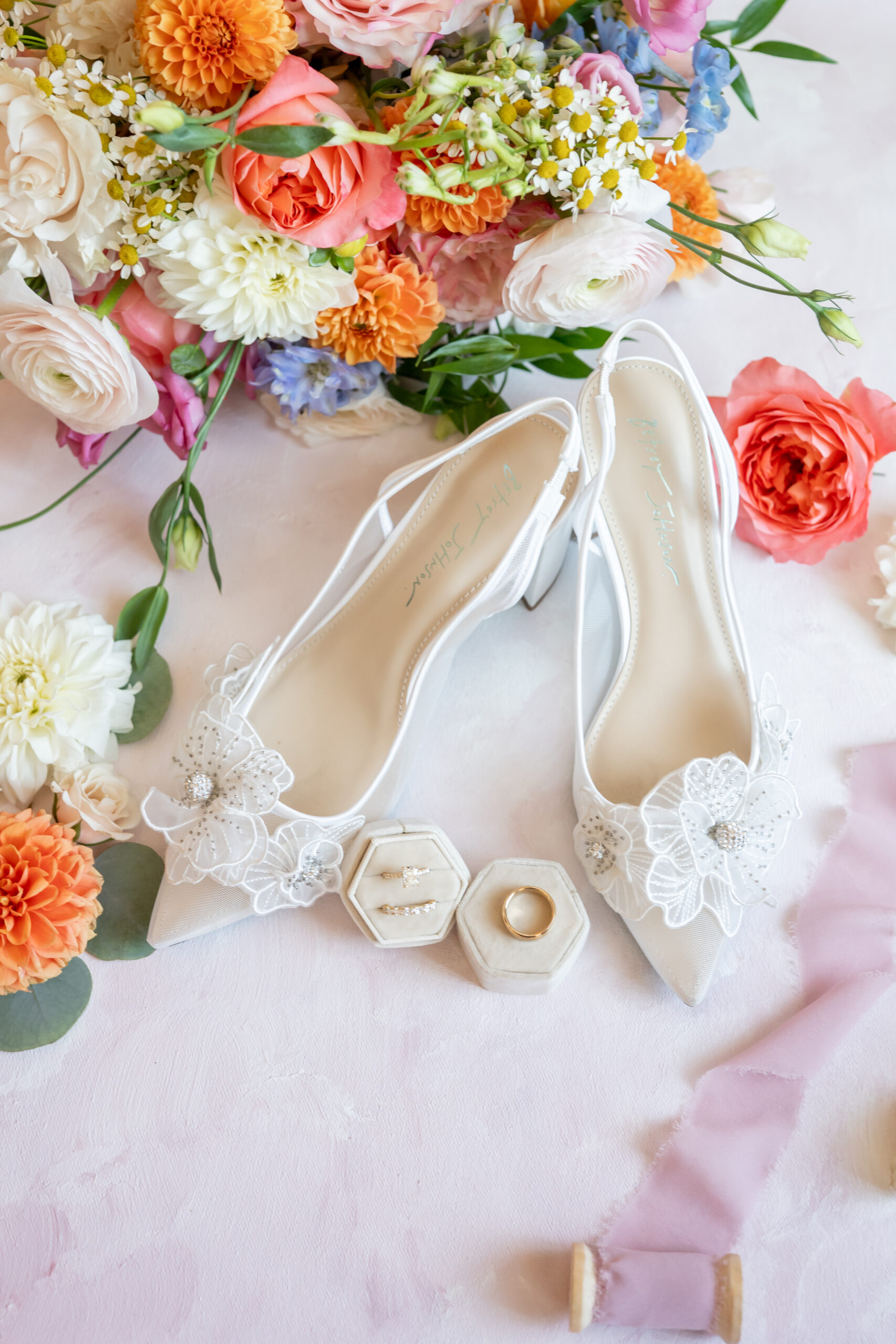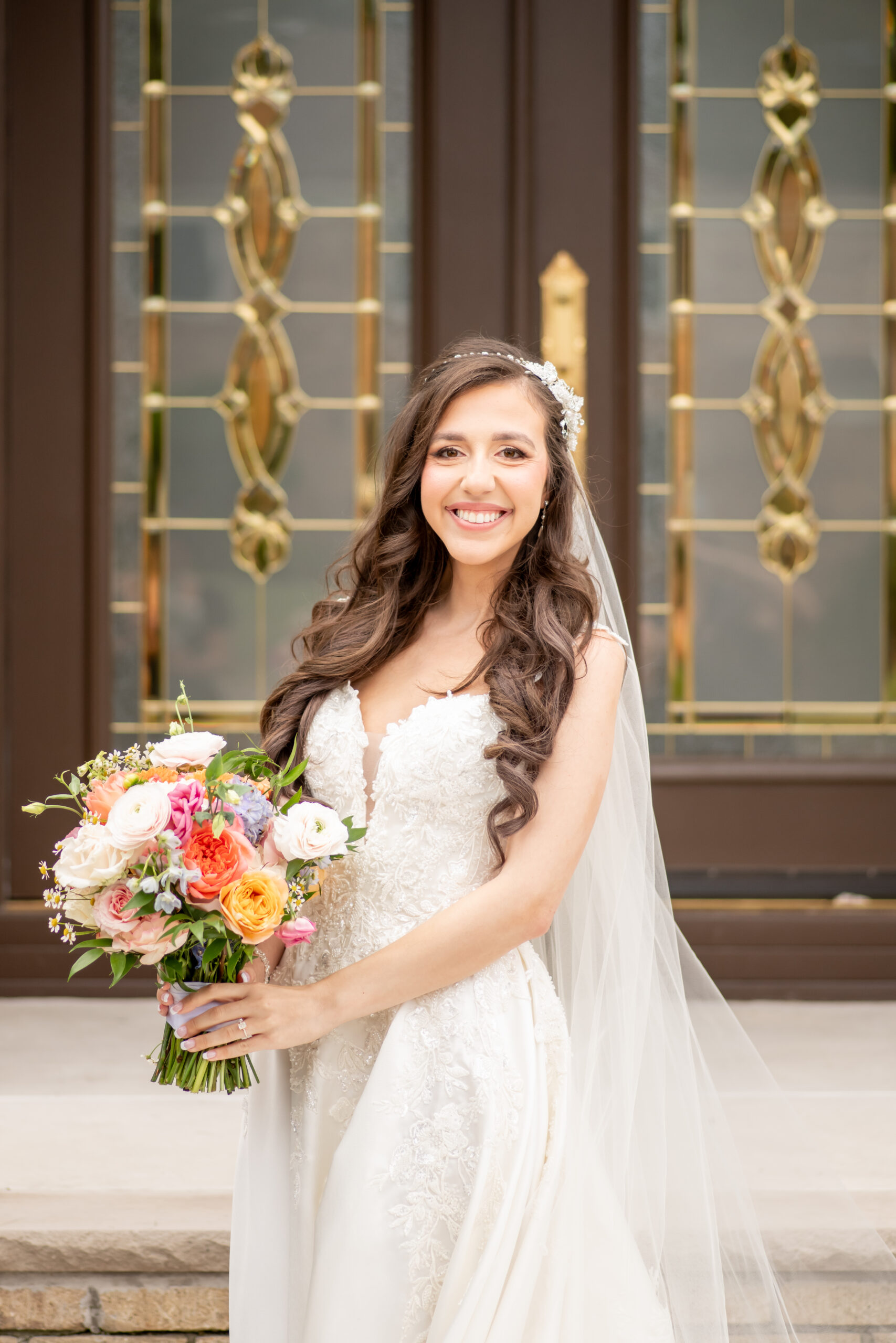 Before heading to the ceremony, we took time to capture Victoriaās beautiful wedding details. Her bouquet was vibrant and full of personality, featuring shades of orange, pink, white, and even a pop of blue. The mix of colors and textures made it feel lush, romantic, and perfectly suited for a late summer celebration.