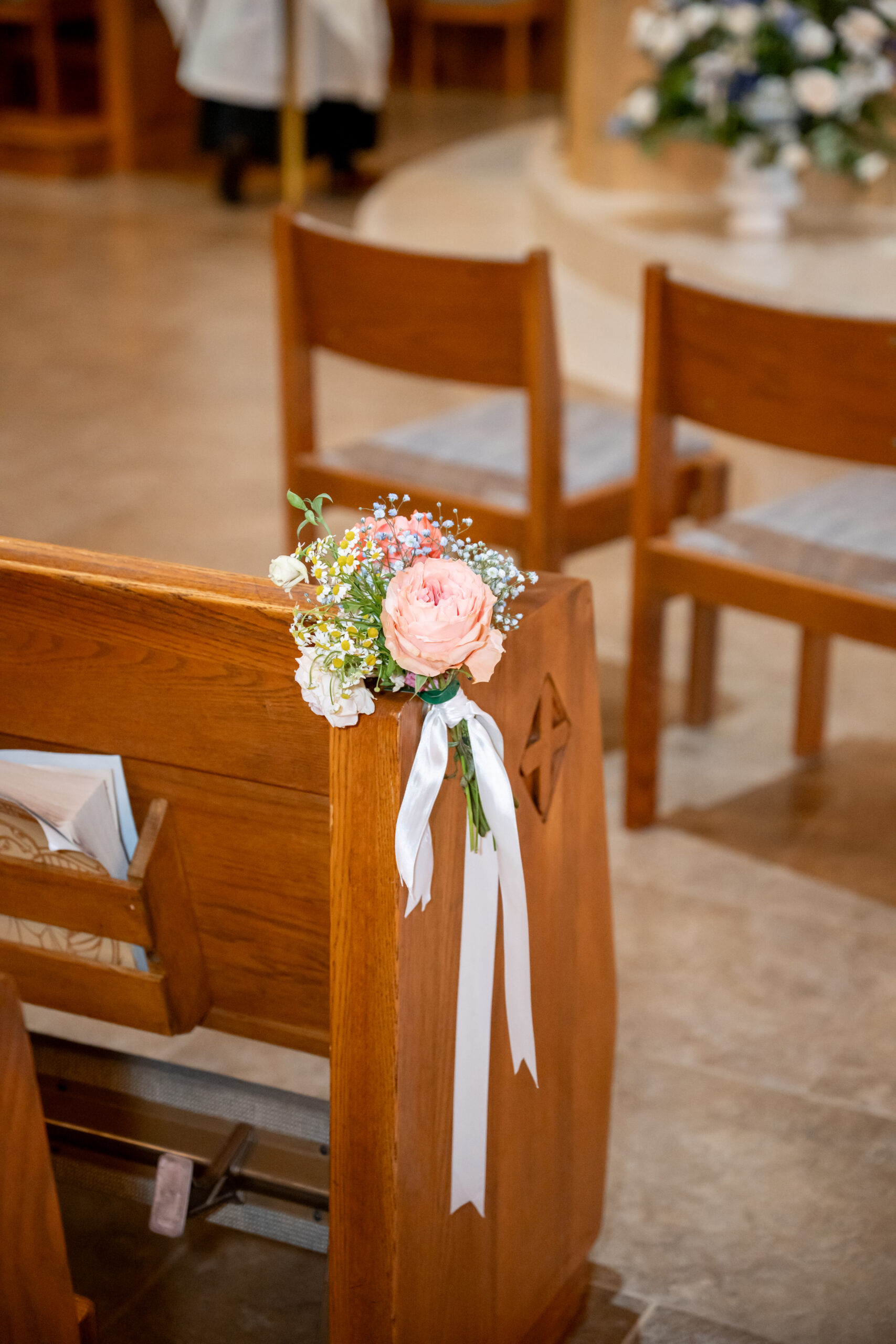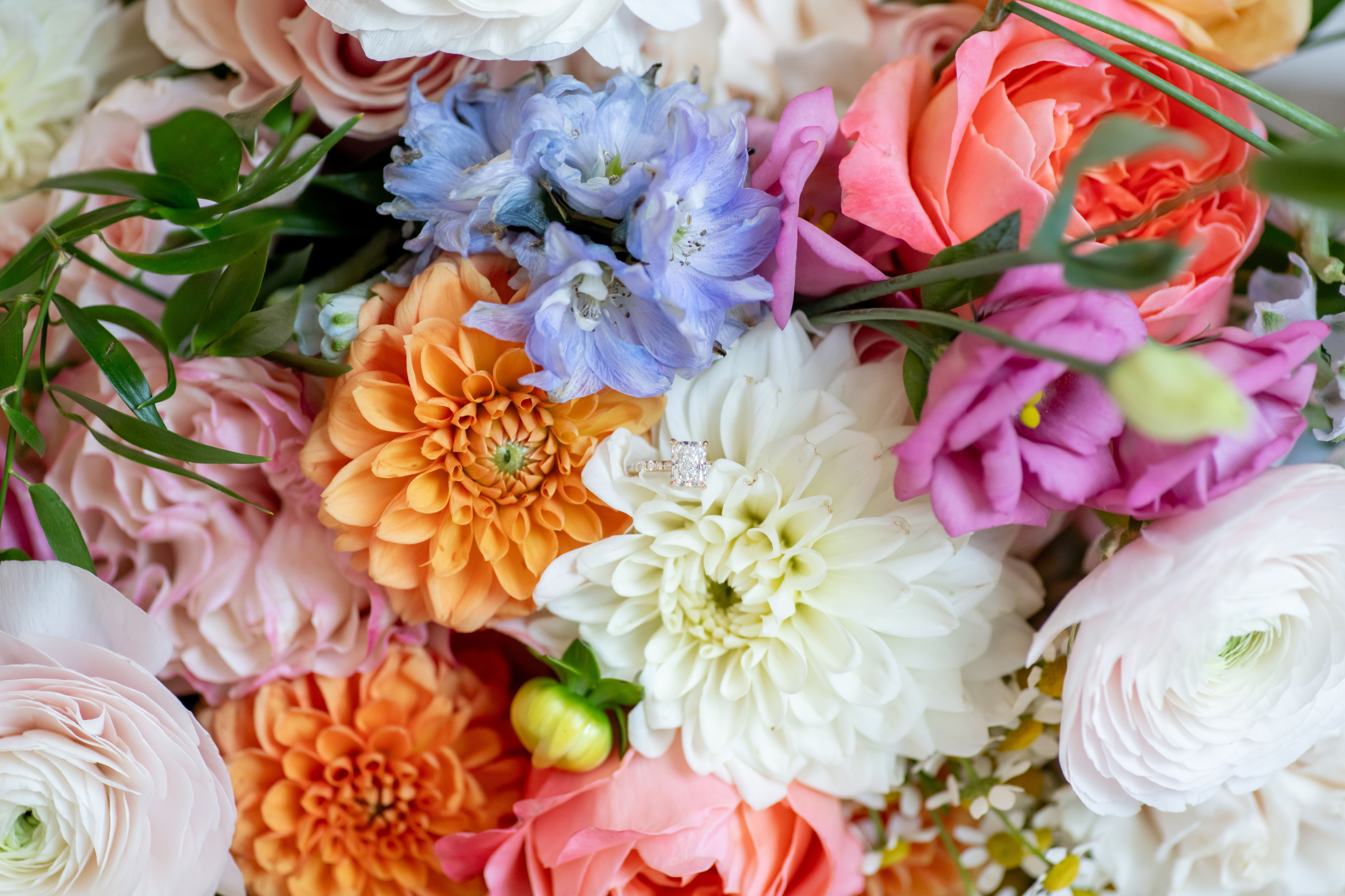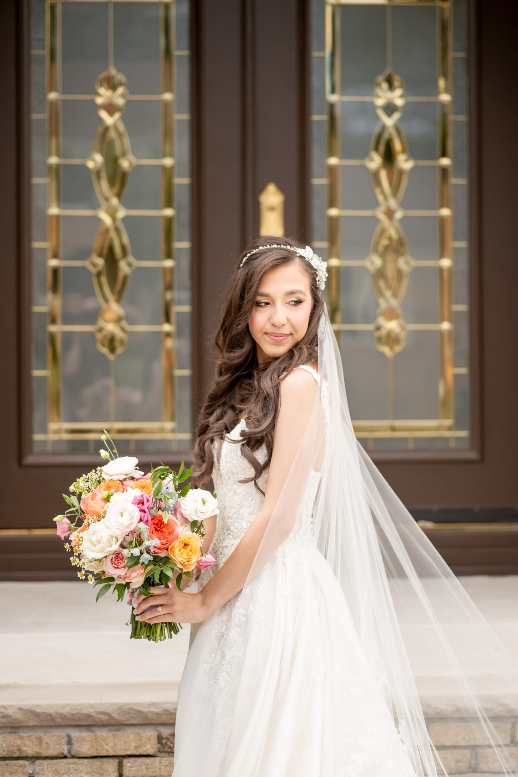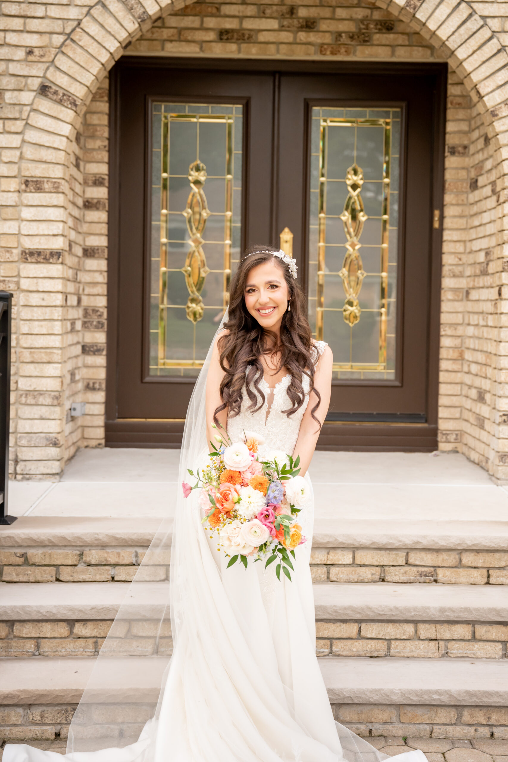 Before heading to the ceremony, we took time to capture Victoriaās beautiful wedding details. Her bouquet was vibrant and full of personality, featuring shades of orange, pink, white, and even a pop of blue. The mix of colors and textures made it feel lush, romantic, and perfectly suited for a late summer celebration.