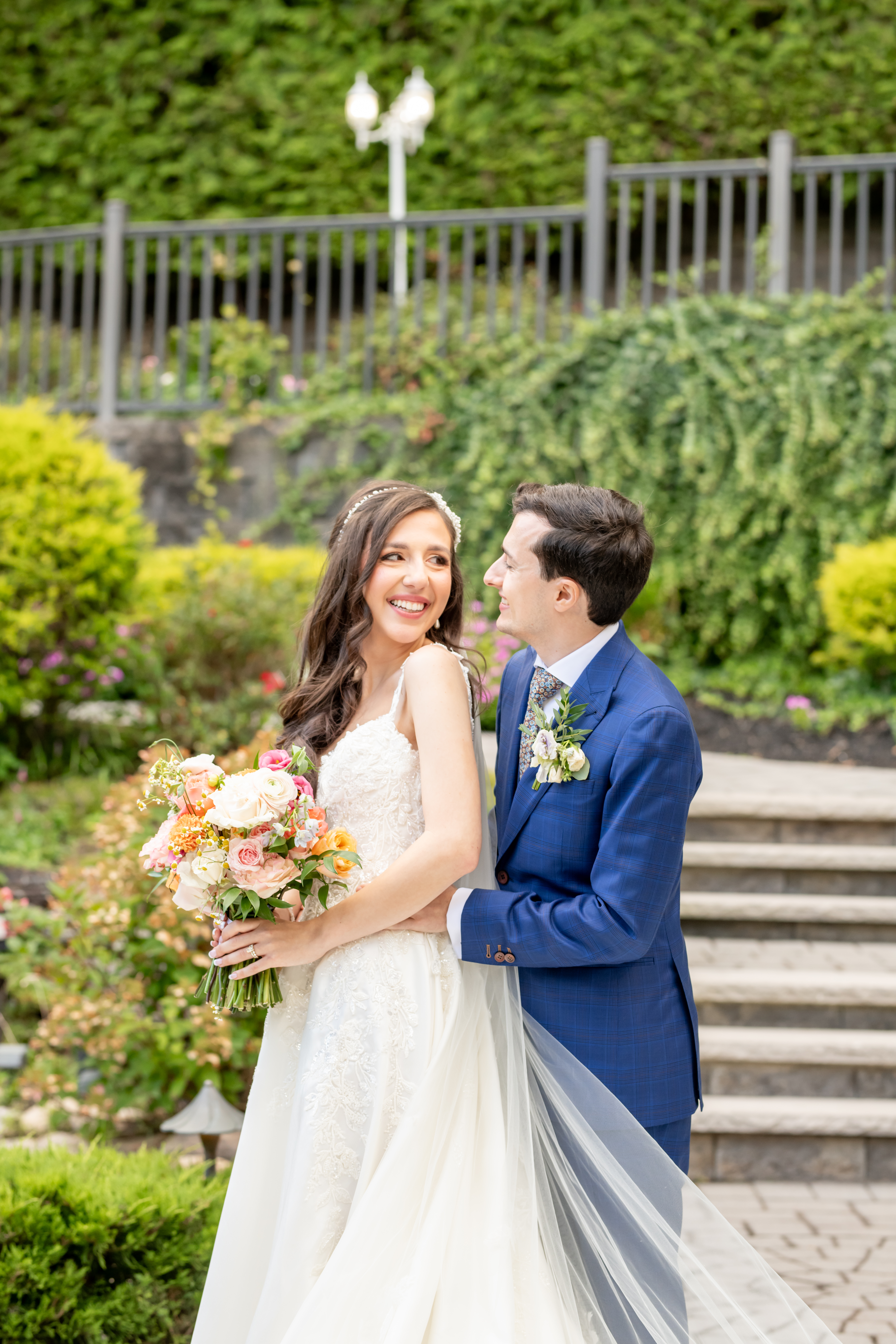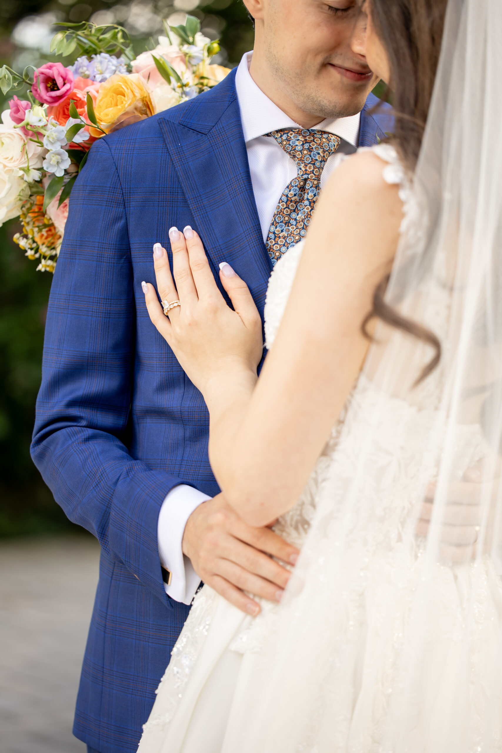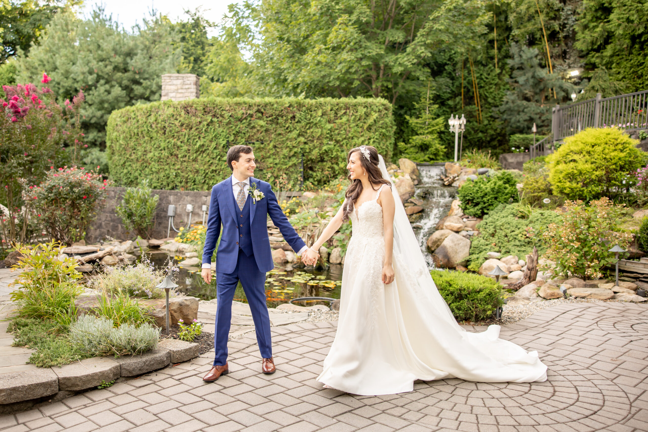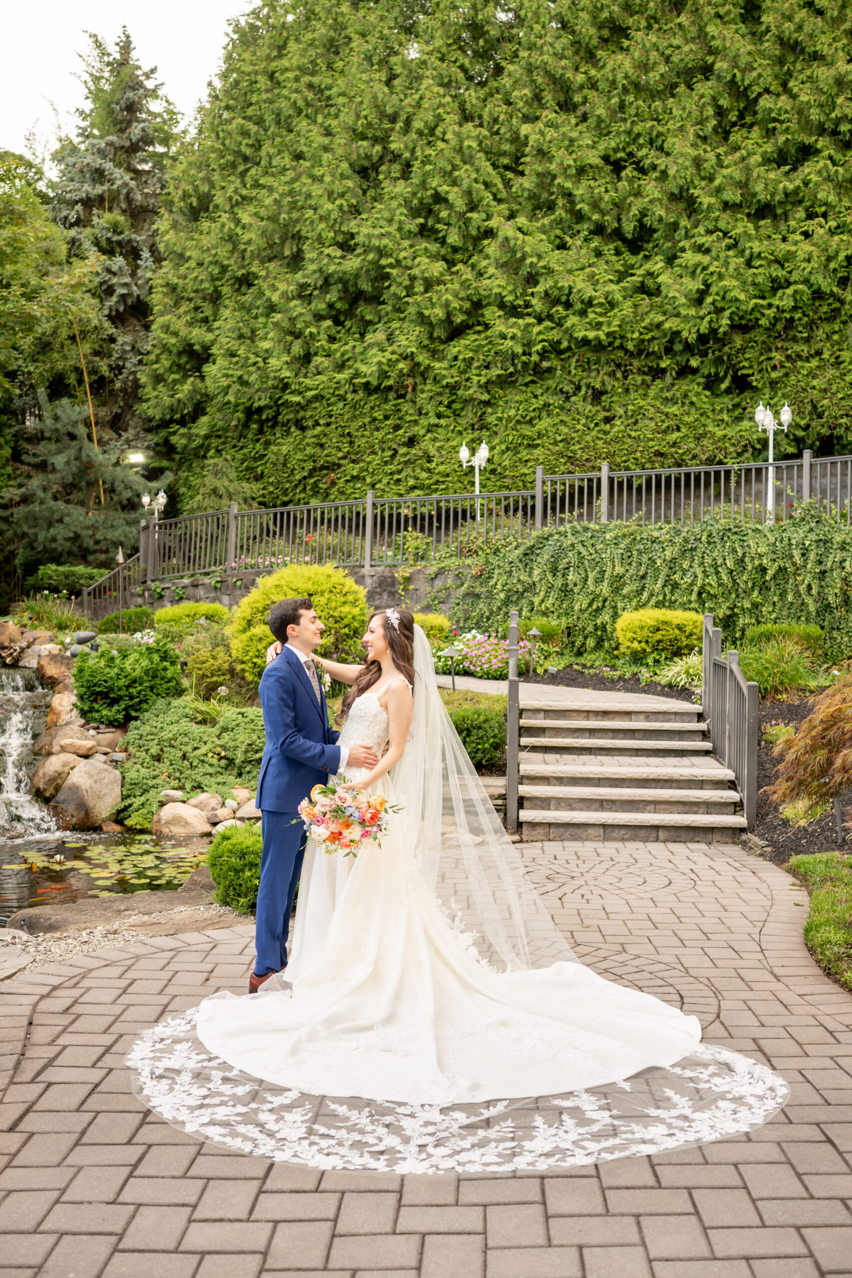 Victoriaās long lace-trimmed veil flowed beautifully behind her while her satin train laid so elegantly across the stone pathways. Mikeās bold blue suit paired perfectly with his floral tie, adding a fun pop of color that matched the joyful style of the day. This part of their Valley Regency wedding felt peaceful, intimate, and full of connection.